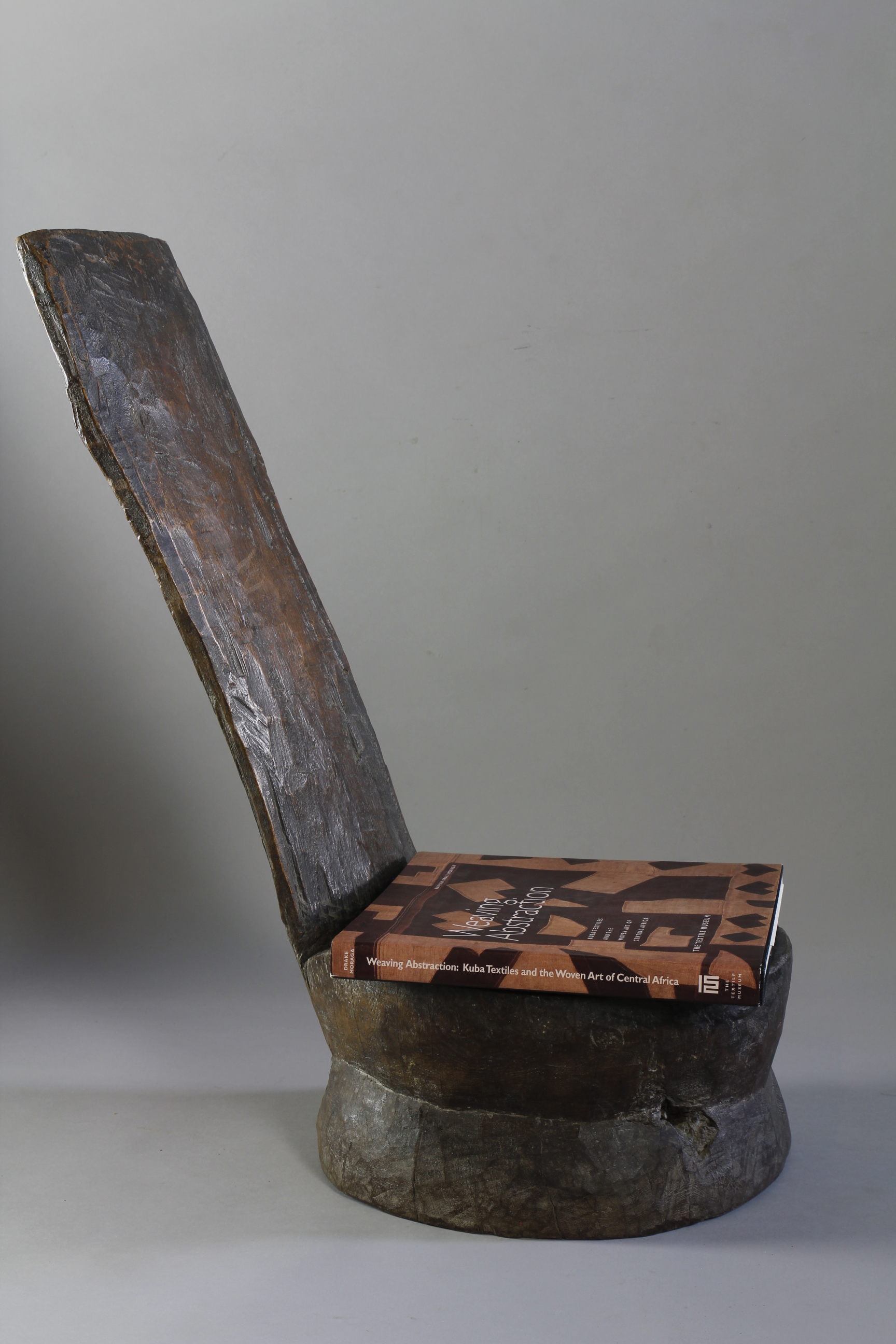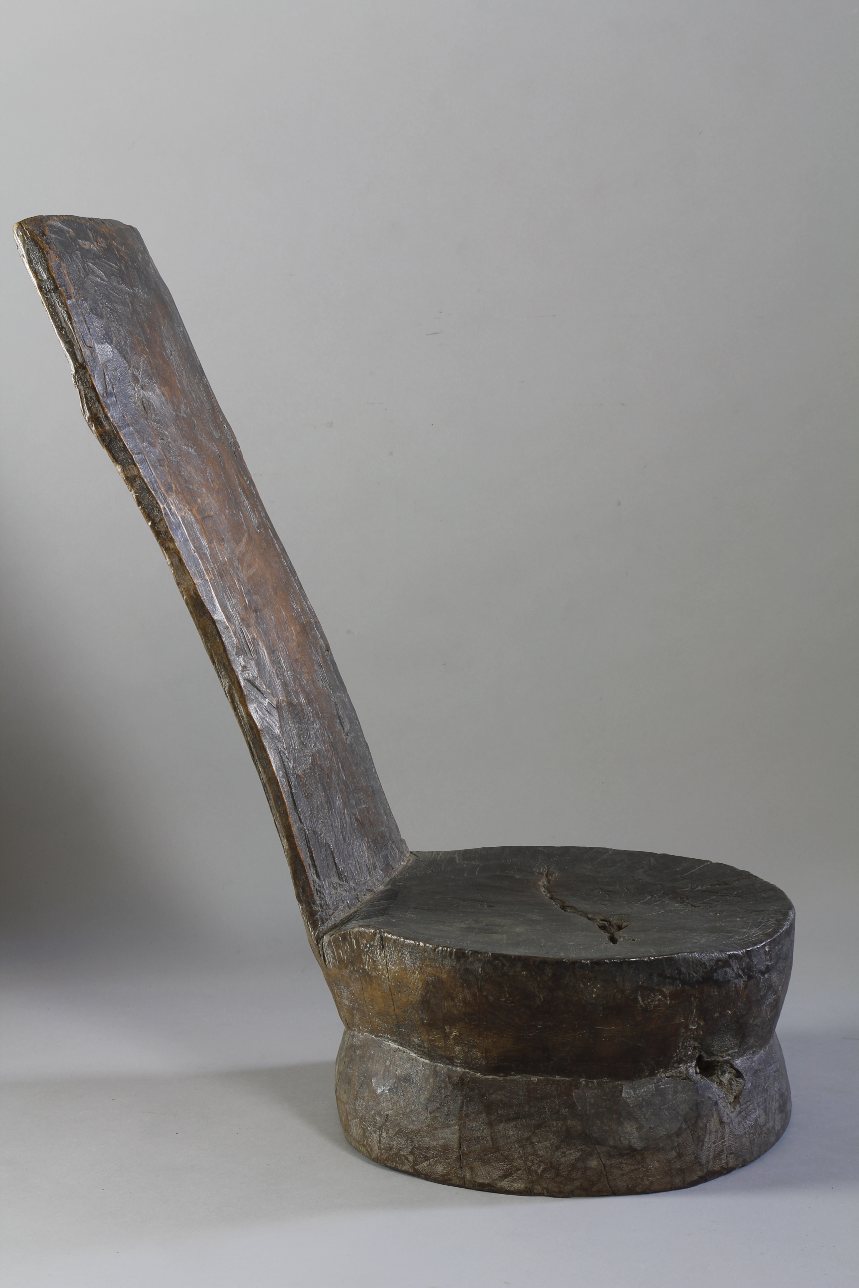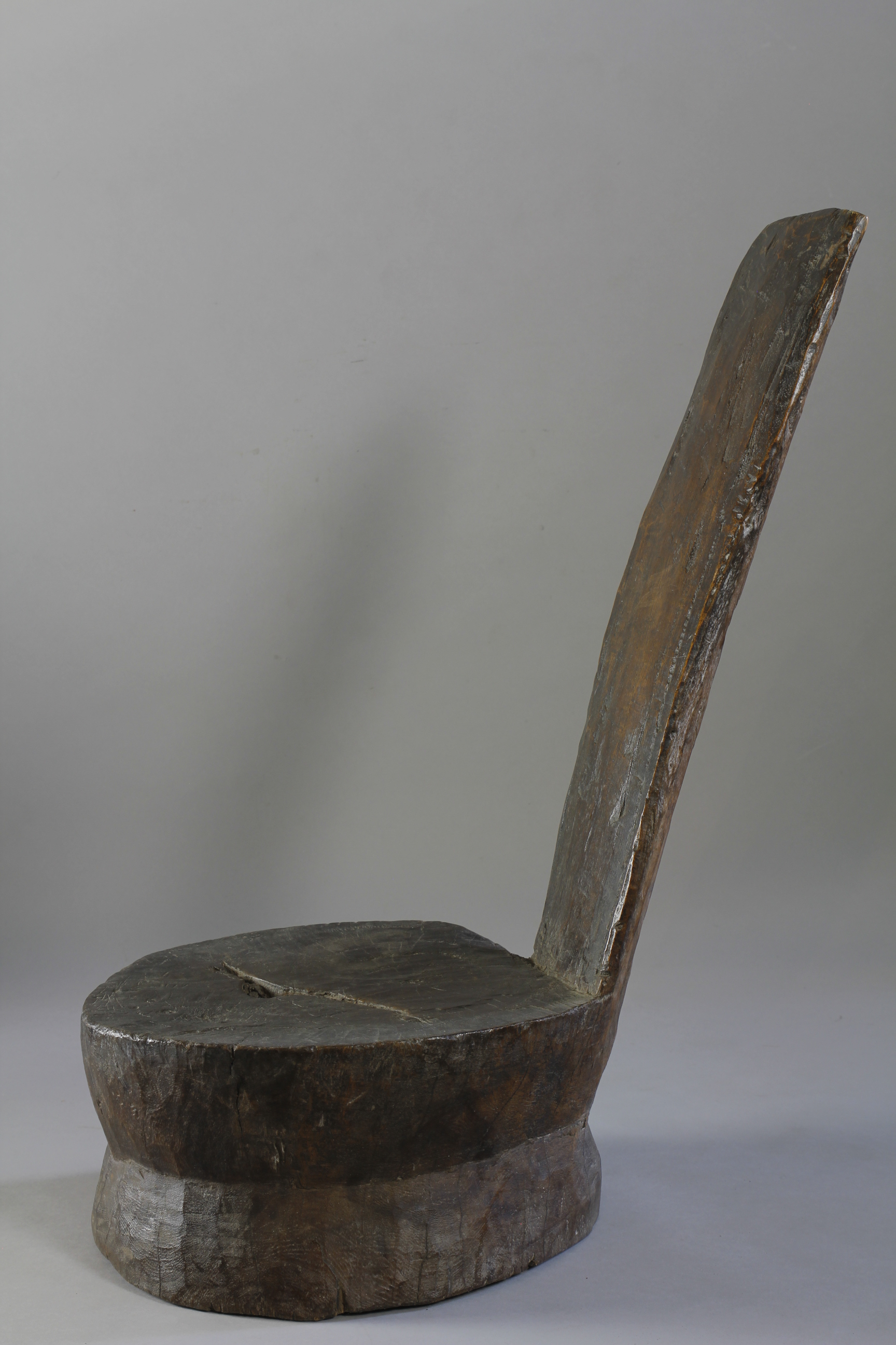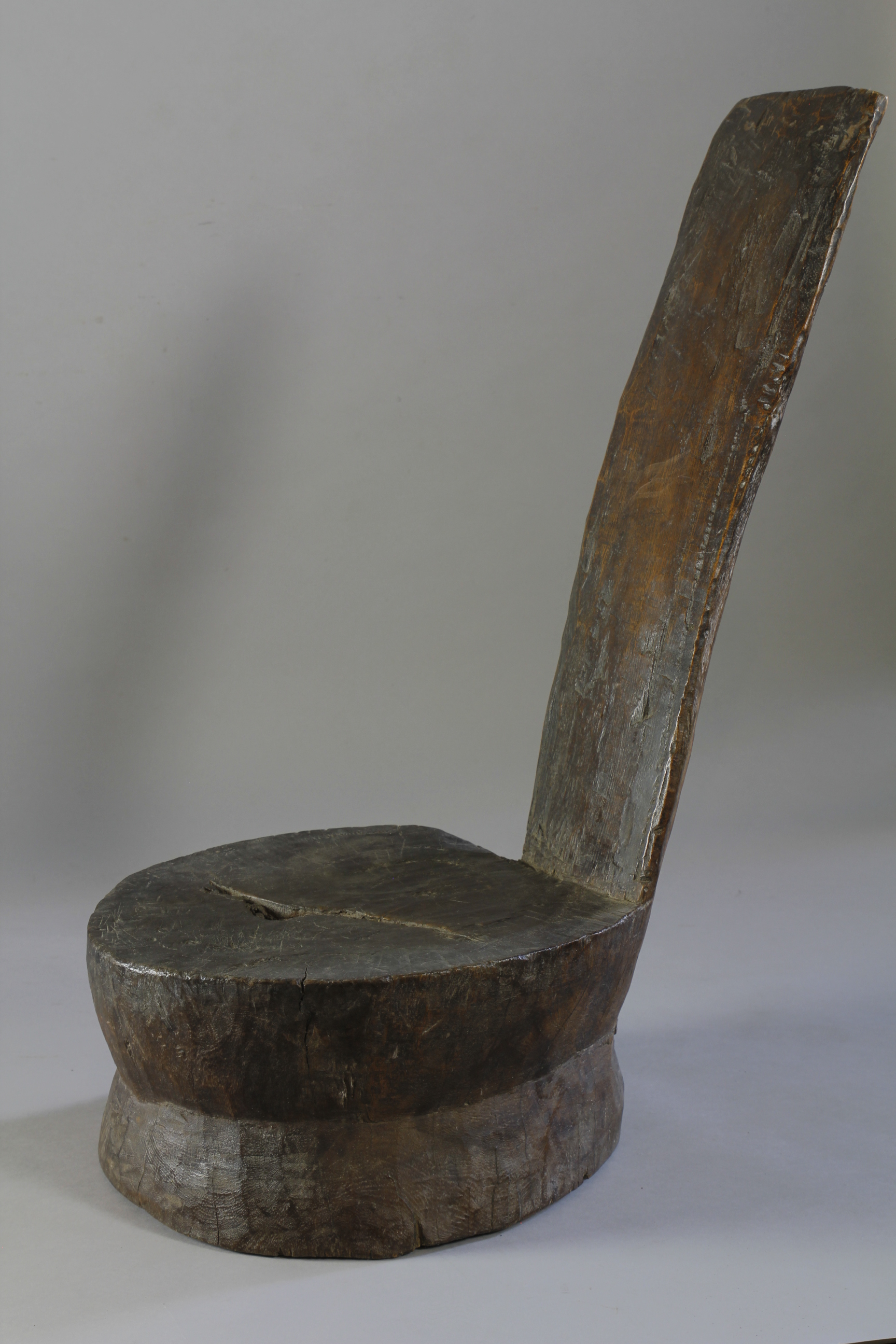 This unusual, rare form of low chair has been carved from a single piece of a dense, heavy wood. Consisting of a circular double-tiered seat with an angled, reclining back-support, the chair exhibits a deep glossy surface patina, particularly on the back-support and seat as a result of use. The chair is functional, and is reasonably comfortable to sit on.
