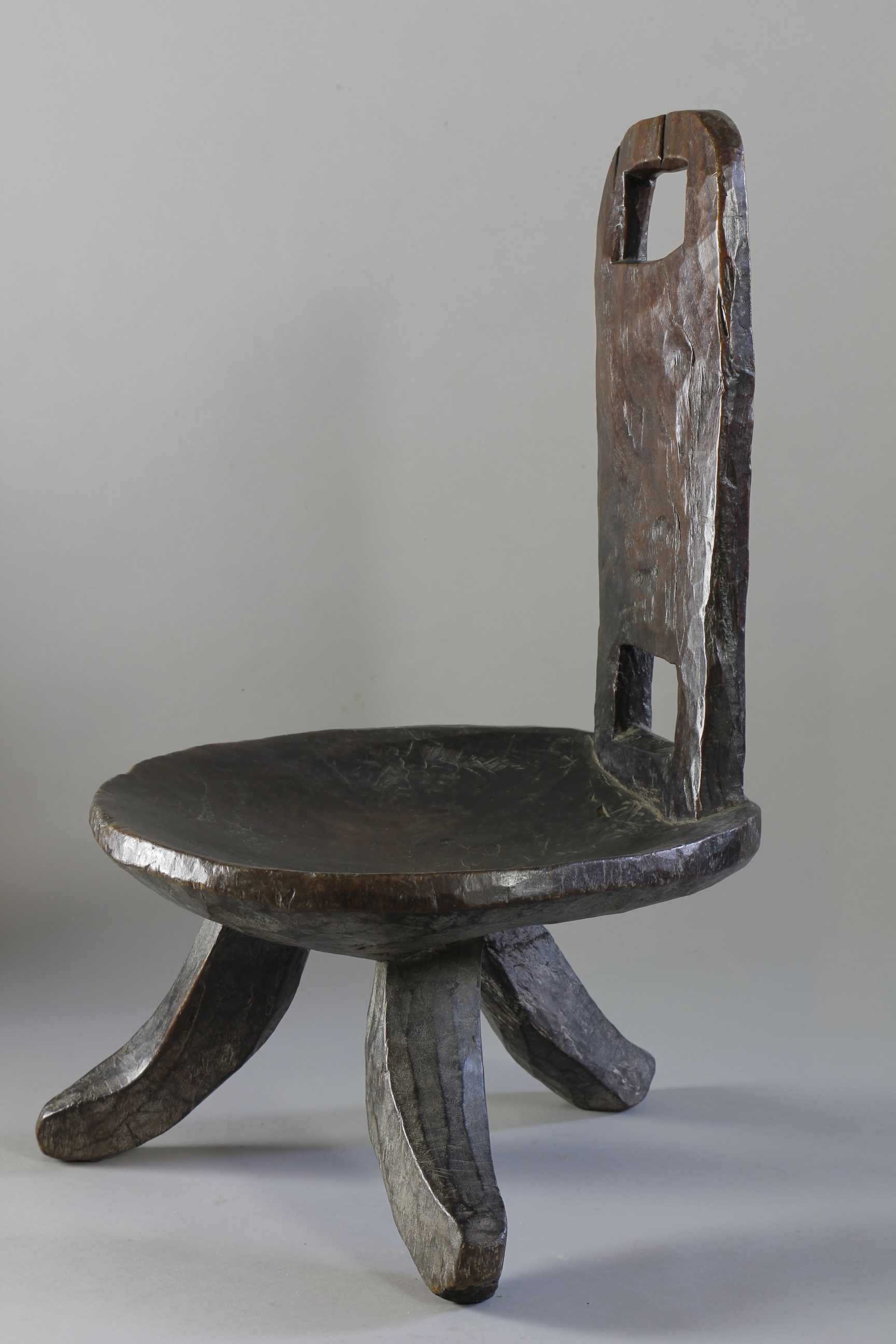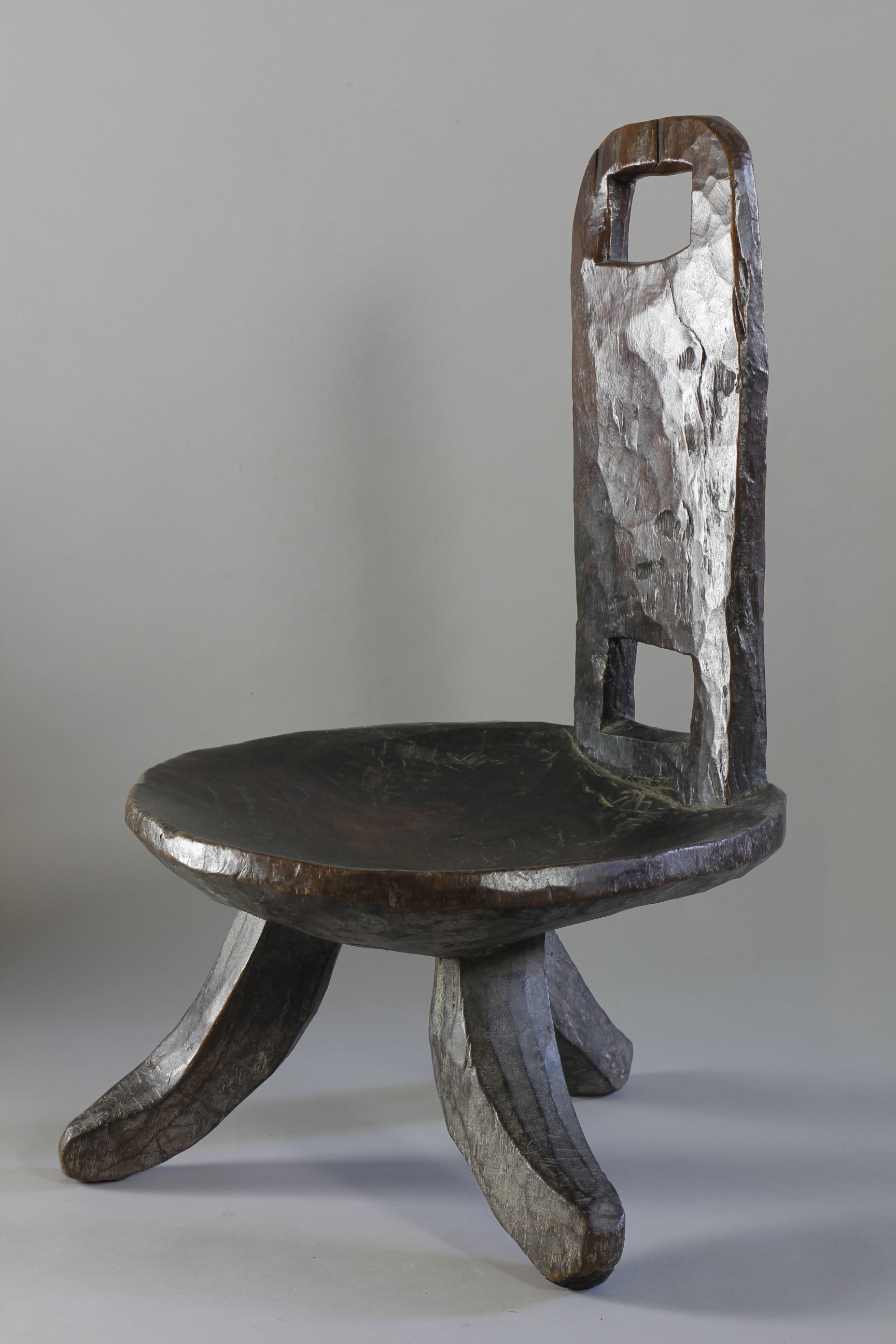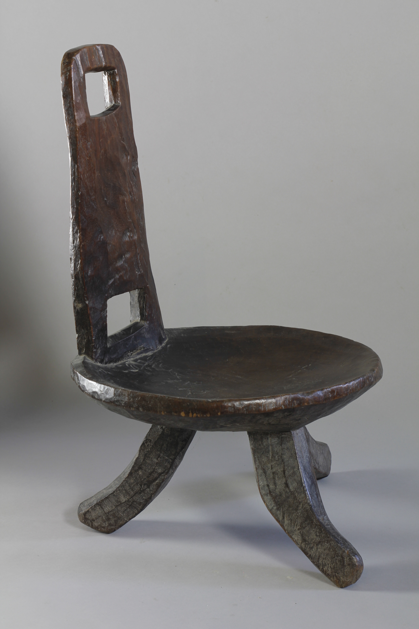 A lovely early high backed chair with a deep and lusty patina. Typically carved from one piece of wood with a simply constructed back support with two cut-out spaces, lower and upper on the back support. Three curved legs support the circular seat of a large proportion. High-backed chairs such as this were an important symbol of status amongst many culture in the southern and western regions of Ethiopia through-out the 19th and early 20th Century.