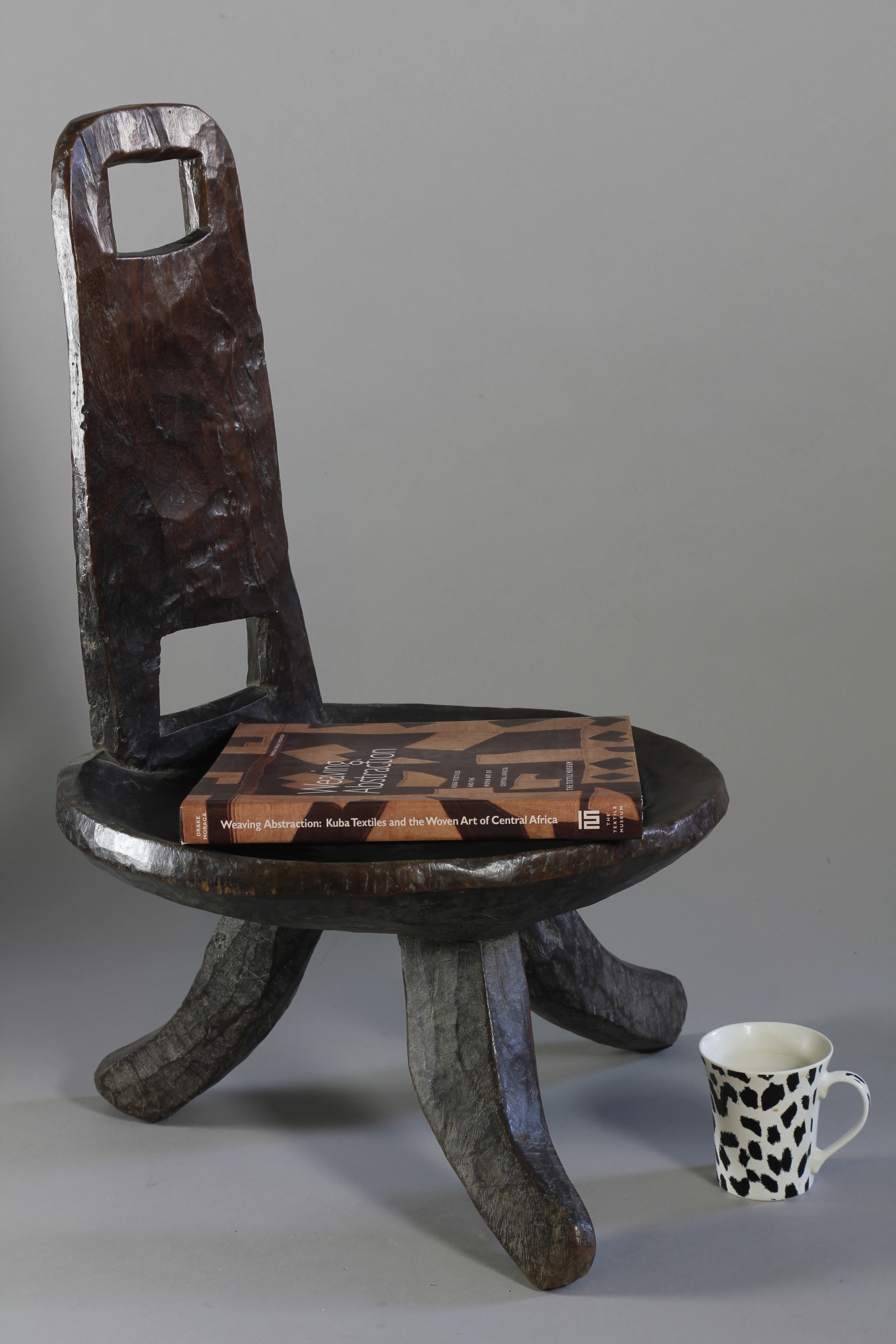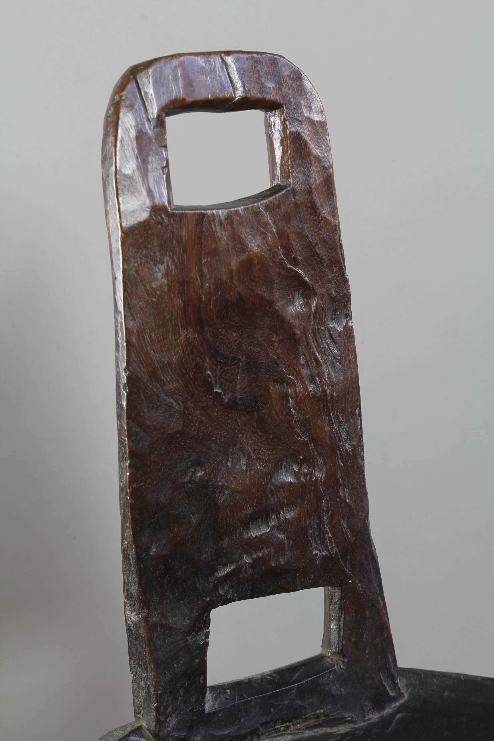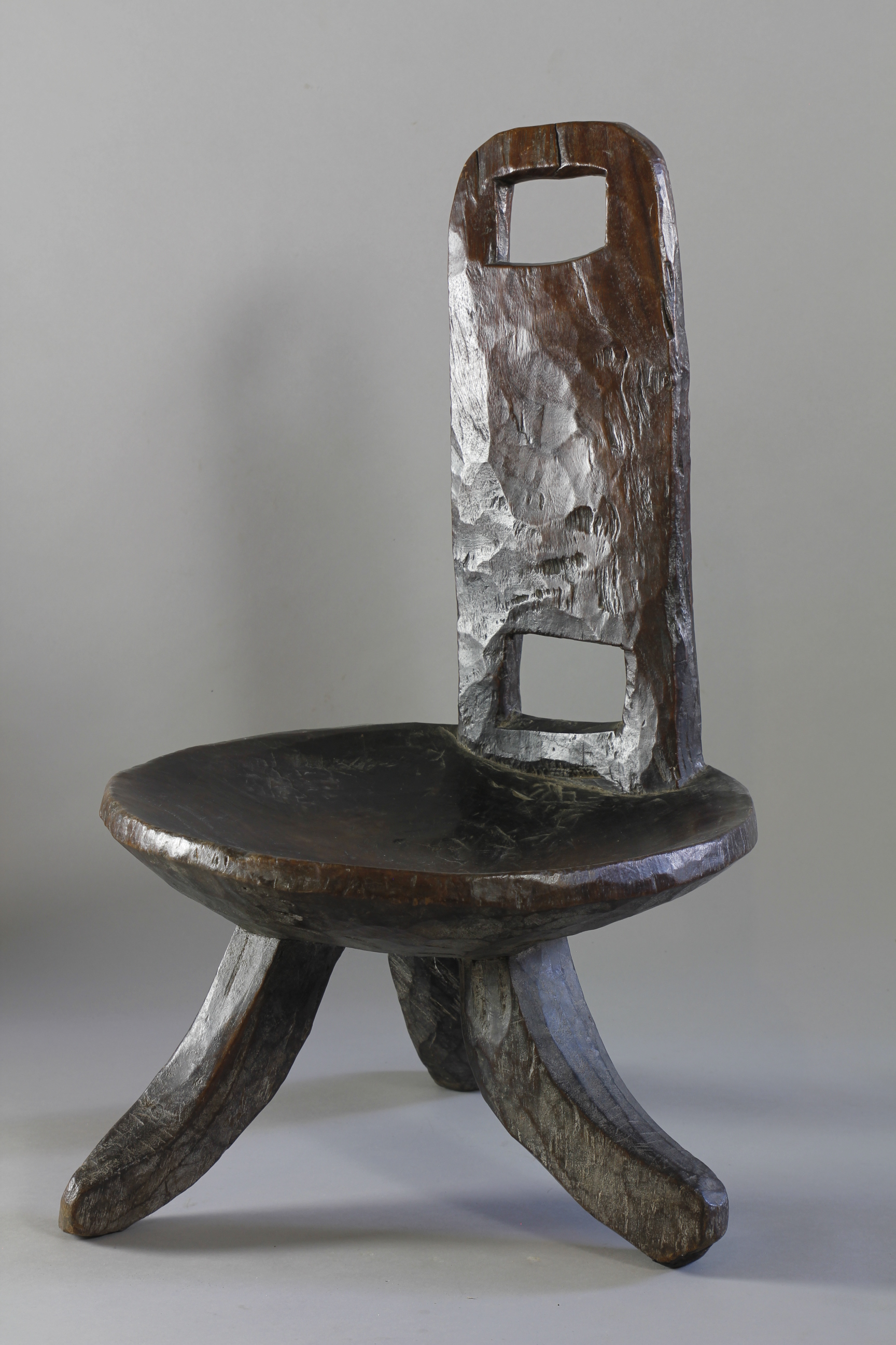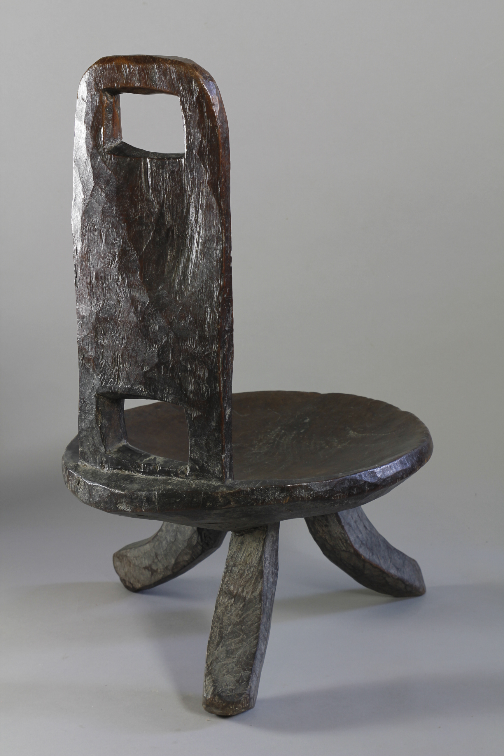 A lovely early high backed chair with a deep and lusty patina. Typically carved from one piece of wood with a simply constructed back support with two cut-out spaces, lower and upper on the back support. Three curved legs support the circular seat of a large proportion. High-backed chairs such as this were an important symbol of status amongst many culture in the southern and western regions of Ethiopia through-out the 19th and early 20th Century.