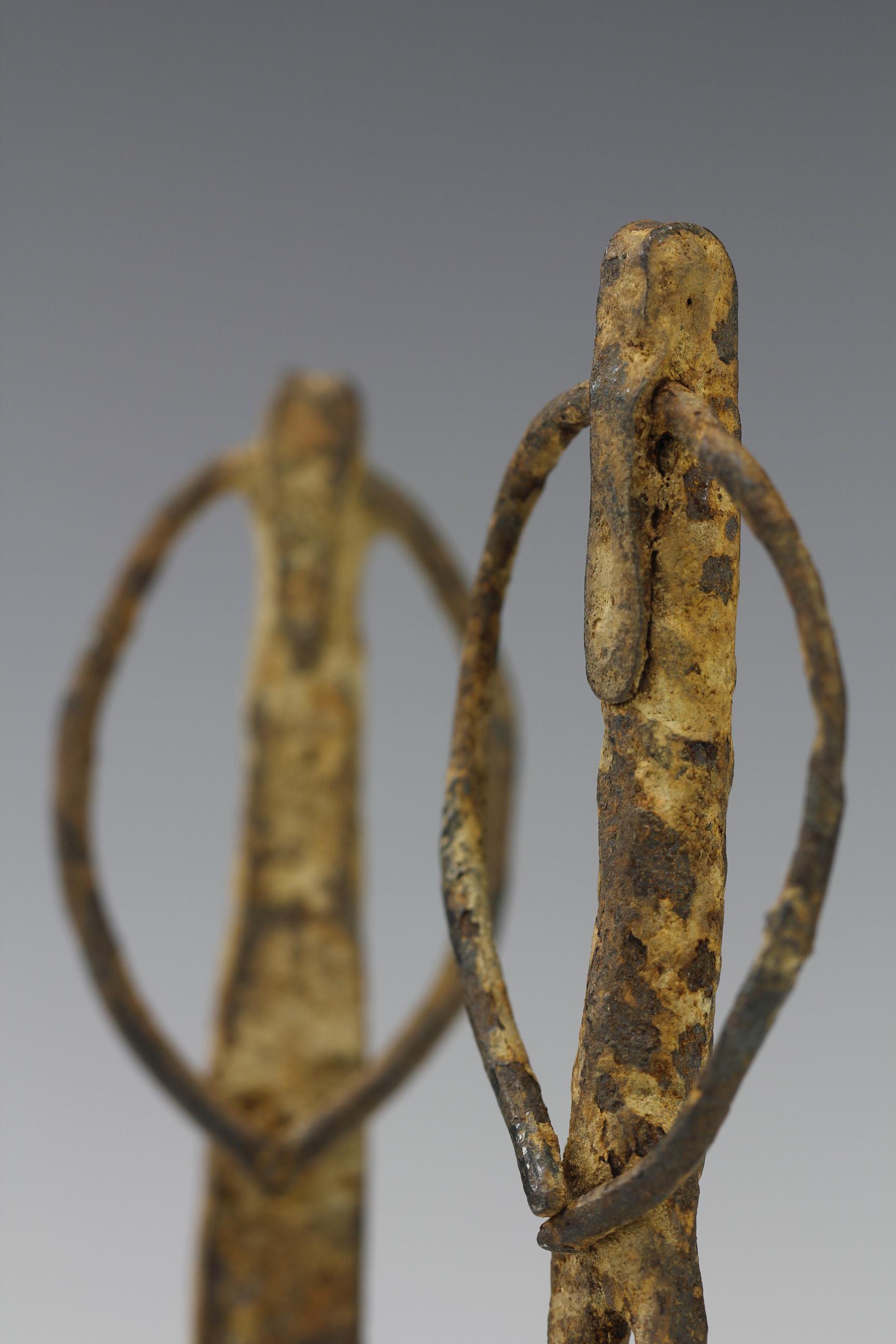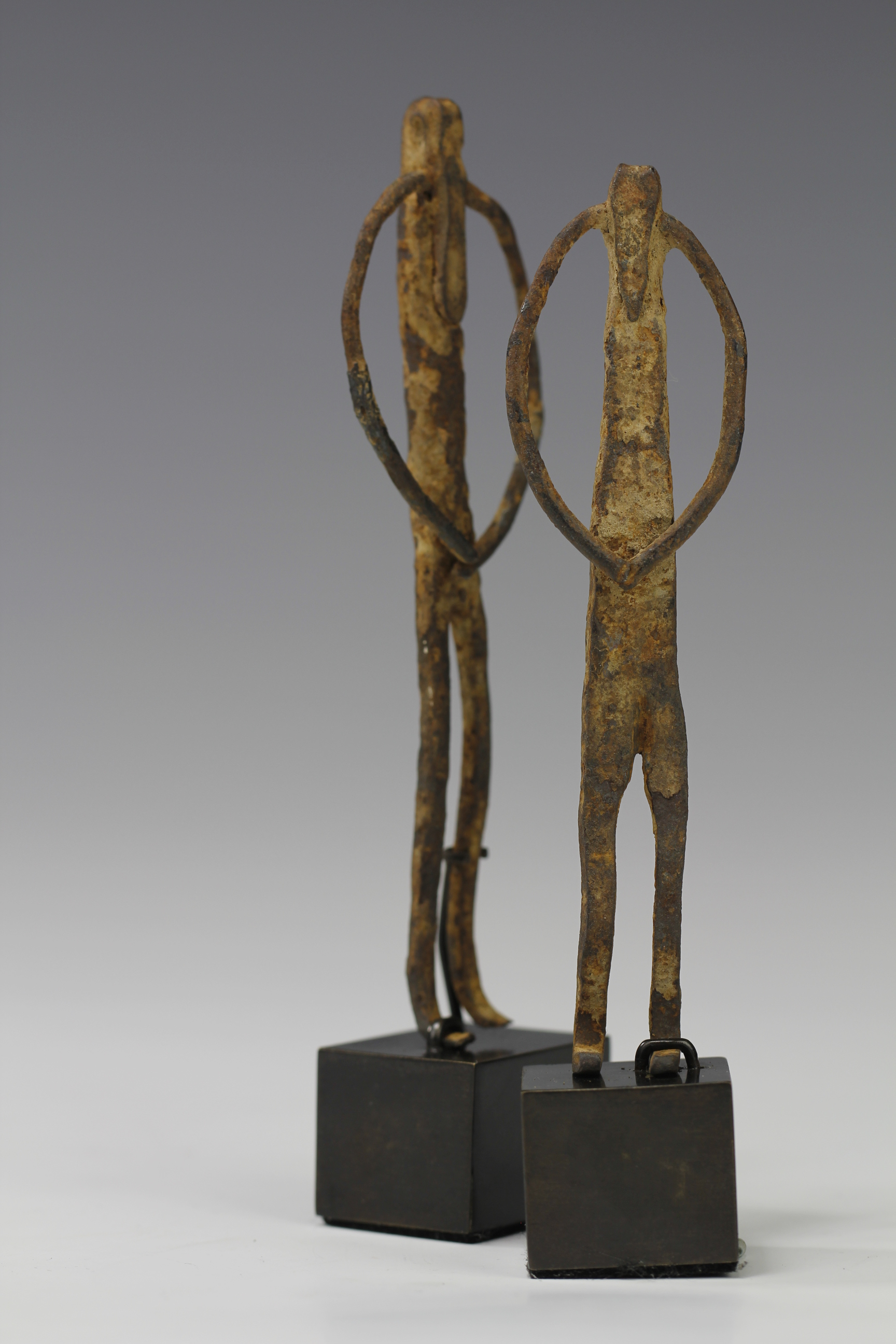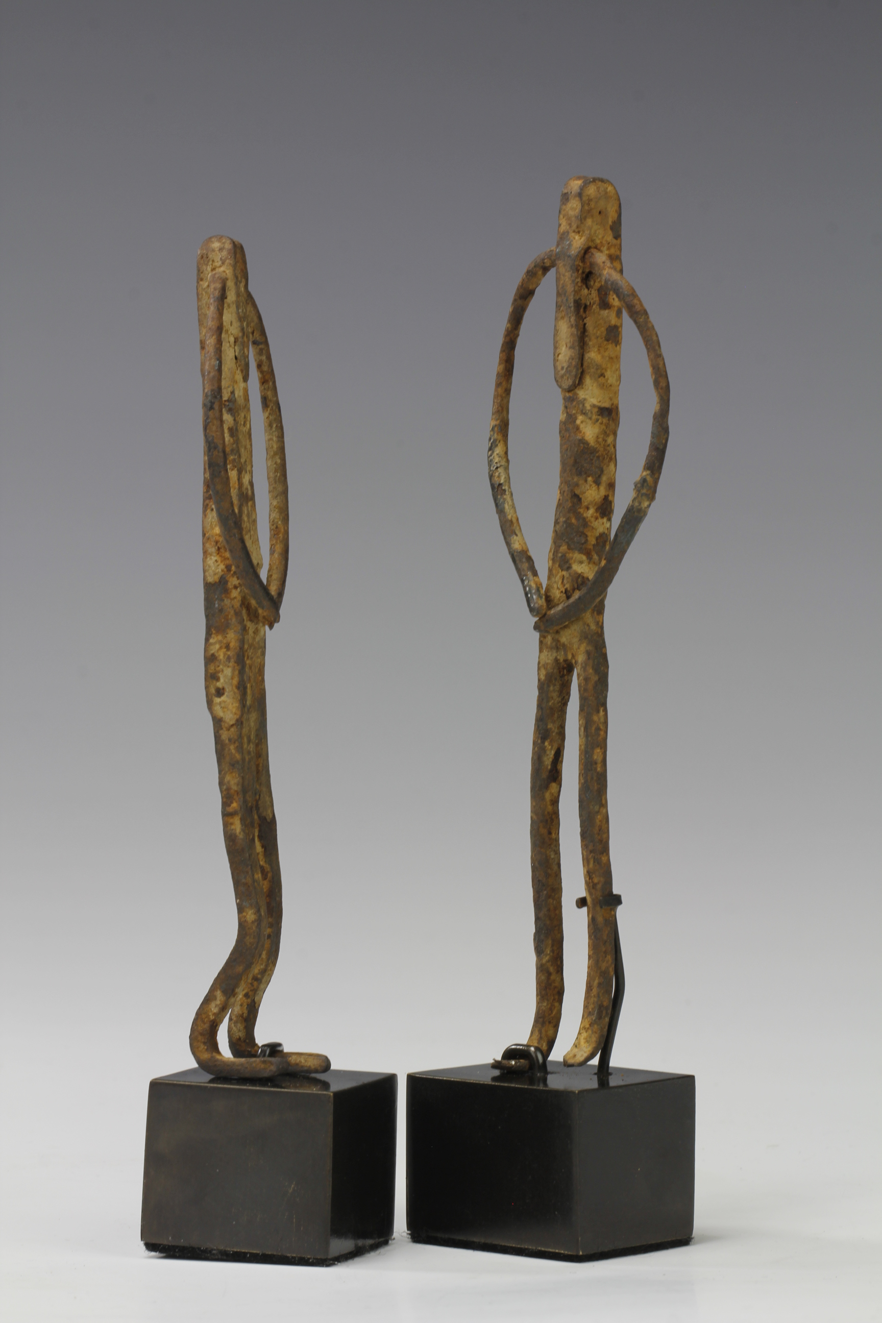 A pair of small finely forged Gan or Lobi iron figures each with a deep encrusted surface.