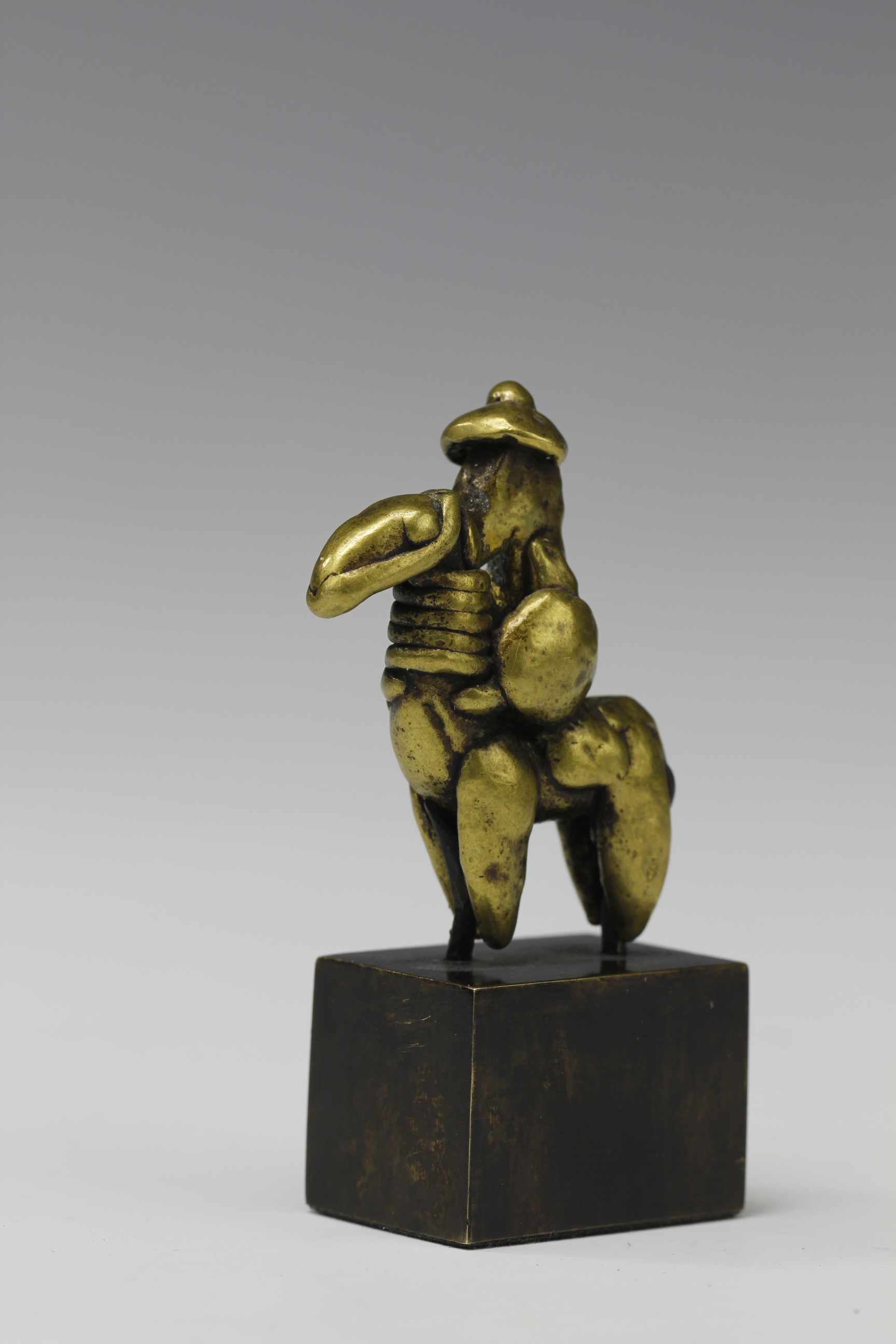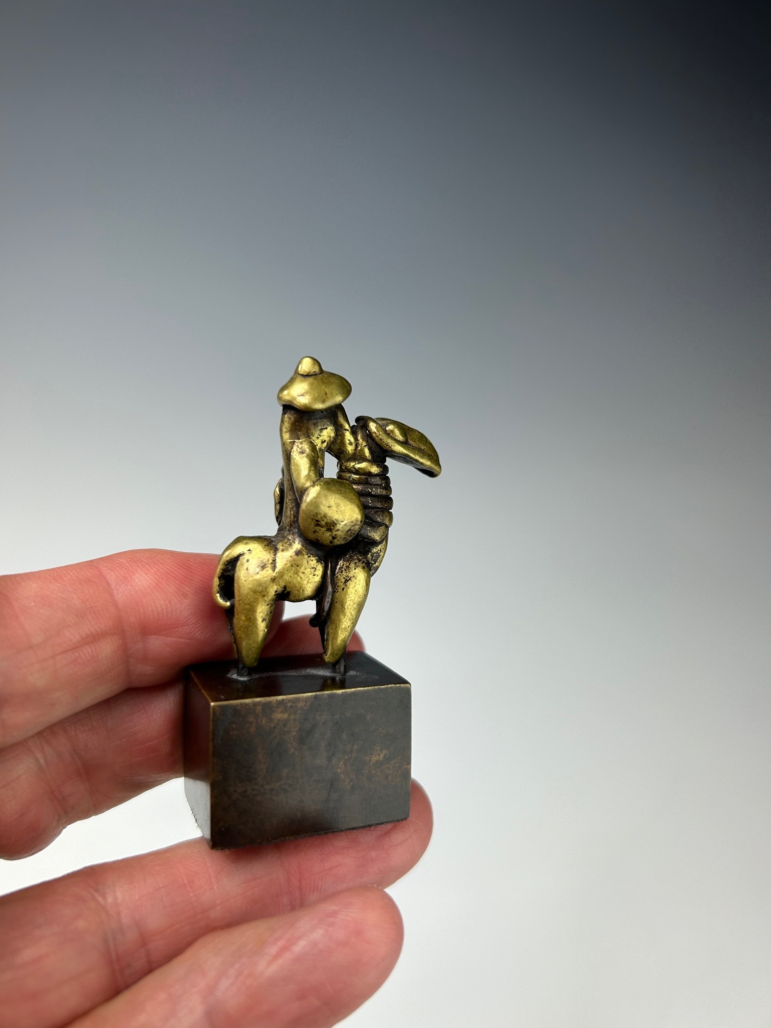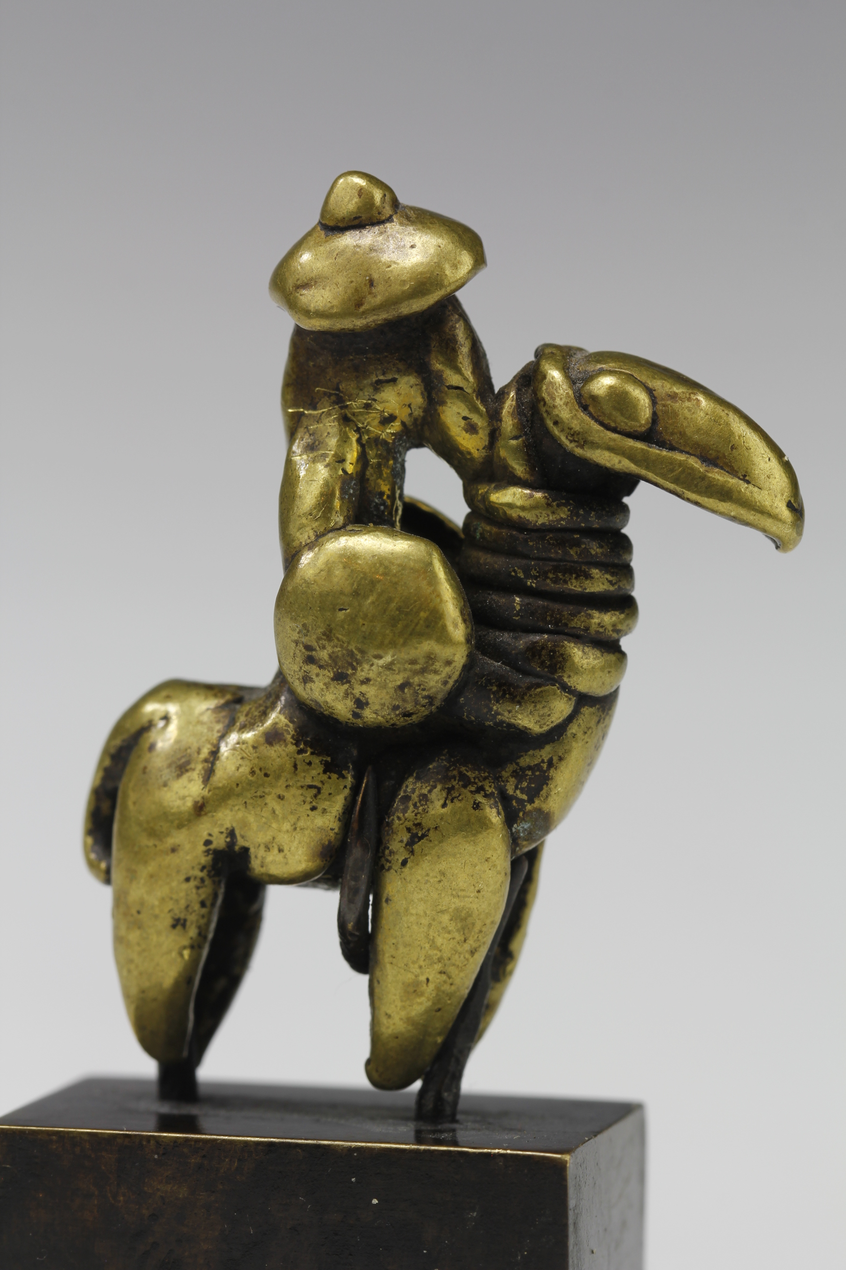 A wonderful cast miniature bronze caricature of a horse and rider. Such pieces termed (Putchu Guinadji), sometimes found wrapped, stitched and encased in leather, had a traditional function acting as a protective charm from harmful spirits. The casting represents a Kotoko rider, sitting proudly upright on his horse, wearing a traditional hat and holding round shields in both arms. The image of the horse and rider recalls a broader history of mounted warfare and exchange throughout the greater Sahel Region of West Africa.