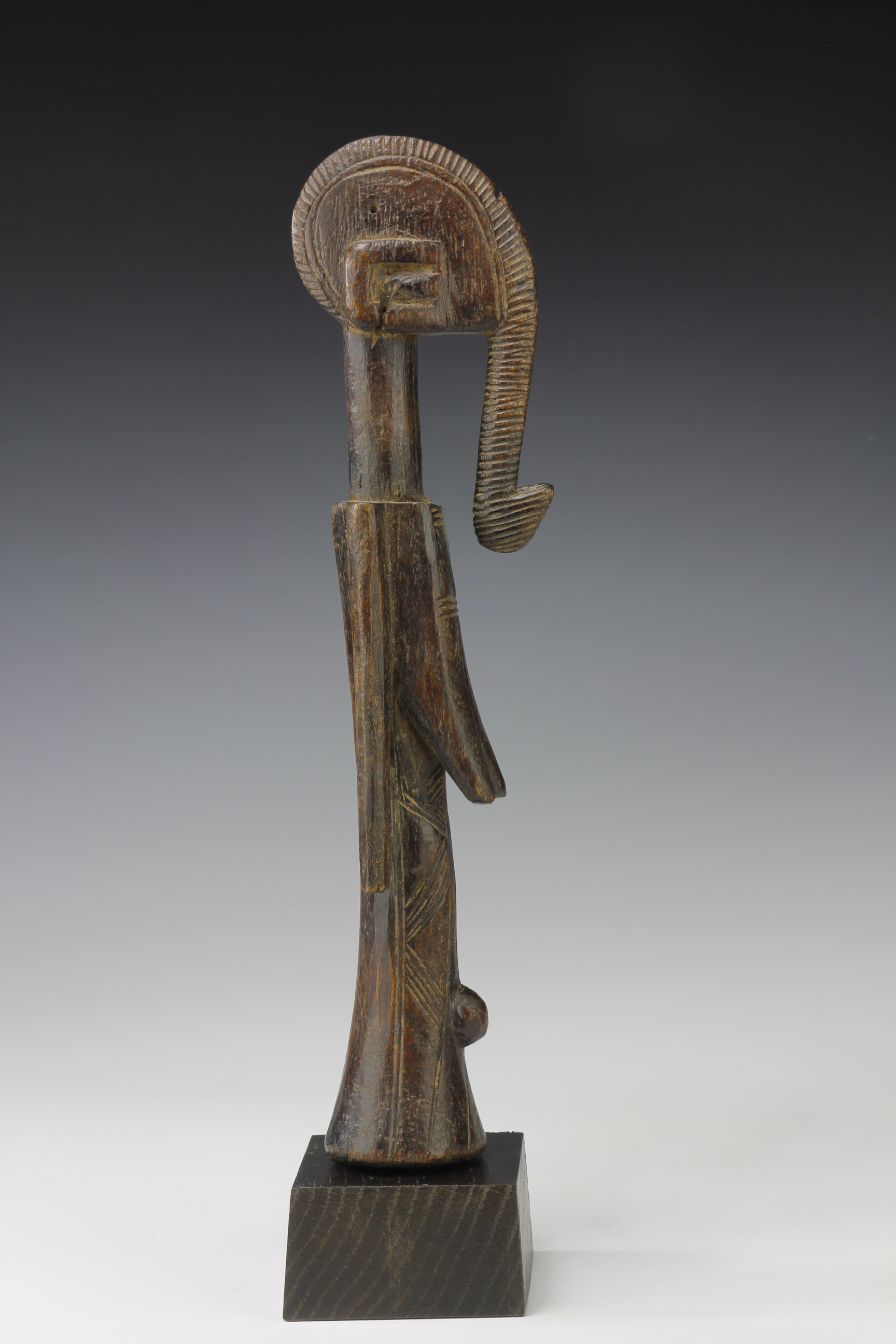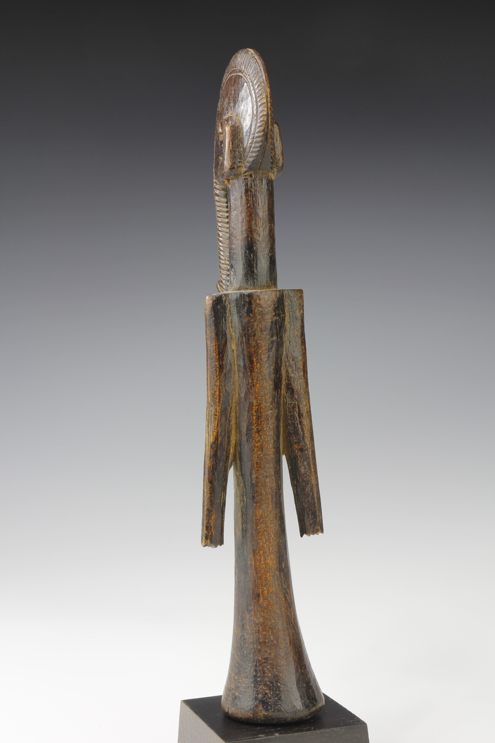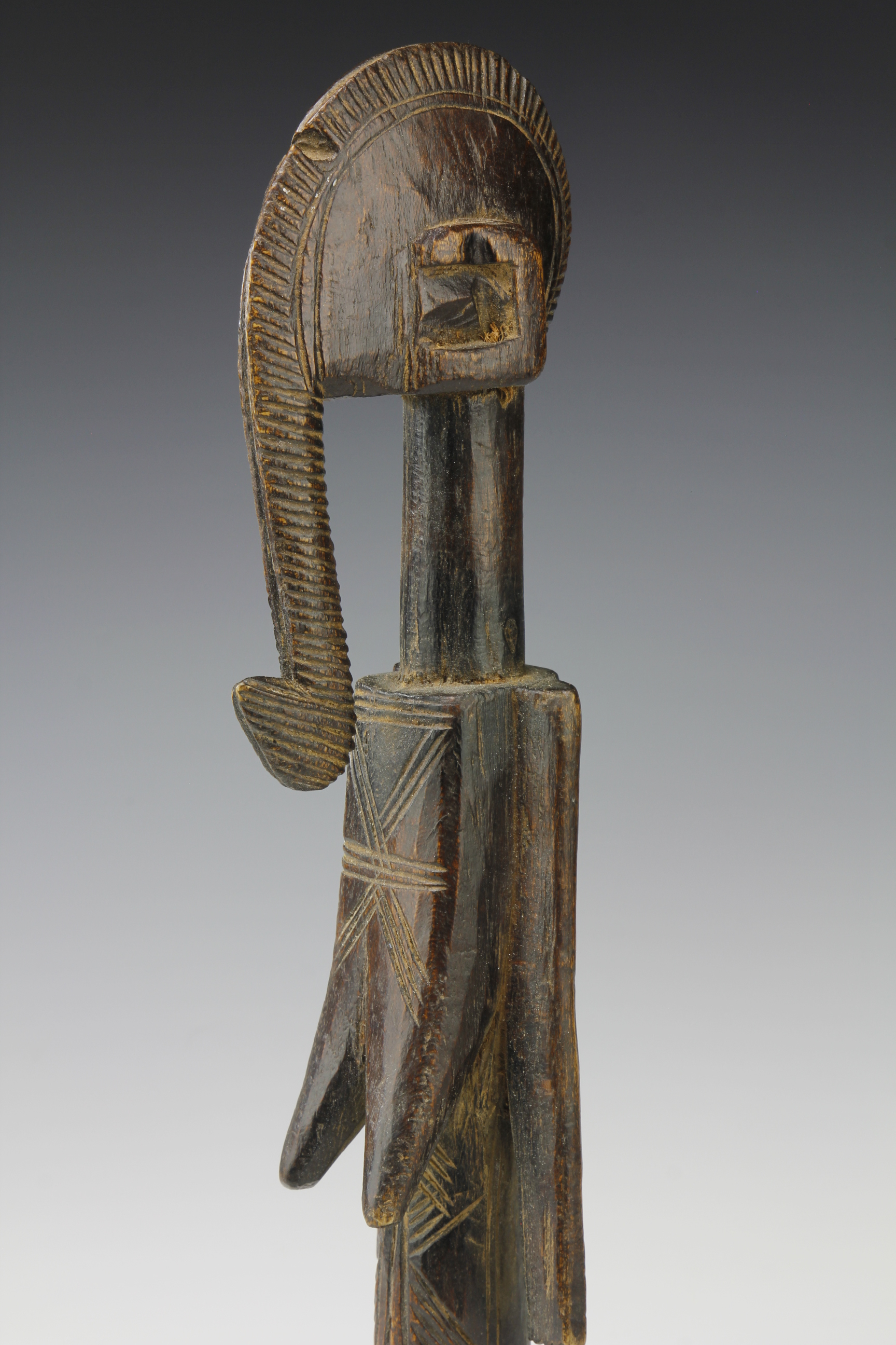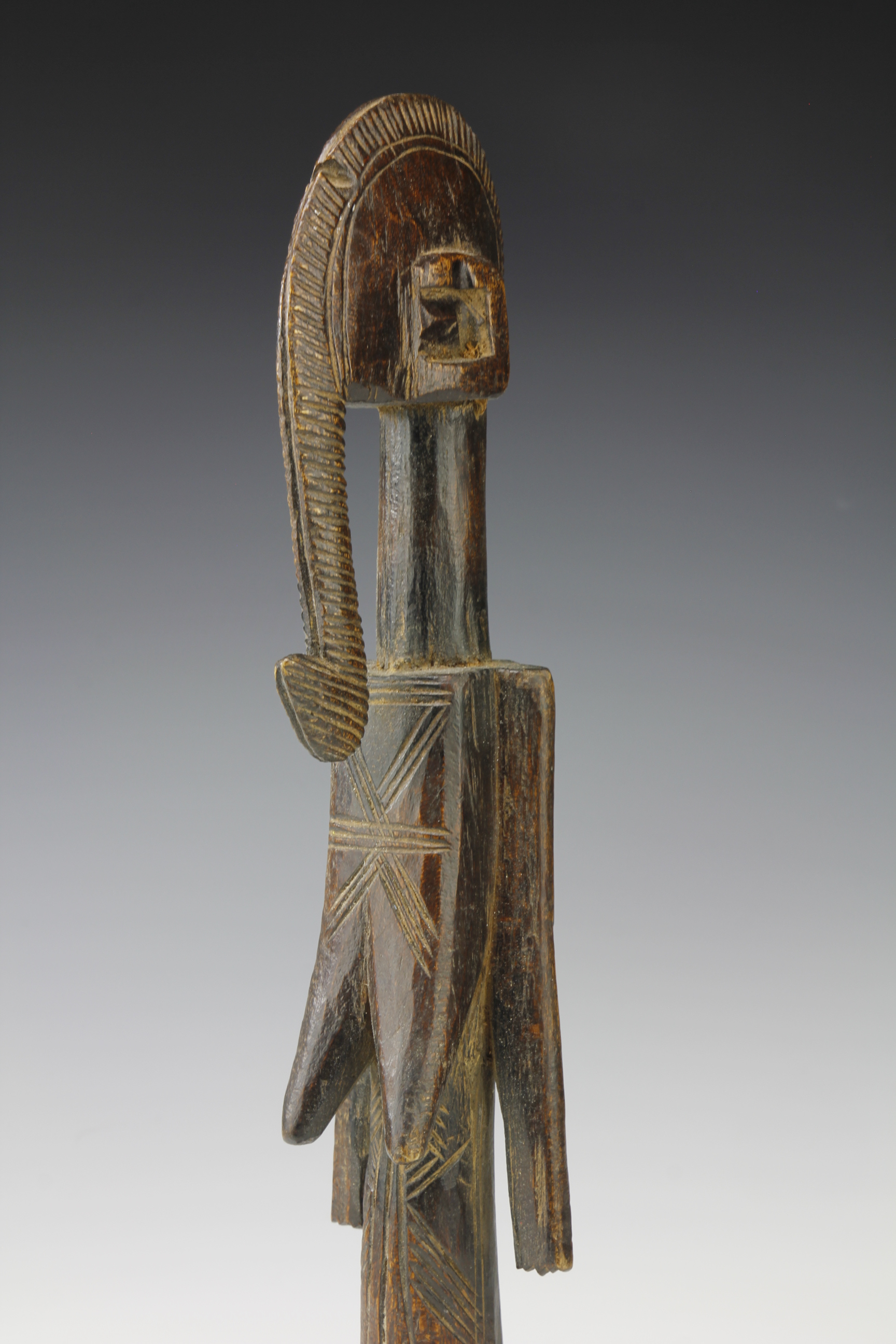 It is unusual to find a Mossi doll carved in this form, showing the abstract female form with outstretched arms by its side. The sculpture is beautifully executed and finely balanced, a long extension follows down the bridge of the face with the body decorated with fine cross-hatch and striations designs. The surface patina is deep, worn and glossy.