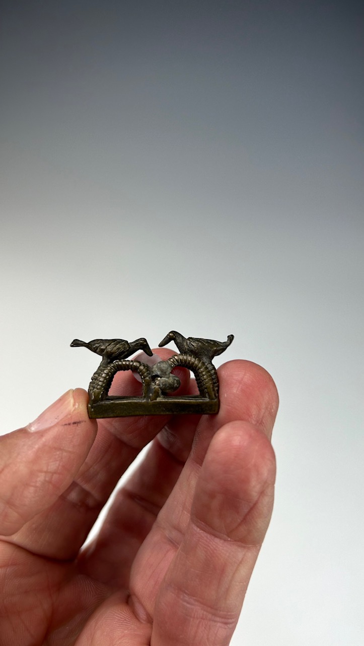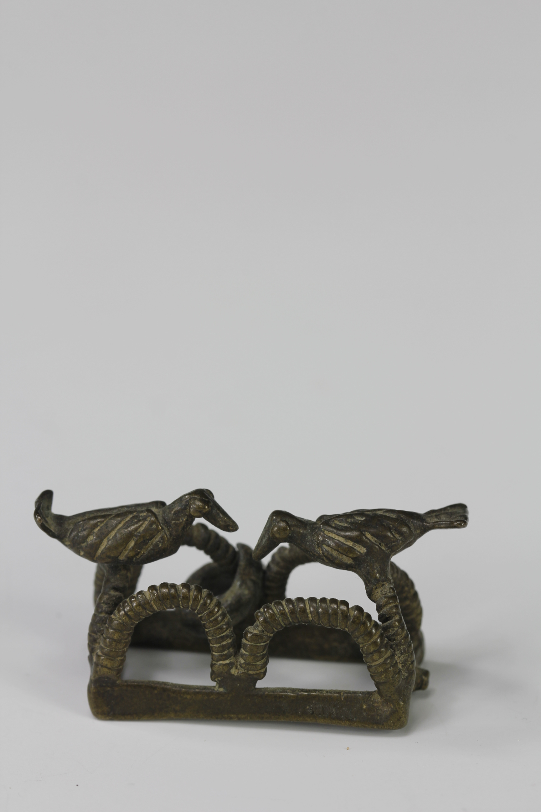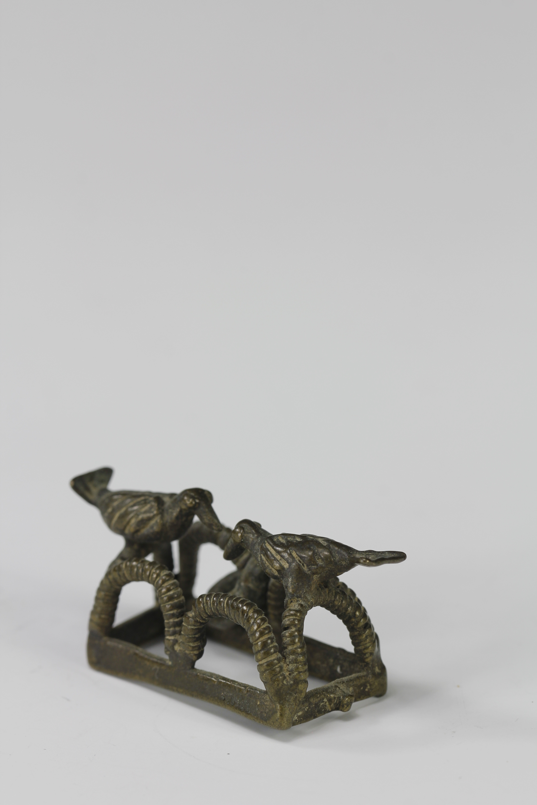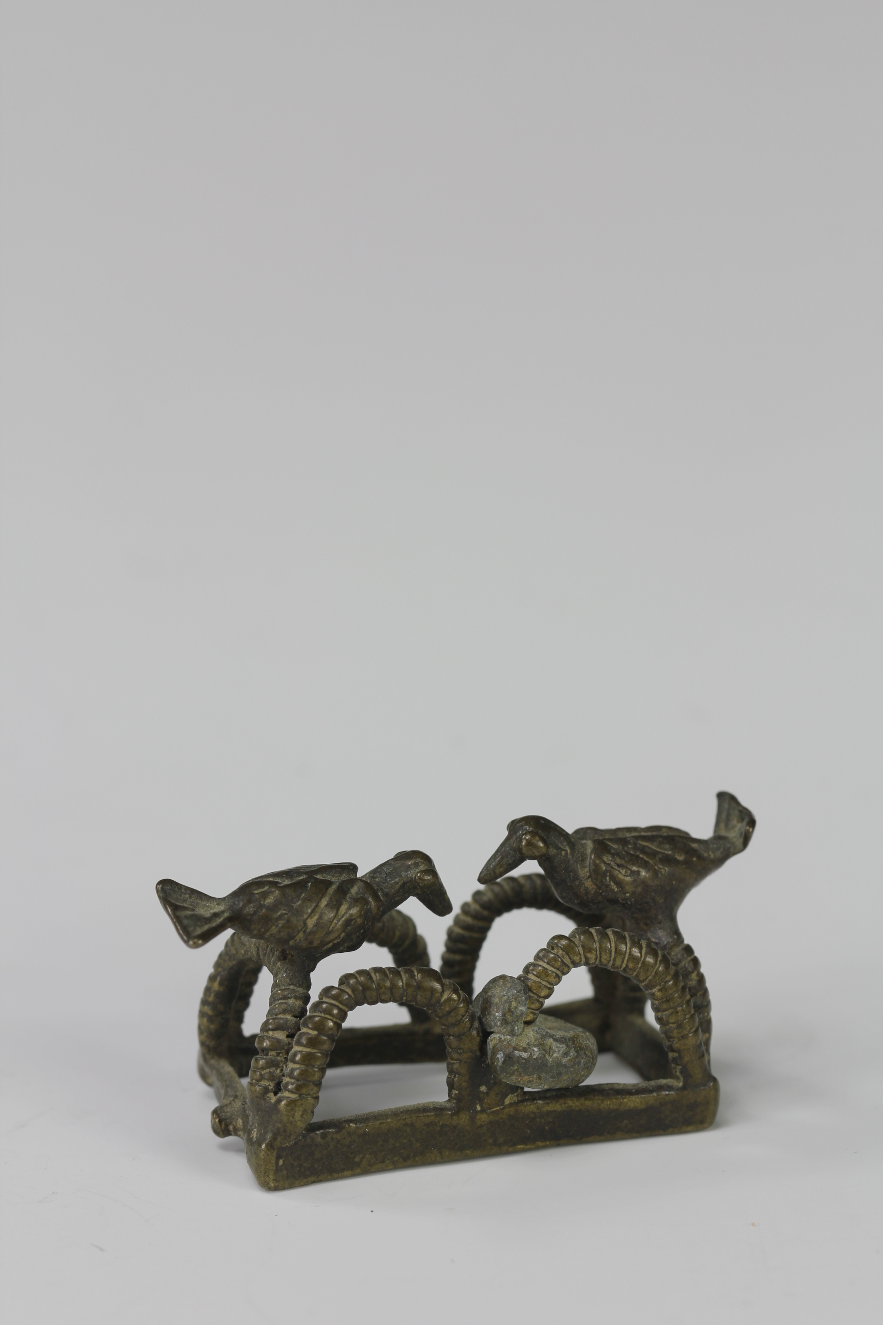 This Akan gold weight depicts two birds perched on top of a trap structure. The weight is finely cast showing fine details of the birds feathers and the each of the looped structures of the trap. Attached to one of the loops is a small bundle-like bronze piece that would have acted as a counter weight.