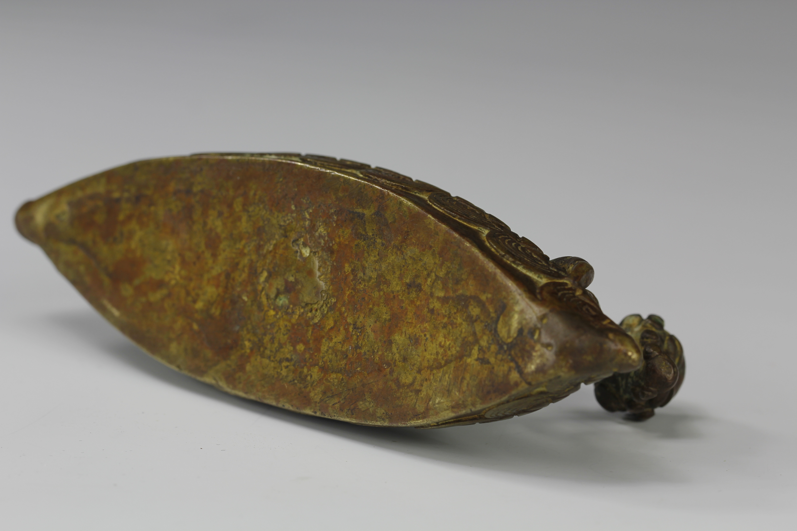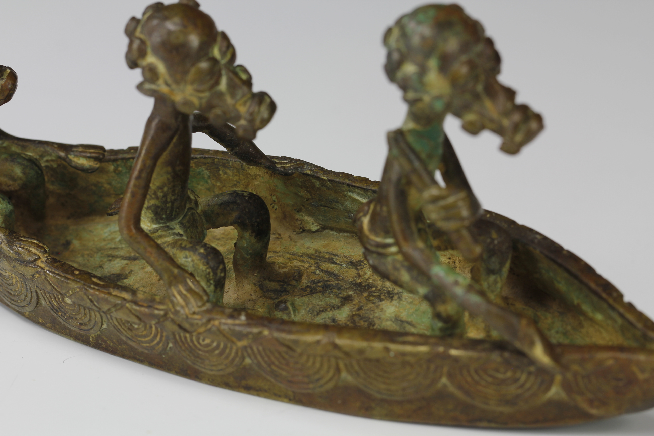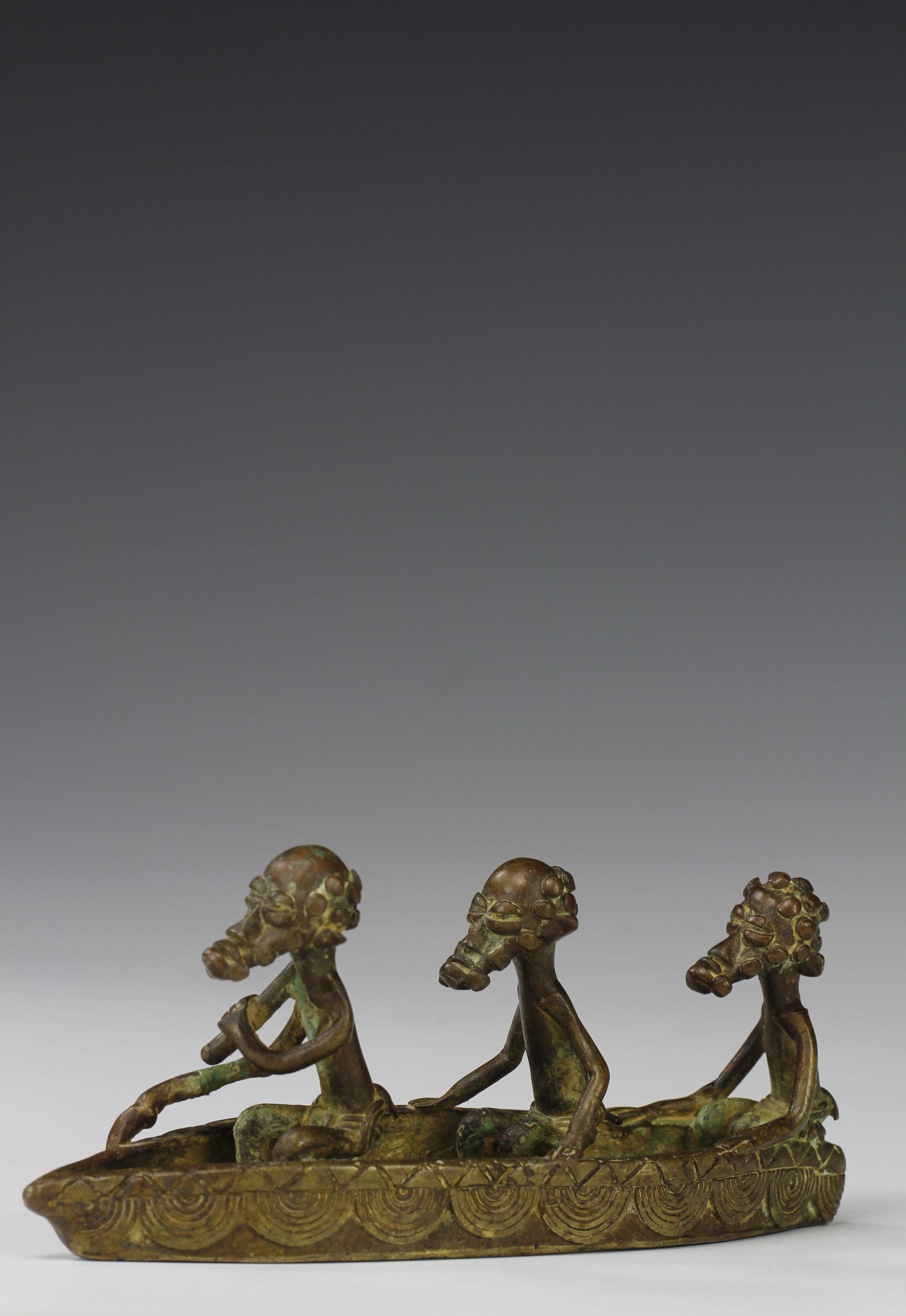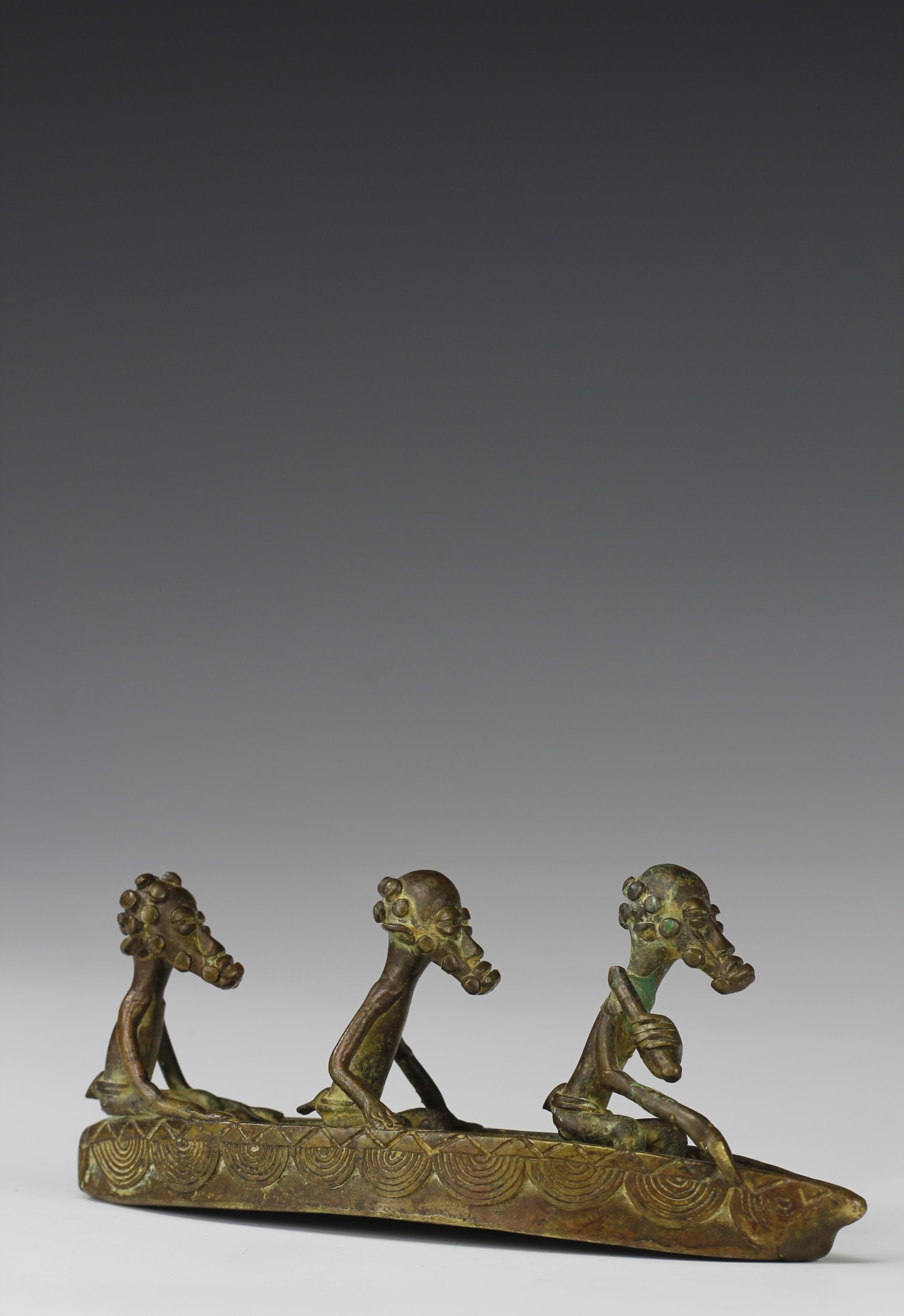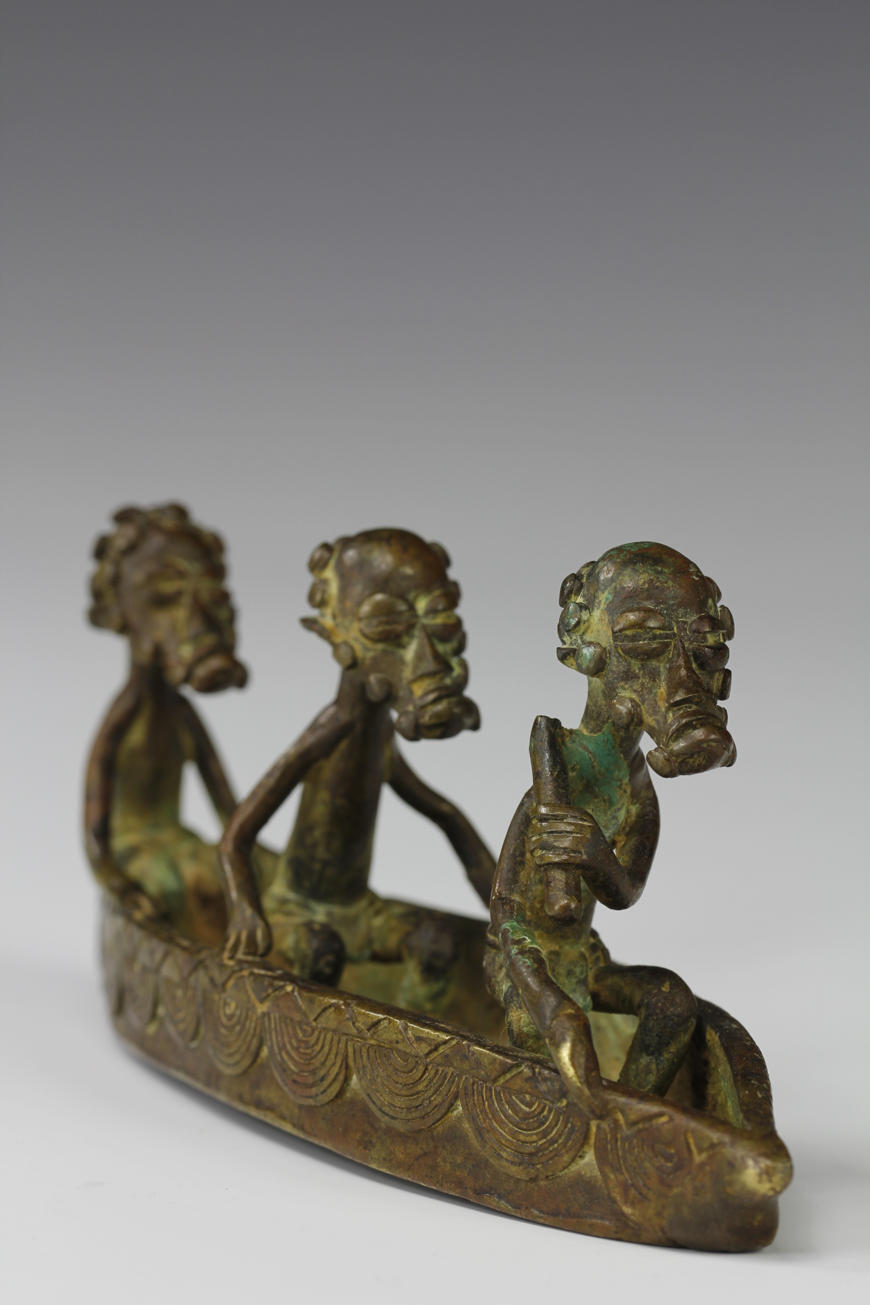 At 15 cm in length it is unlikely this piece was a gold weight as its too large, although the Akan have been know to produce bronze gold weights depicting men in a canoe up to nearly 10 cm in length. It is more likely this Baule bronze from the Ivory Coast, who were also know to product gold weights, was made as a item of prestige. The detail of the casting is fine, it has a part verdigris surface more around the inside of the boat and legs of the sitting figures. The surface is smooth and worn, overall it feels like a piece dating to the early part of the 20th Century. However what the piece was traditionally used for is a bit of a mystery.