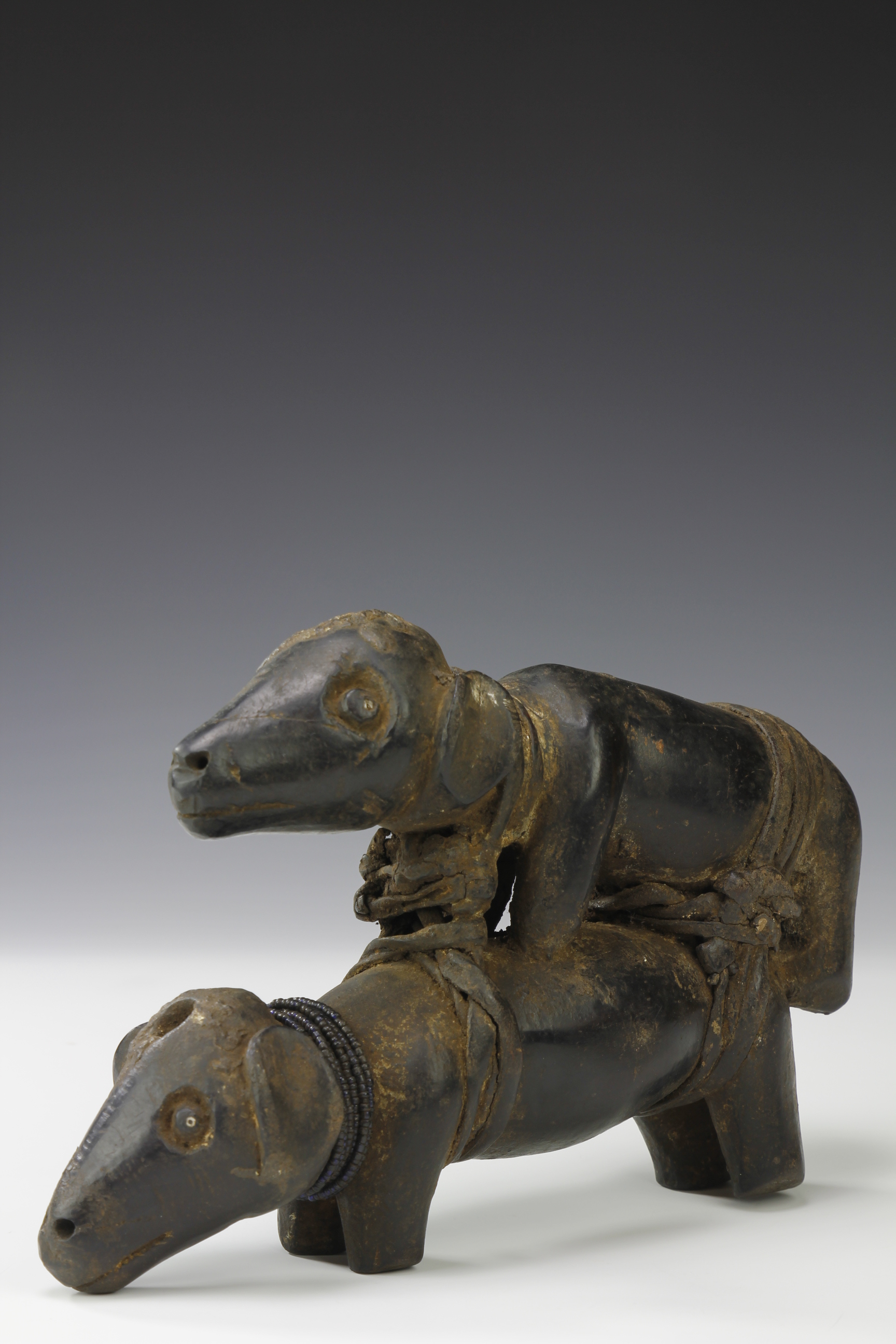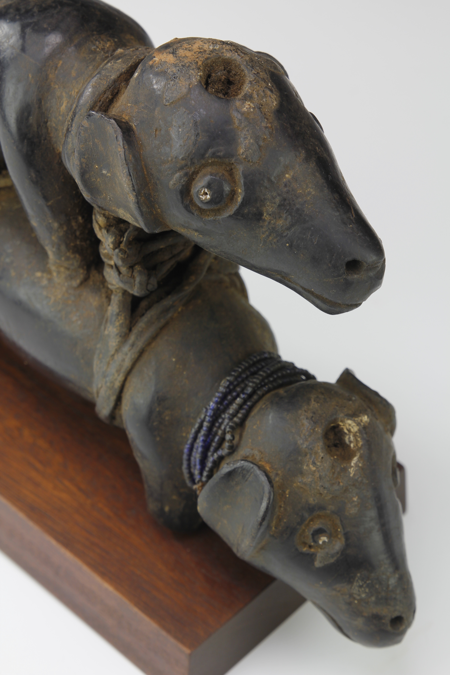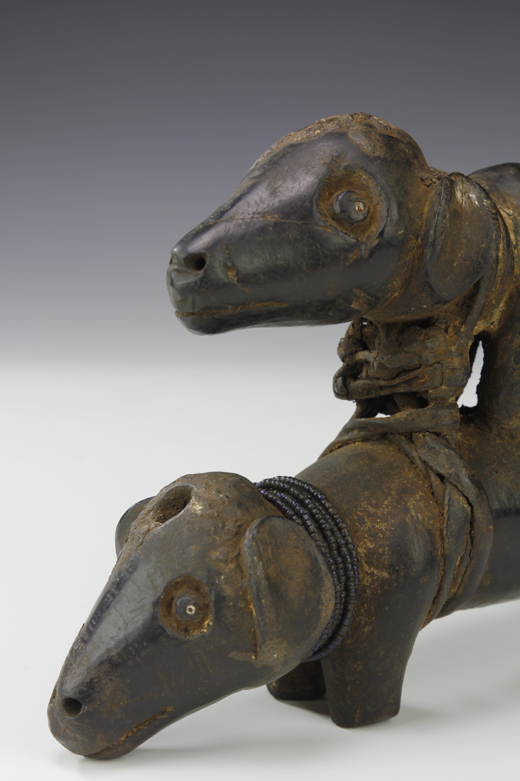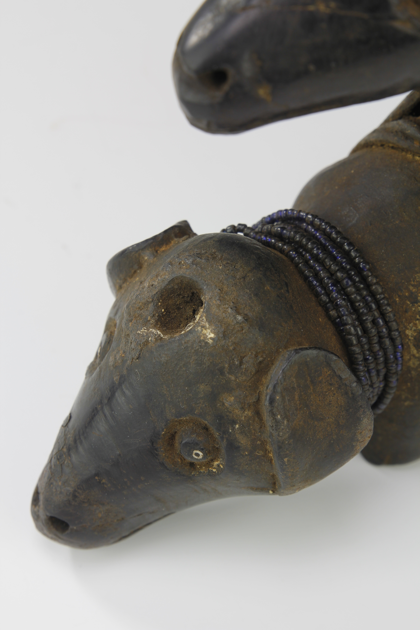A very unusual Zigua traditional fetish depicting two animals, likely dogs, one positioned on the back of the other. Carved from one piece of a hard dark wood, with leather strapping binding the bodies together. Fetish holes appear at the rear of both animals and also to the foreheads of each. Ruminants of dried ritual medicines can be seem at the entrance to each of these holes. The purpose of these cavities was to empower the fetish which would have aided its curing powers during traditional healing rituals. The surface shows a smooth worn patina in parts where the piece would have been held during use.
