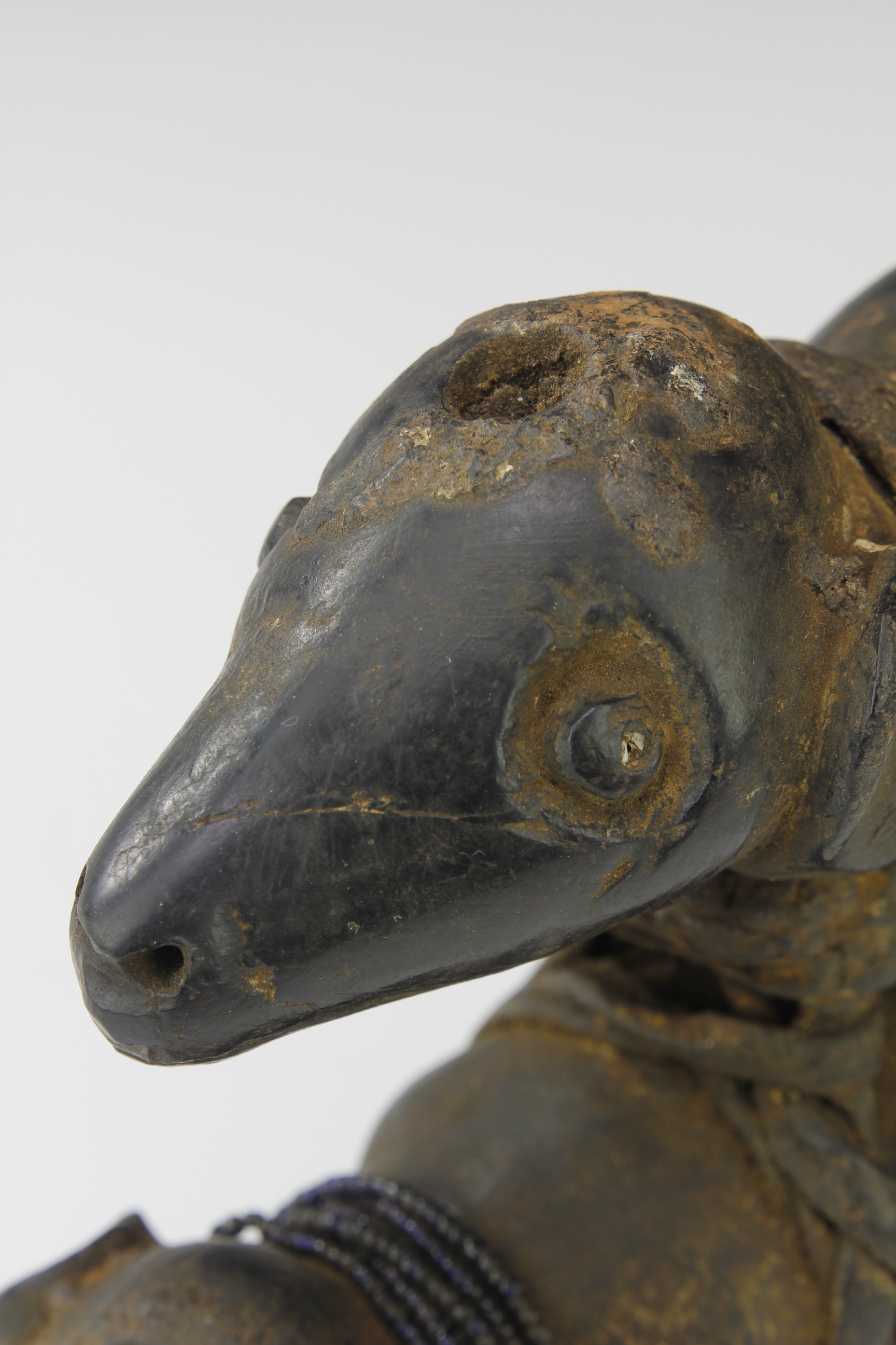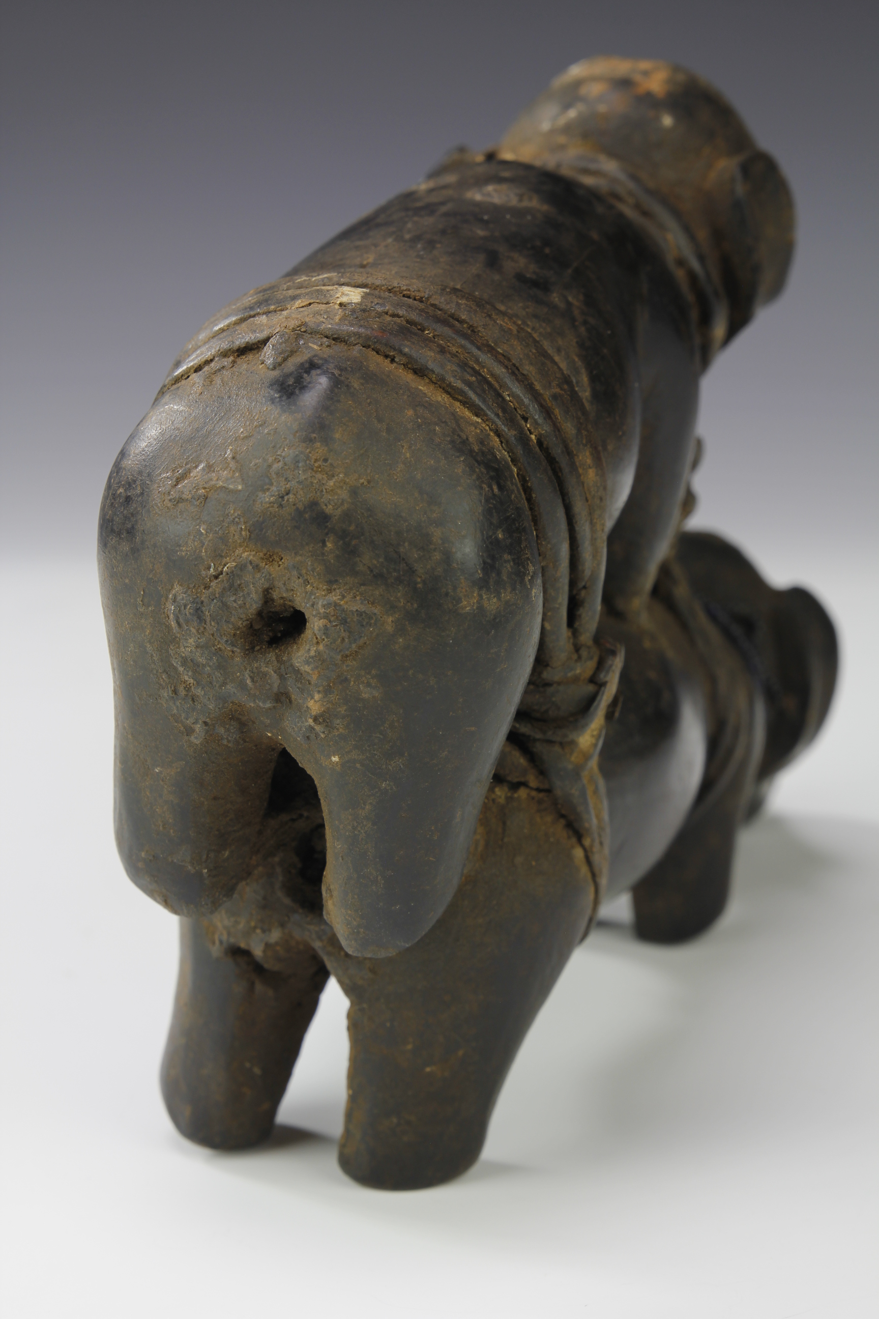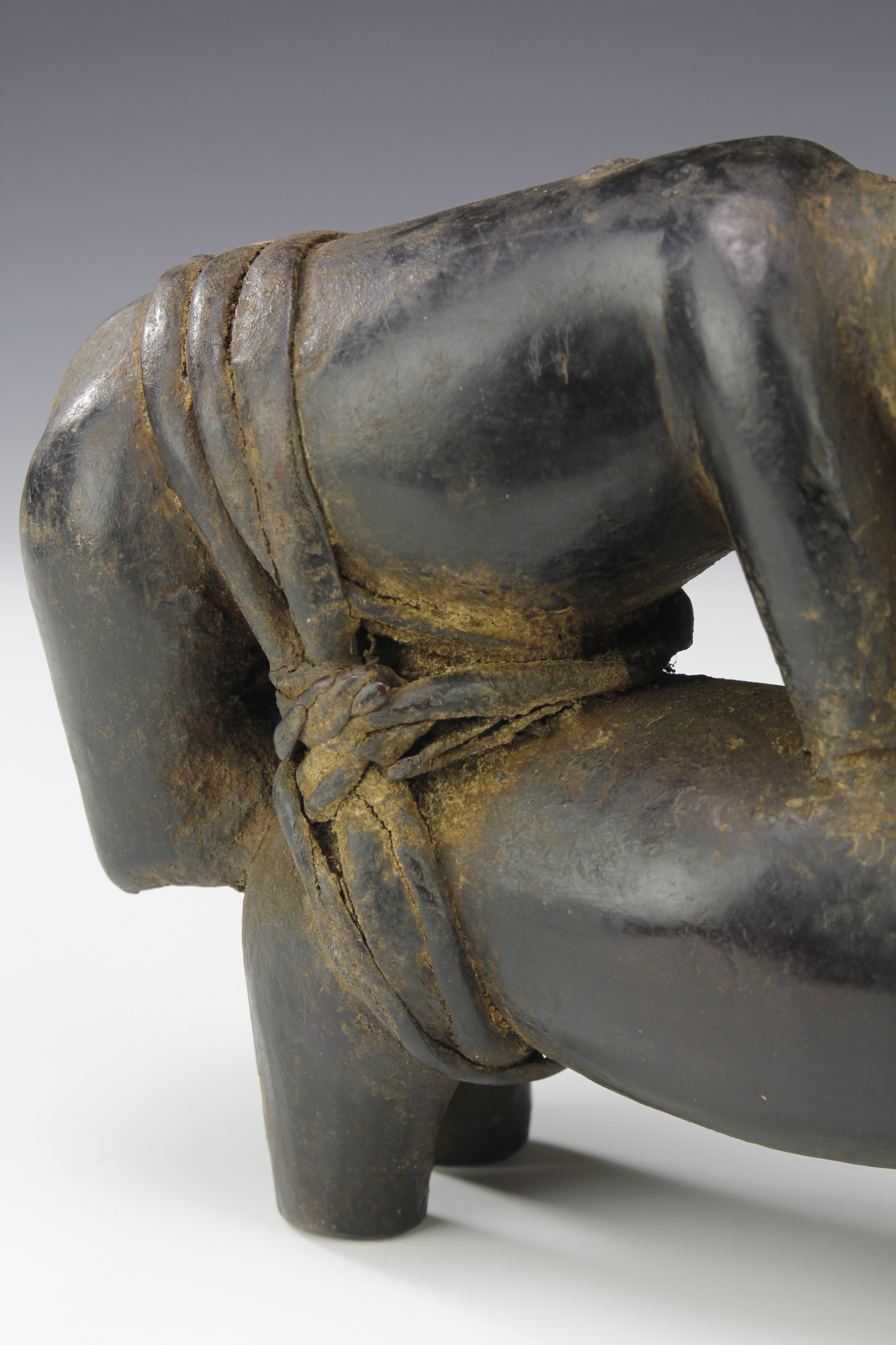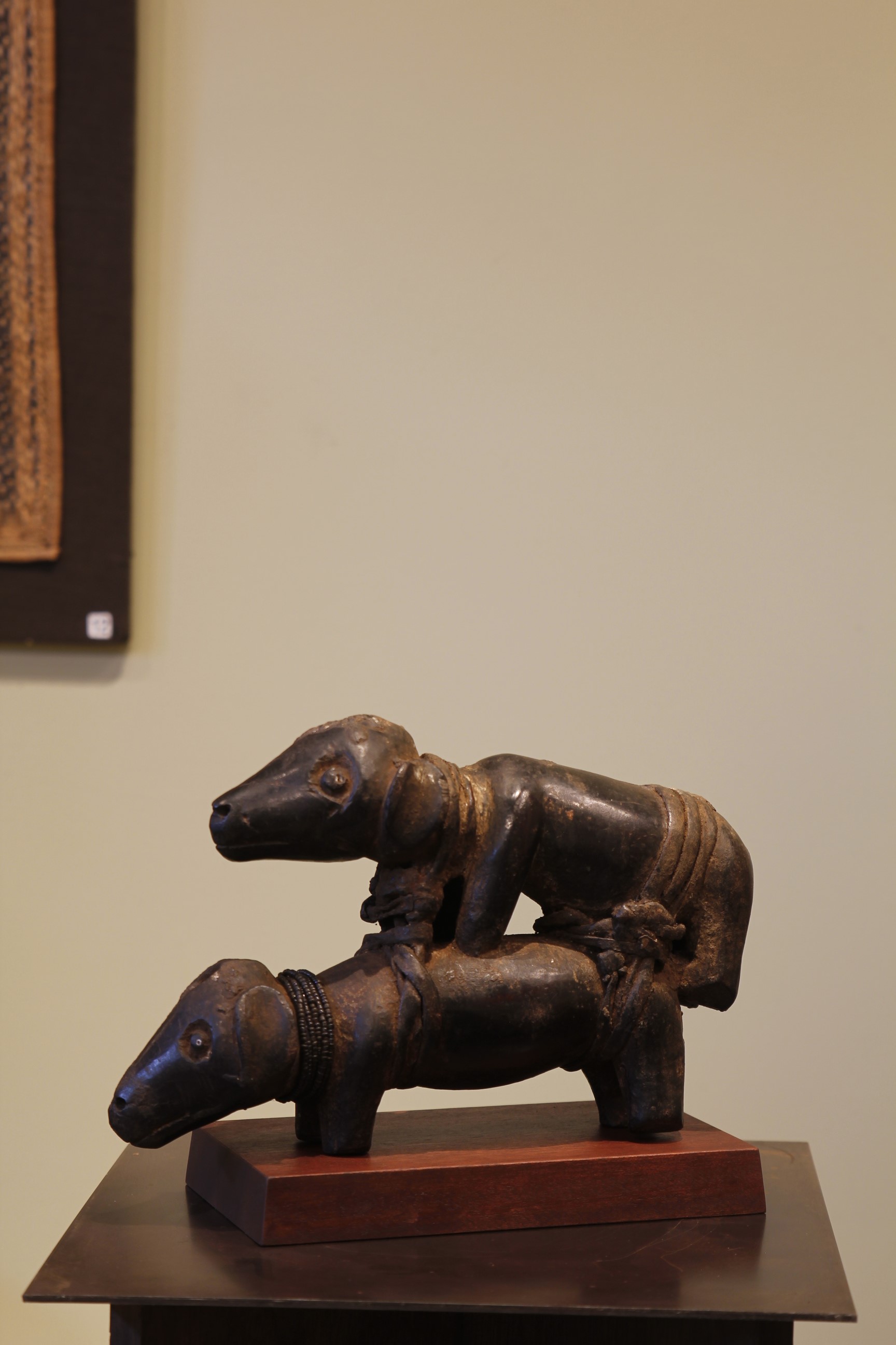 A very unusual Zigua traditional fetish depicting two animals, likely dogs, one positioned on the back of the other. Carved from one piece of a hard dark wood, with leather strapping binding the bodies together. Fetish holes appear at the rear of both animals and also to the foreheads of each. Ruminants of dried ritual medicines can be seem at the entrance to each of these holes. The purpose of these cavities was to empower the fetish which would have aided its curing powers during traditional healing rituals. The surface shows a smooth worn patina in parts where the piece would have been held during use.