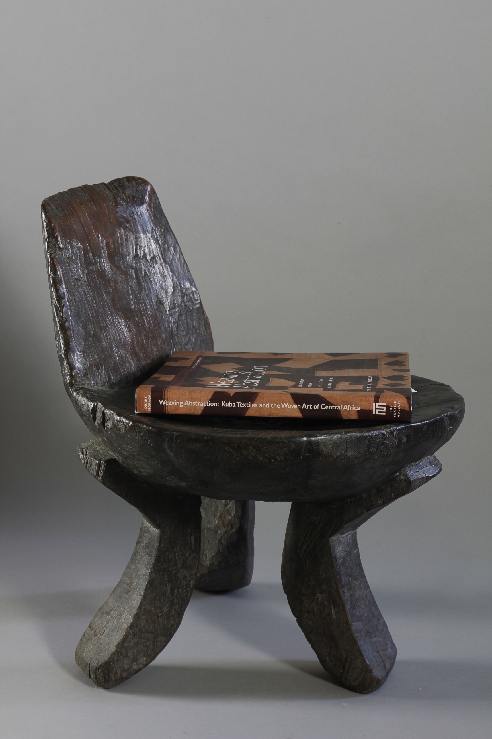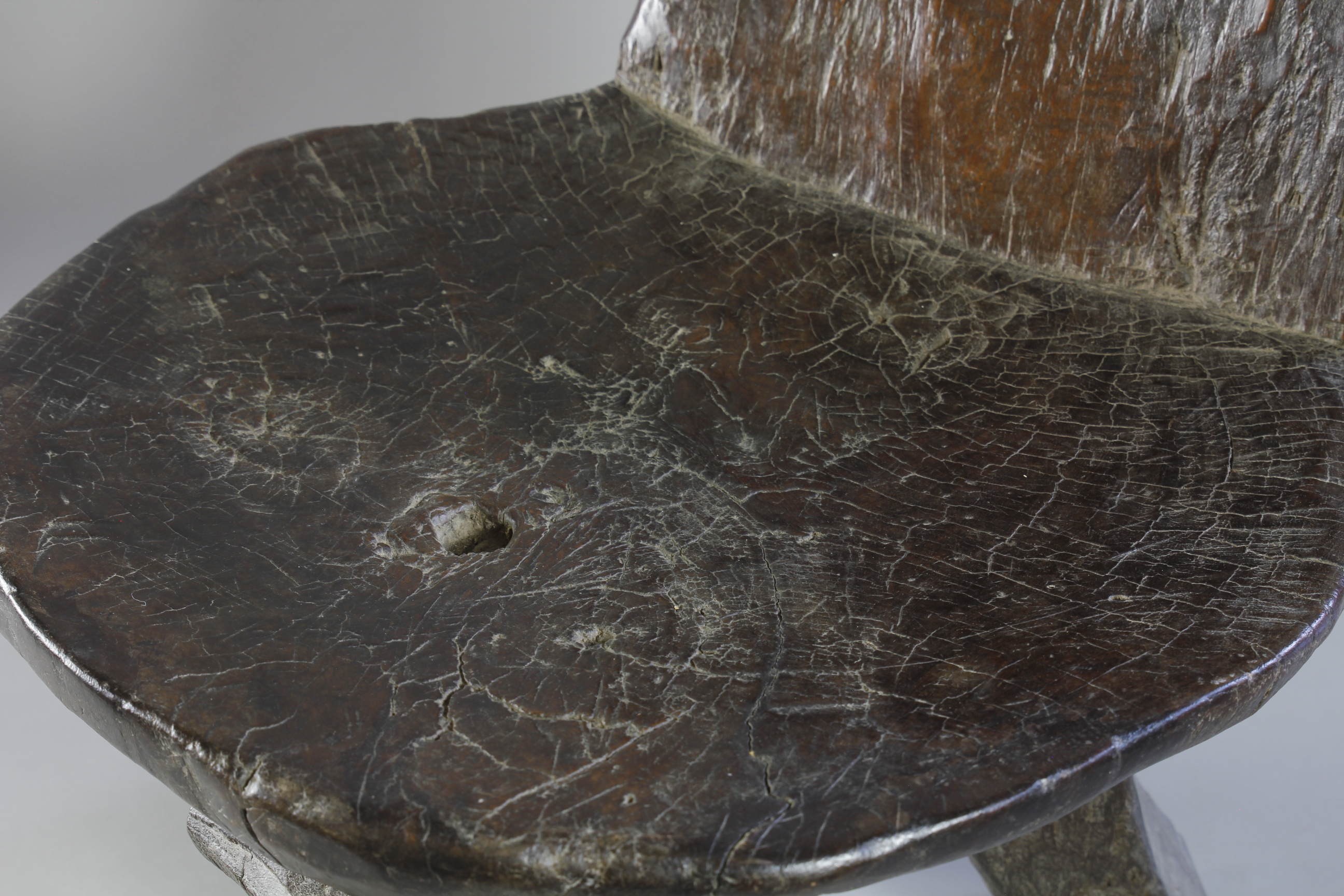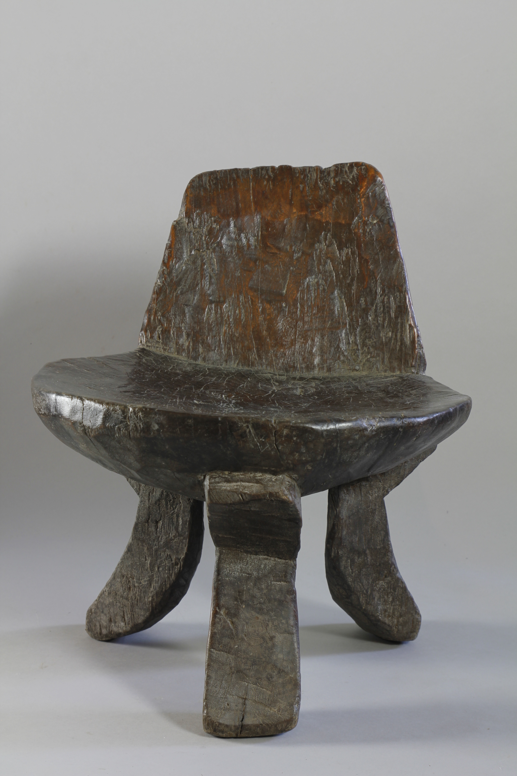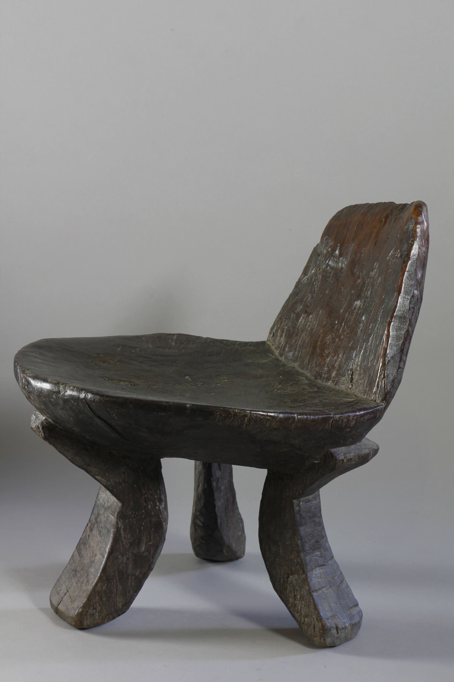 A wonderful early Ethiopia chair carved from a hard wood (one piece) that has developed a lovely deep glossy surface patina over time. The wide seat has a worn crackled surface and supported by three bent, in form, supporting legs.