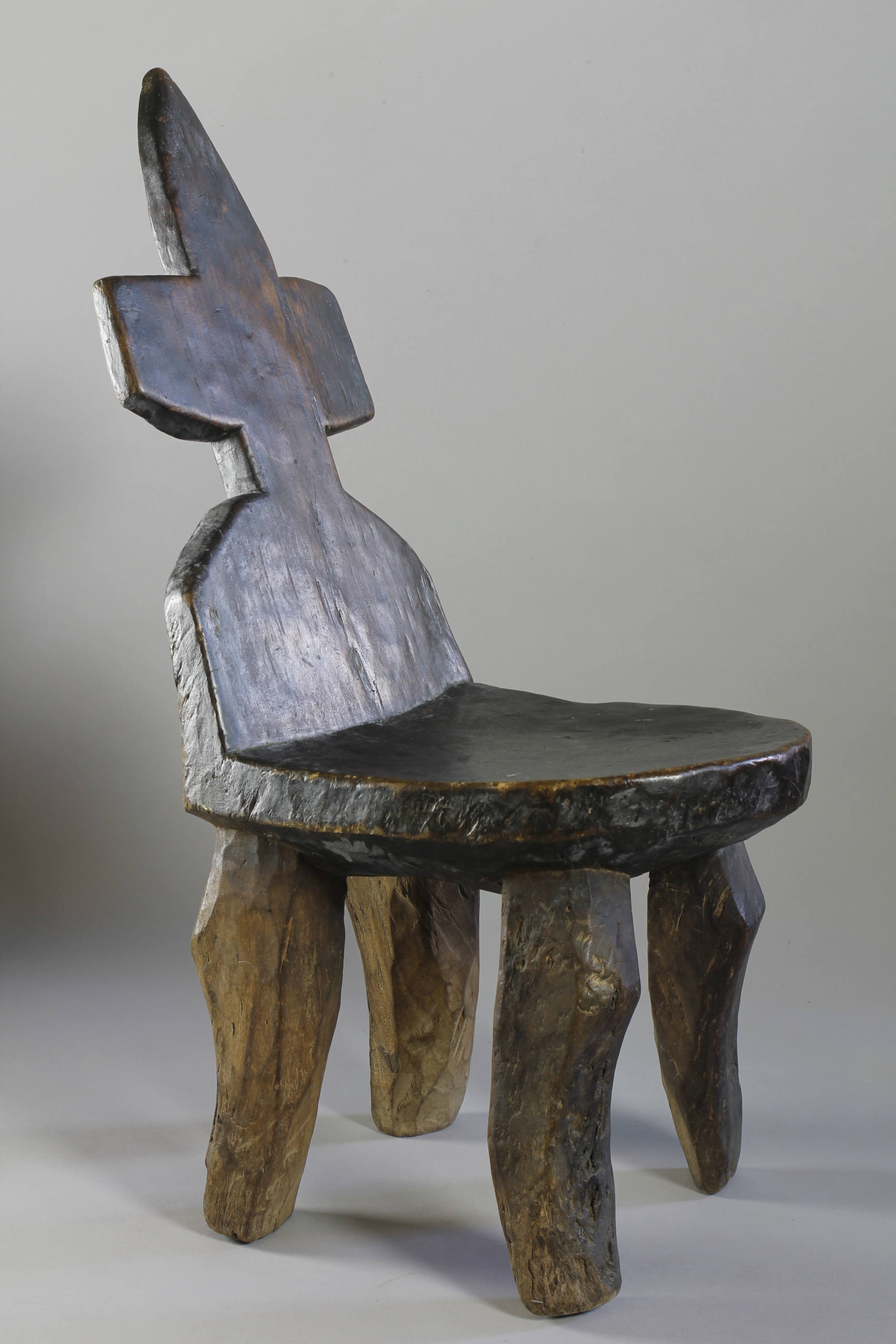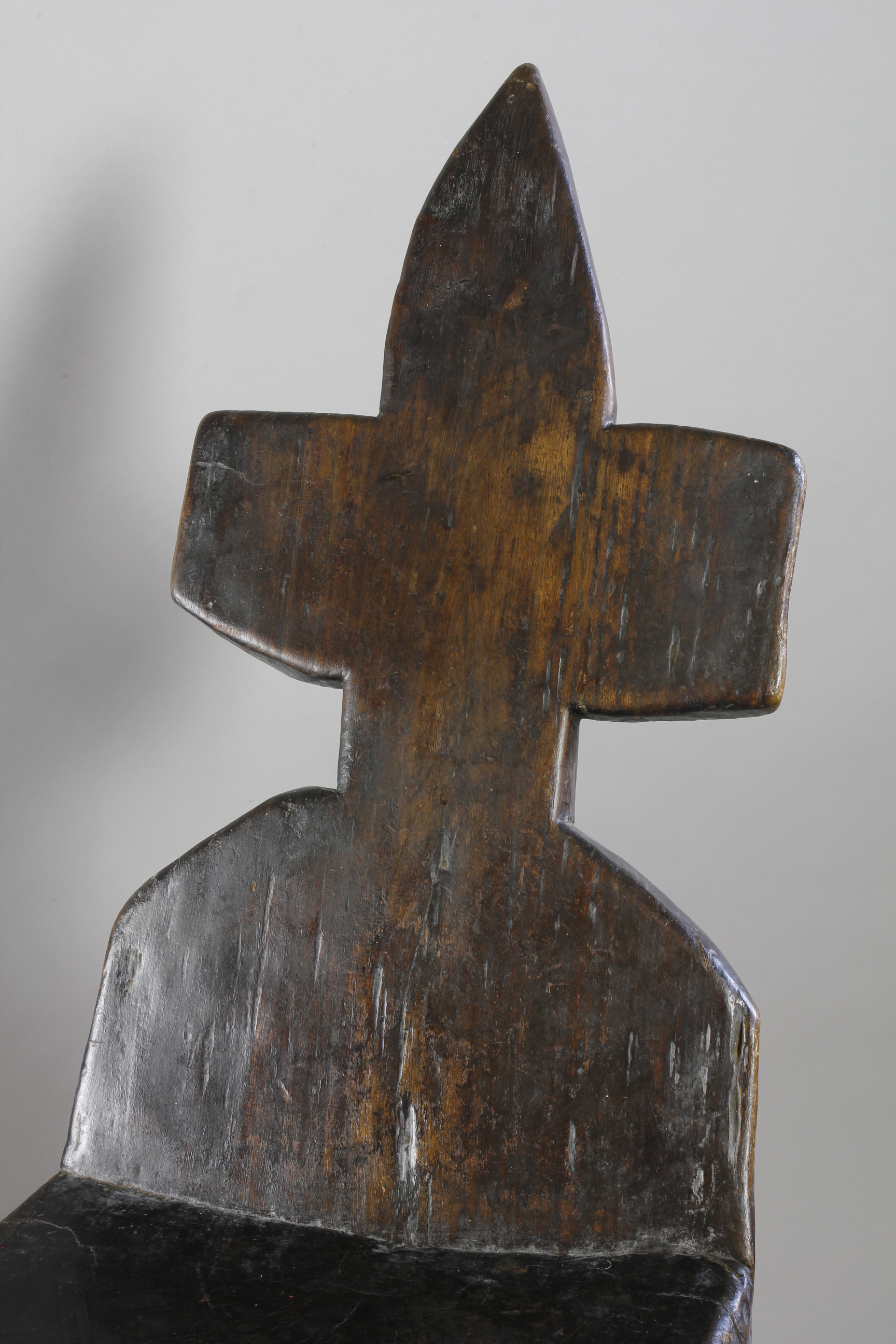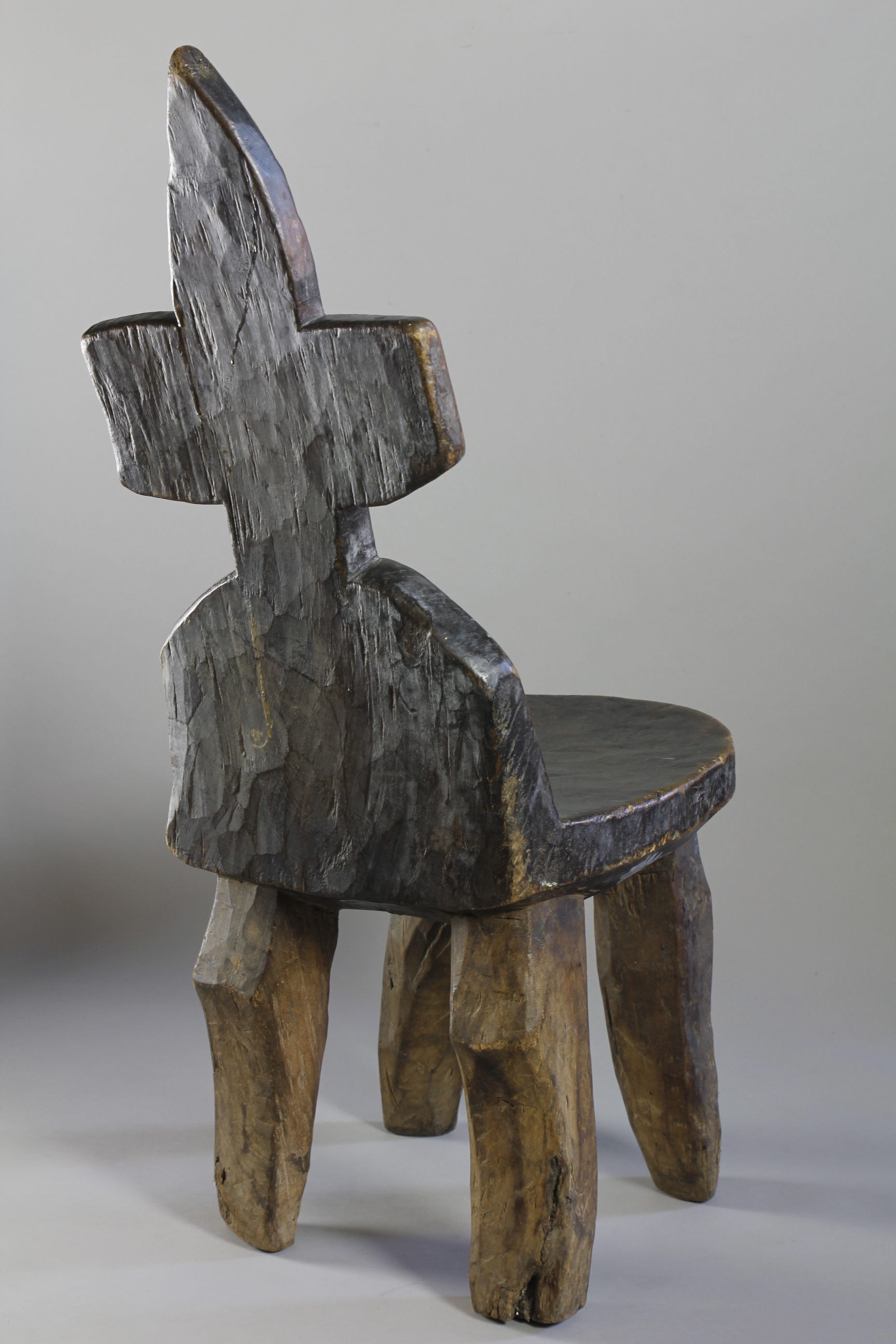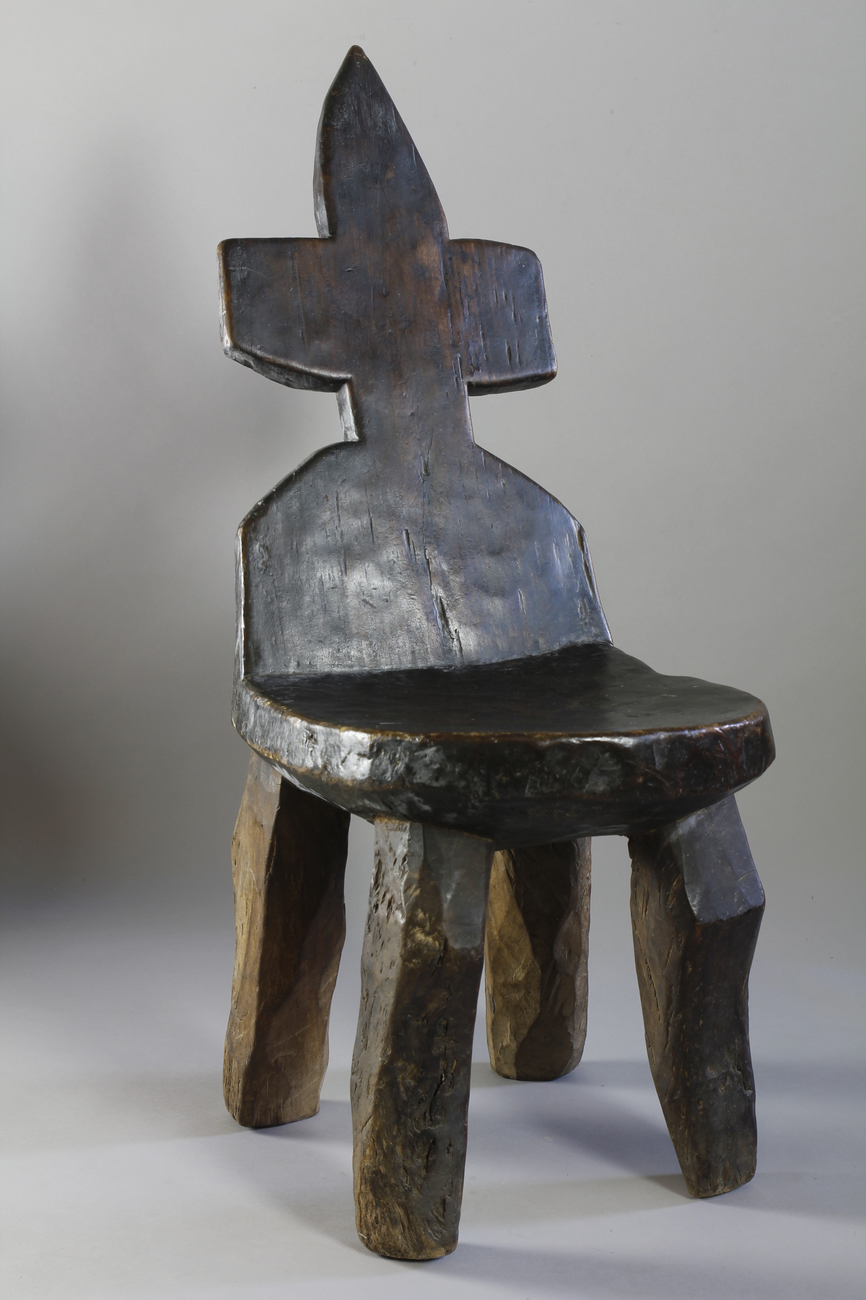 With its tall leaning backrest carved into the shape of a cross, this large four-legged chair from the Jimma region of Ethiopia exhibits an extremely rare form.
