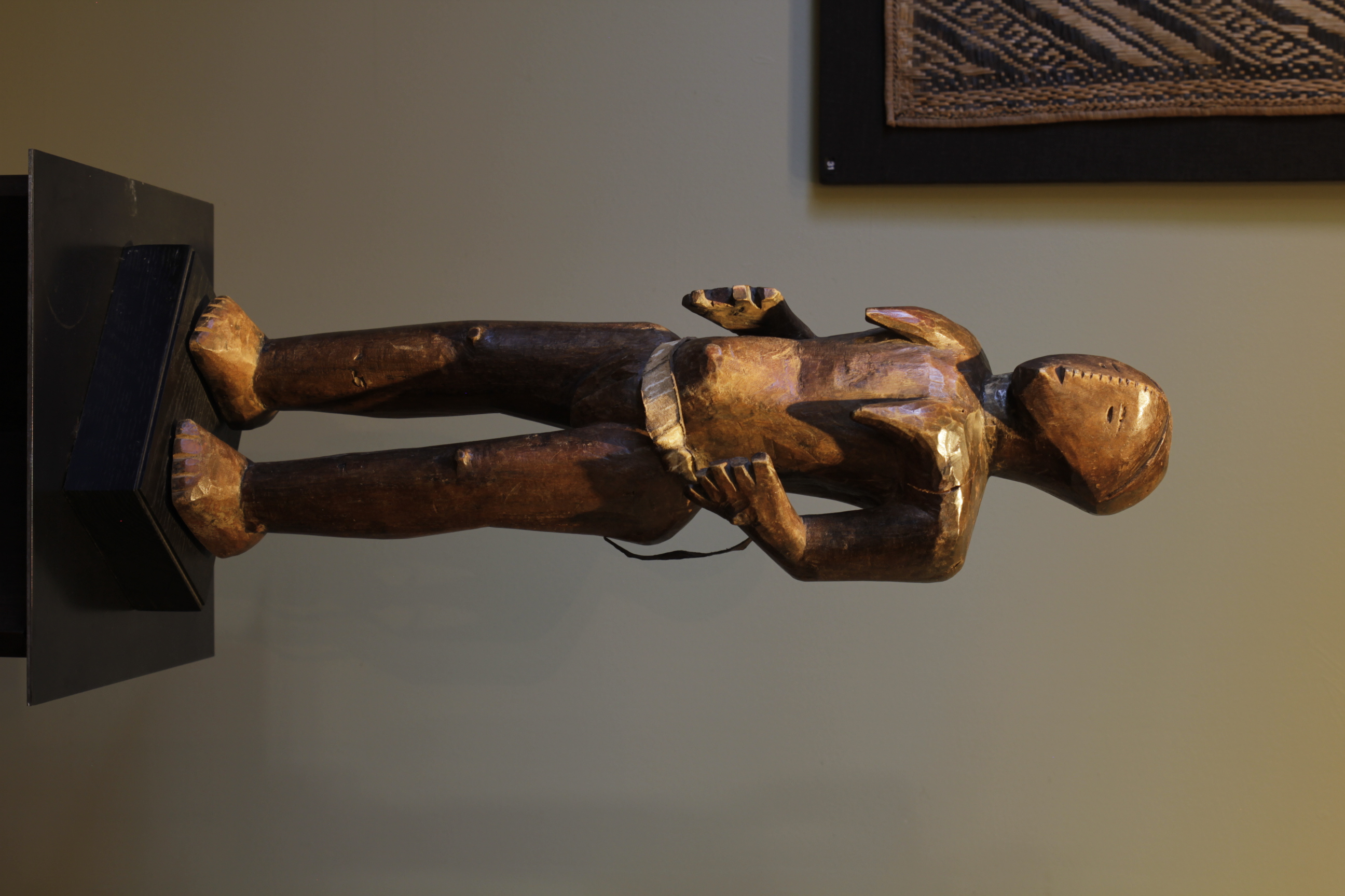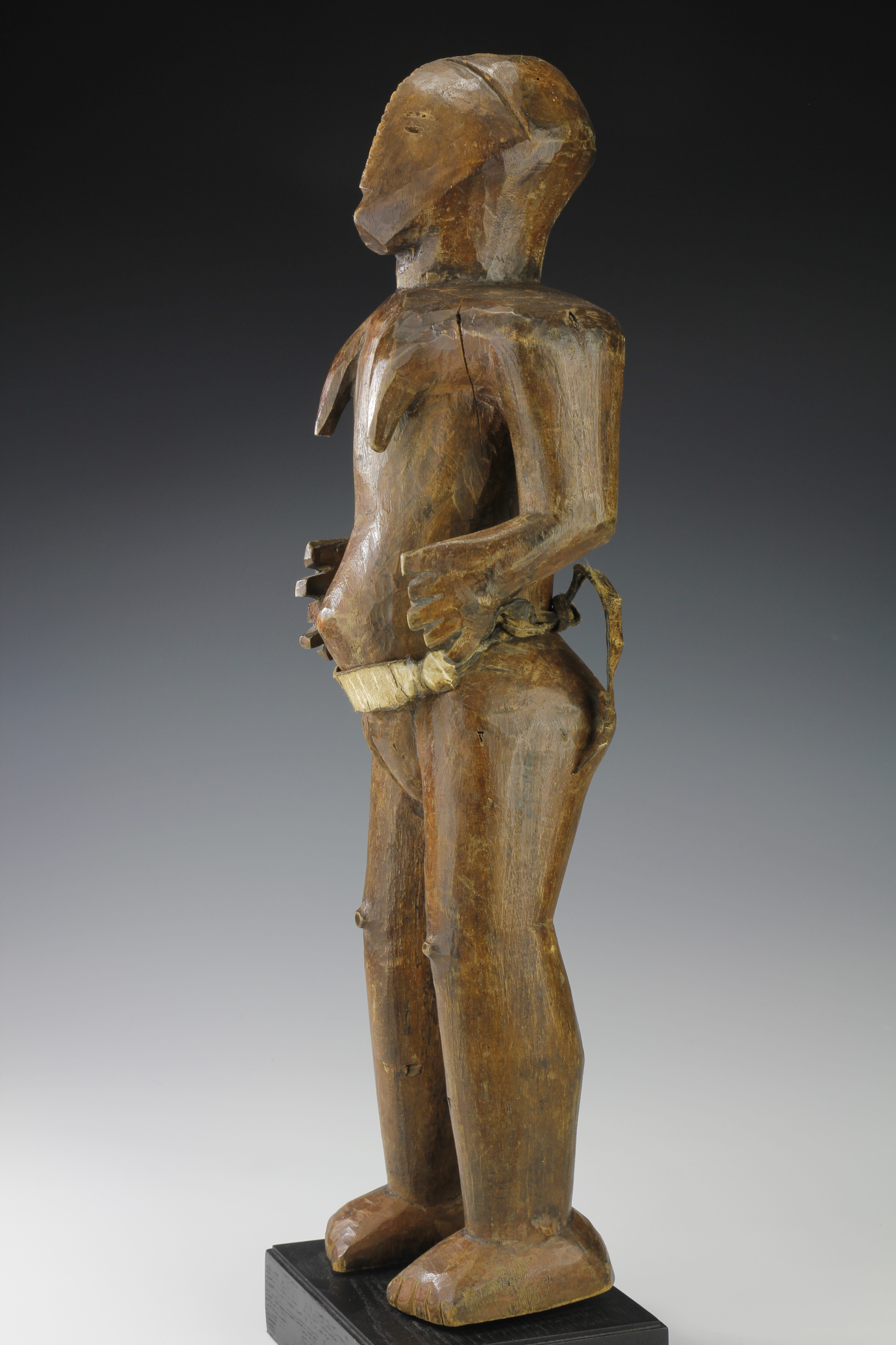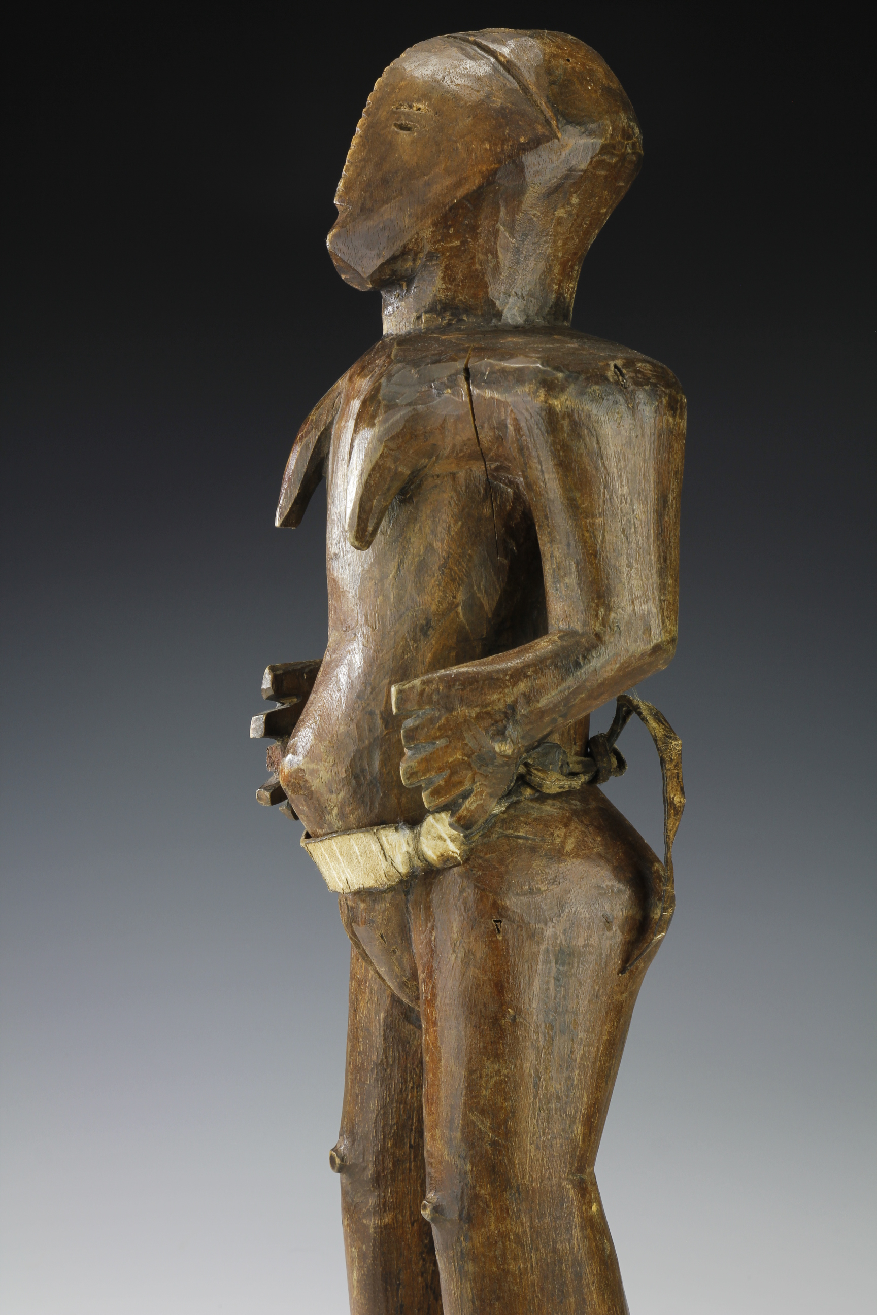 Fine Ngbaka or Ngbandi figure with fantastic sculptural qualities. Powerful presence in the legs and shoulders, the female figure stands tall and upright, her arms positioned either side of her protruding stomach. Her face, with concise angled cuts exhibits qualities typically found in Ngbaka masks and sculpture.