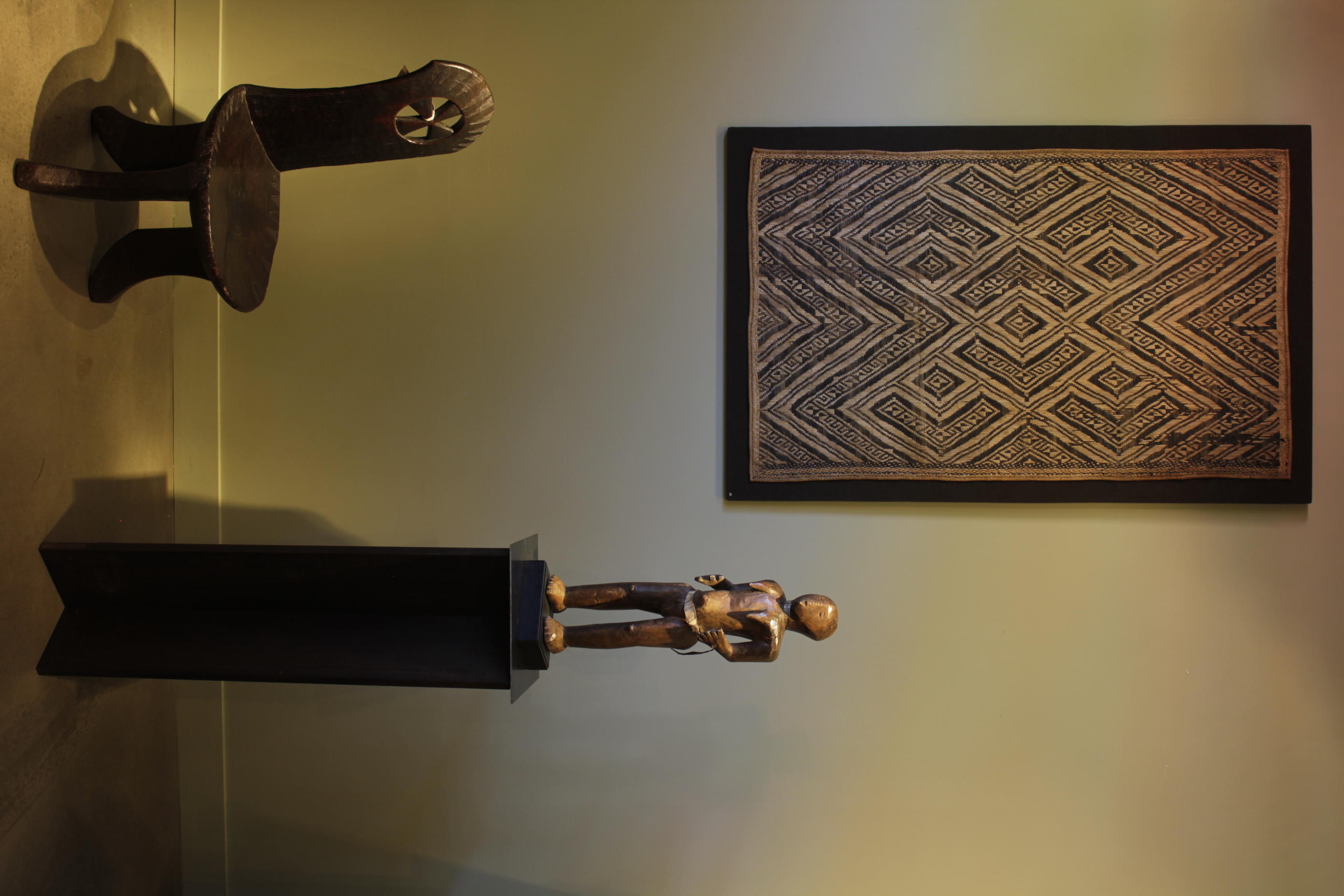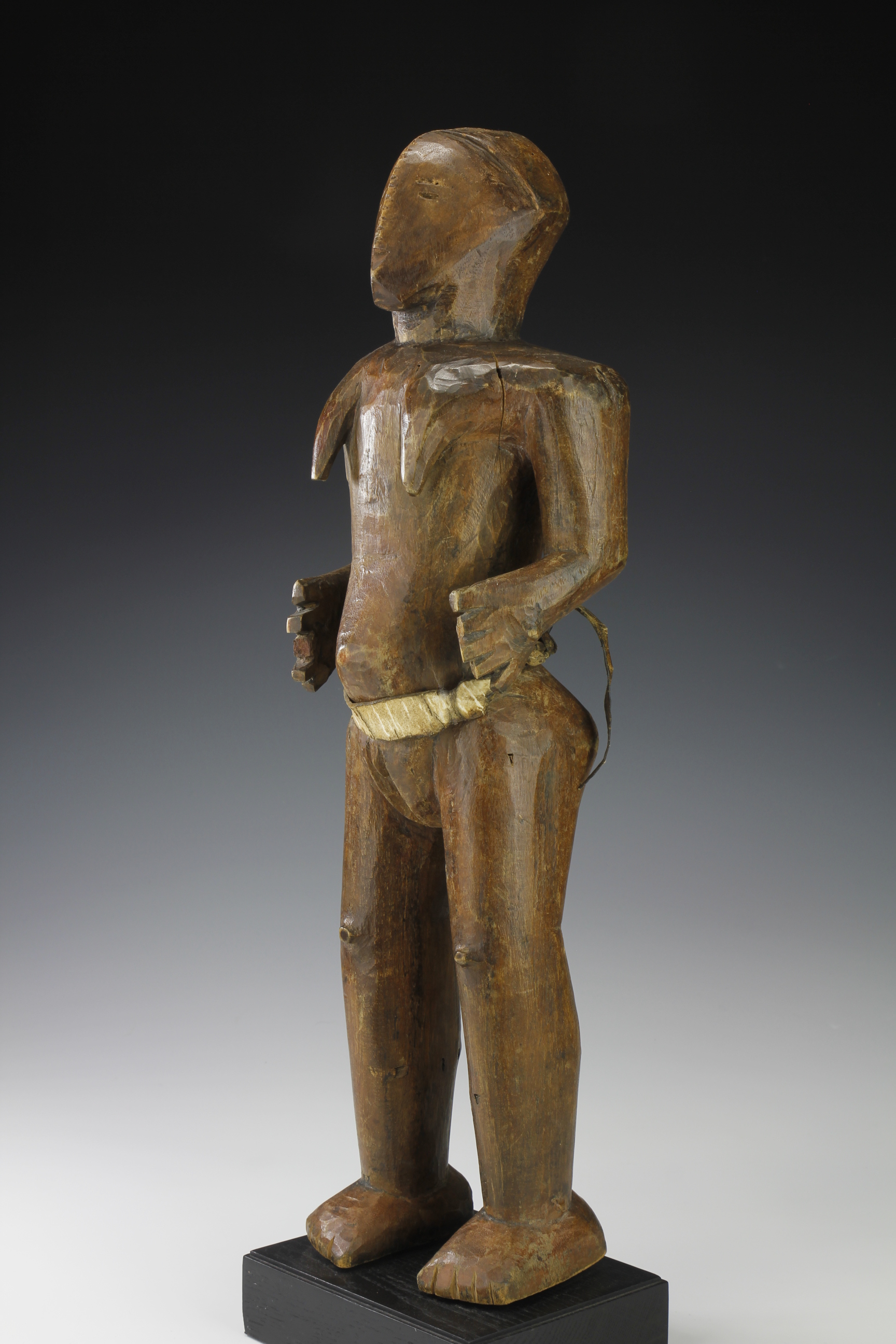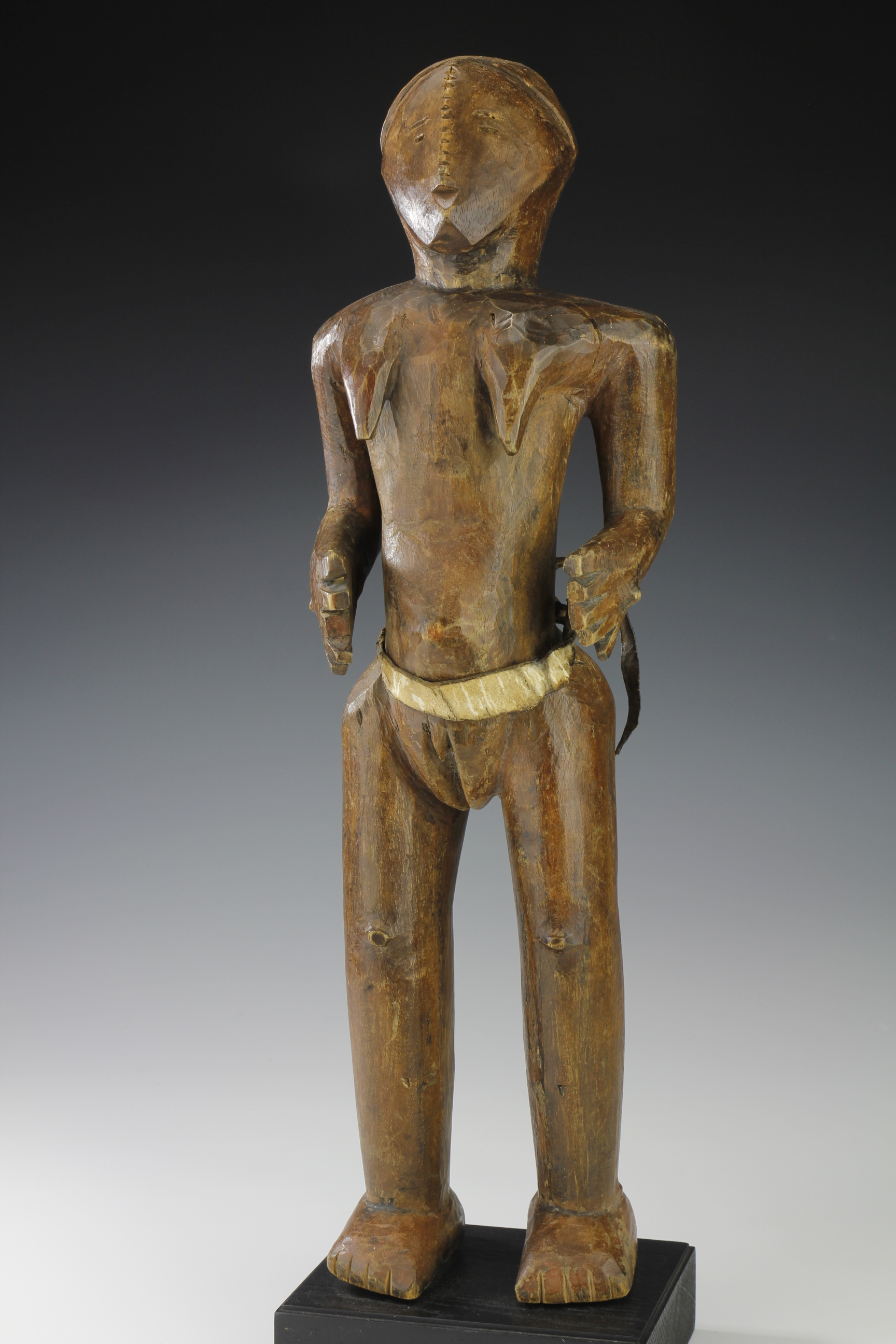 Fine Ngbaka or Ngbandi figure with fantastic sculptural qualities. Powerful presence in the legs and shoulders, the female figure stands tall and upright, her arms positioned either side of her protruding stomach. Her face, with concise angled cuts exhibits qualities typically found in Ngbaka masks and sculpture.
