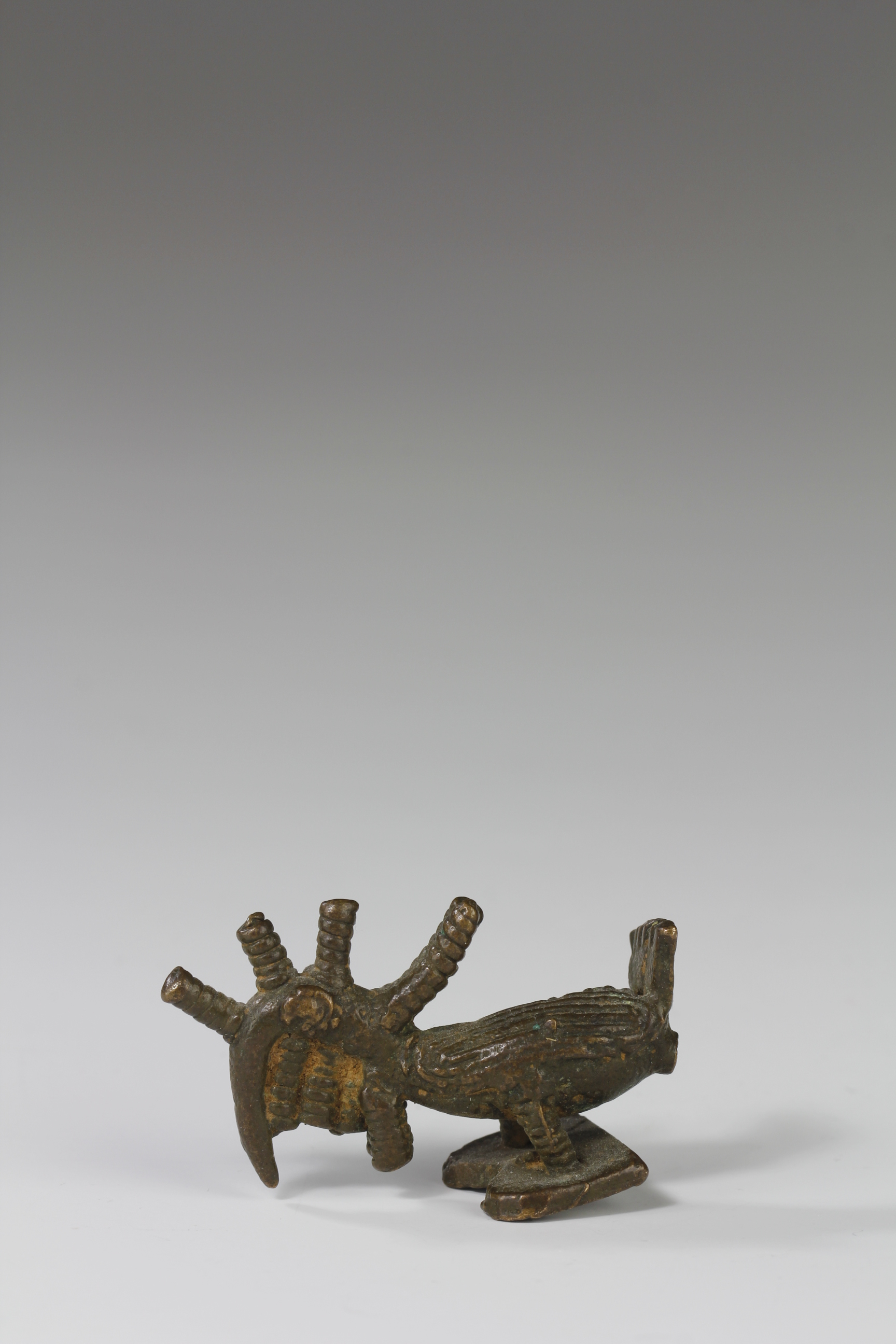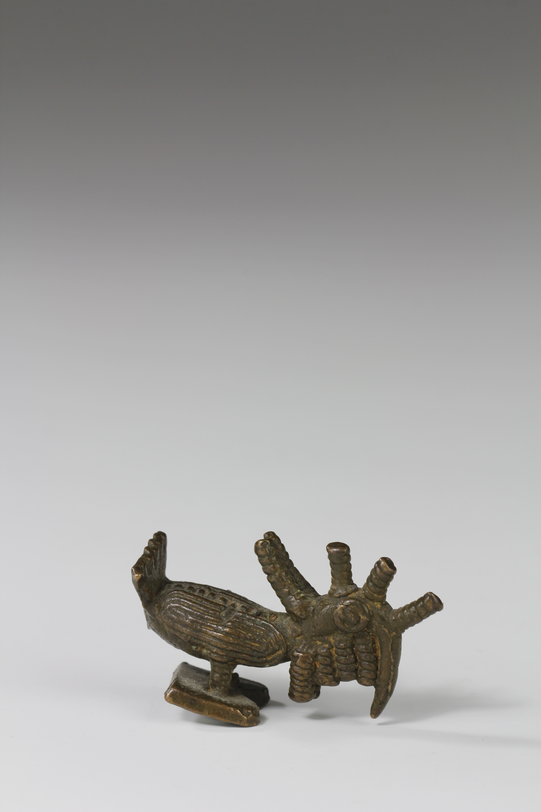 The bronze weight, depicting a cockerell, shows wonderful casting details from its body and tail feathers to its head crest.
