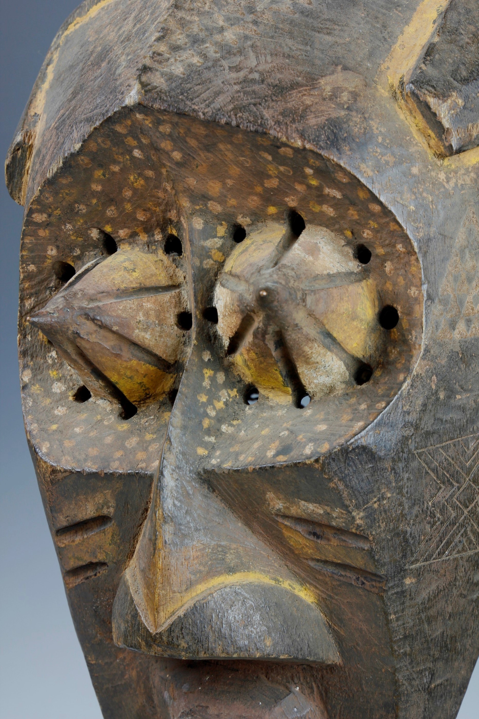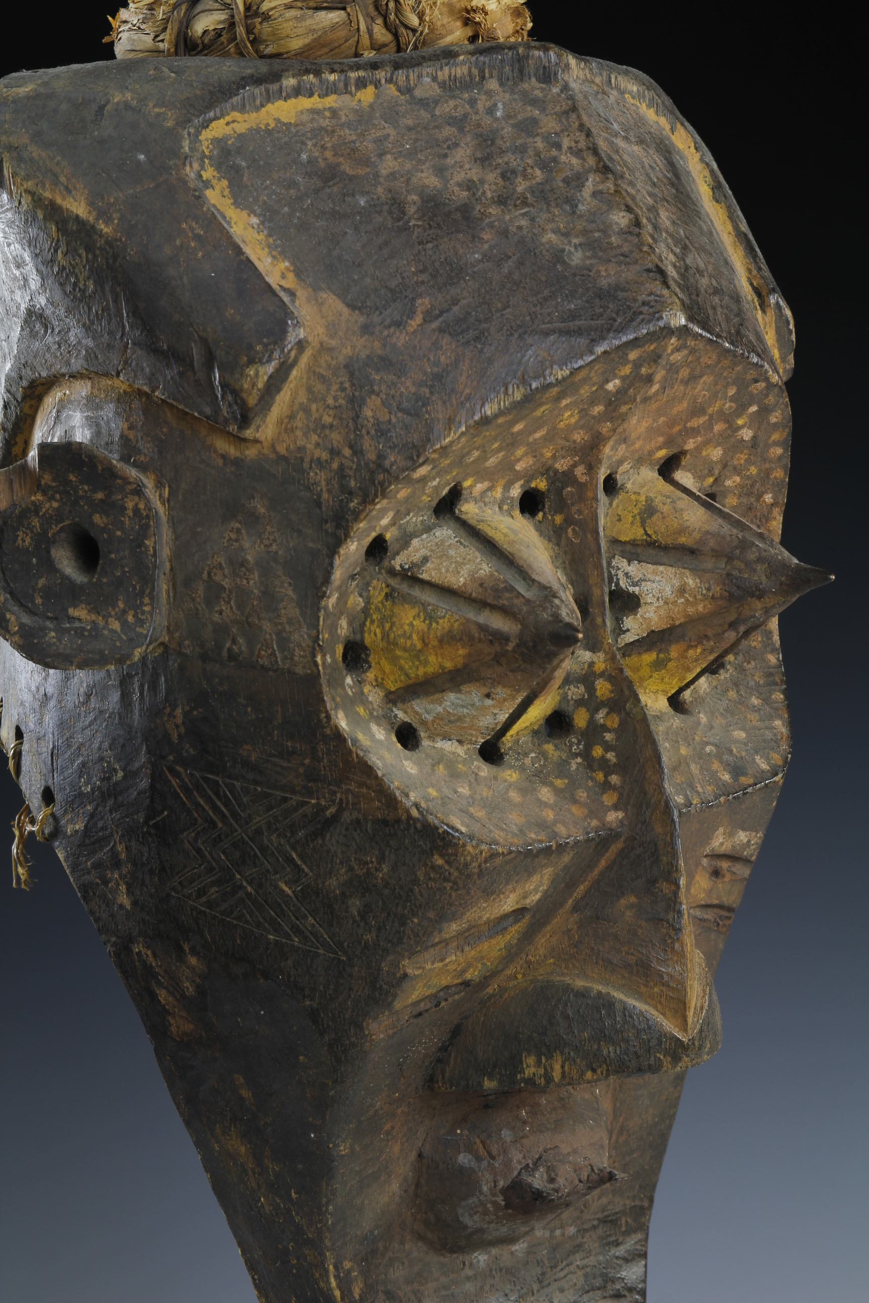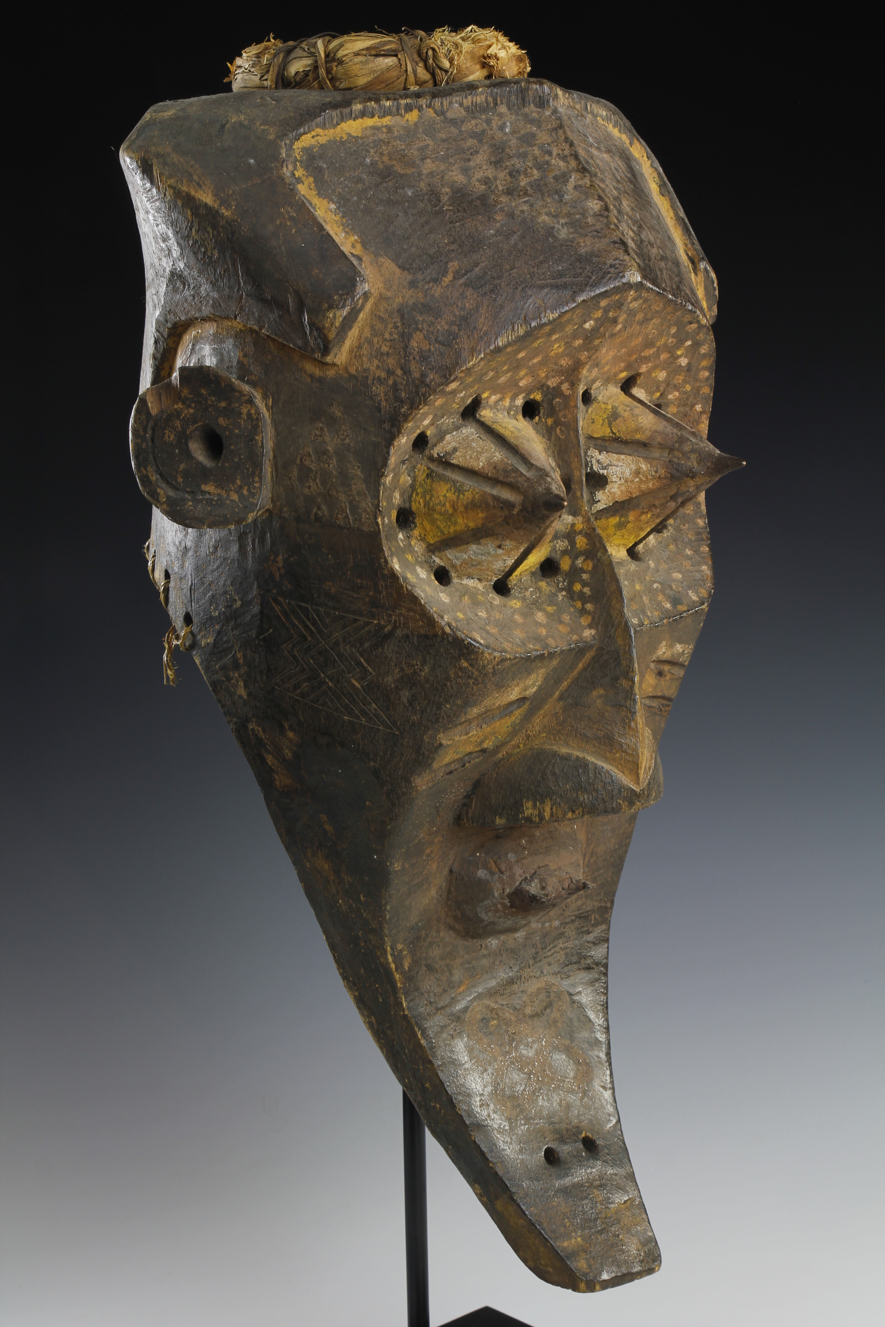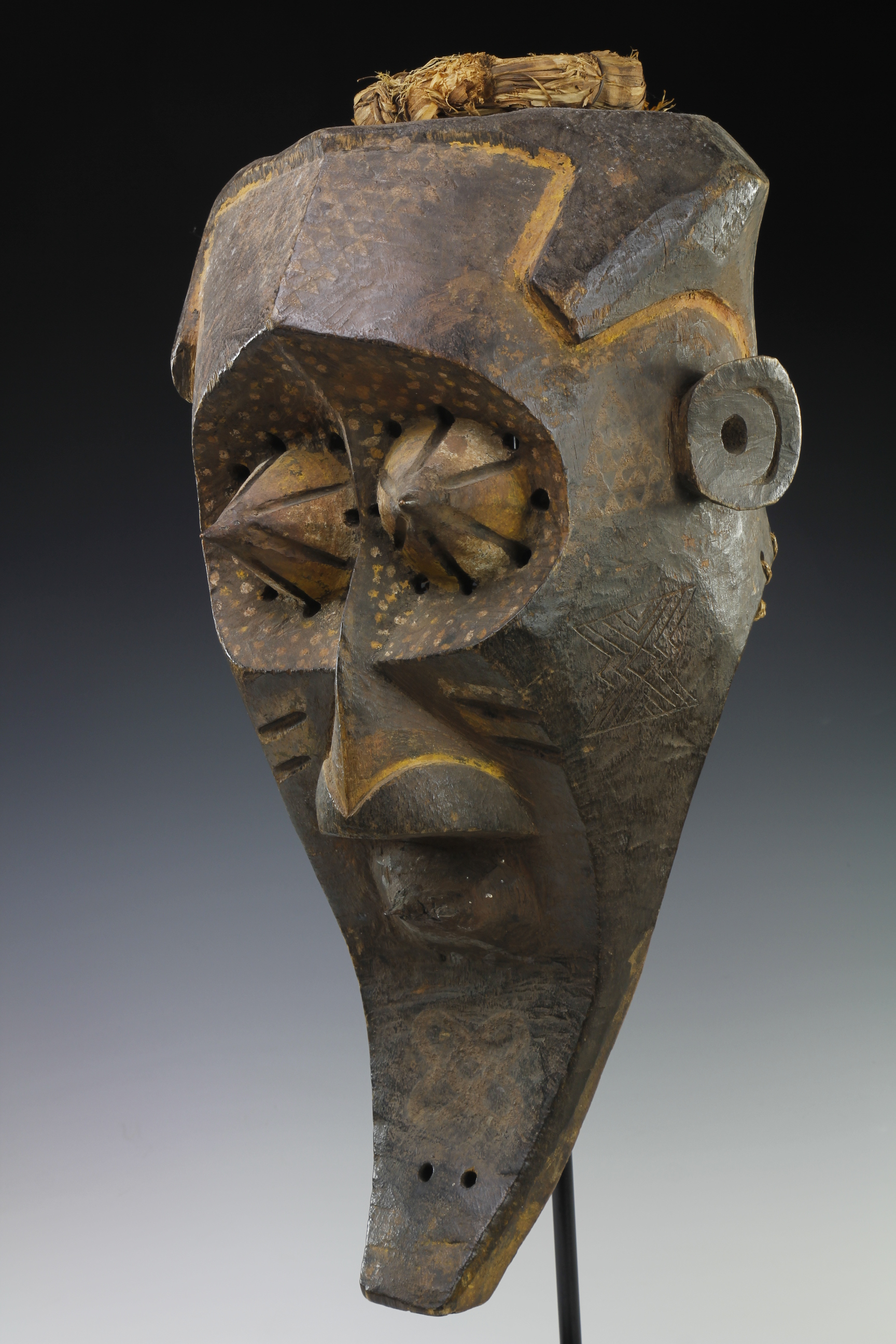 Fine powerful Kete mask, 'Kabongo'. The mask has wonderful sculptural definitions in its form, featuring prominent pointed eyes, each capped with metal tips. The surface has been decorated with fine geometric and dot decorations. Wood, natural pigments, metal and raffia. Kete culture, Kuba Kingdom, Western Kasai Region.
