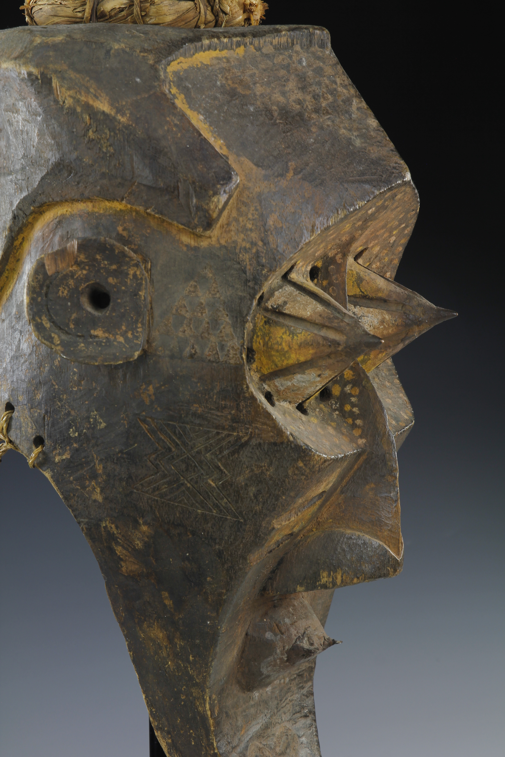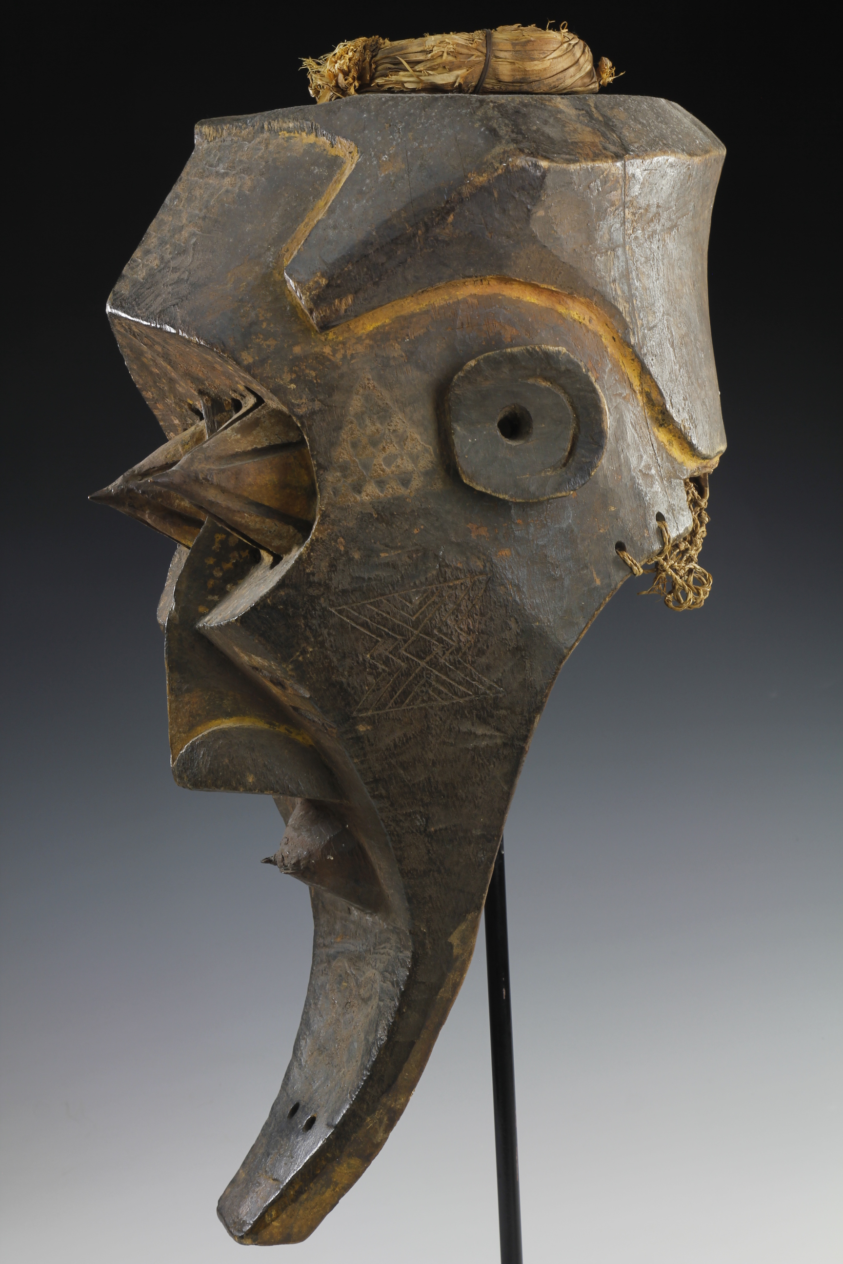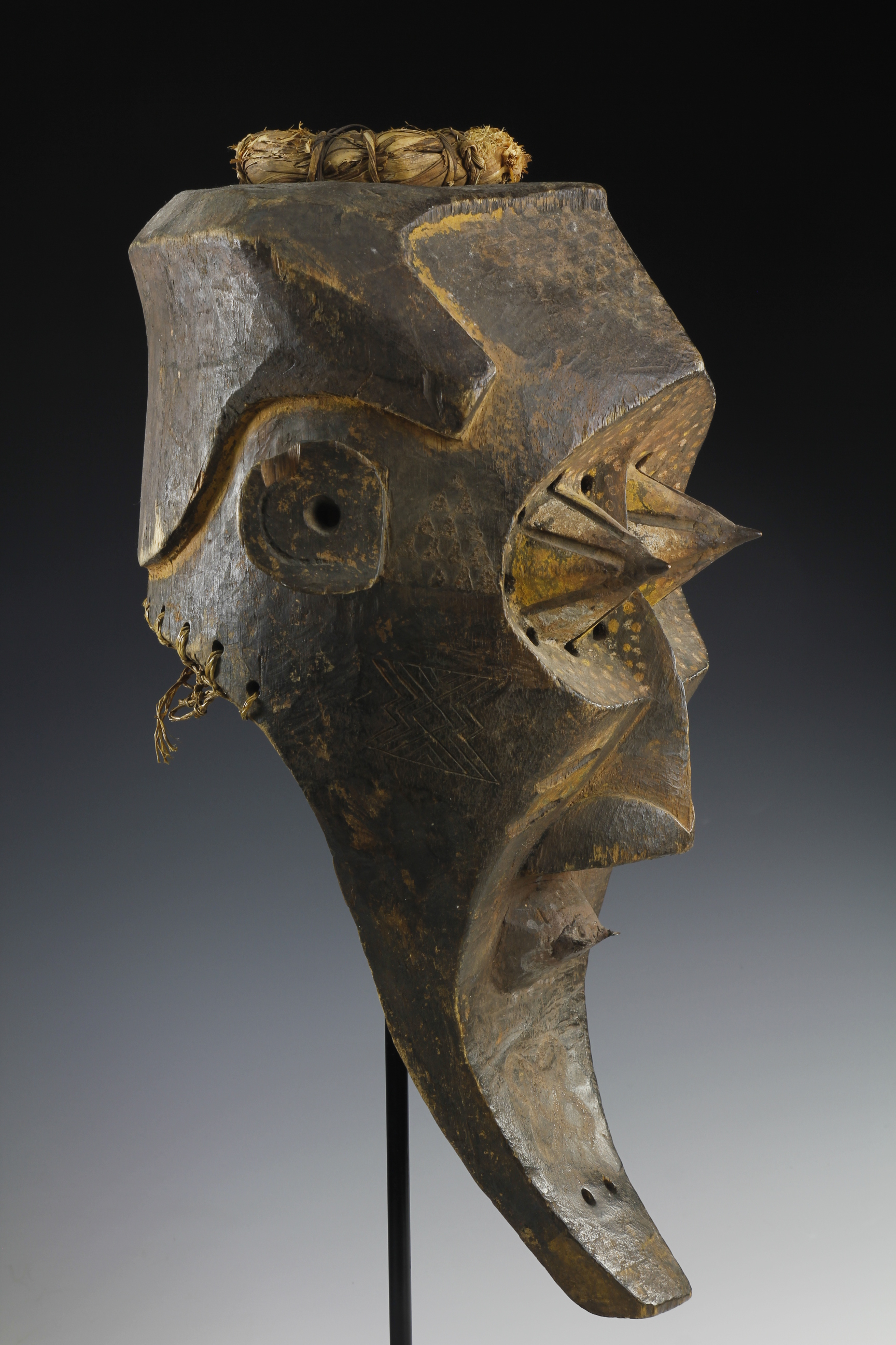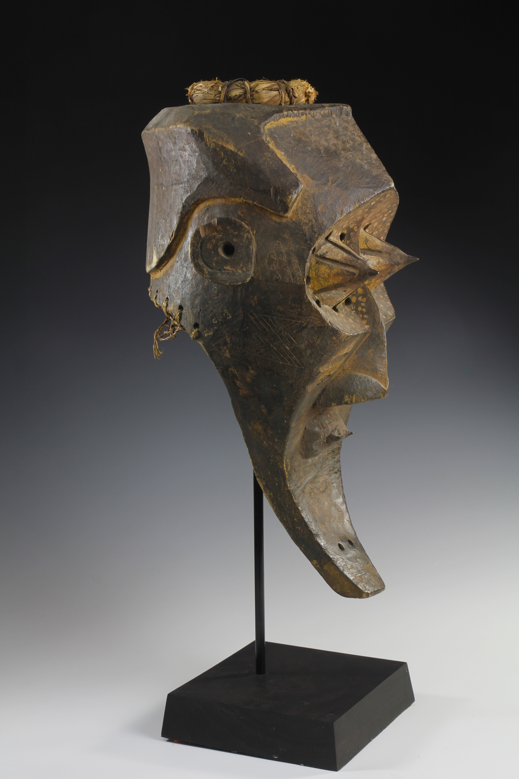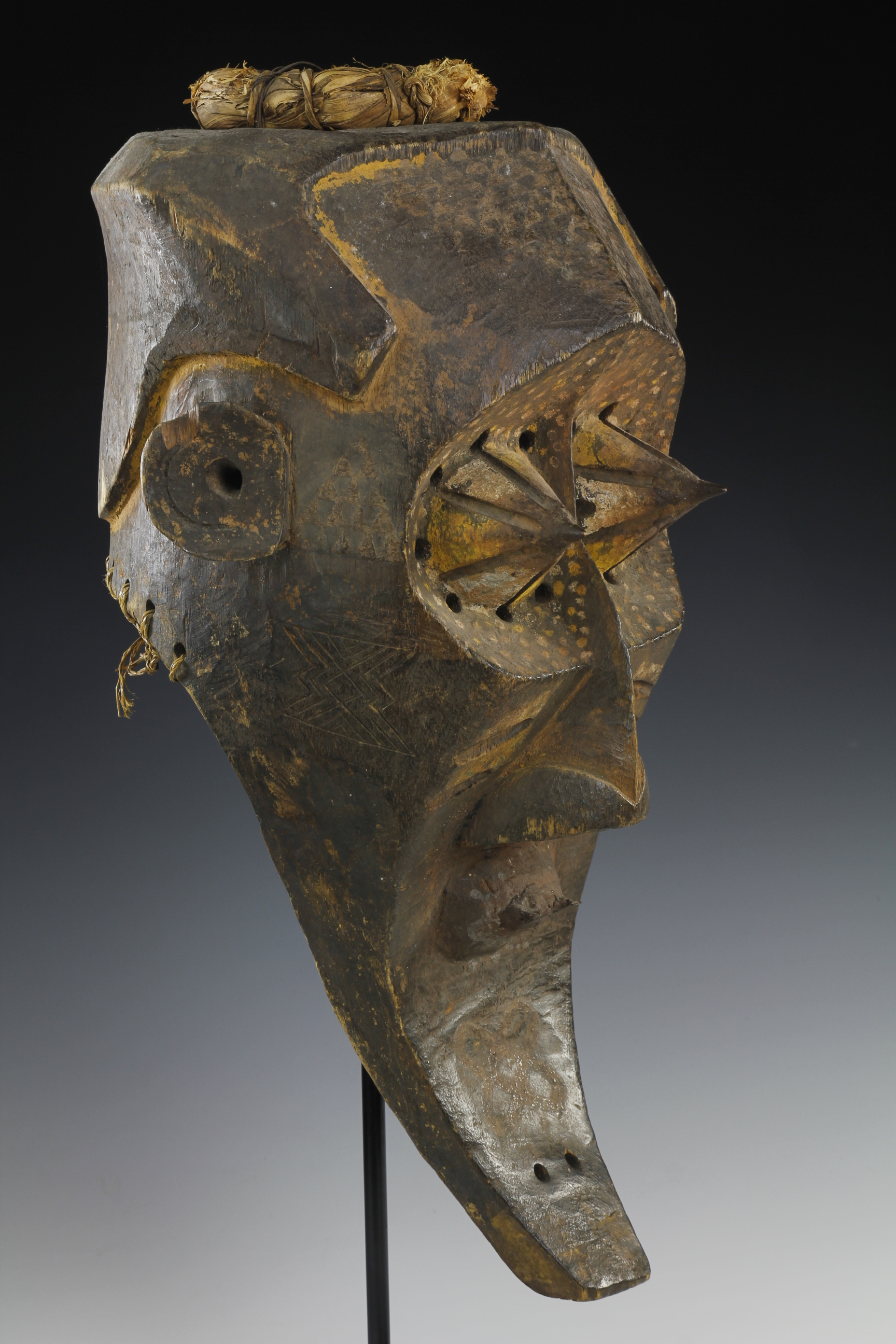Fine powerful Kete mask, 'Kabongo'. The mask has wonderful sculptural definitions in its form, featuring prominent pointed eyes, each capped with metal tips. The surface has been decorated with fine geometric and dot decorations. Wood, natural pigments, metal and raffia. Kete culture, Kuba Kingdom, Western Kasai Region.