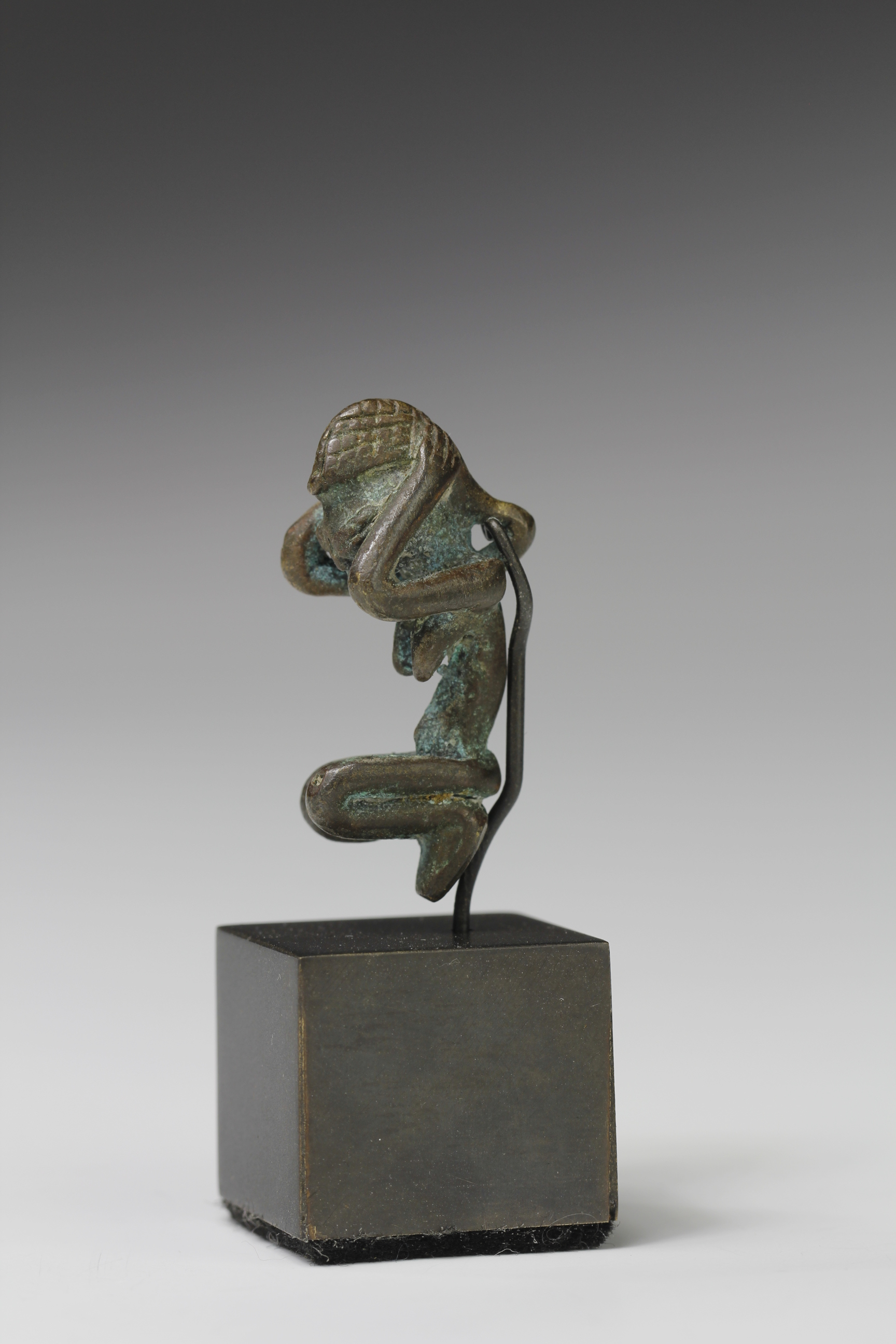 Beautifully cast fine bronze alloy Dogon pendant capturing a kneeling or crouching female figure with a fine facial expression and with her arms raised and resting behind her head. Slight verdigris surface patina.