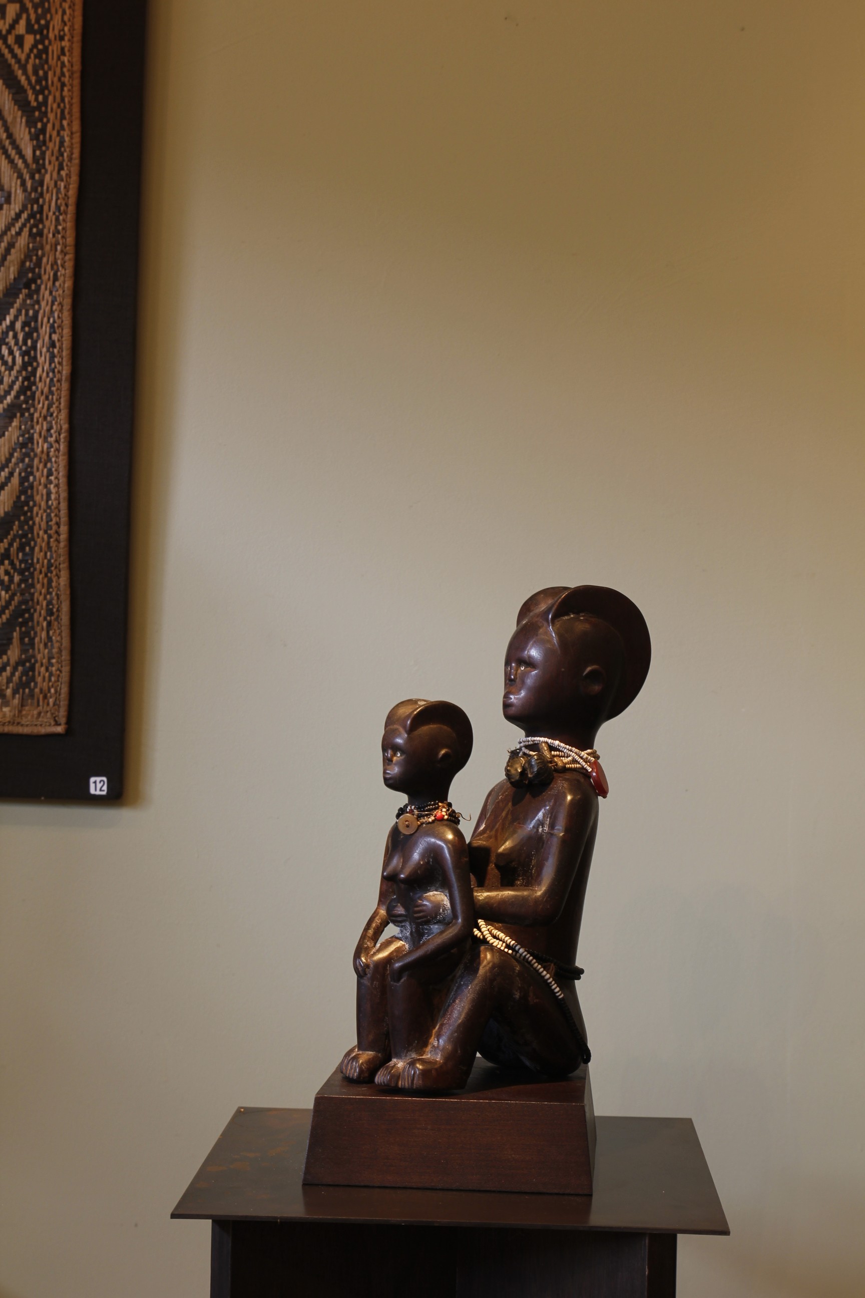 A beautifully sculptured piece that captures a mother, sitting upright and proudly holding her female child. Such pieces played an important ceremonial role in the Kwere culture during the young girls initiation into motherhood. The figure has a beautiful smooth and slightly oily surface patina. Adorning both the mother and child's neck are stands of fine glass beads, with seeds and buttons attached. White is a prominent colour which is a symbol of purity.
