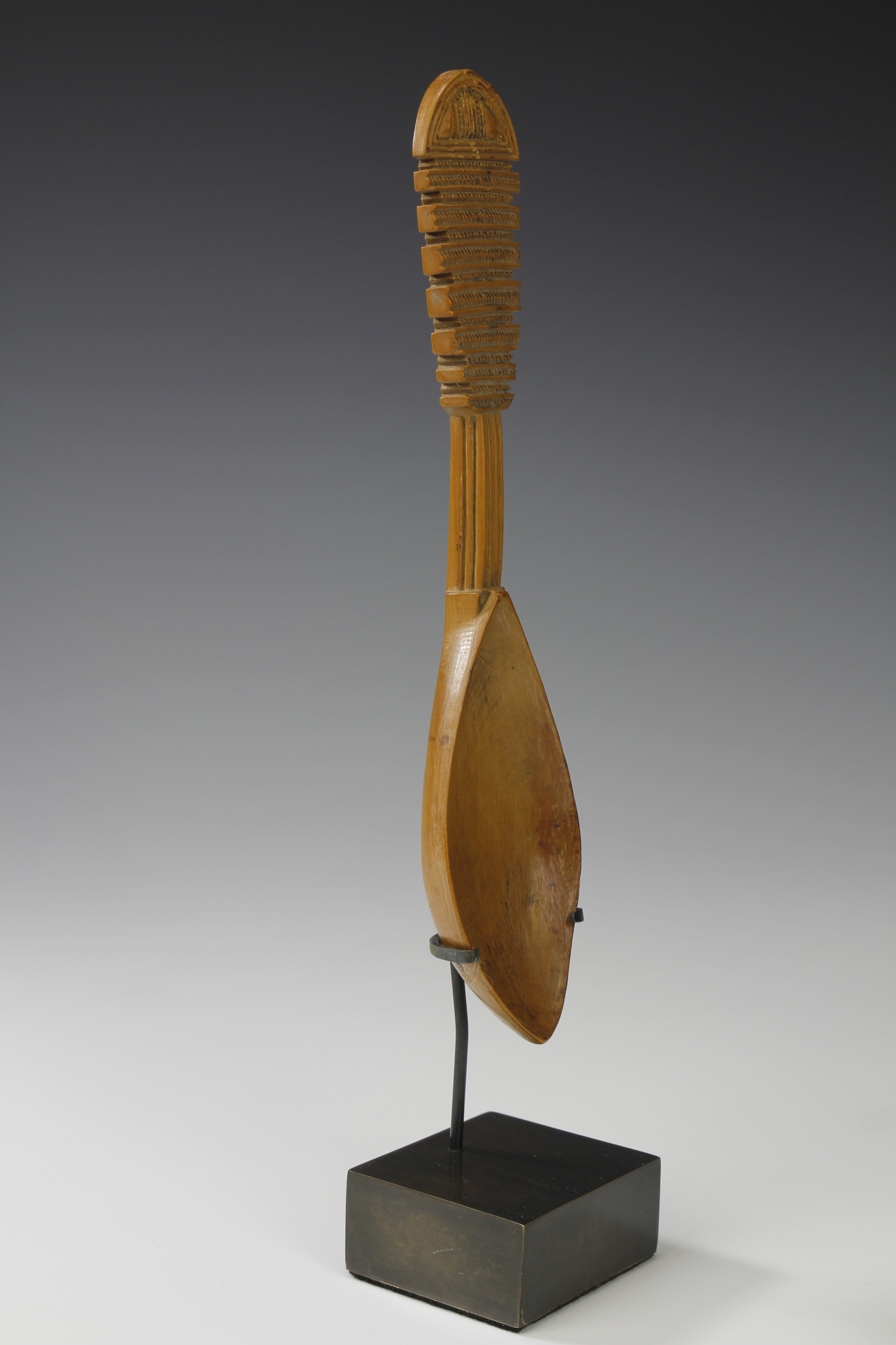 Carved from a densely grained light wood, the top section of the handle has been decorated with parallel bands of fine abstract designs.