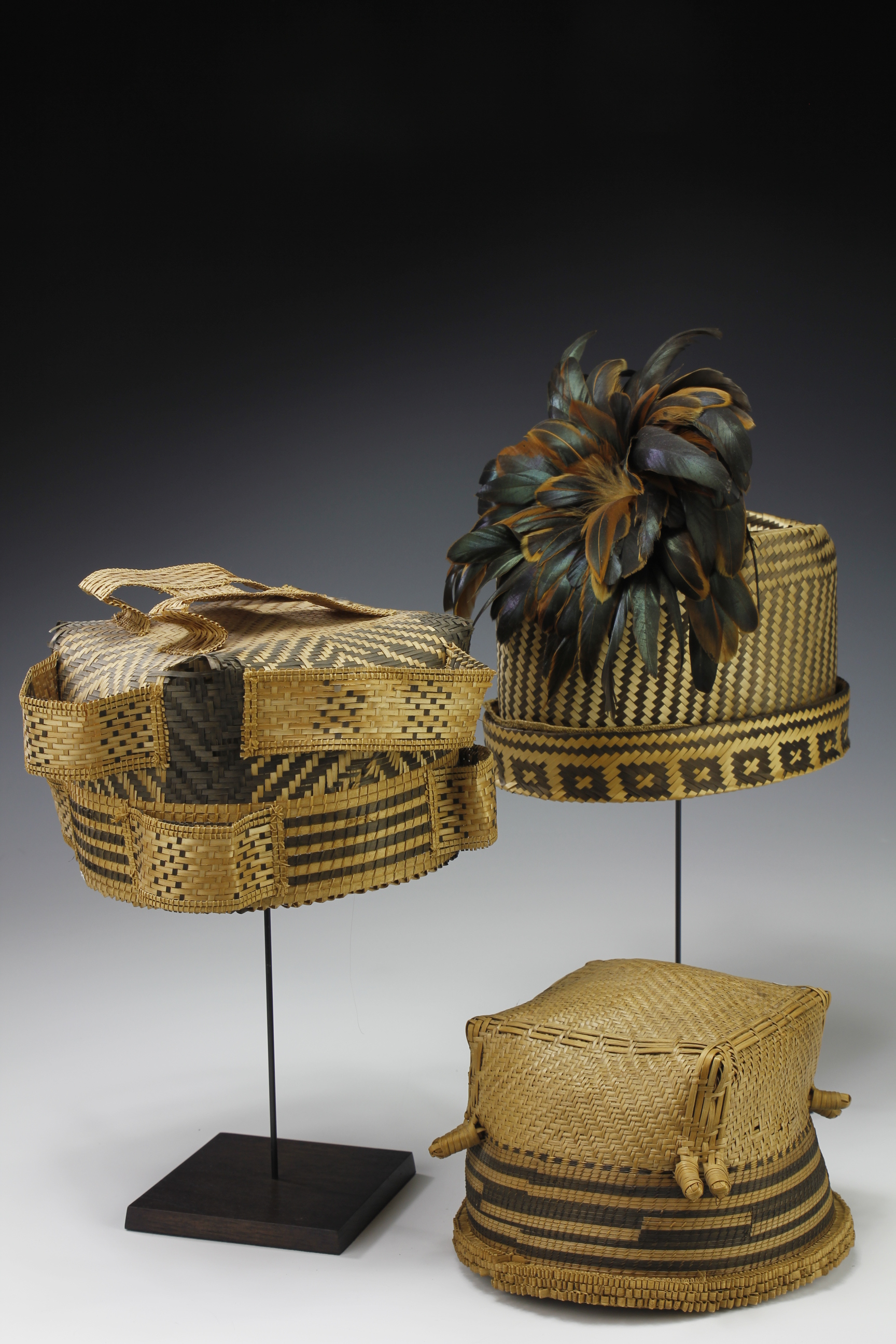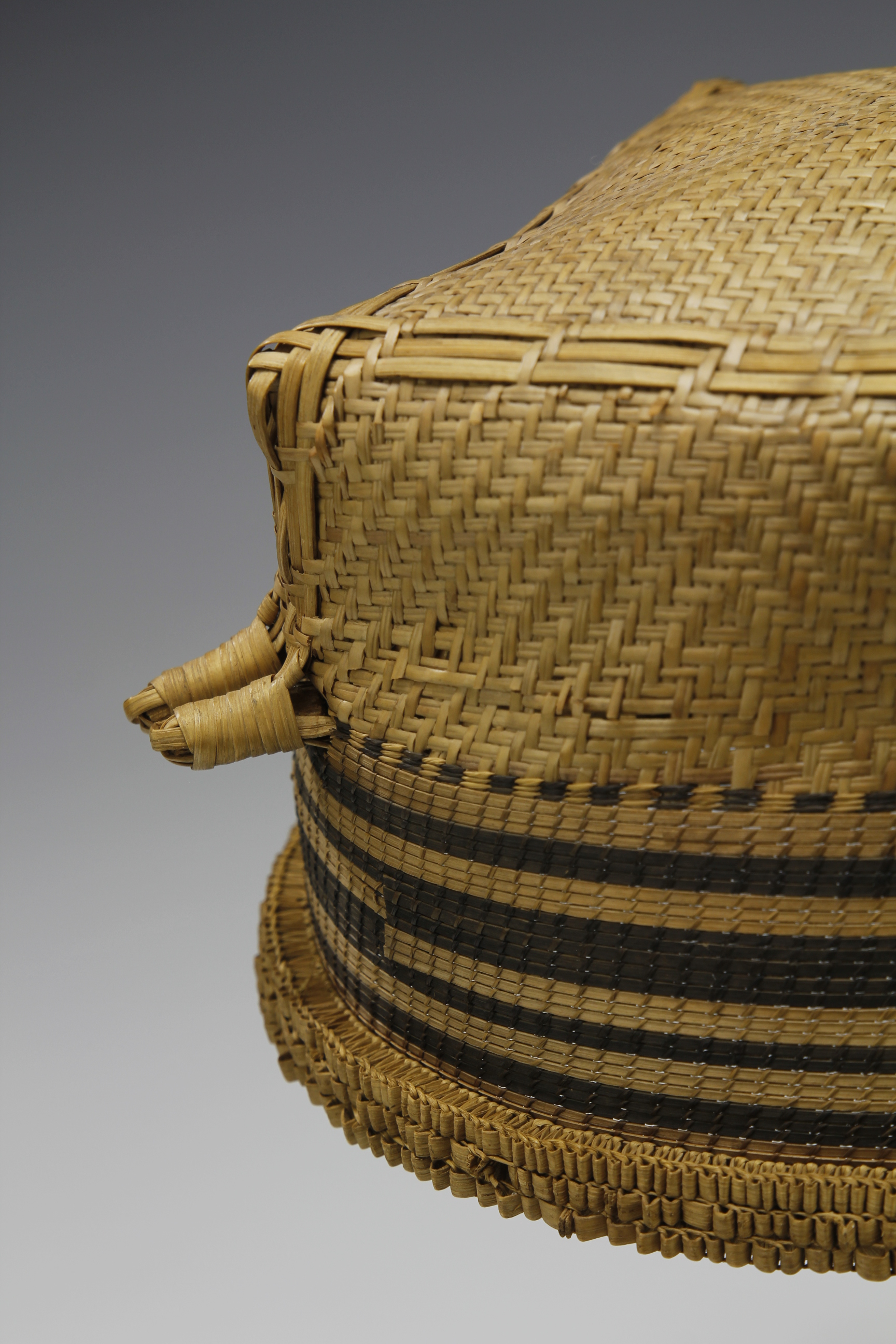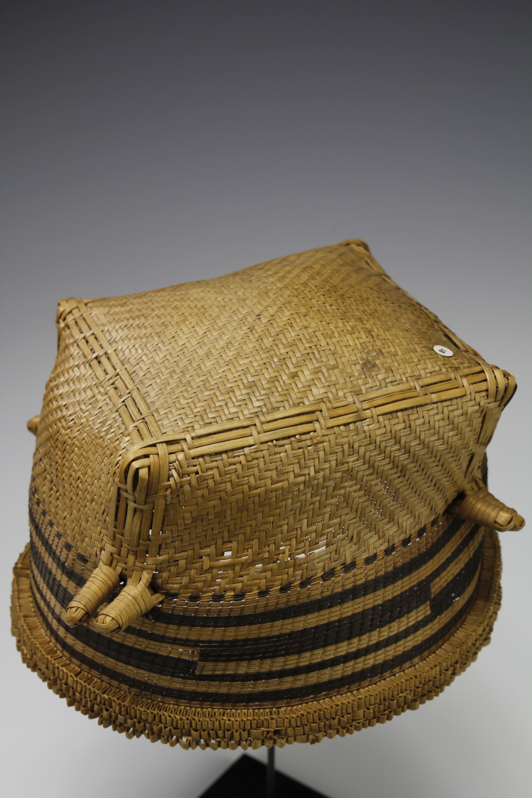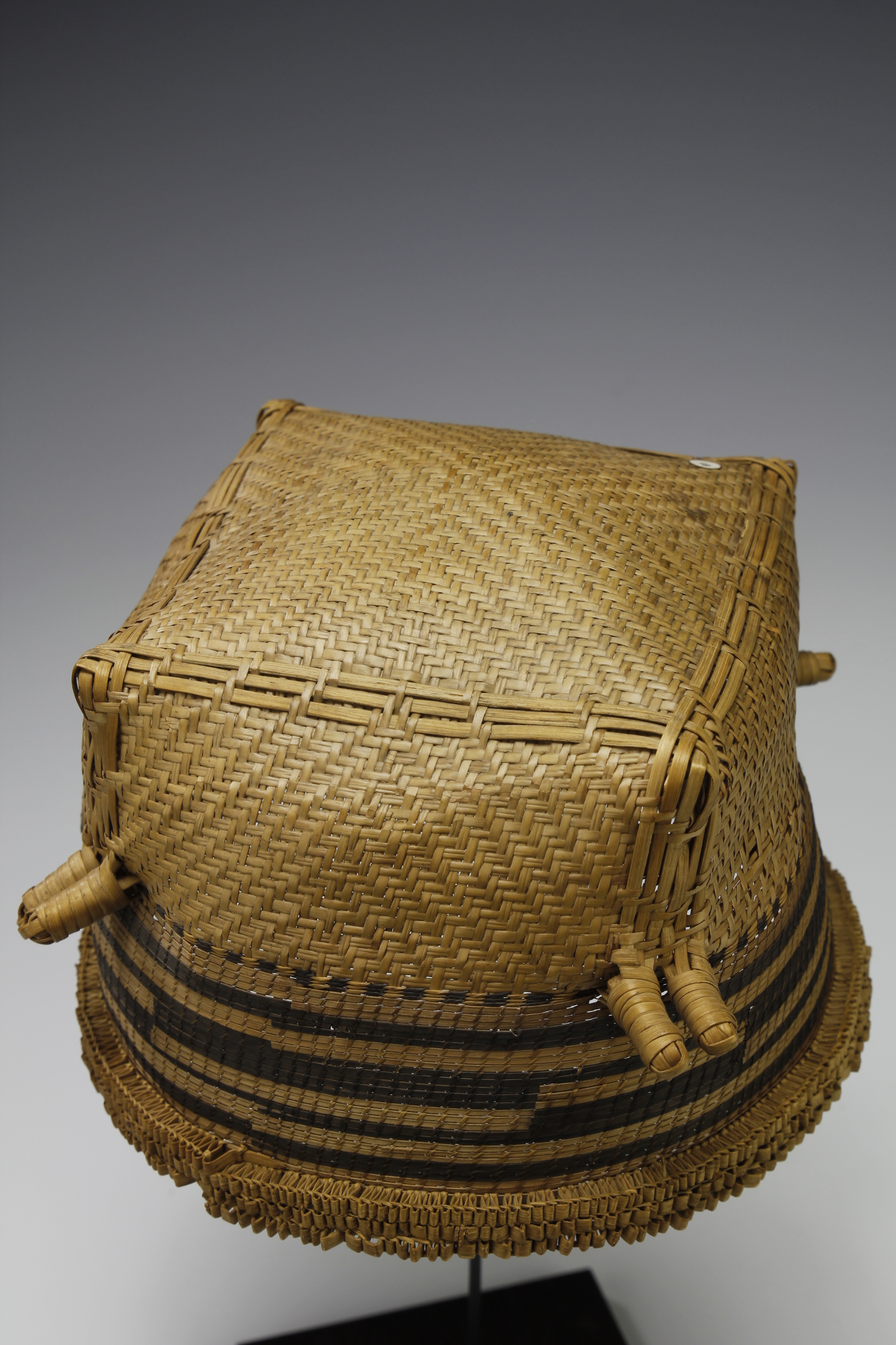 Finely woven chieftains head adornment, Mangbetu culture, North Eastern DRC. Adorned with contrasting bands and featuring small decorative double 'knots' to each of its corners.