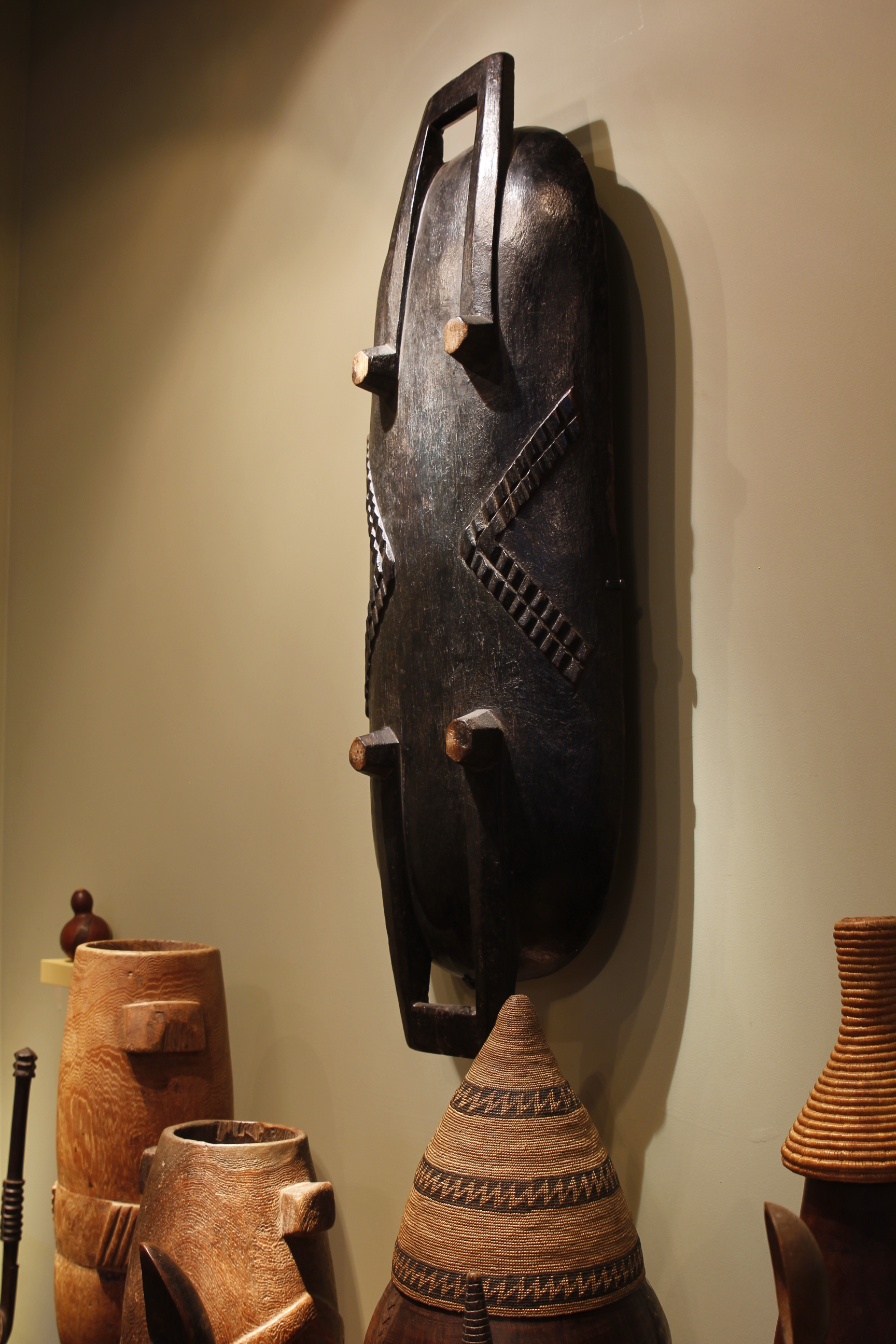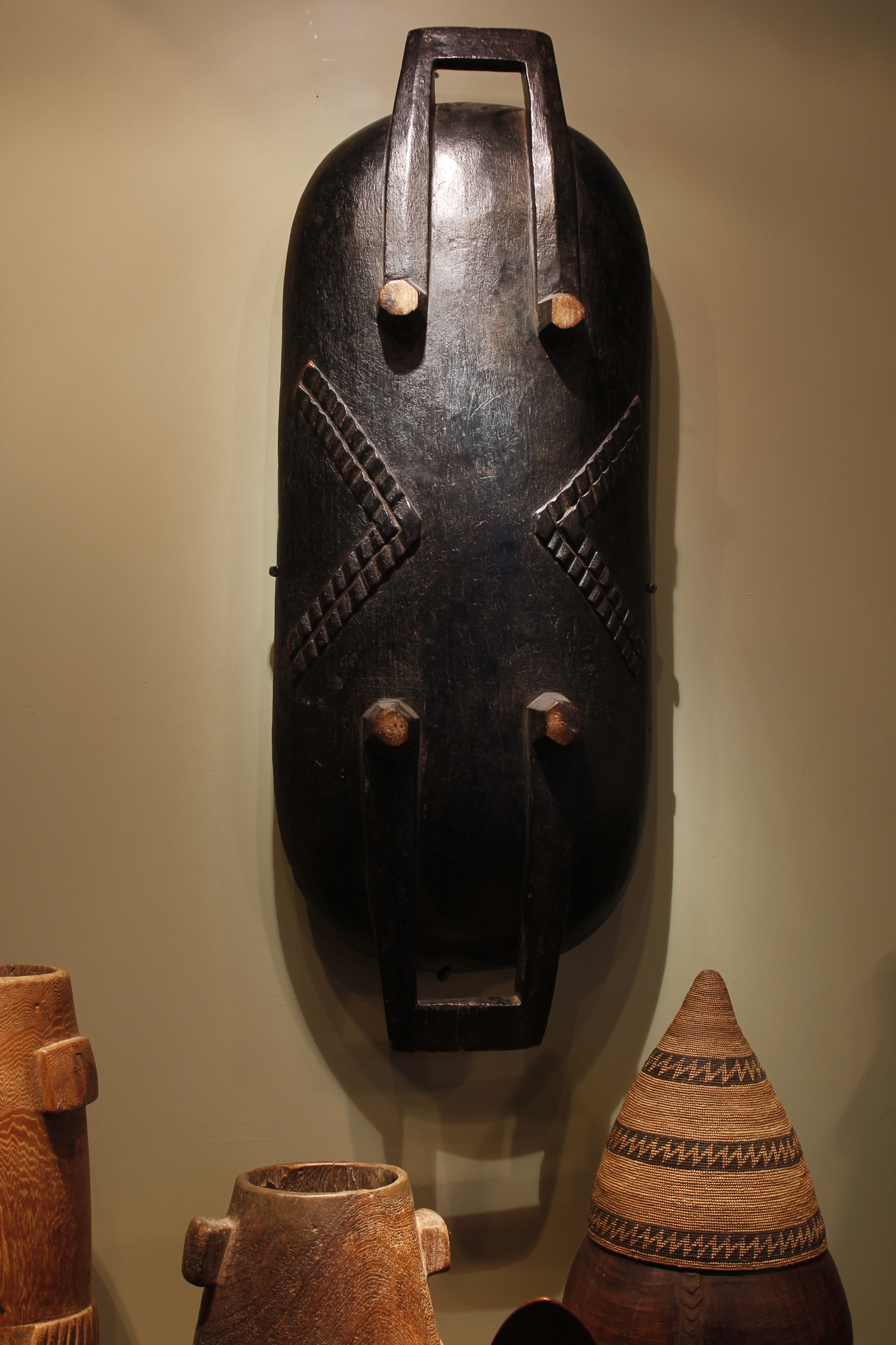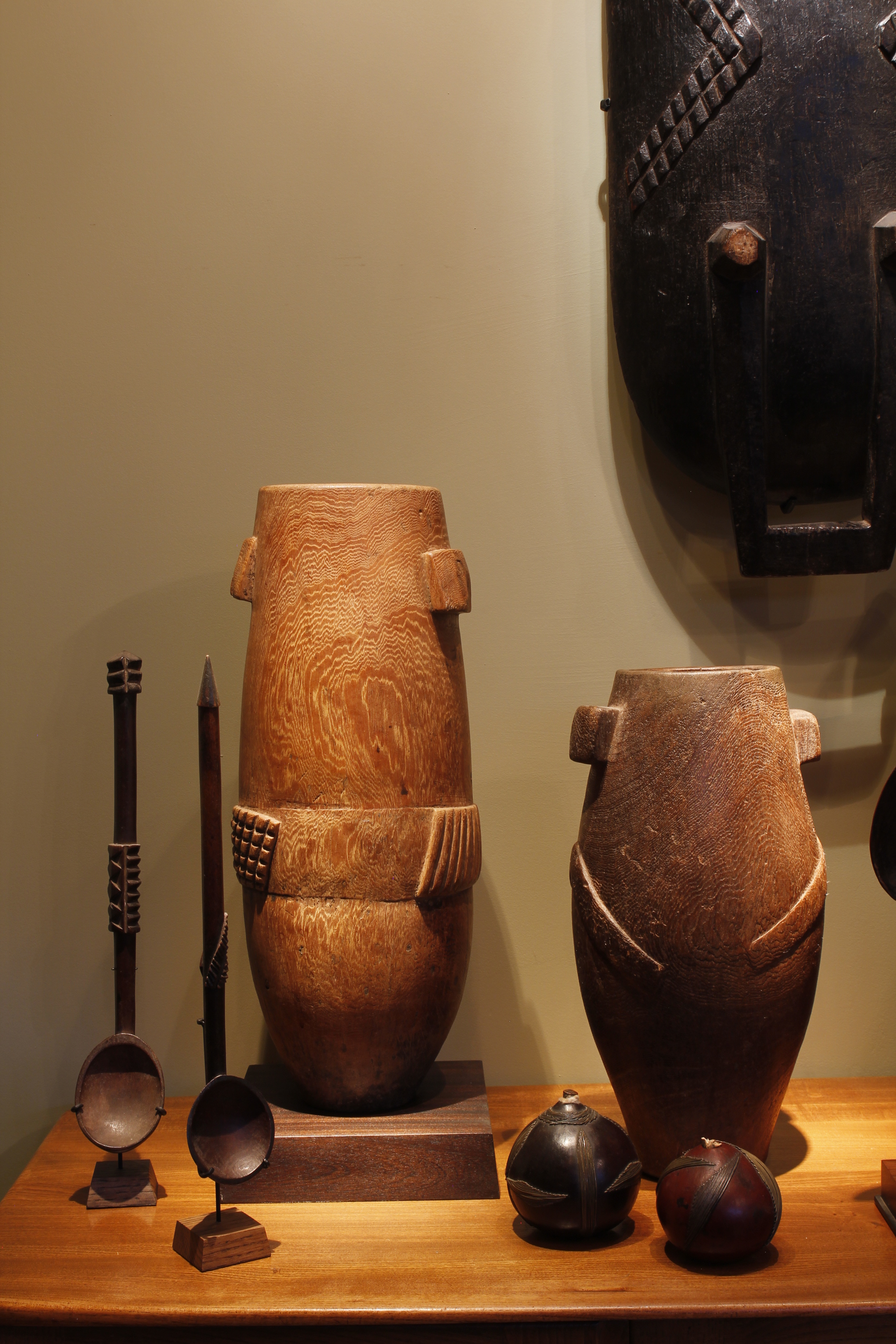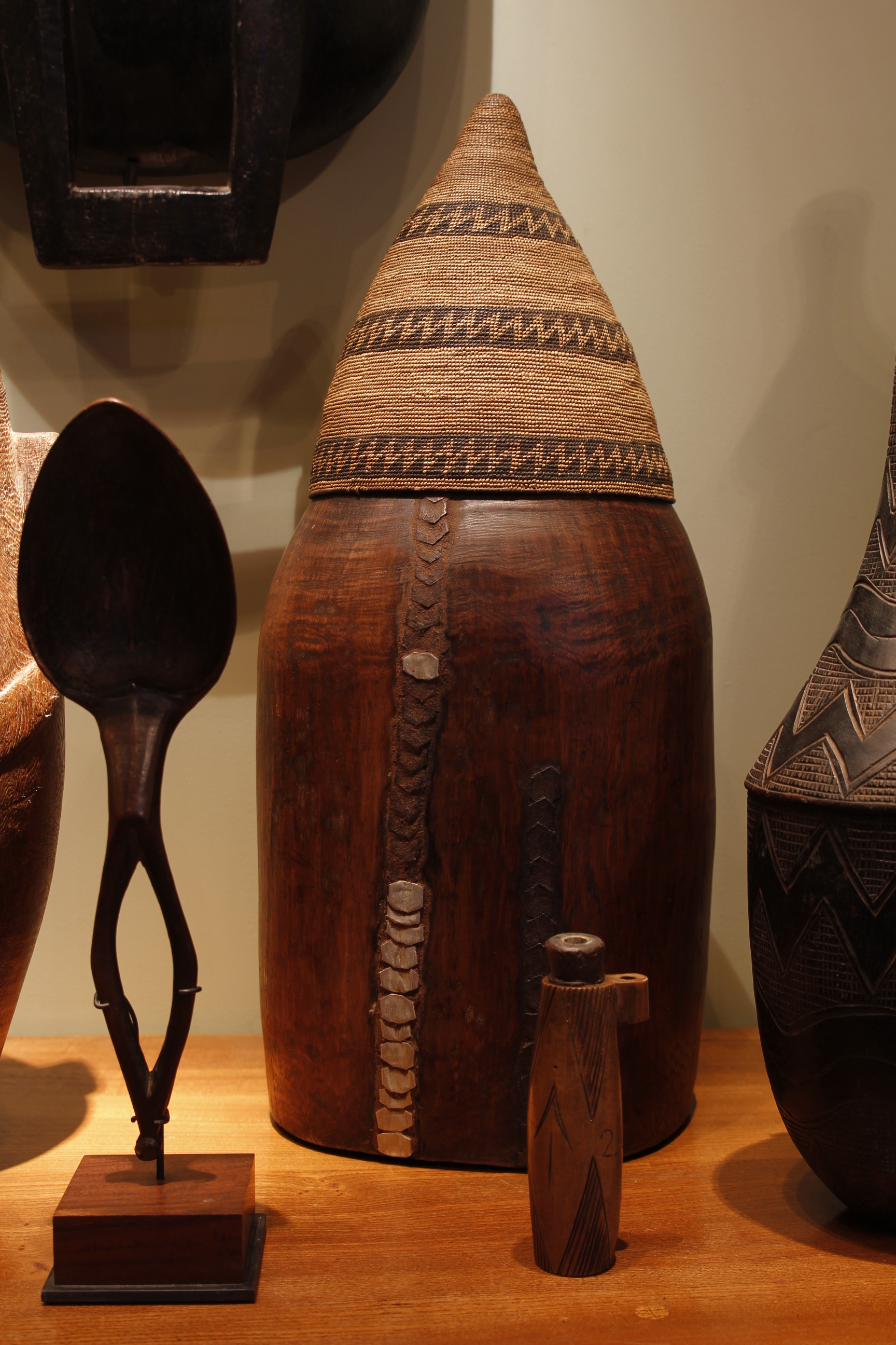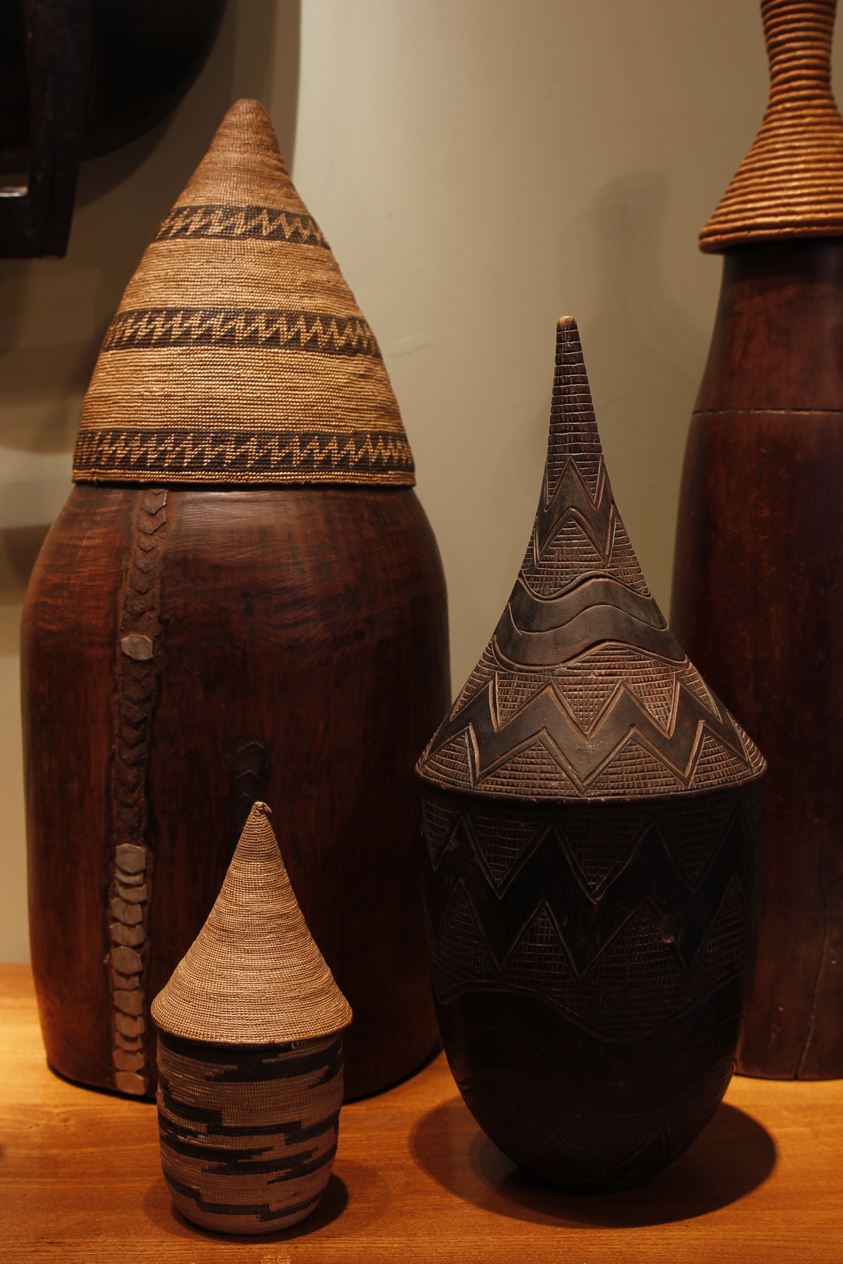 All these pieces can be found sold separately on the website, check under TRIBAL FORMS. Some pieces date to the 1920's - 1930's, in the case of the Tutsi baskets and the large container with zig zag woven fibre lid (Ex Pierre Dartevelle, Brussels). The other wooden containers and the wonderful large meat platter are Zulu and would date to around the 1950's. The beautifully formed spoons are Zulu, the one with the parted handle is a rare Punu spoon. These pieces each have a lovely worn patina and great form.