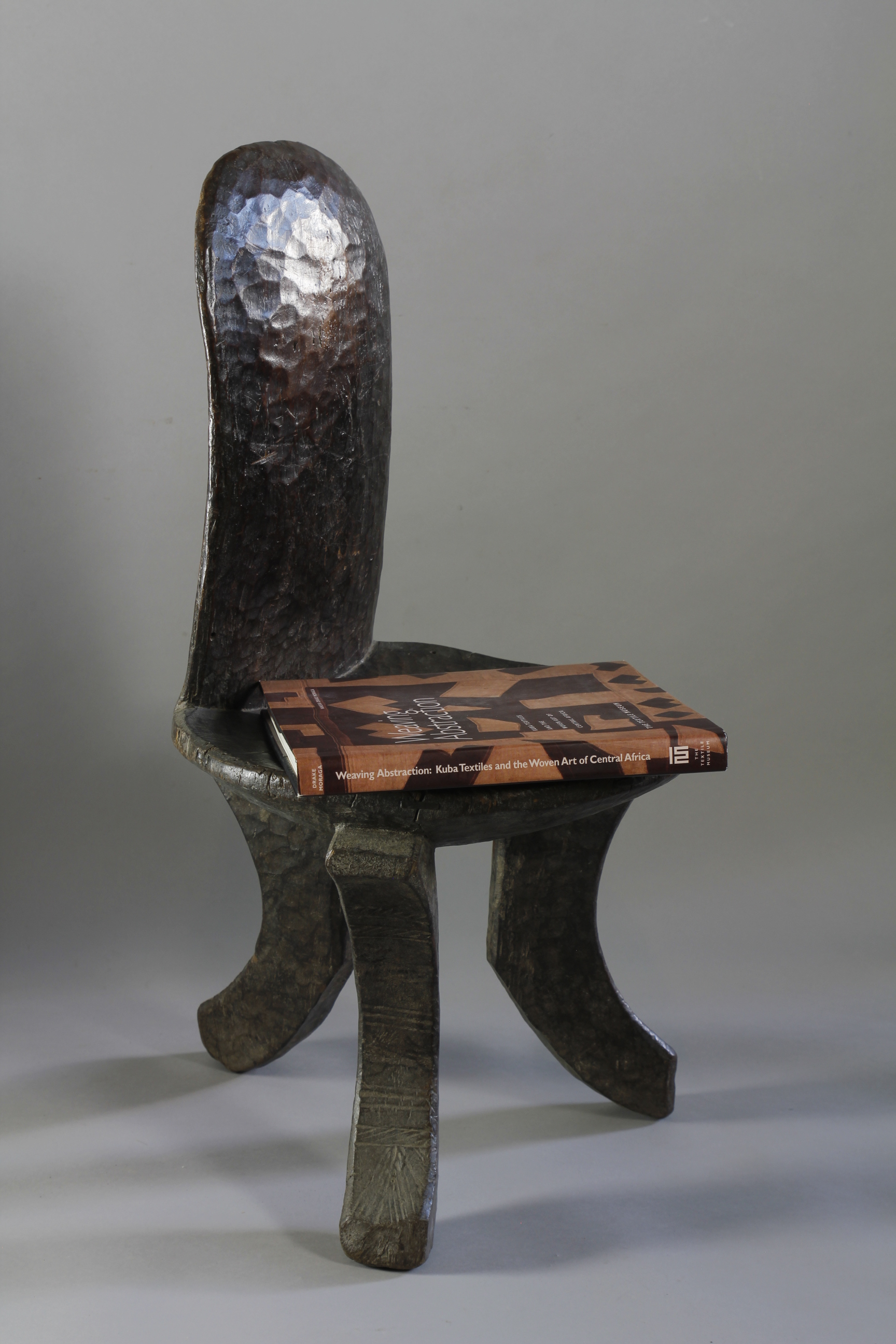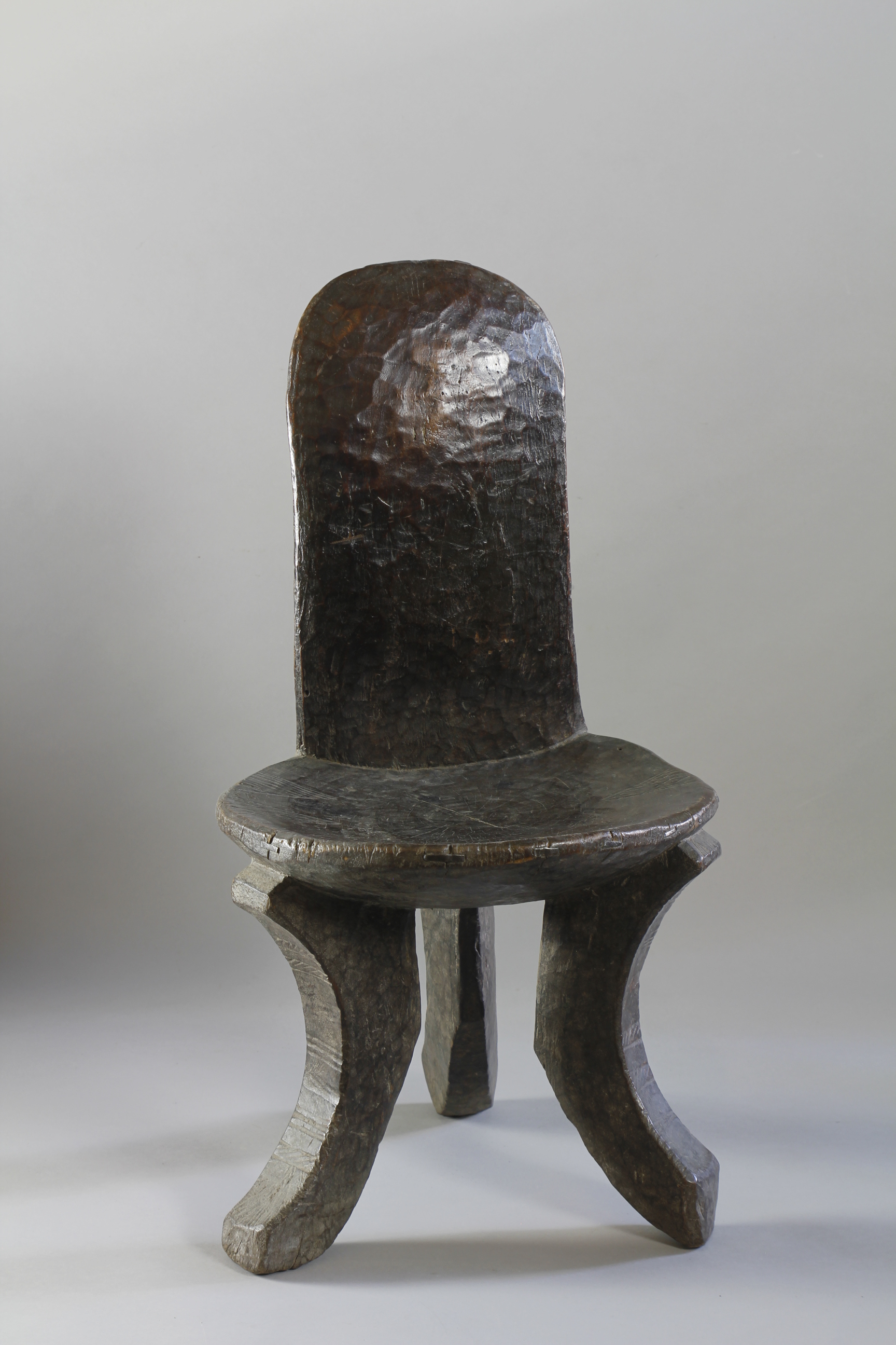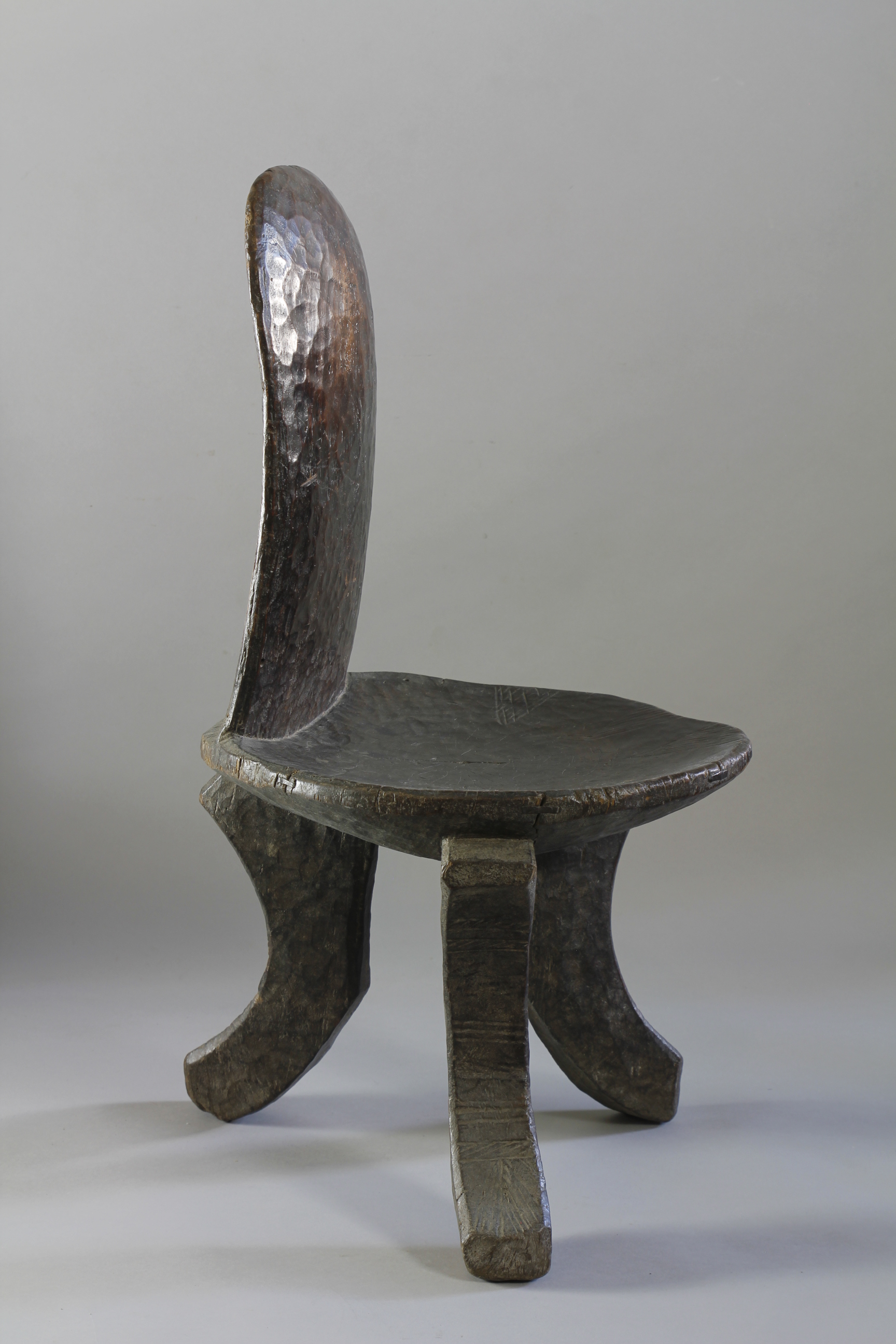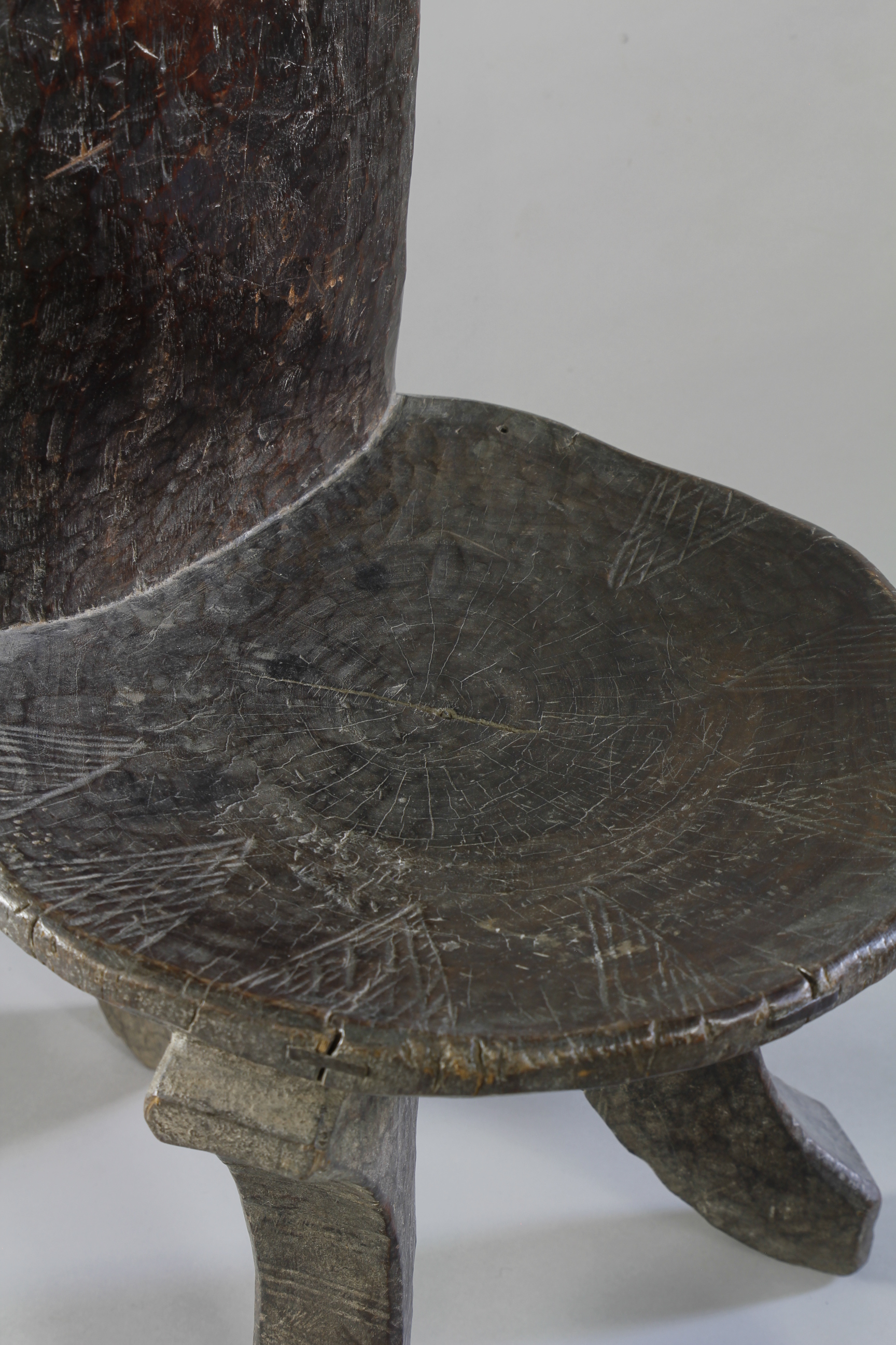Typically carved from a single piece of hard wood, the form of this chair features three angulated supporting legs, adorned with a series of simple linear decorations. These decorations continue onto the seat and the rear of the backrest, as shown in the photos.
