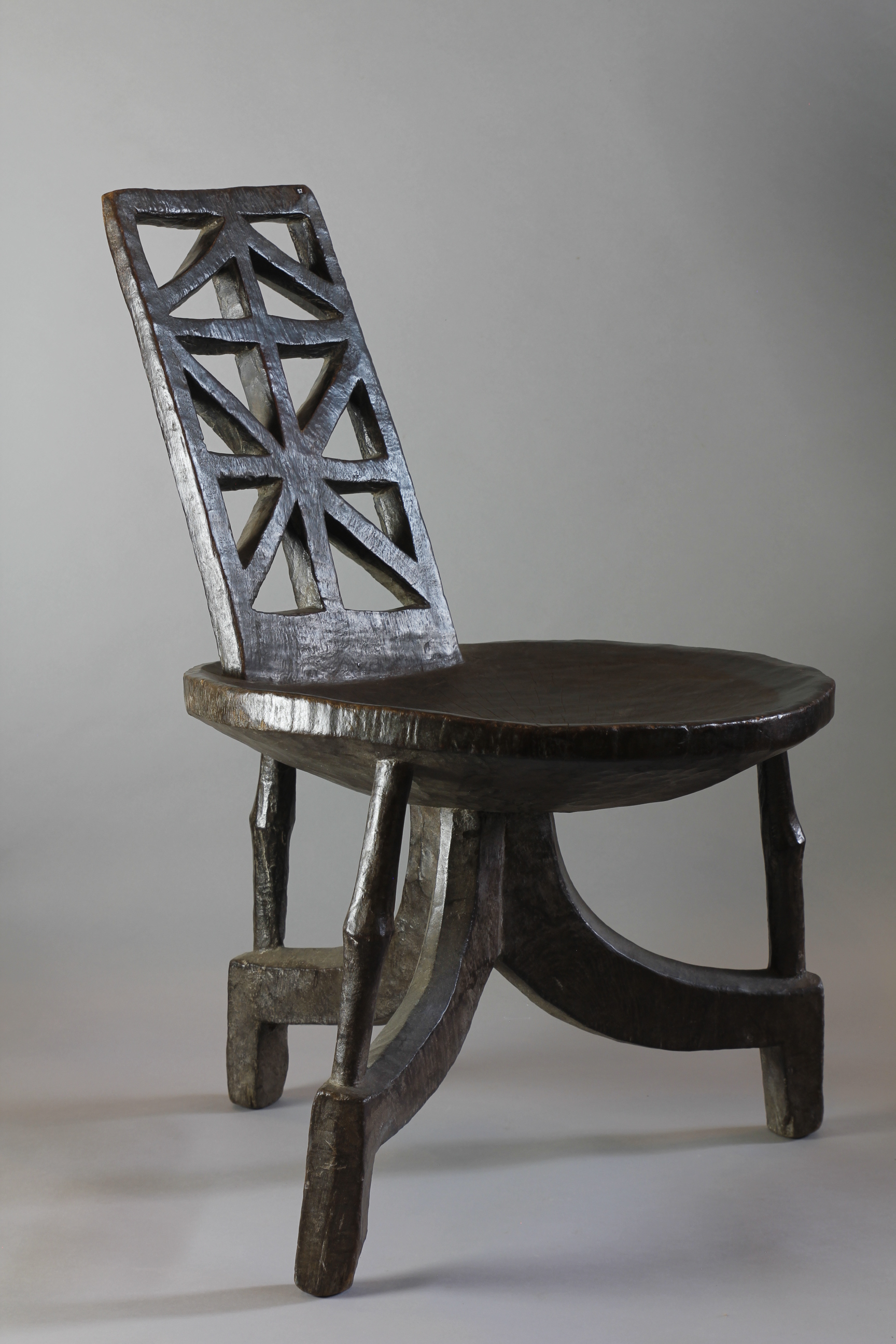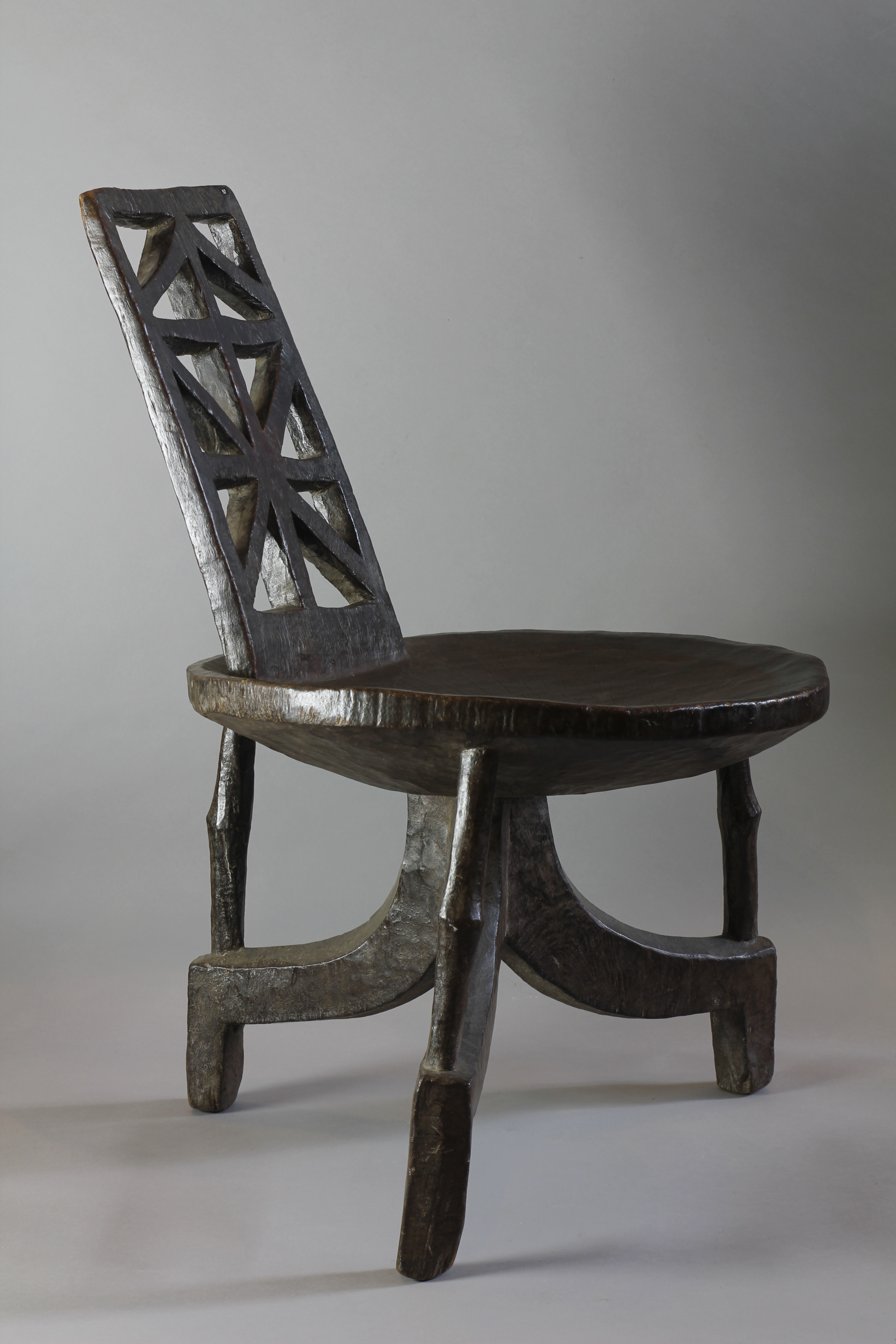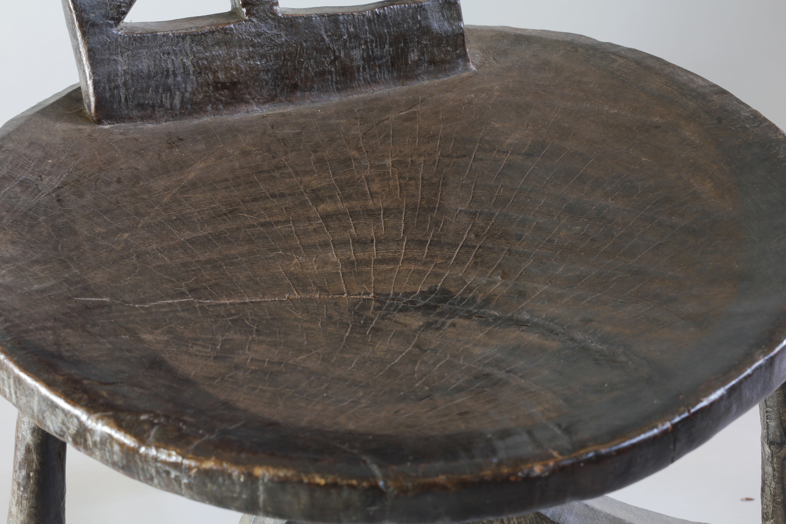 In terms of size alone it is hard to find Ethiopian chairs in this impressive size. The huge circular seat with a worn and rippled surface is supported by three slightly curved upright supports. The cut-out cross formation back support (typical with chairs from this region) reclines backwards making the chair comfortable to sit on. Once carved from one huge block of wood this in itself is a testament to this chairs age and importance.