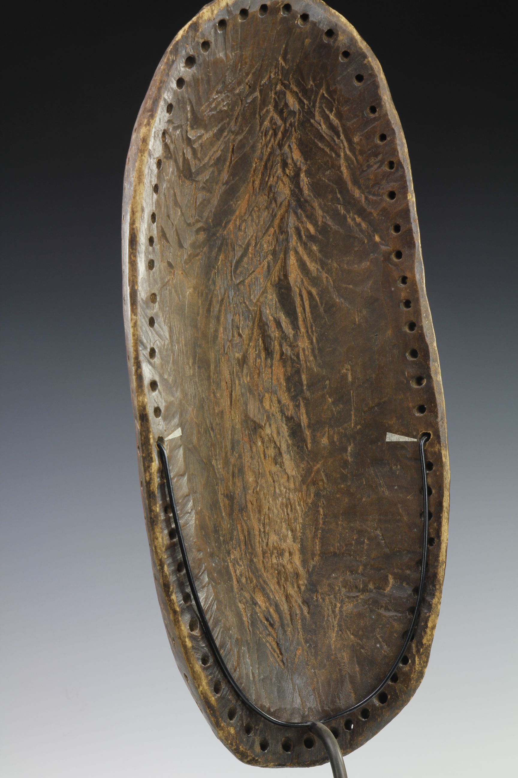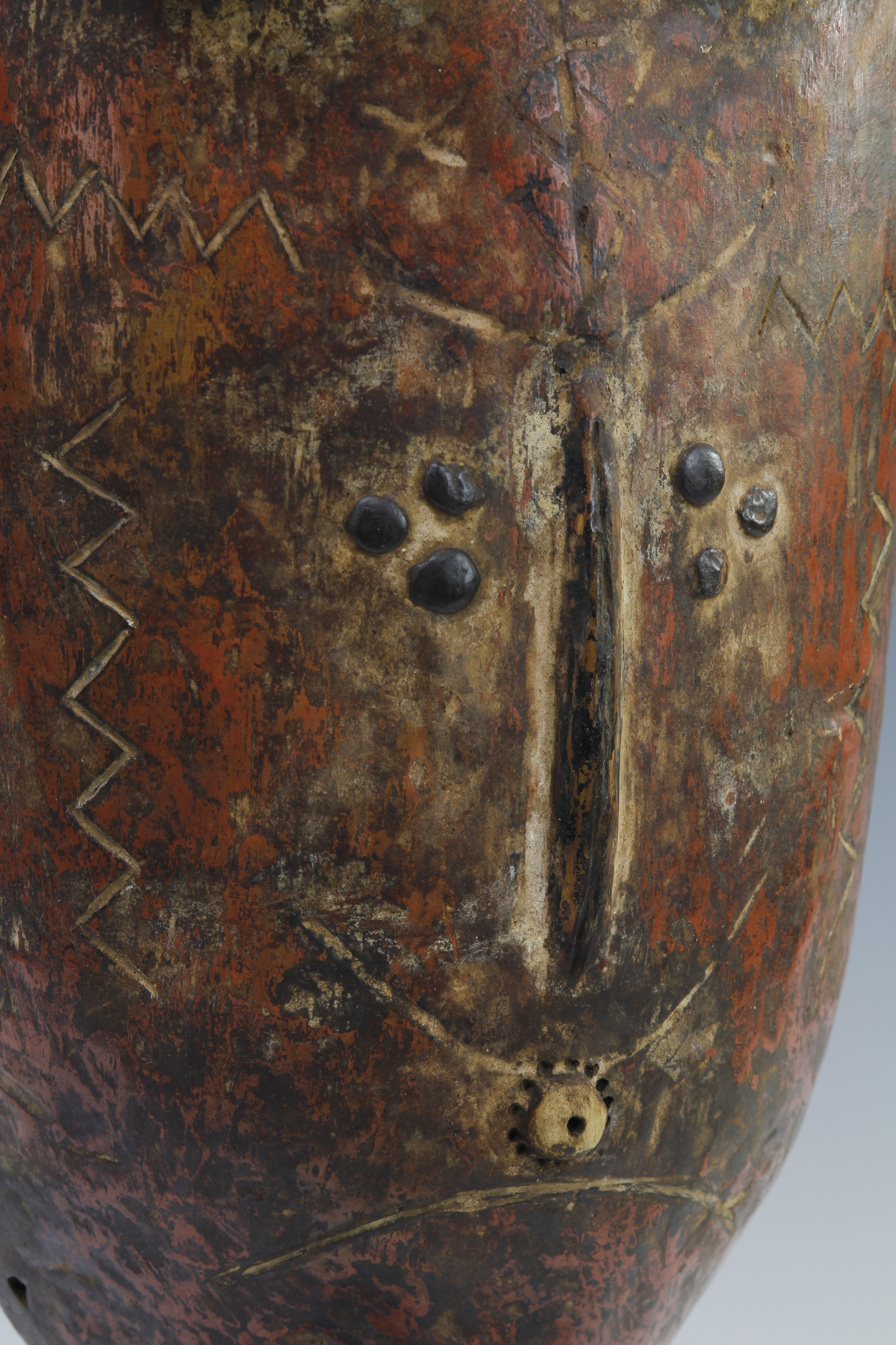This fine Makonde body mask features a series of attractive raised and engraved scarafication markings on the surface of its slightly protruding stomach. These marking follow throught to the area above the breasts. The weathered surface was once decoated with red pigments, now faded and worn. The rear of the mask has a lovely deep and slightly glossy patina from regular use.