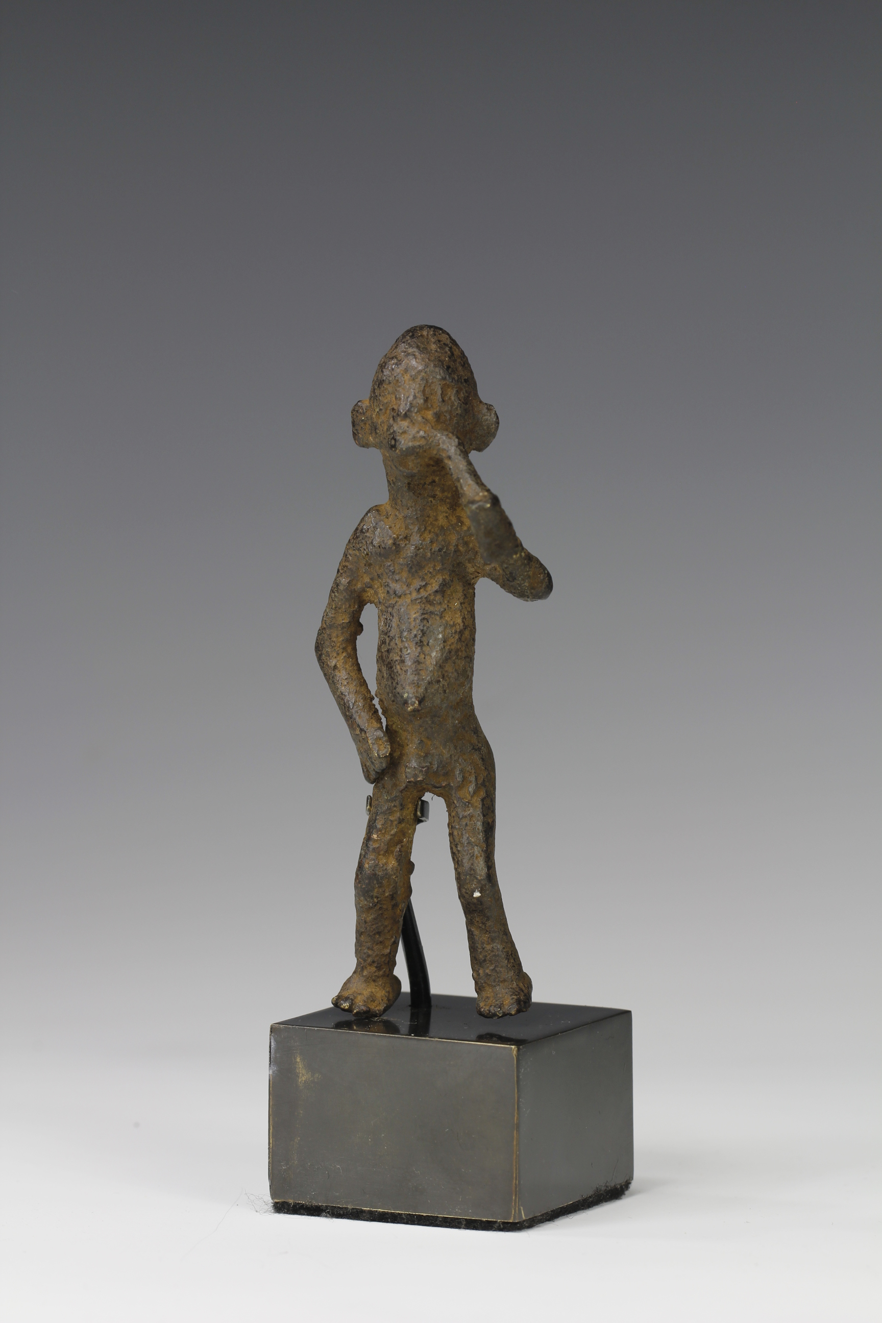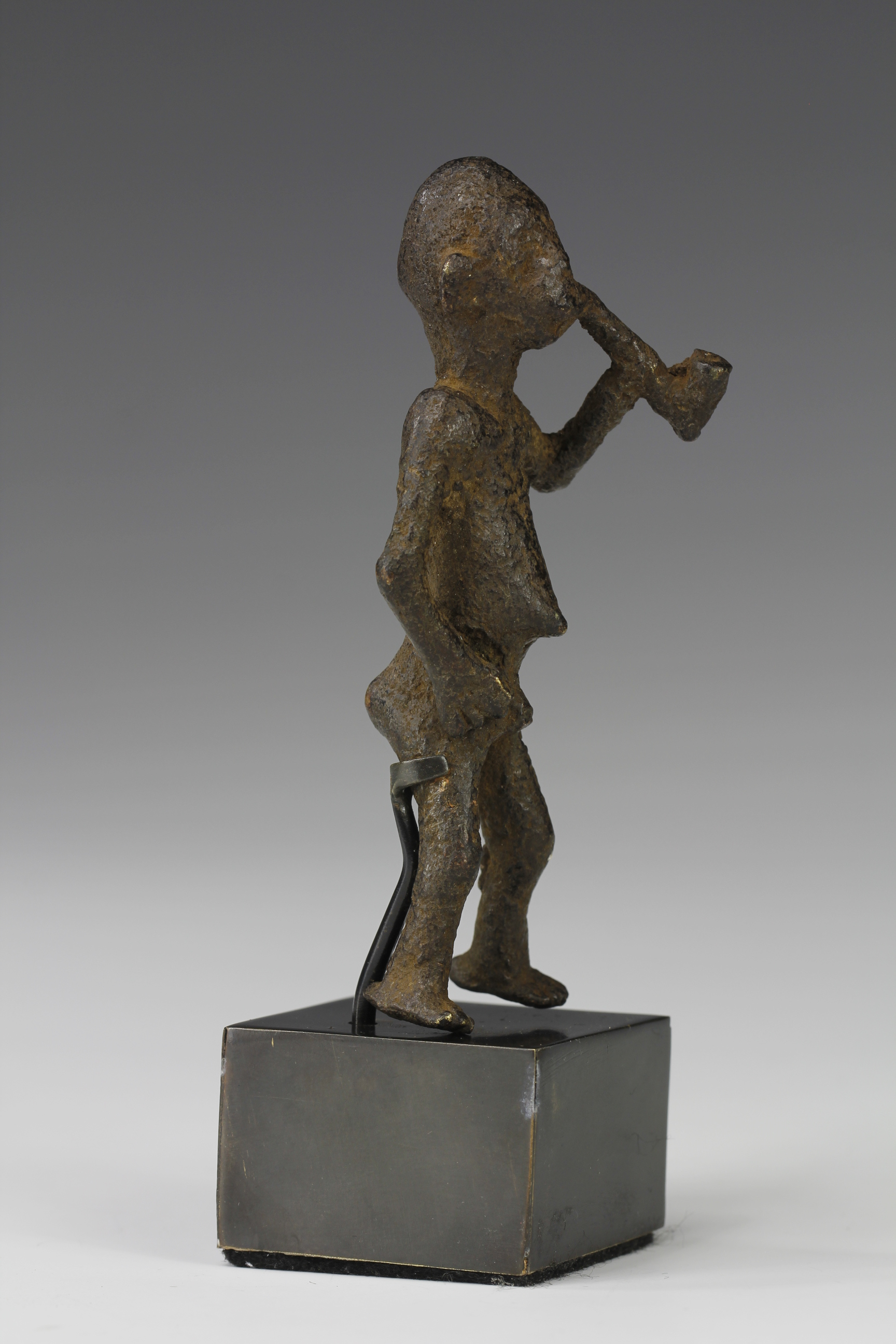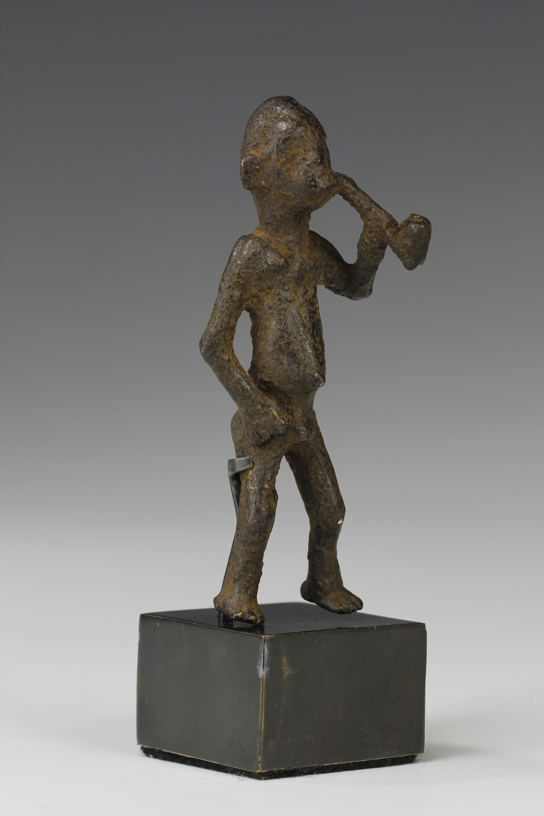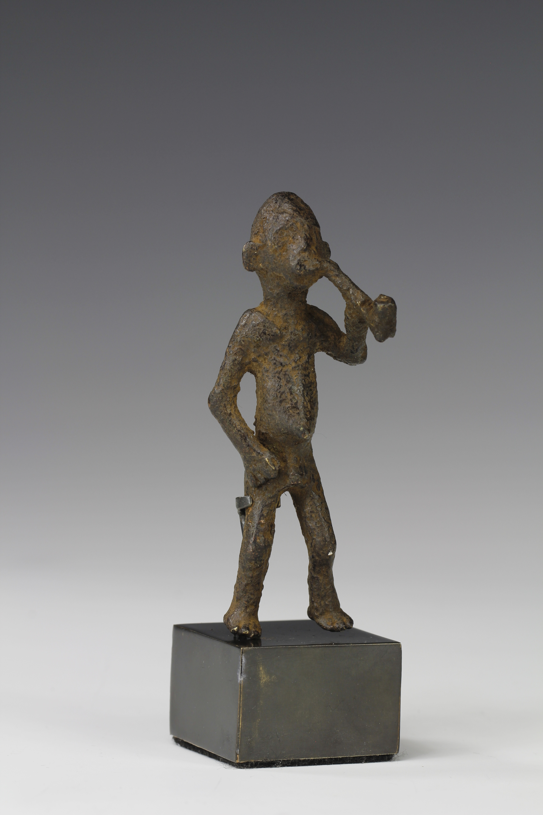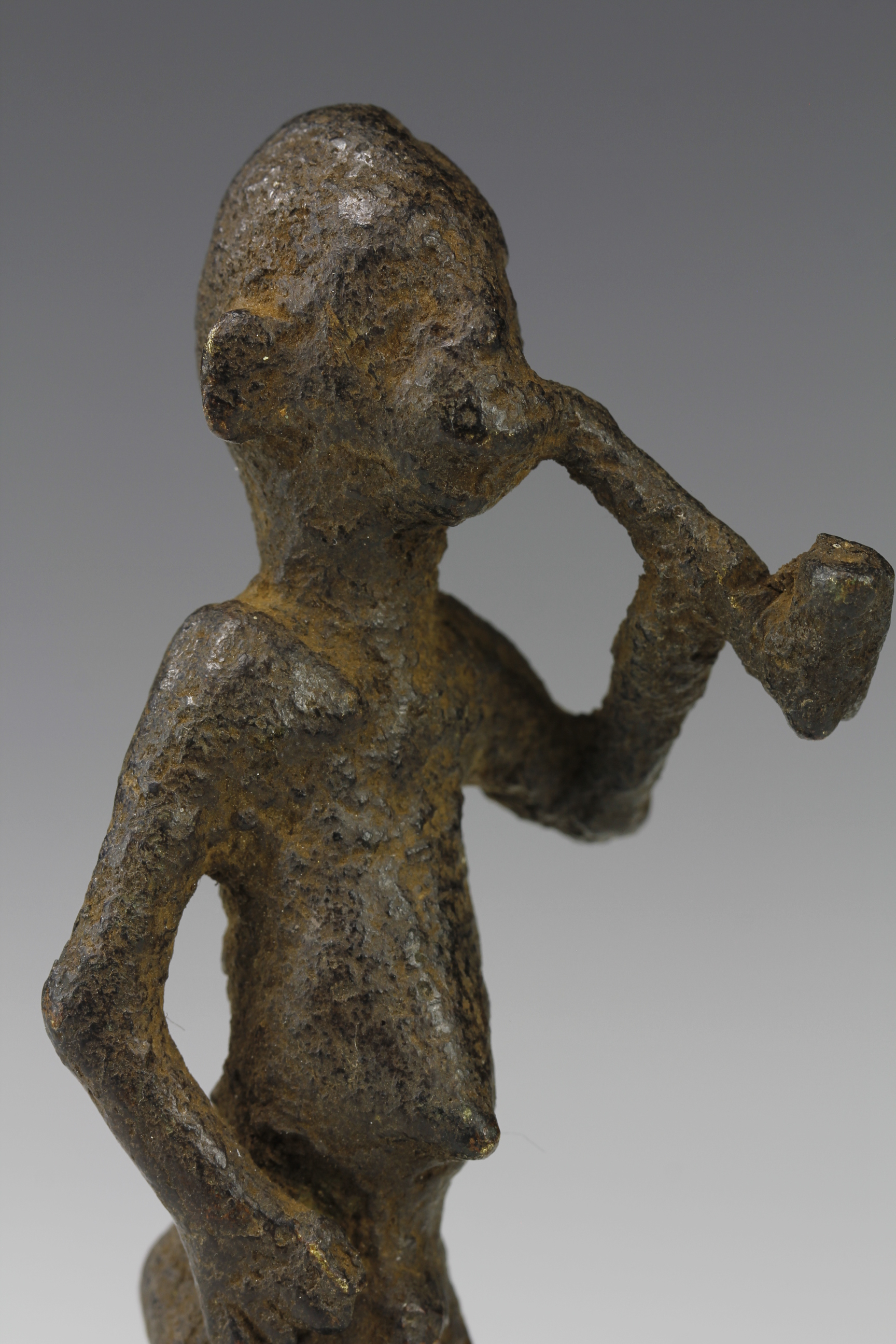 Old cast bronze alloy miniature figure of a man holding a pipe, unknown culture (possible Bamileke). Deep dark eroded surface that shows obvious signs of ancient age.