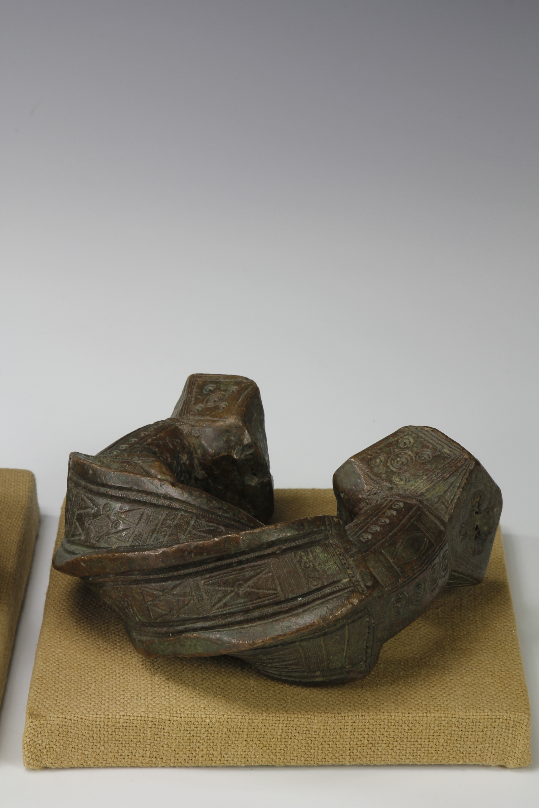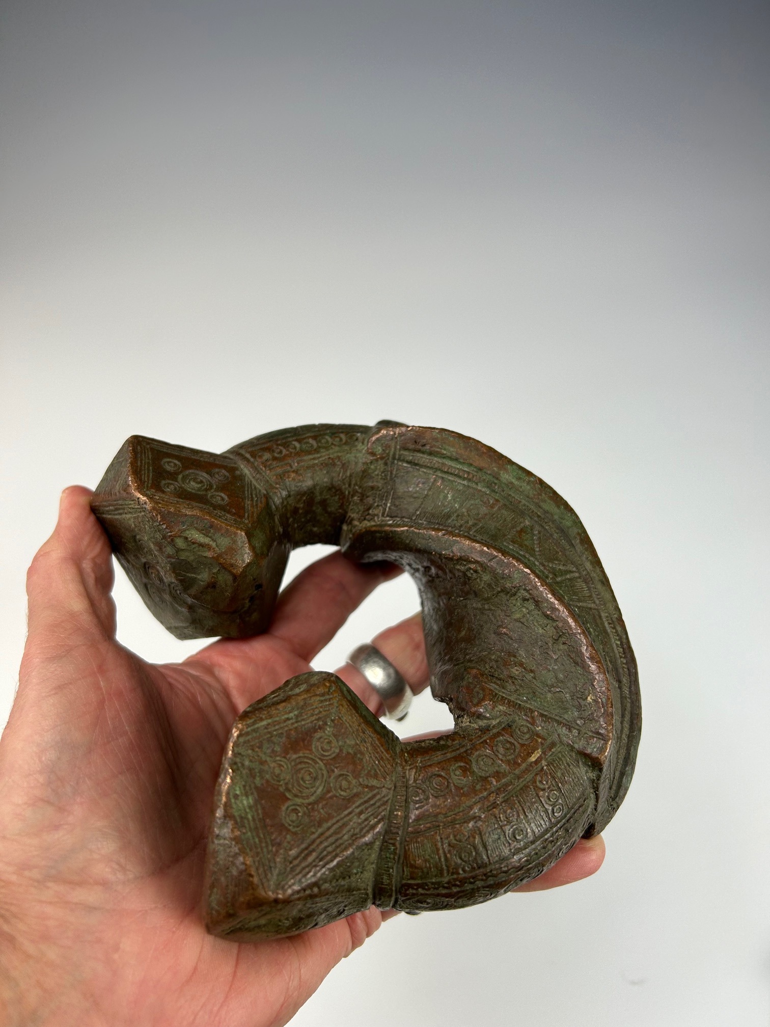 Rare to find and as a pair. These early copper alloy adornments (sometimes also referred to as currencies) were traditionally kept as a important symbol of wealth and prestige.
