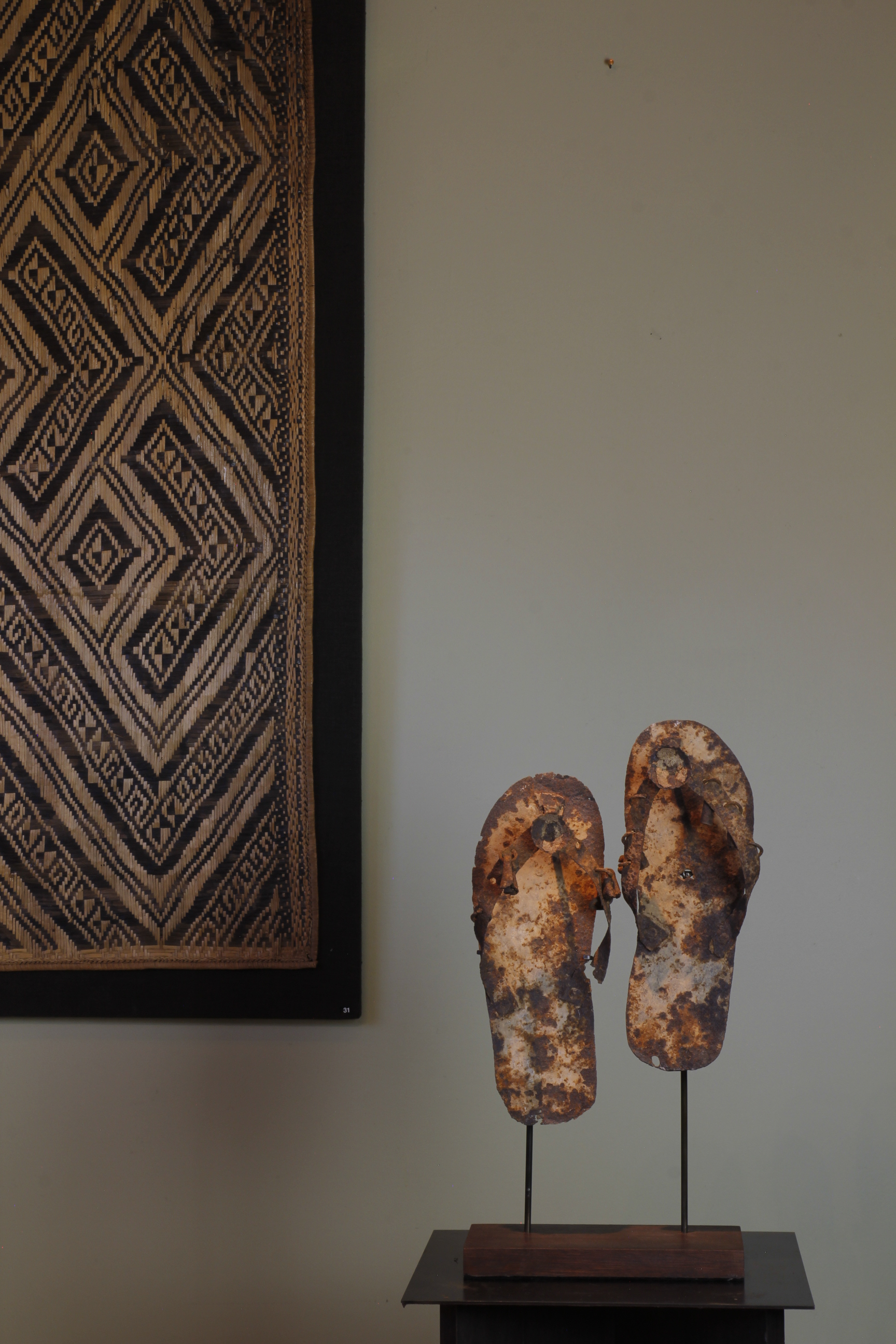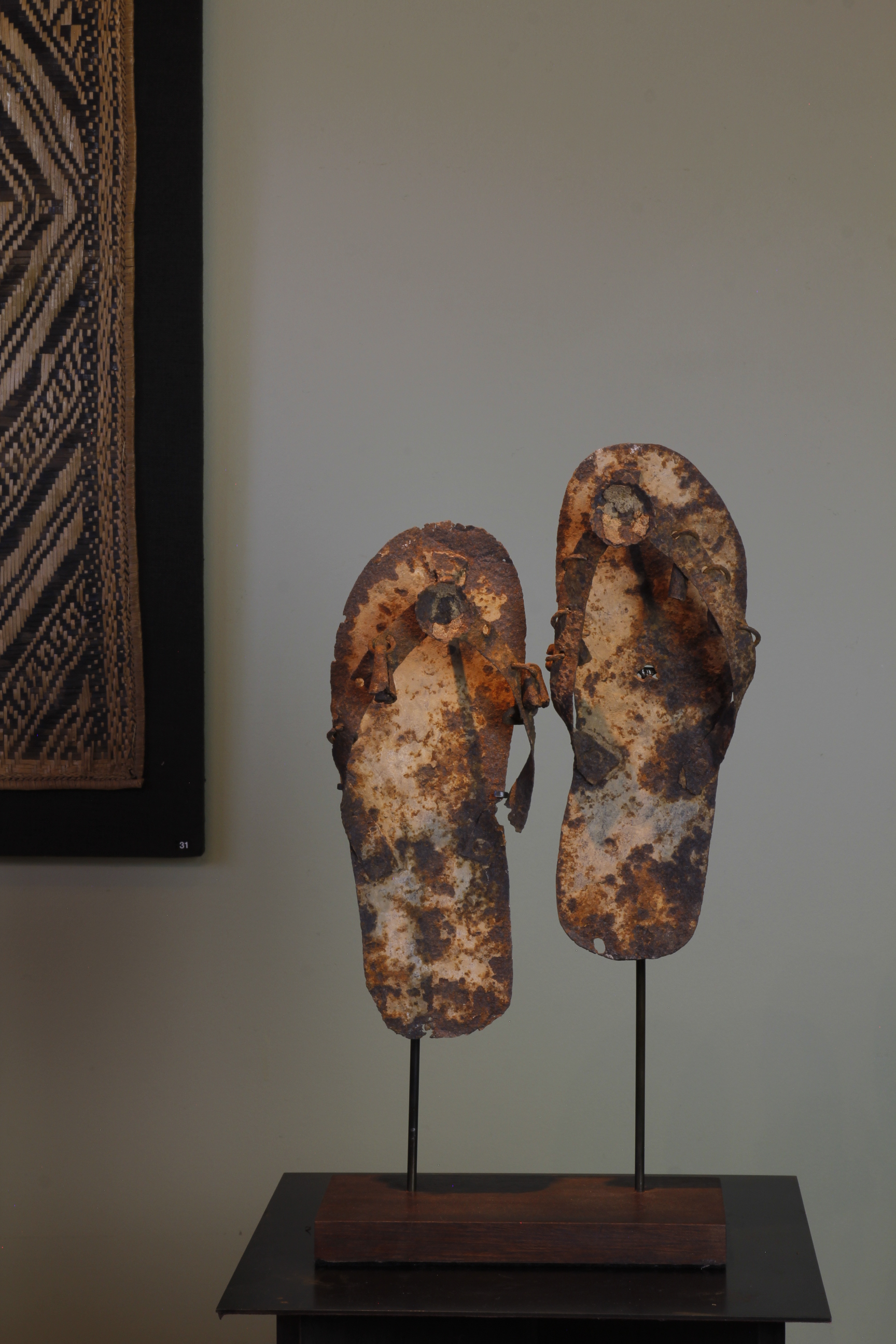 It is not exactly know the traditional use of these old iron sandals but it is thought that they would have been placed in a Dogon cave with the purpose being that they would aid with the transition to the ancestral after life. They were certainly not made to wear. They may also have been connected in a ritual purpose to the 'Hogon'. The thin iron surface is deeply corroded from age and being exposed to the natural elements.