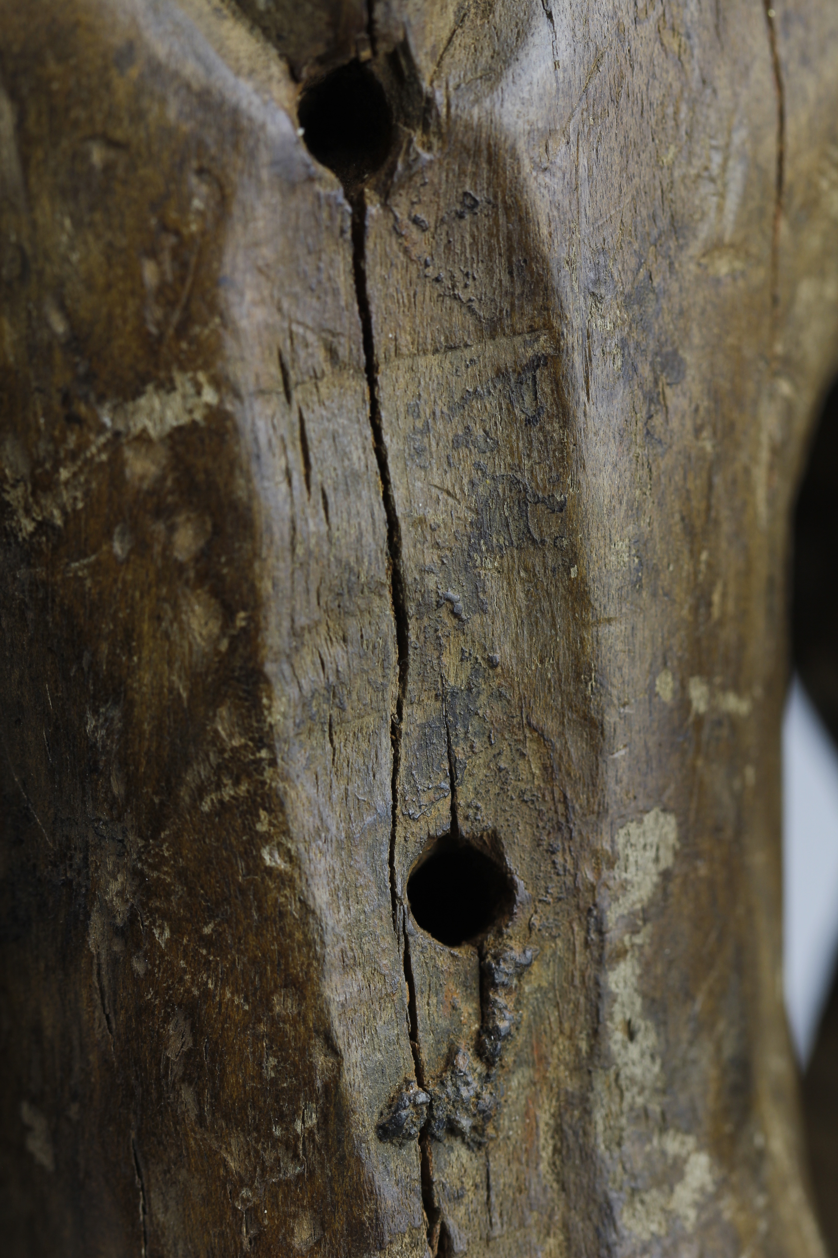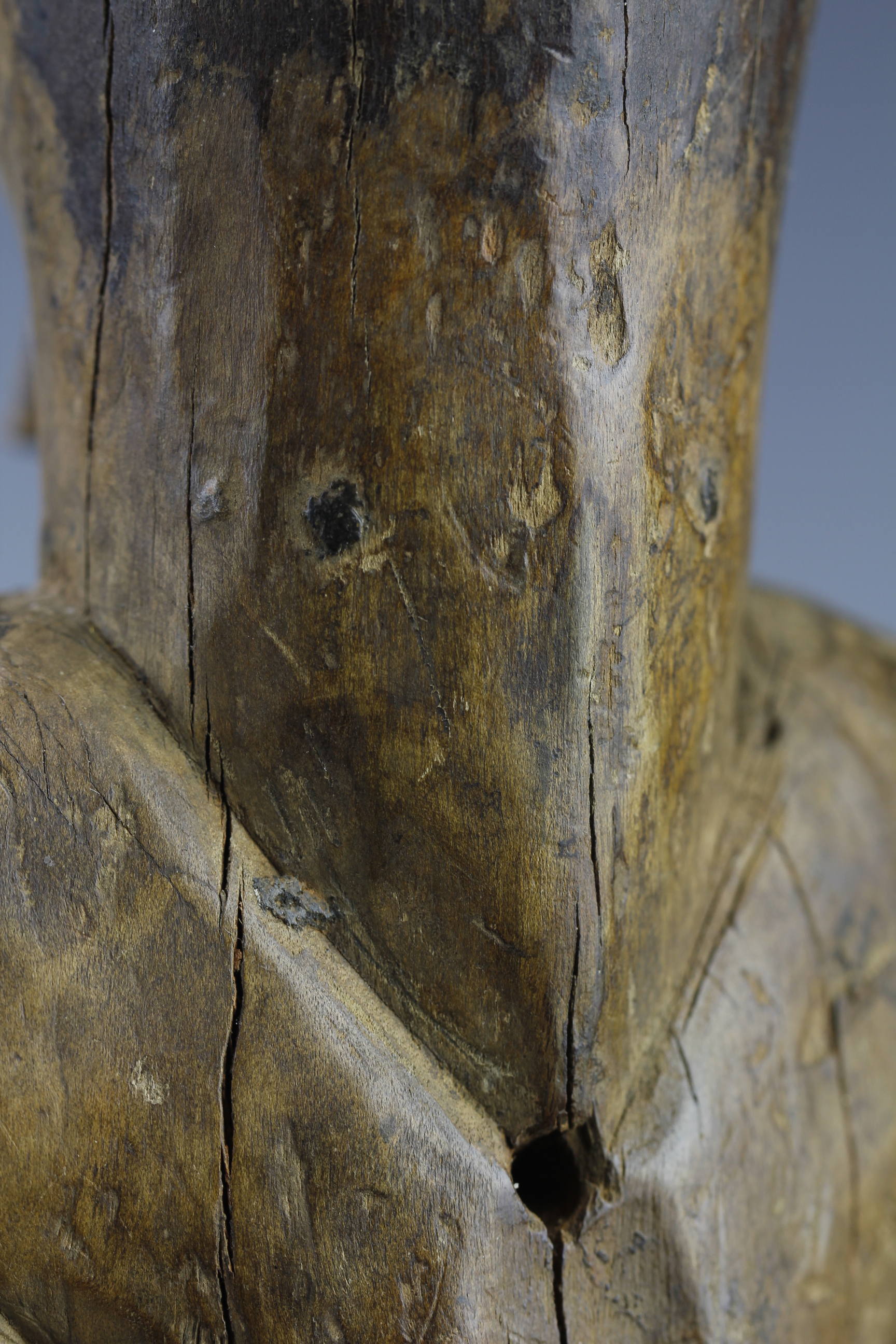 A Kongo Yombe or Vili ancestral figure kneeling on a rectangular base with a finely featured slightly upturned head, fine lips and open mouth. The glass eyes are typically painted white and metal nails, now corroded, have been inserted around the lower jaw and chin.(There are signs that there was once an attachment of some sort to this area) The figure sits with reversed hands resting on the upper thighs. At the back are two small fetish holes with traces of tiny insertions or dots of metal, which appears to be iron, just below the lower hole and on the lower neck (as shown in the photos)