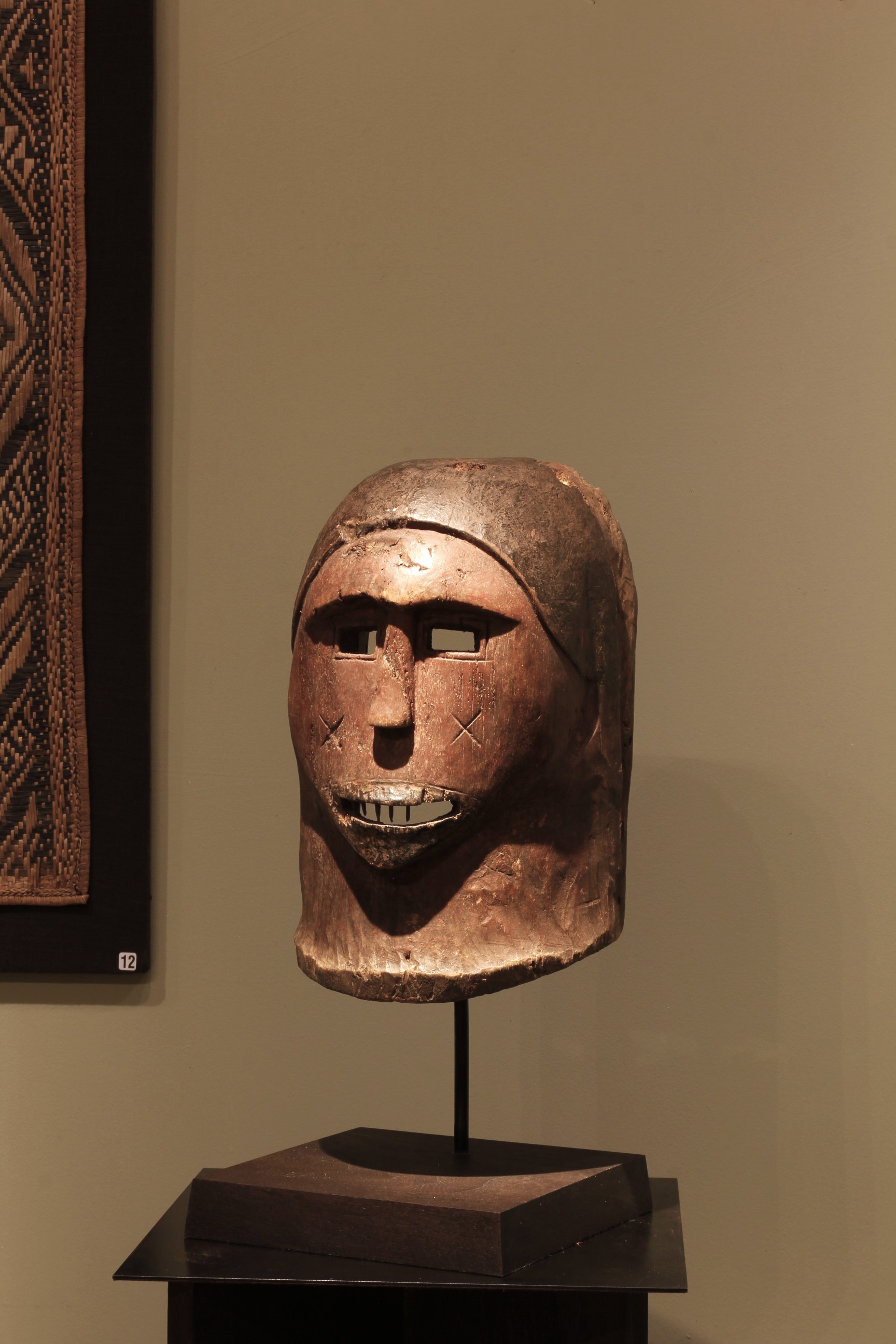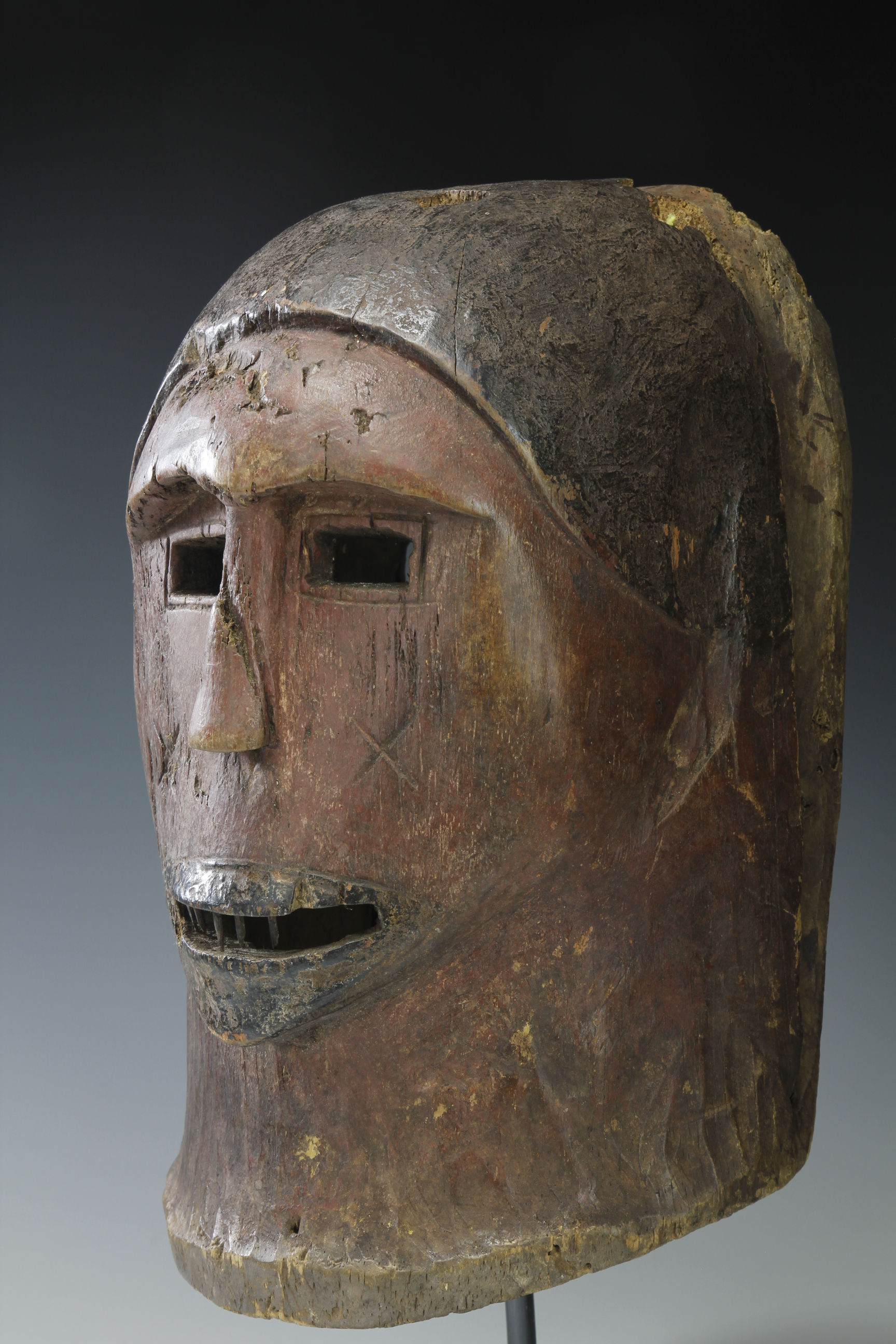 This mask, with a pair of square-shaped eyes and prominent hooded neck, displays a powerful, primal expression – an expression typically found among masks from this region of Tanzania. The mask bares a set of teeth made from inserted metal, and emblazoned on each cheek are two cross-shaped facial markings.
