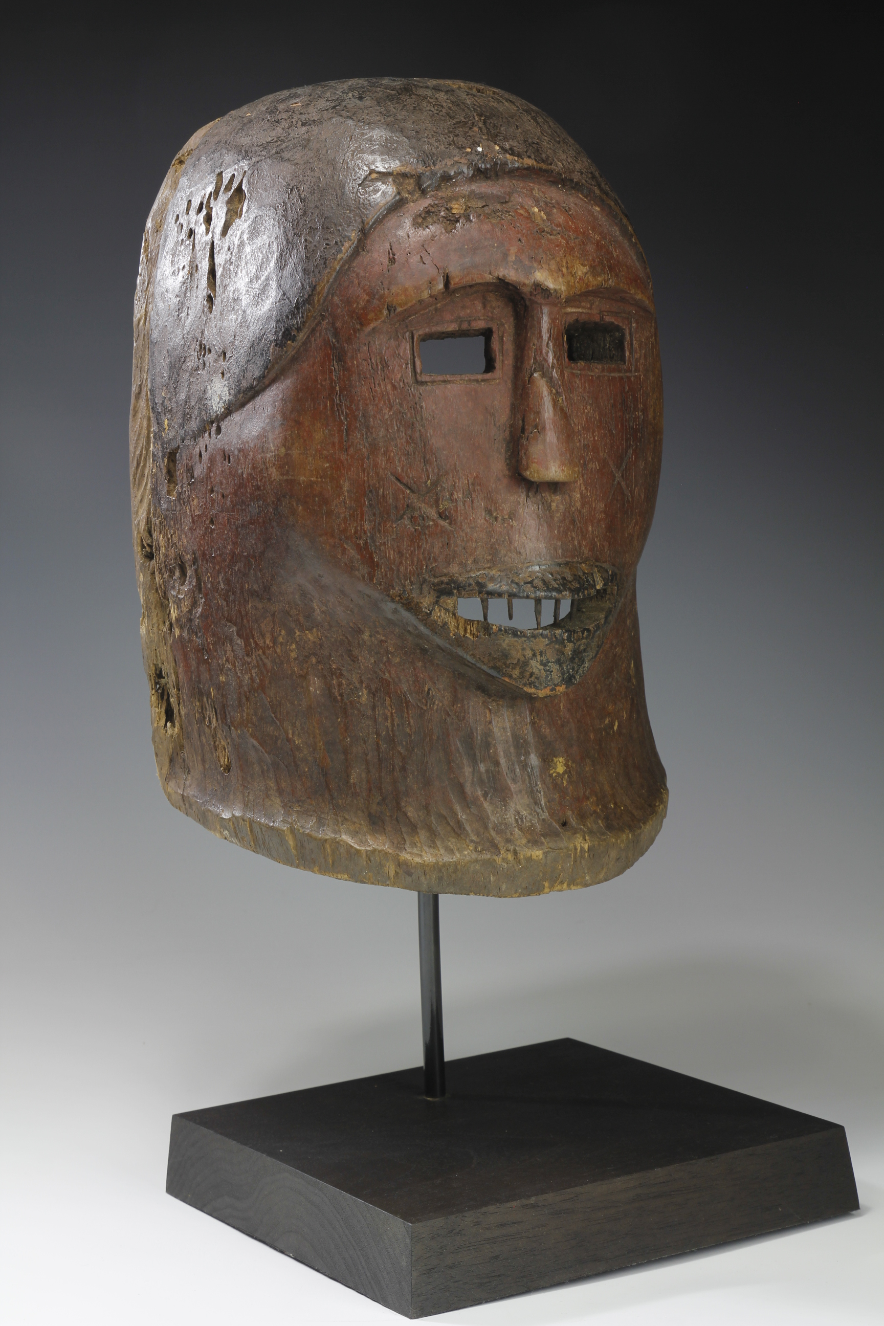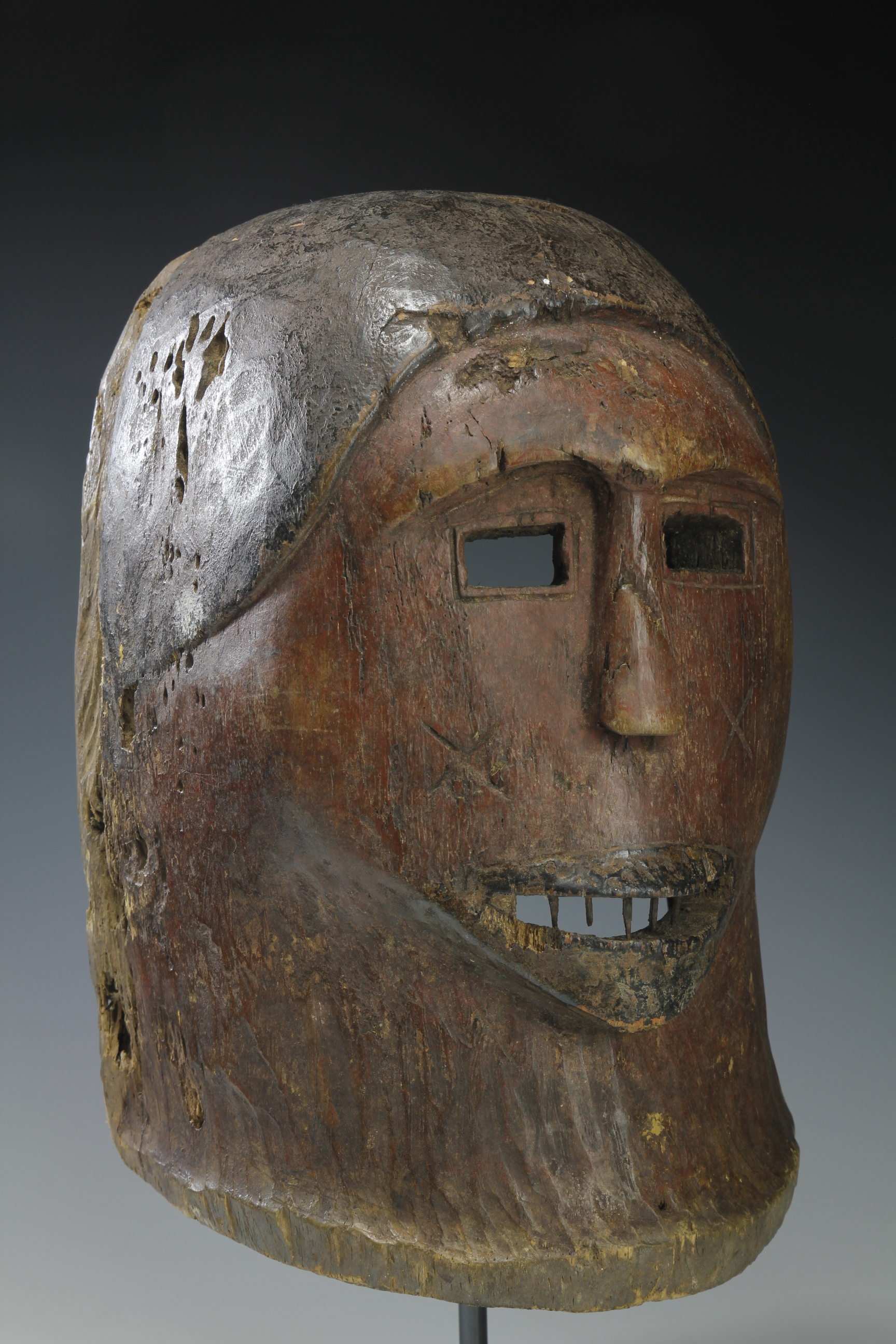 Red and black pigments decorate the surface of the mask, which, over time, have become faded and worn.