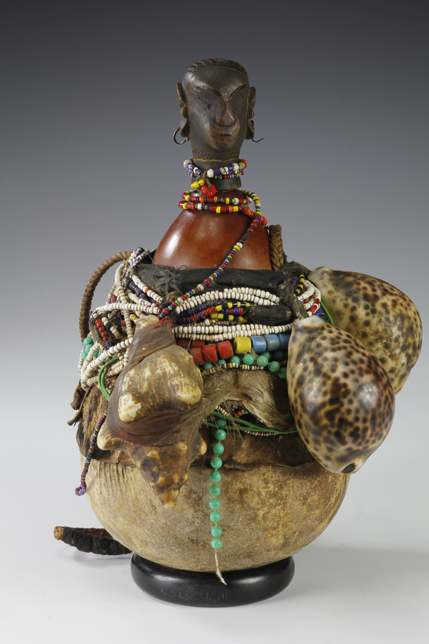 A large richly adorned gourd medicine container, Kaguru culture, Tanzania. This container, with its carved wooden stopper has a amazing array of decorations and attachments. One of the most beautiful containers I have never handled. Around its body are two large tiger cowrie shells which are rare to find on the coast of Tanzania. Another large shell attached has been stuffed with a bundle of traditional medicine inside. These together with the multiple stands of old glass beads are a testament to this pieces once power and importance.