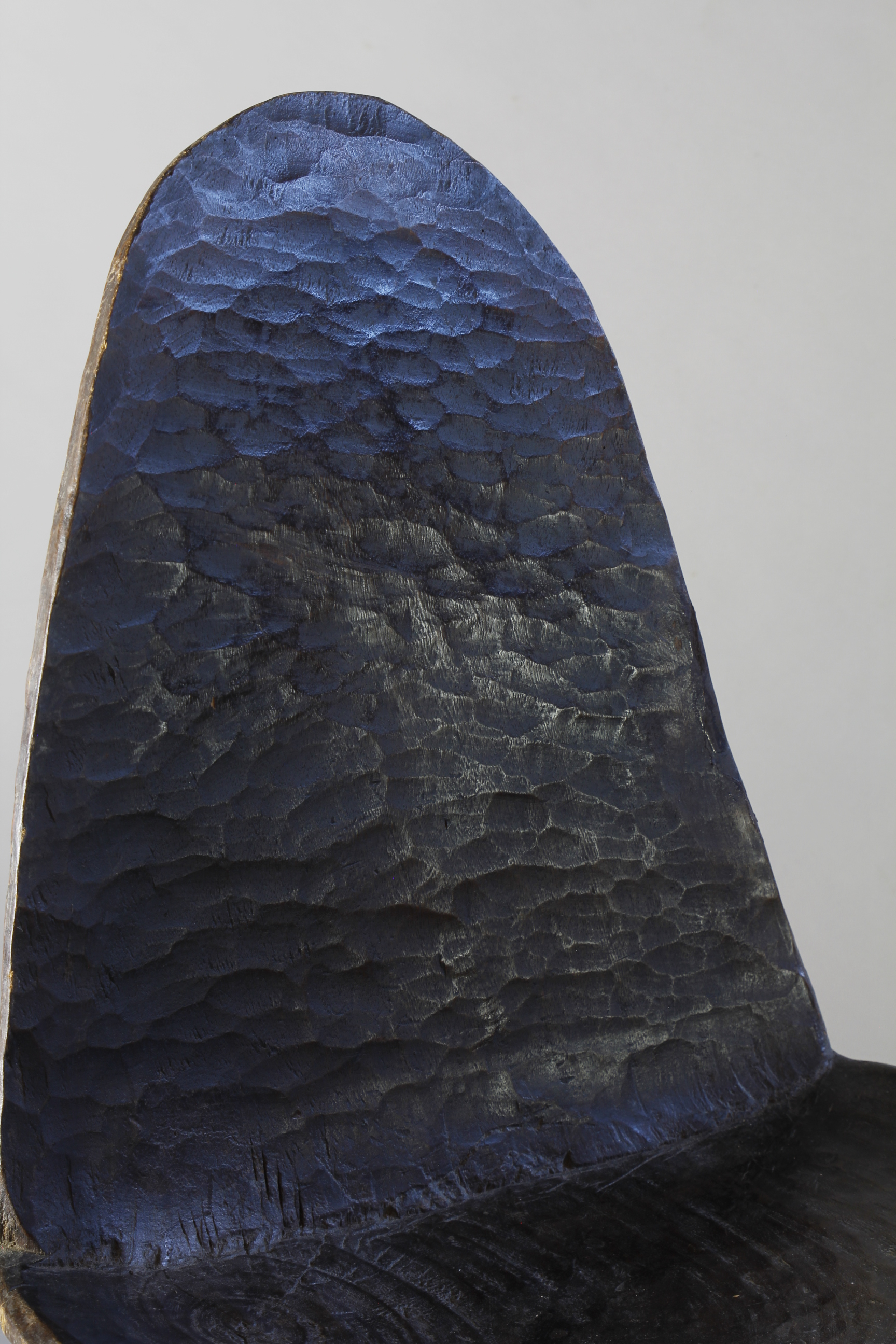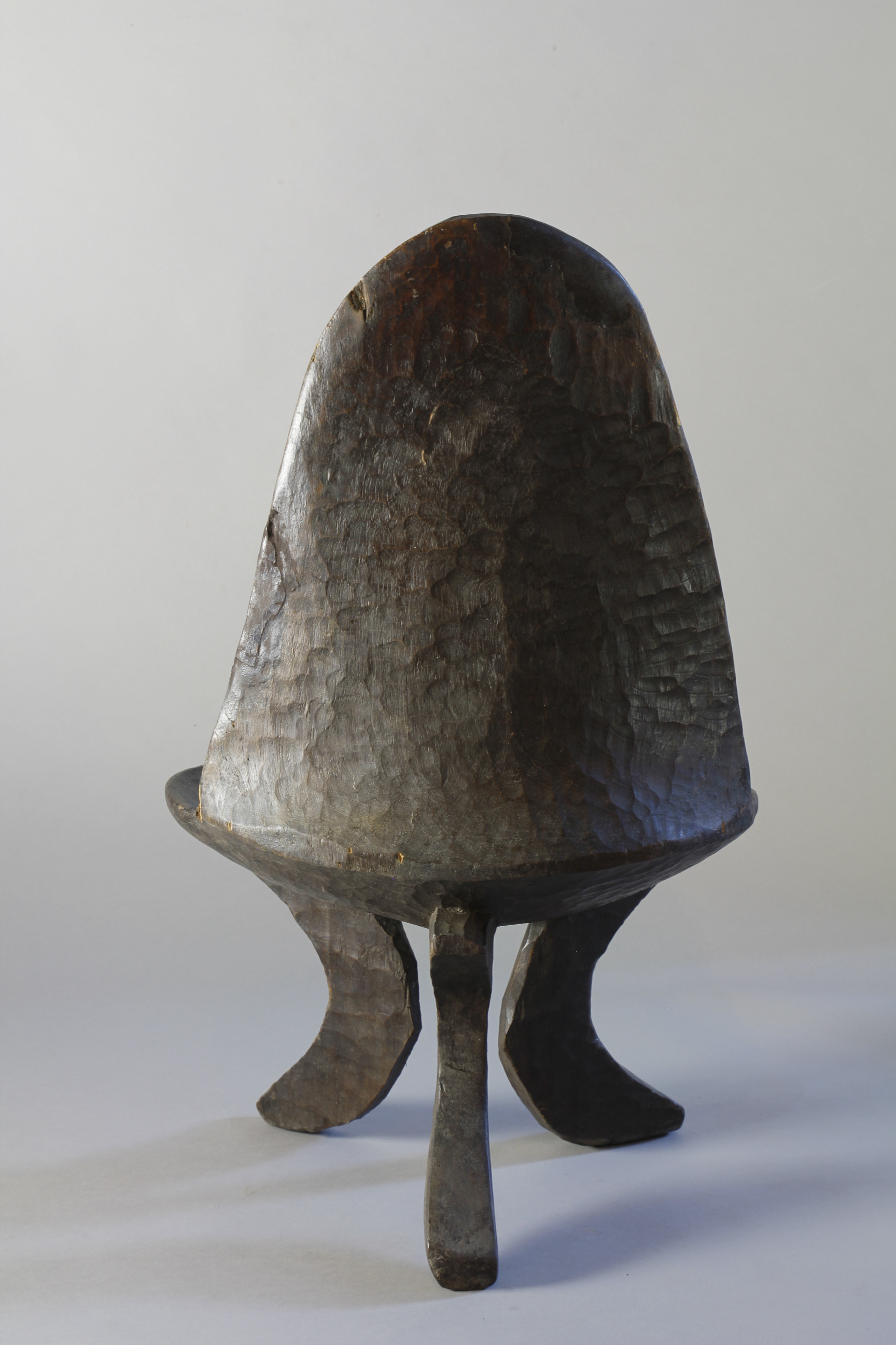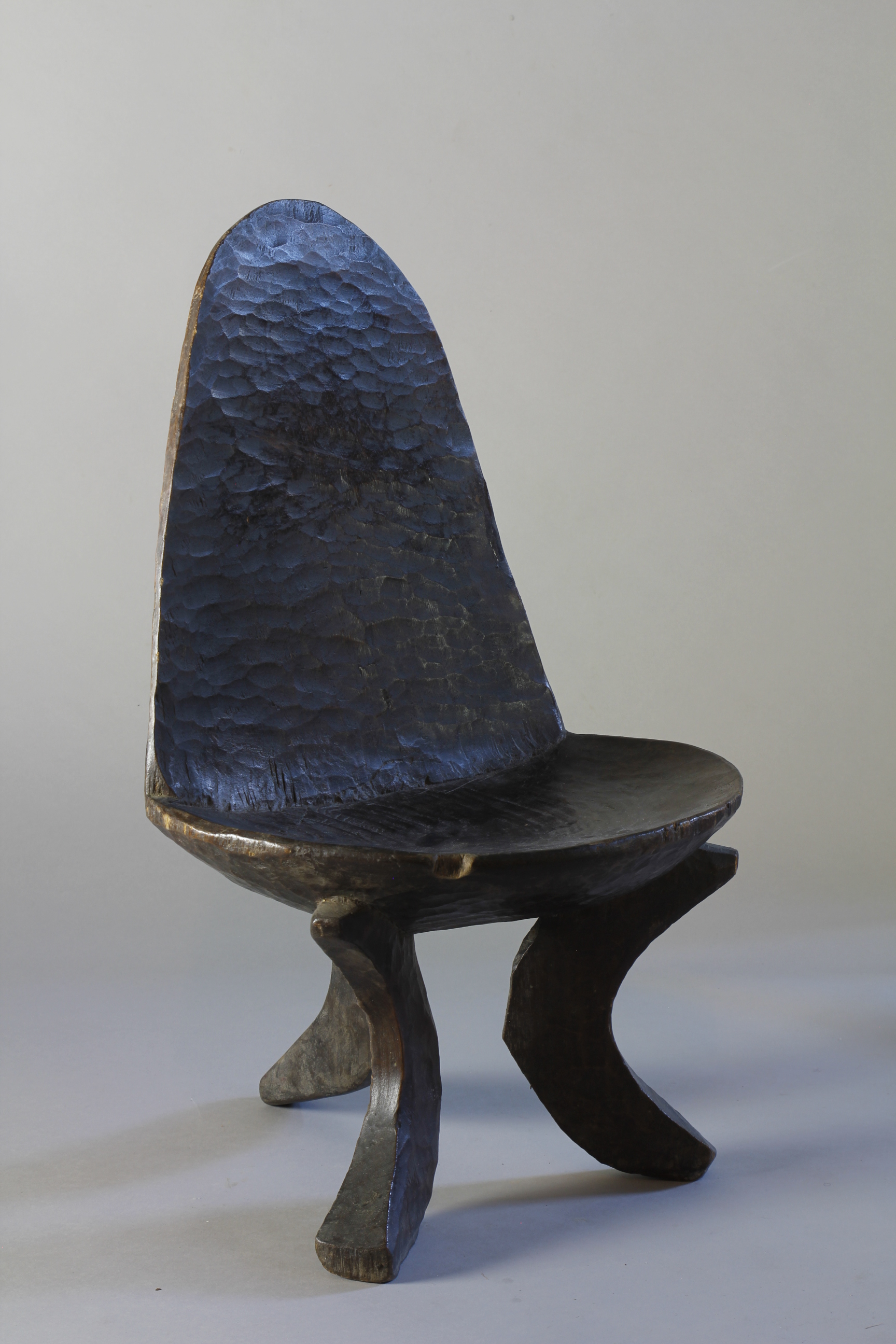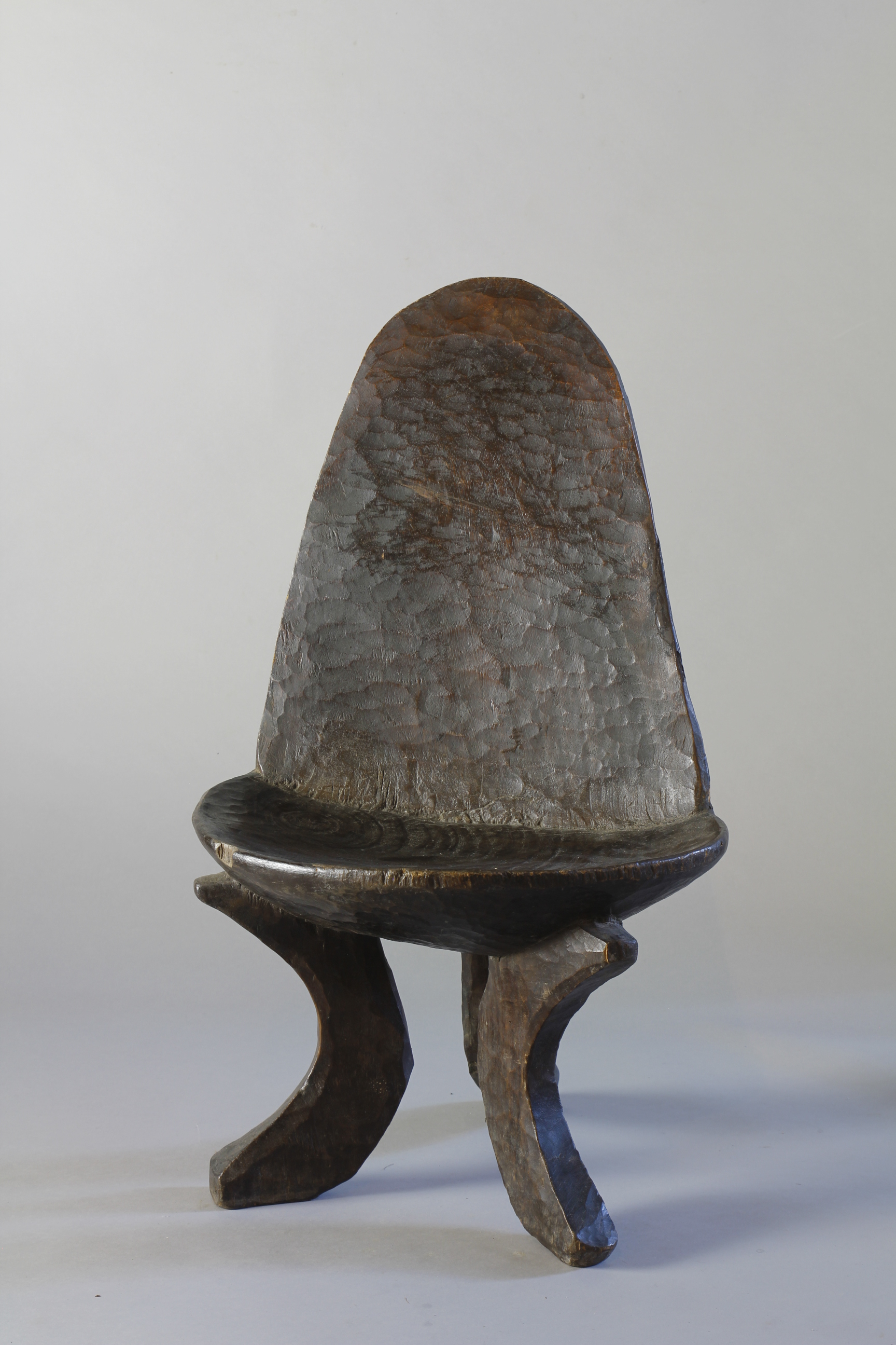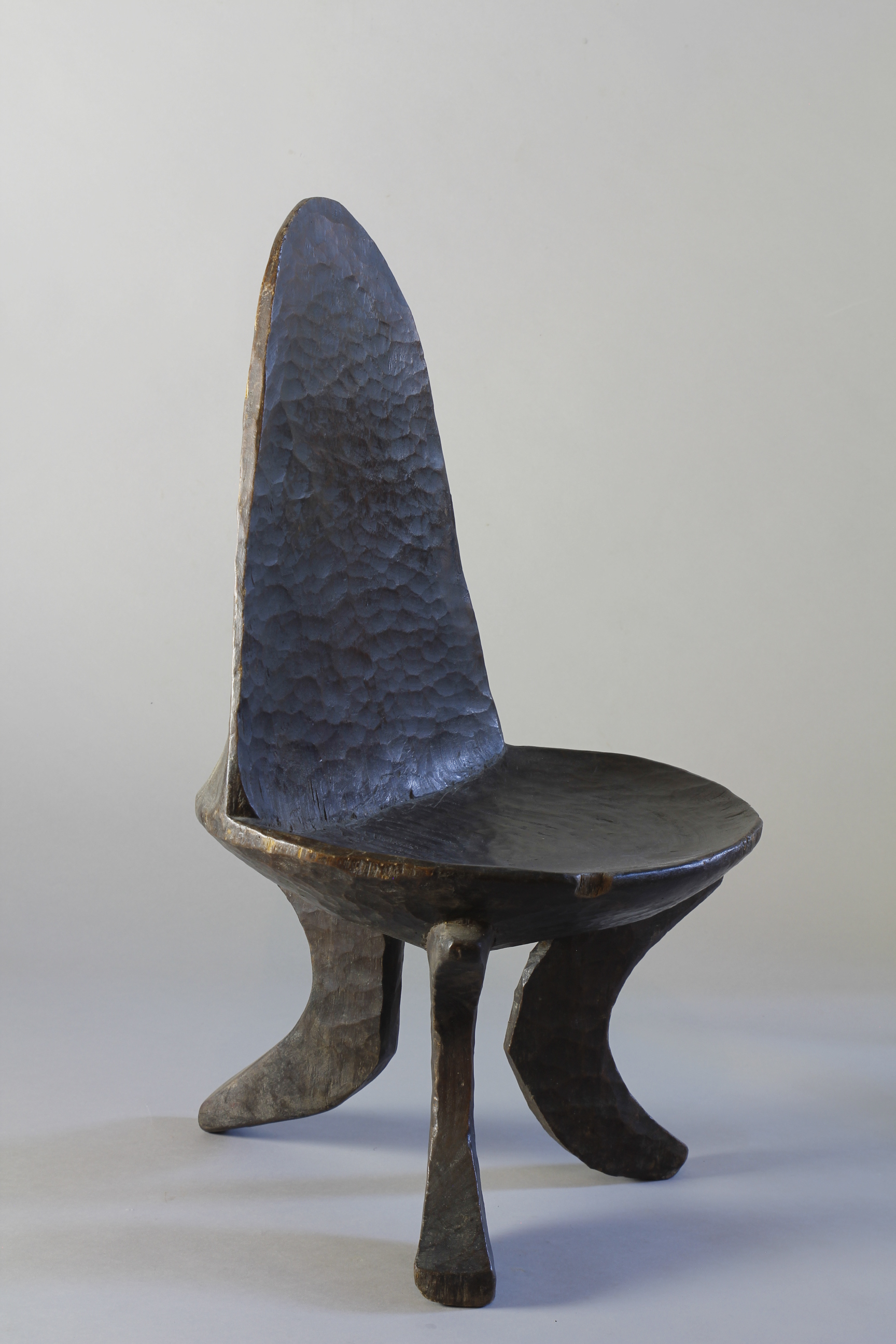 A small 19th Century high-backed Ethiopian chair showing a beautiful deep gloosy patina on its chiselled and notched back supprt. Three curved supporting legs with a wrippled patina on the seats surface.
