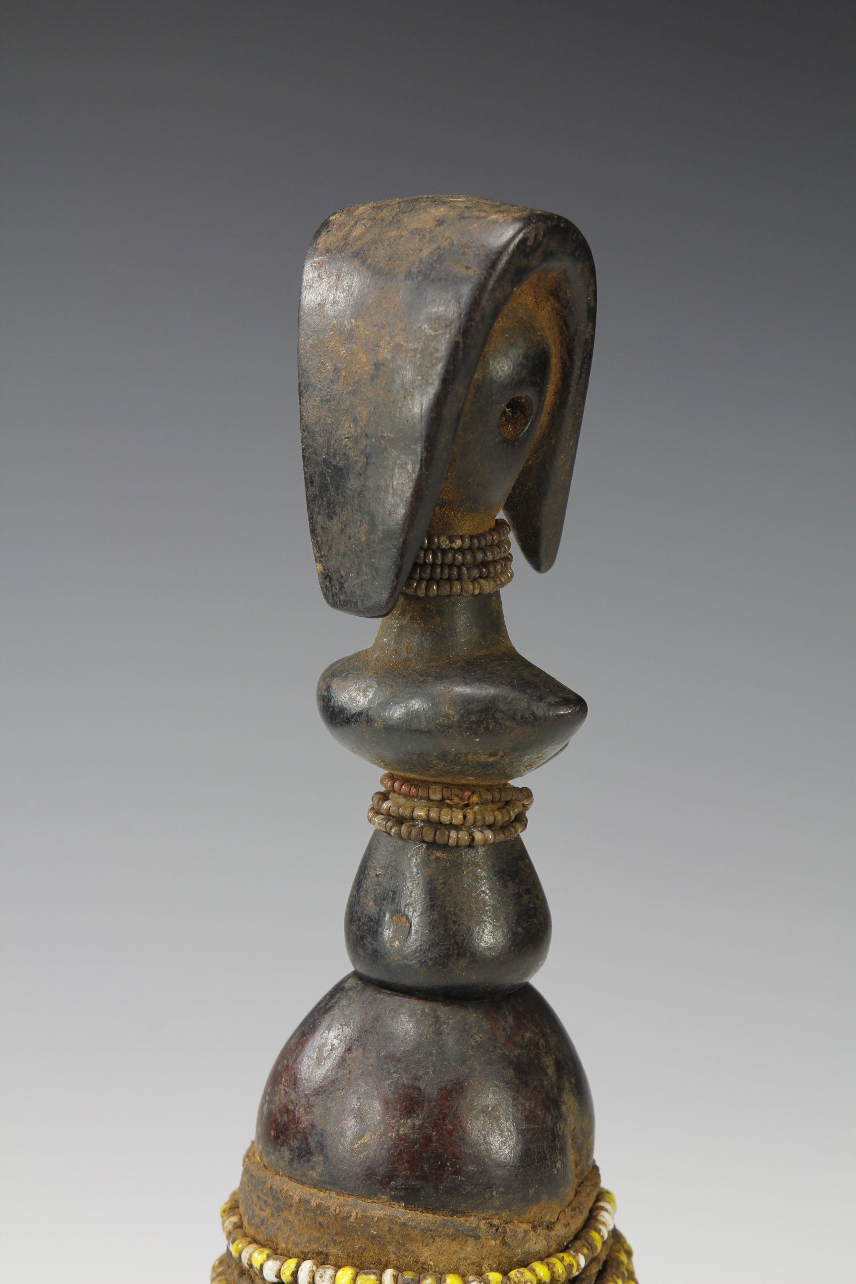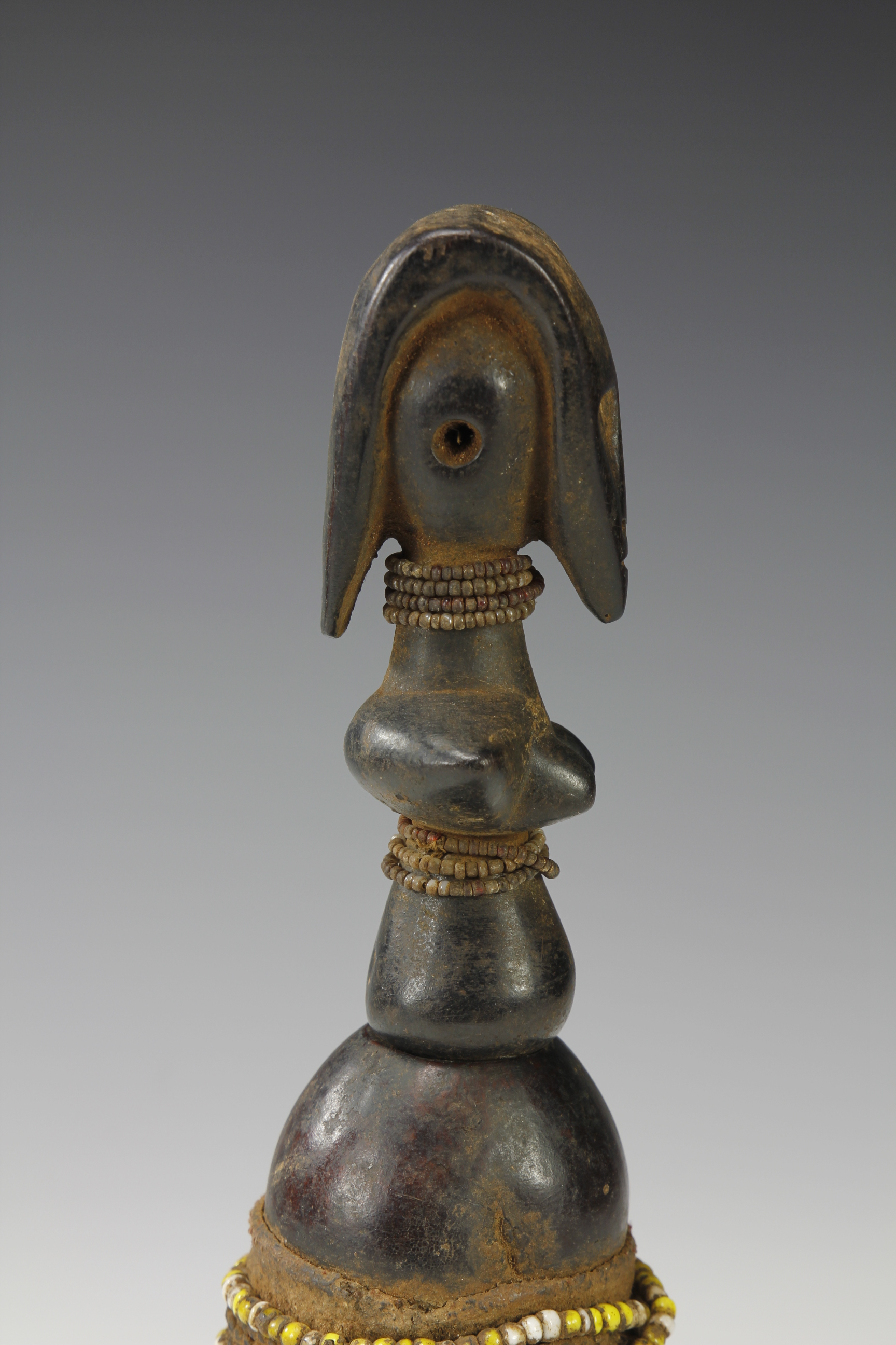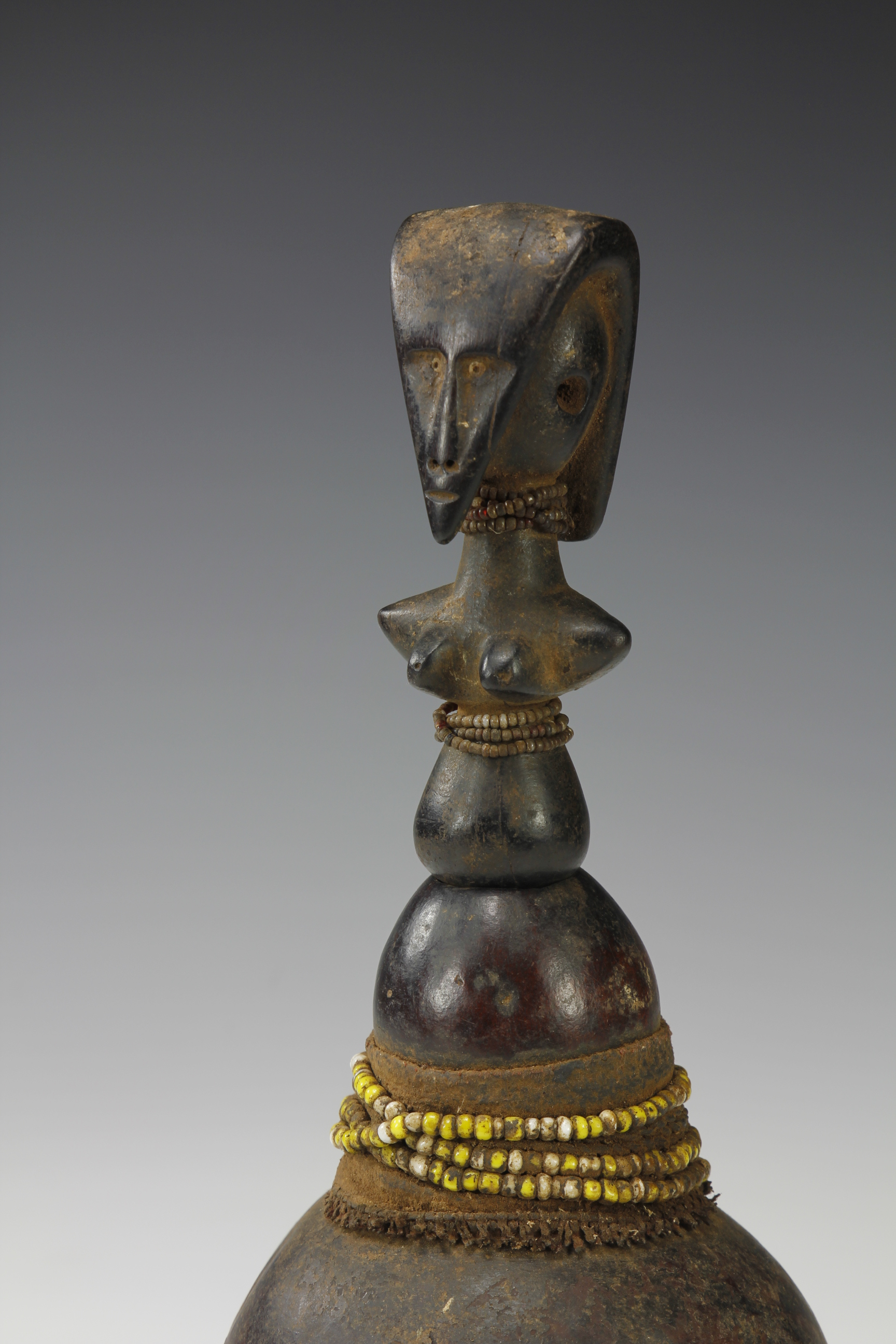The distinct feature of this traditional medicine container coming from the Kwere culture is its beautifully presented wooden stopper. Its style is unique in the way the face and the coiffure marry into one flowing form. The facial features have been finely carved with a long thin nose, pointed chin, small mouth and white beaded eyes. Old glass beads decorate is neck and midriff. The gourd container has also been decorated the old glass beads. The surface of the stopper is worn and slightly glossy in parts wear it has been handled.