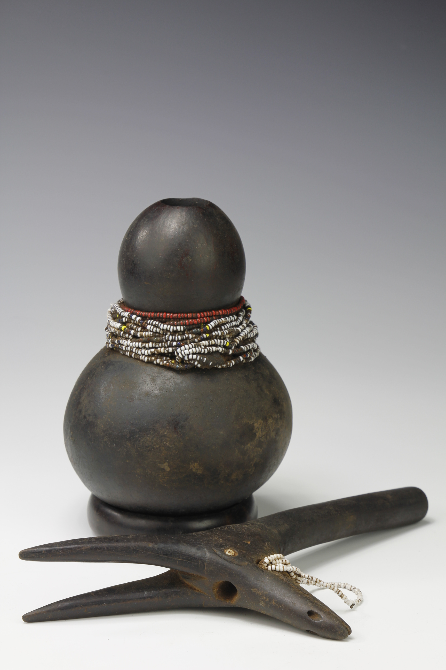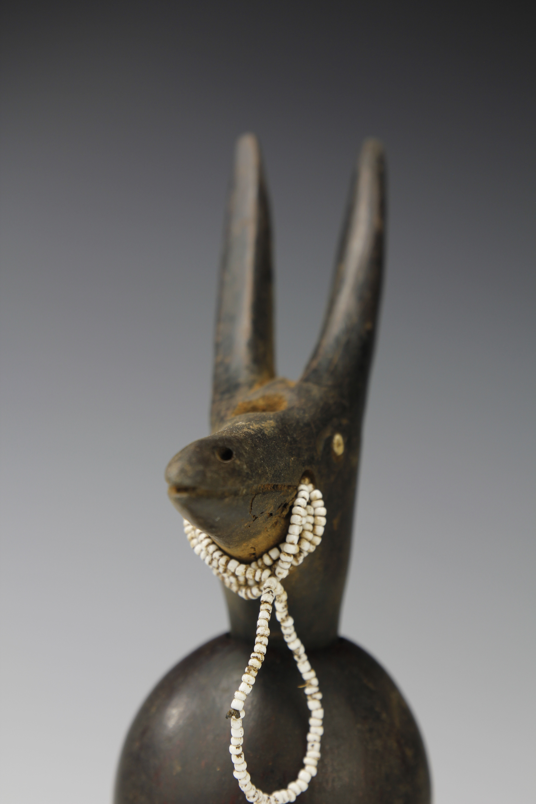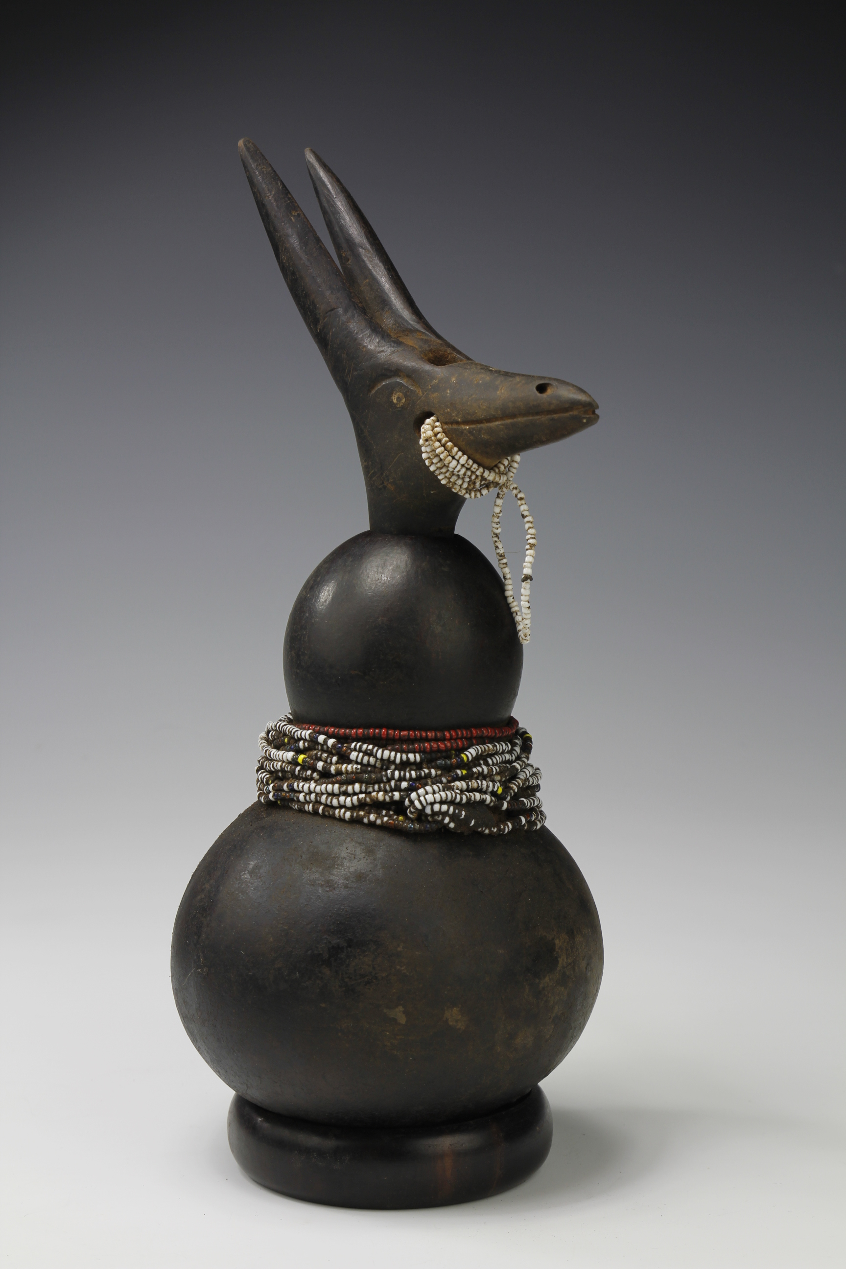 This traditional medicine container features a unusual stopper carved in the form of an animal head with two pointed ears or horns. It has a long pointed snout with strands of white glass beads attached through a hole in its mouth. To empower the container a fetish hole can be found in the animals forehead and tiny glass beads decorate its eyes. The body of the gourd container is decorated with strands of old glass beads, some are translucent. The surface is oily and encrusted. Such pieces were kept by the traditional healer and used during healing rituals.