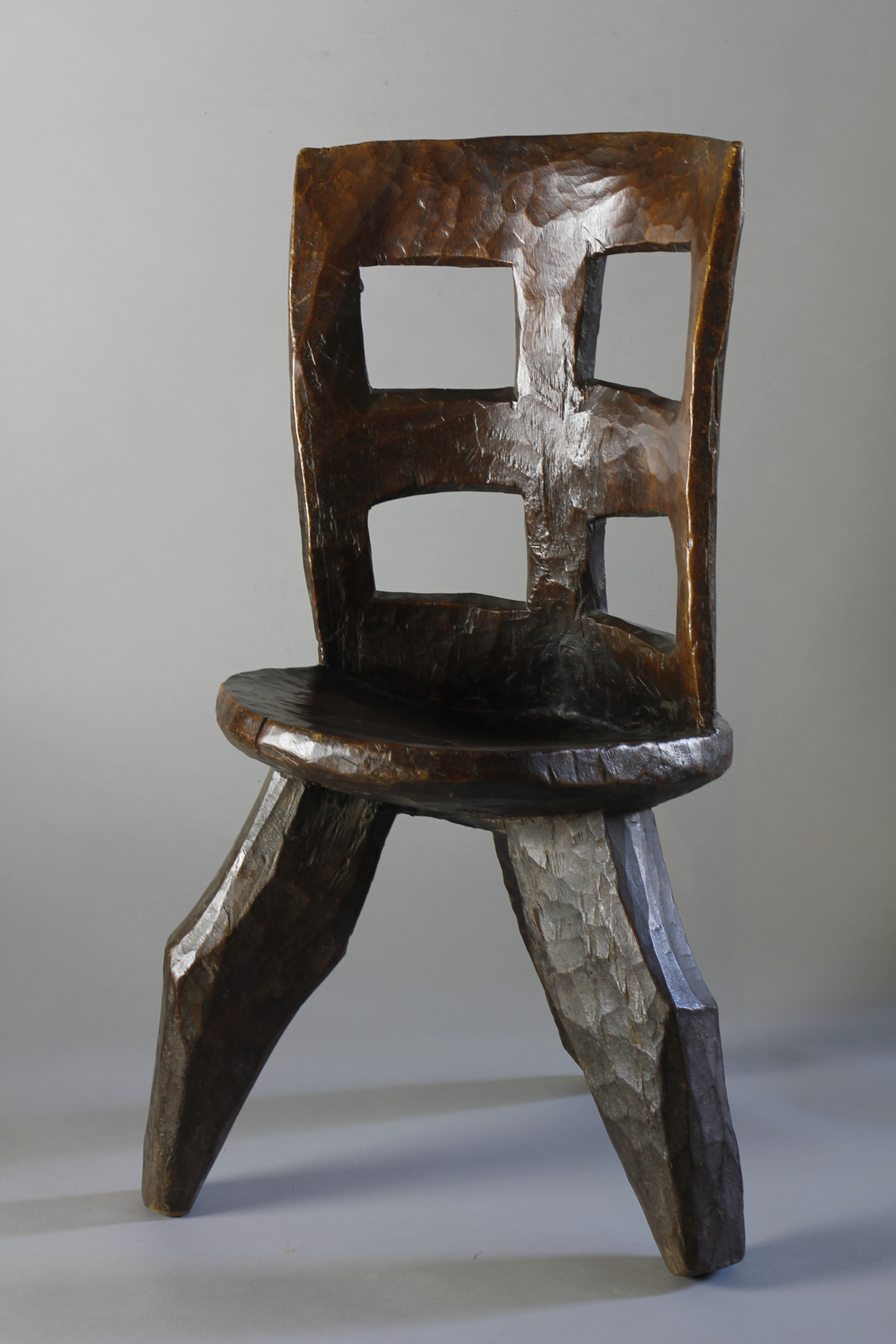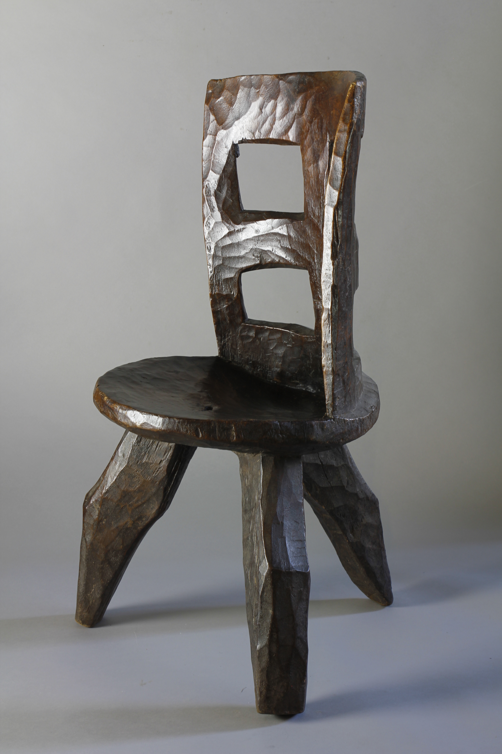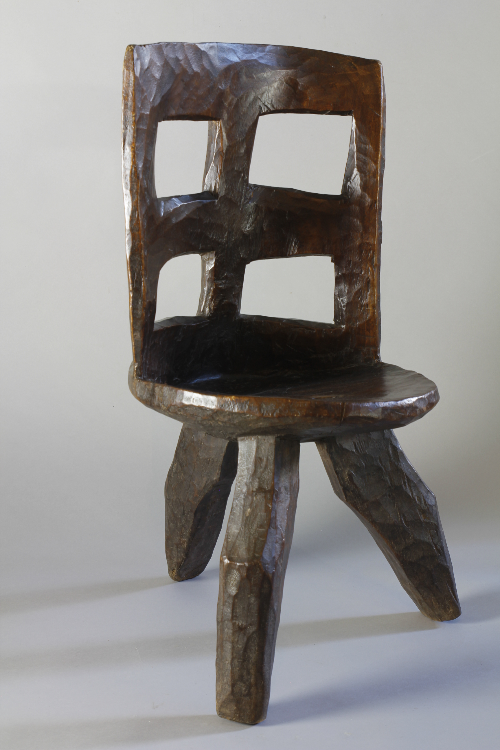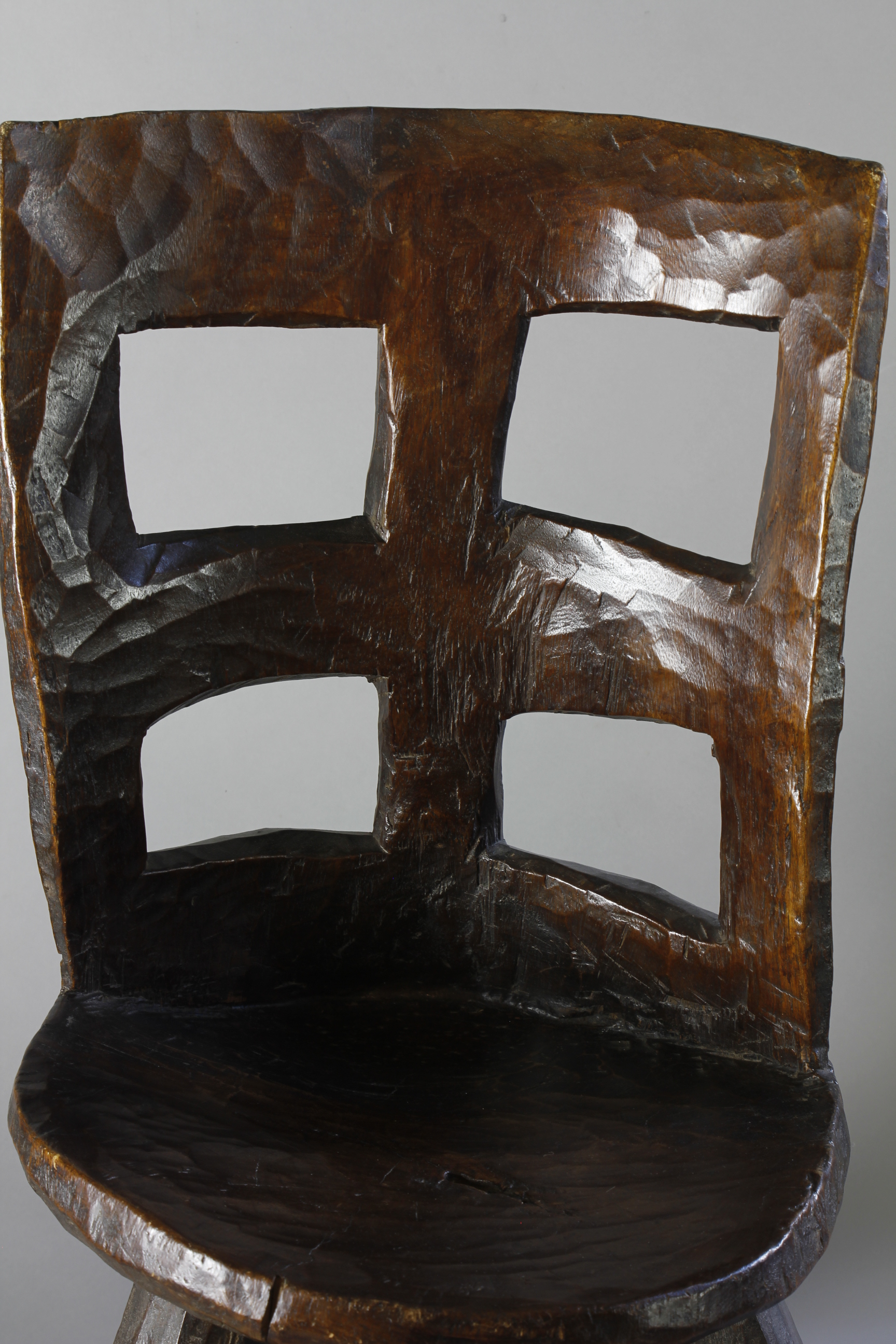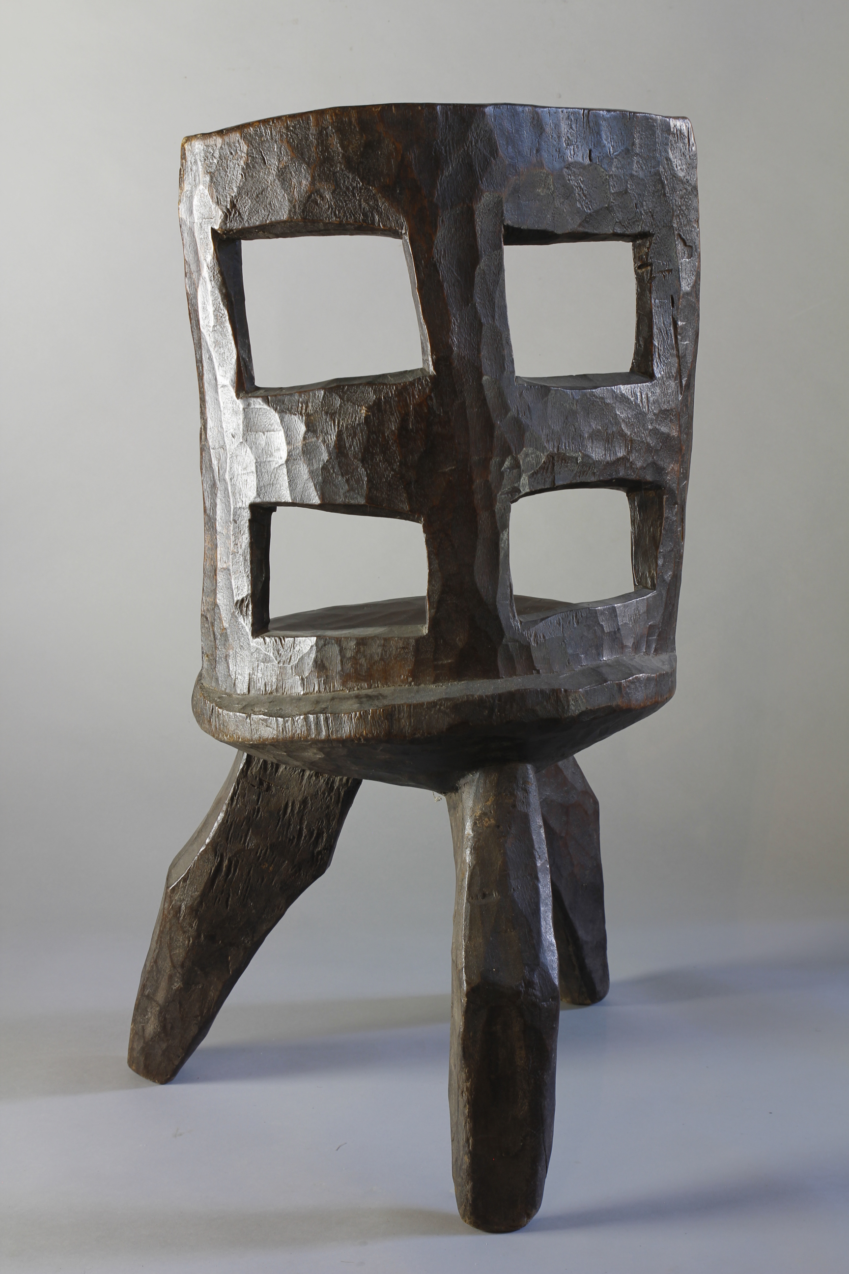 This nineteenth-century Ethiopian chair exhibits an unusual form, with a cut-out design of four rectangles featured on the curved, enveloping backrest. Over time, the surface of the chair has developed a wonderful deep, lusty patina.