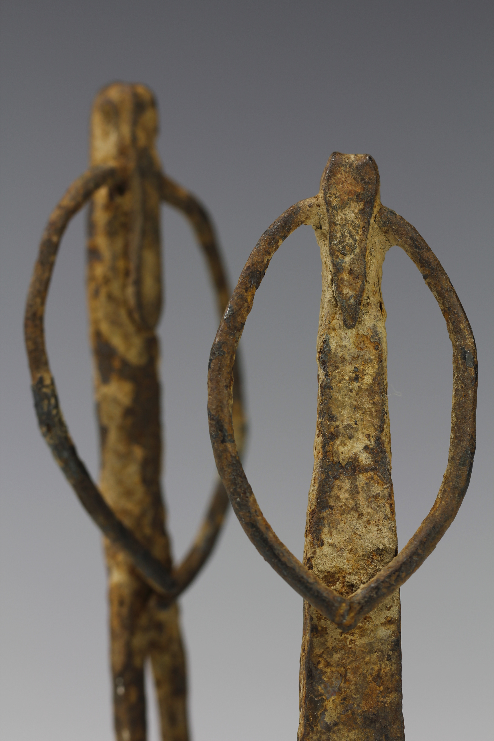 A pair of small finely forged Gan or Lobi iron figures each with a deep encrusted surface.