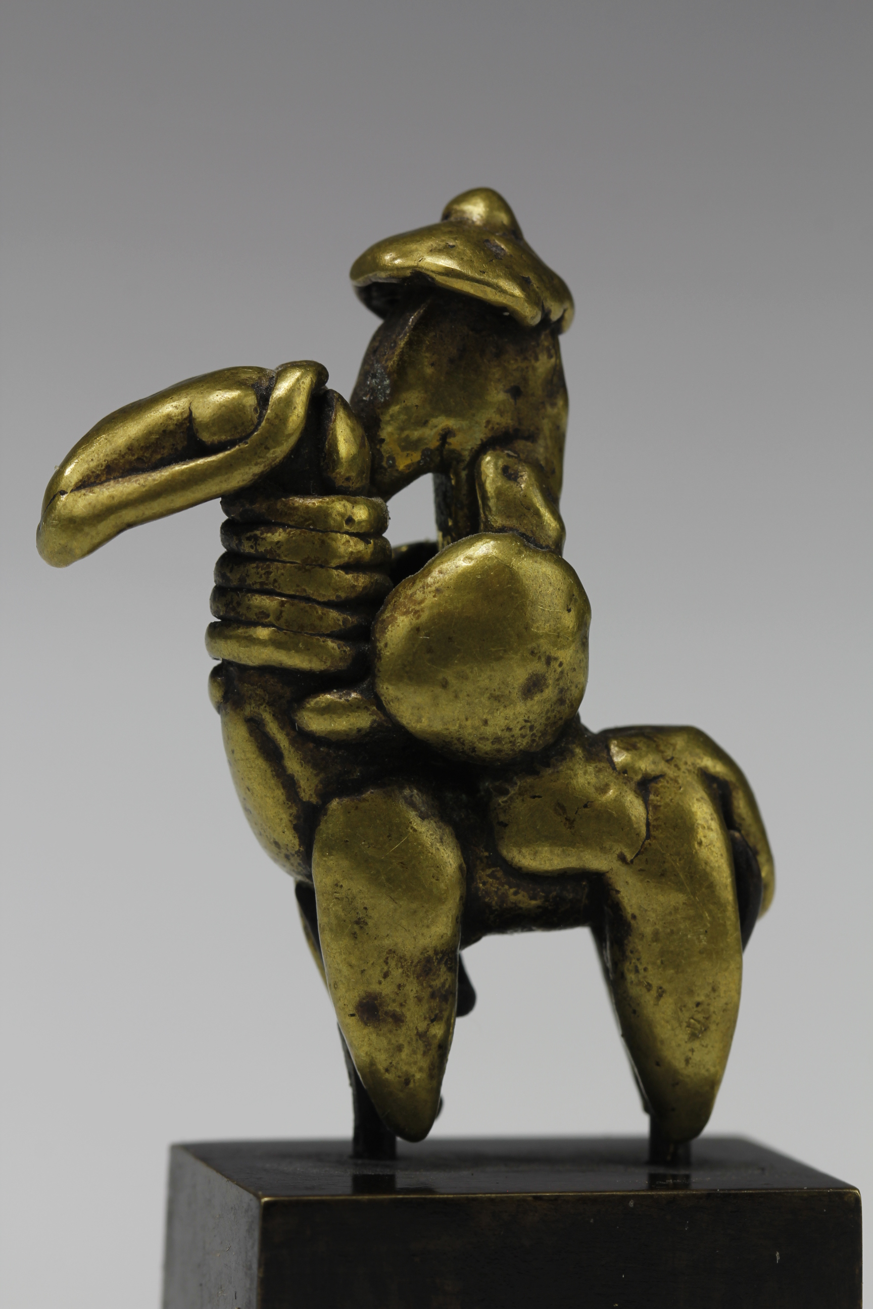 A wonderful cast miniature bronze caricature of a horse and rider. Such pieces termed (Putchu Guinadji), sometimes found wrapped, stitched and encased in leather, had a traditional function acting as a protective charm from harmful spirits. The casting represents a Kotoko rider, sitting proudly upright on his horse, wearing a traditional hat and holding round shields in both arms. The image of the horse and rider recalls a broader history of mounted warfare and exchange throughout the greater Sahel Region of West Africa.