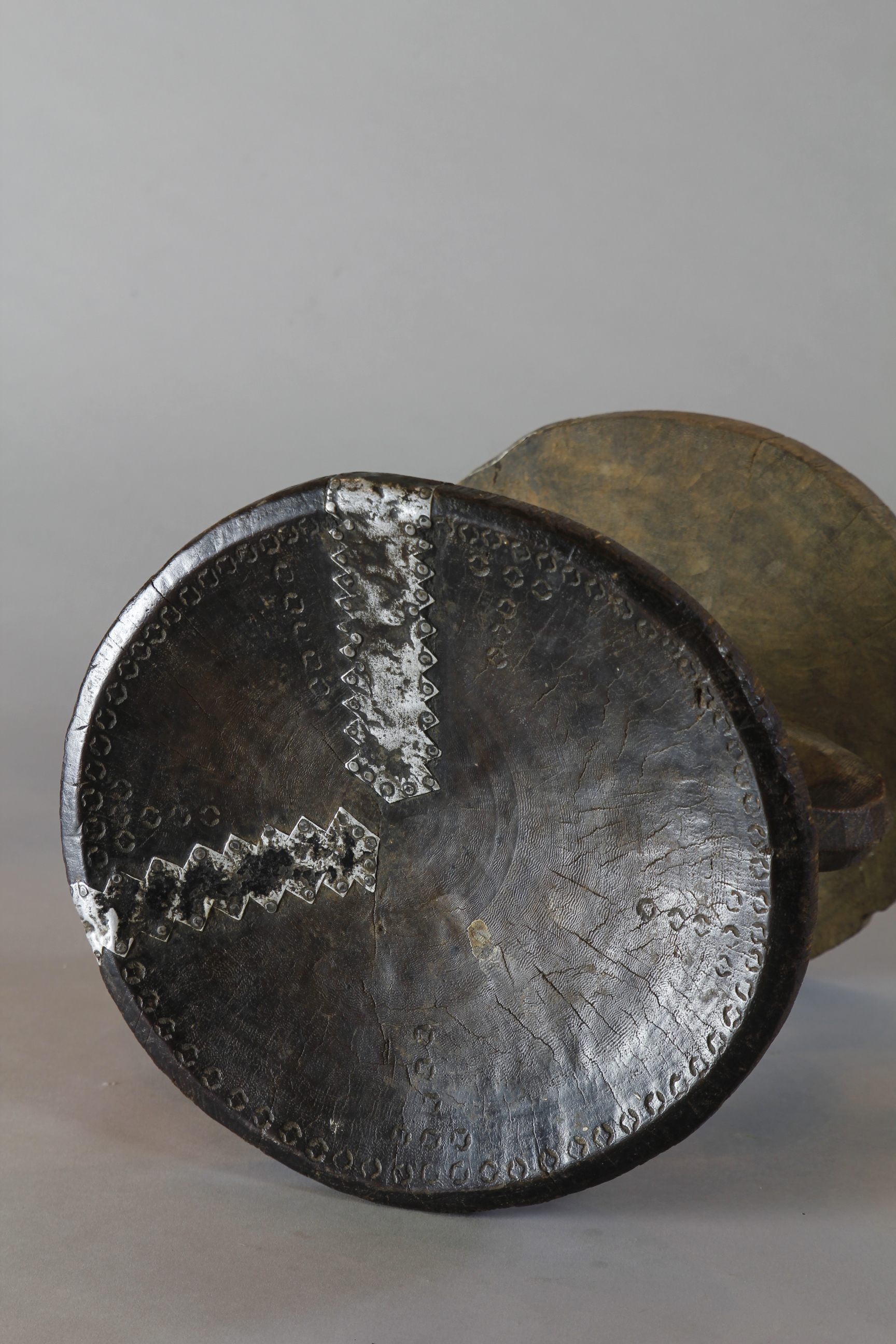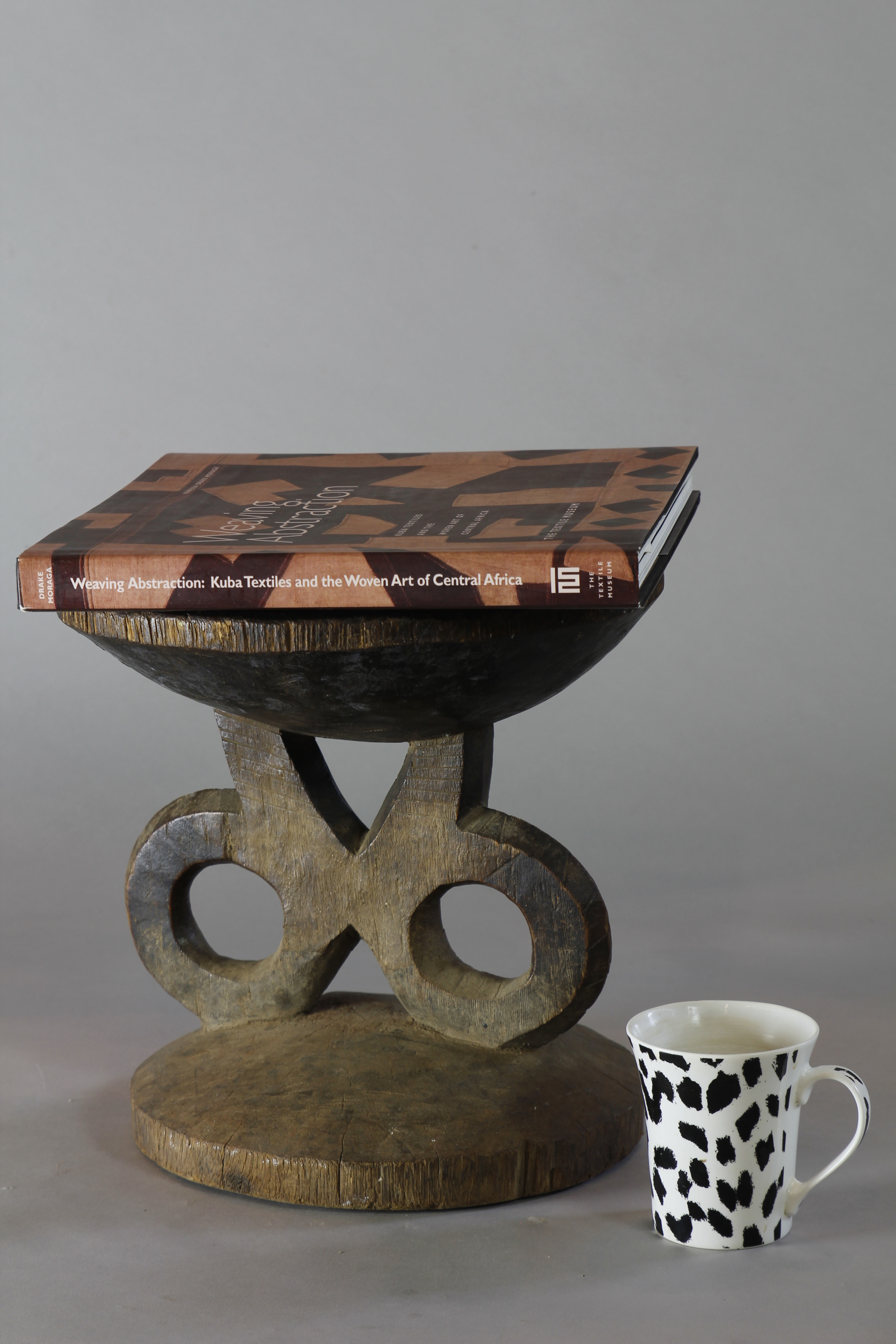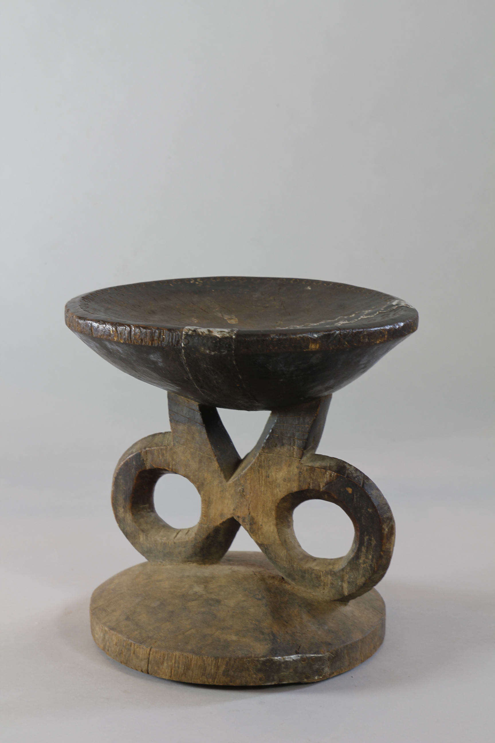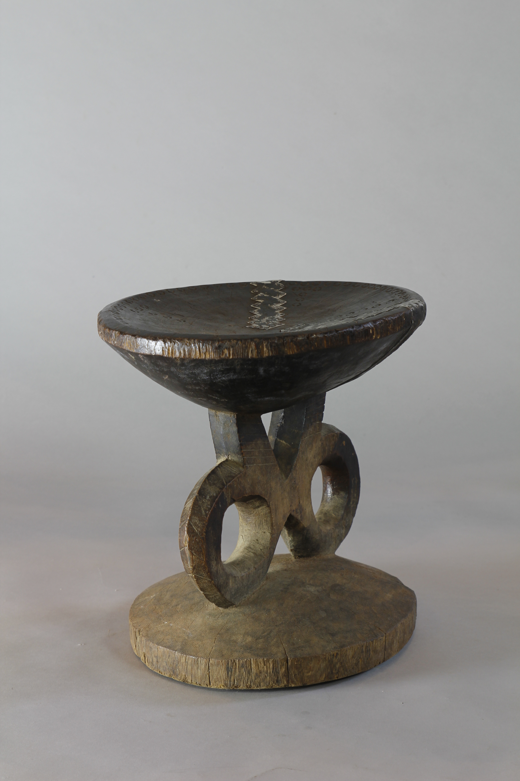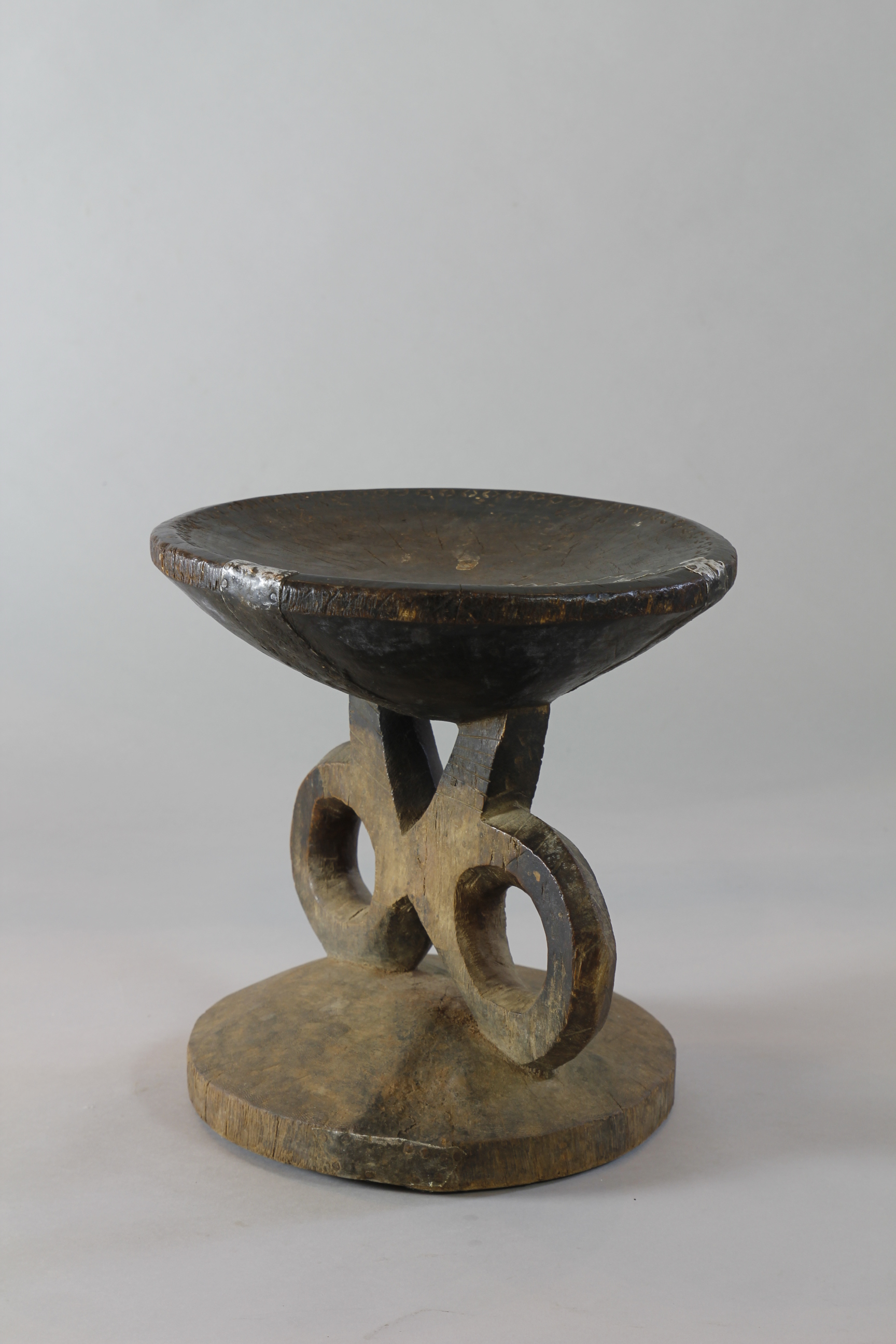 Tanzanian village stool with handles in an unusual double-circular formation. Traditional metal restorations to the seat as shown.