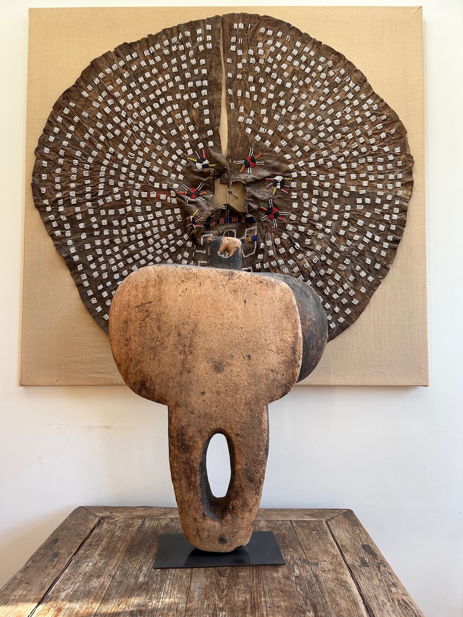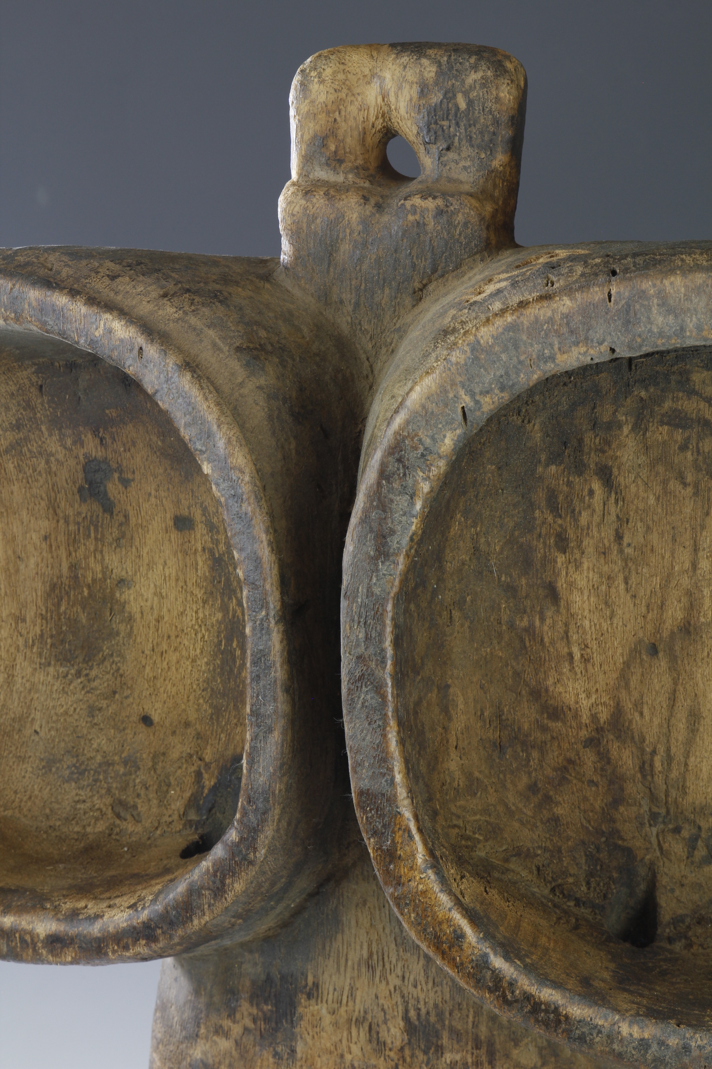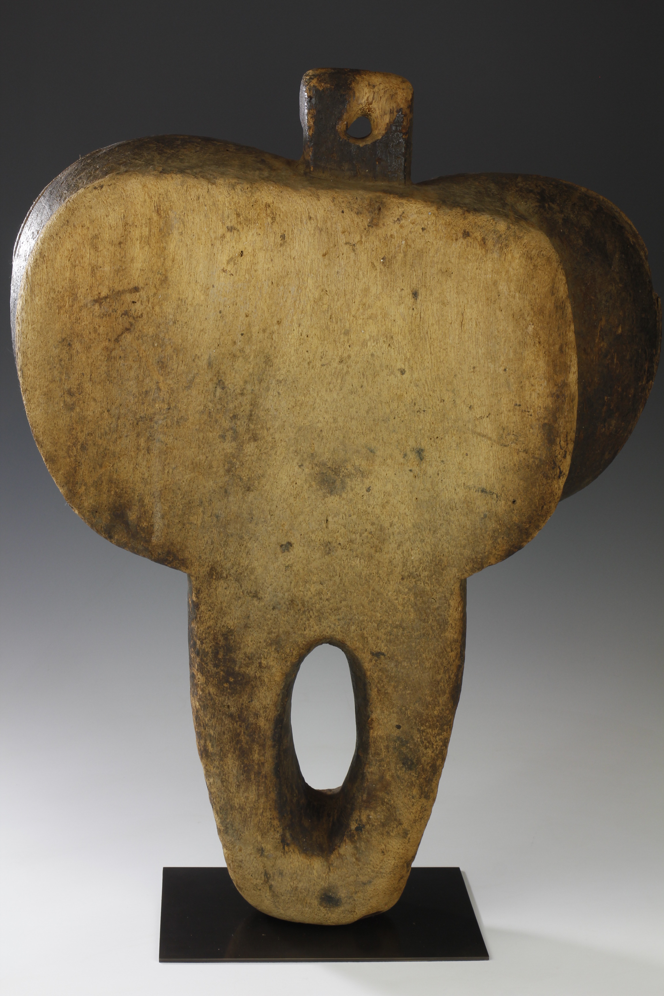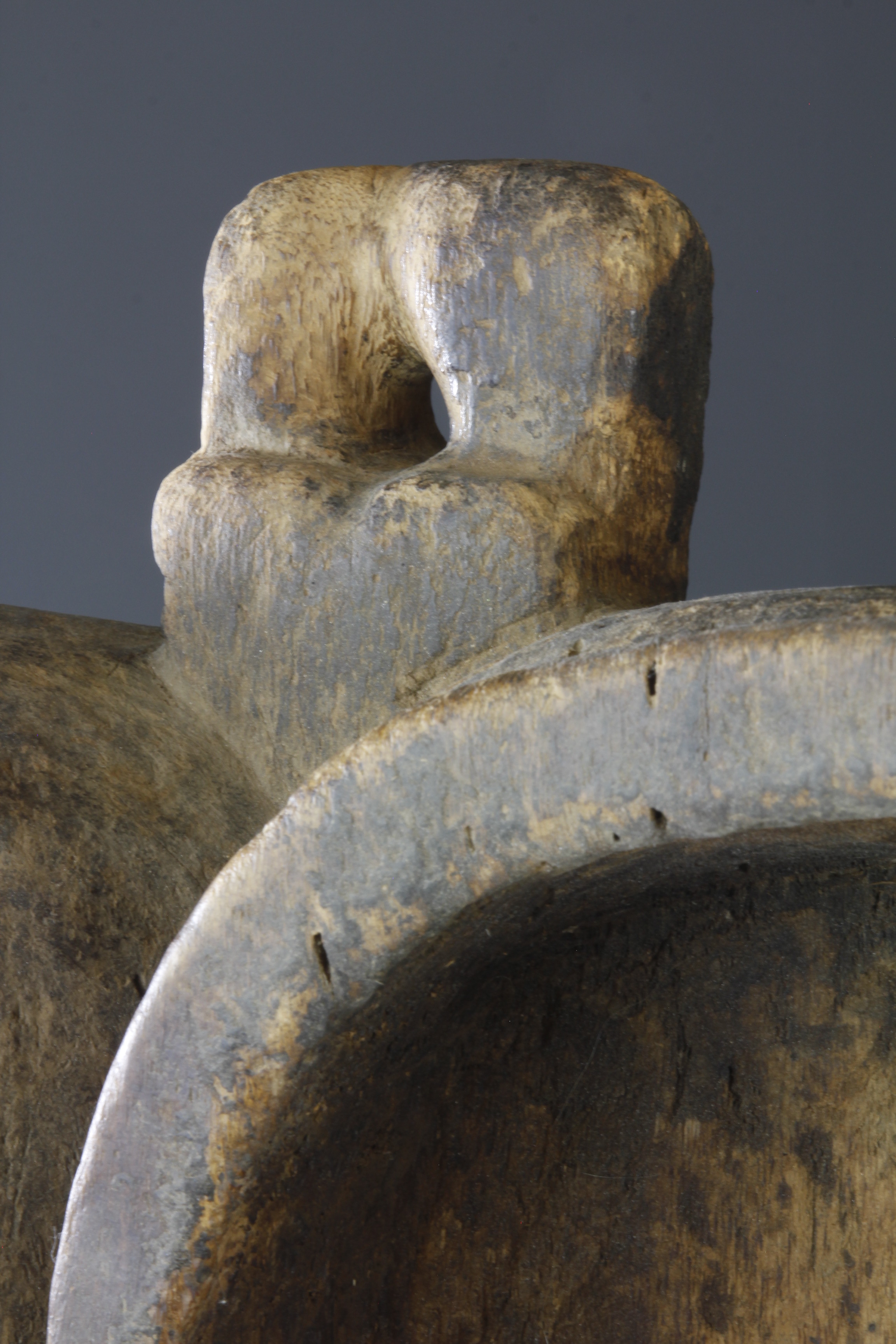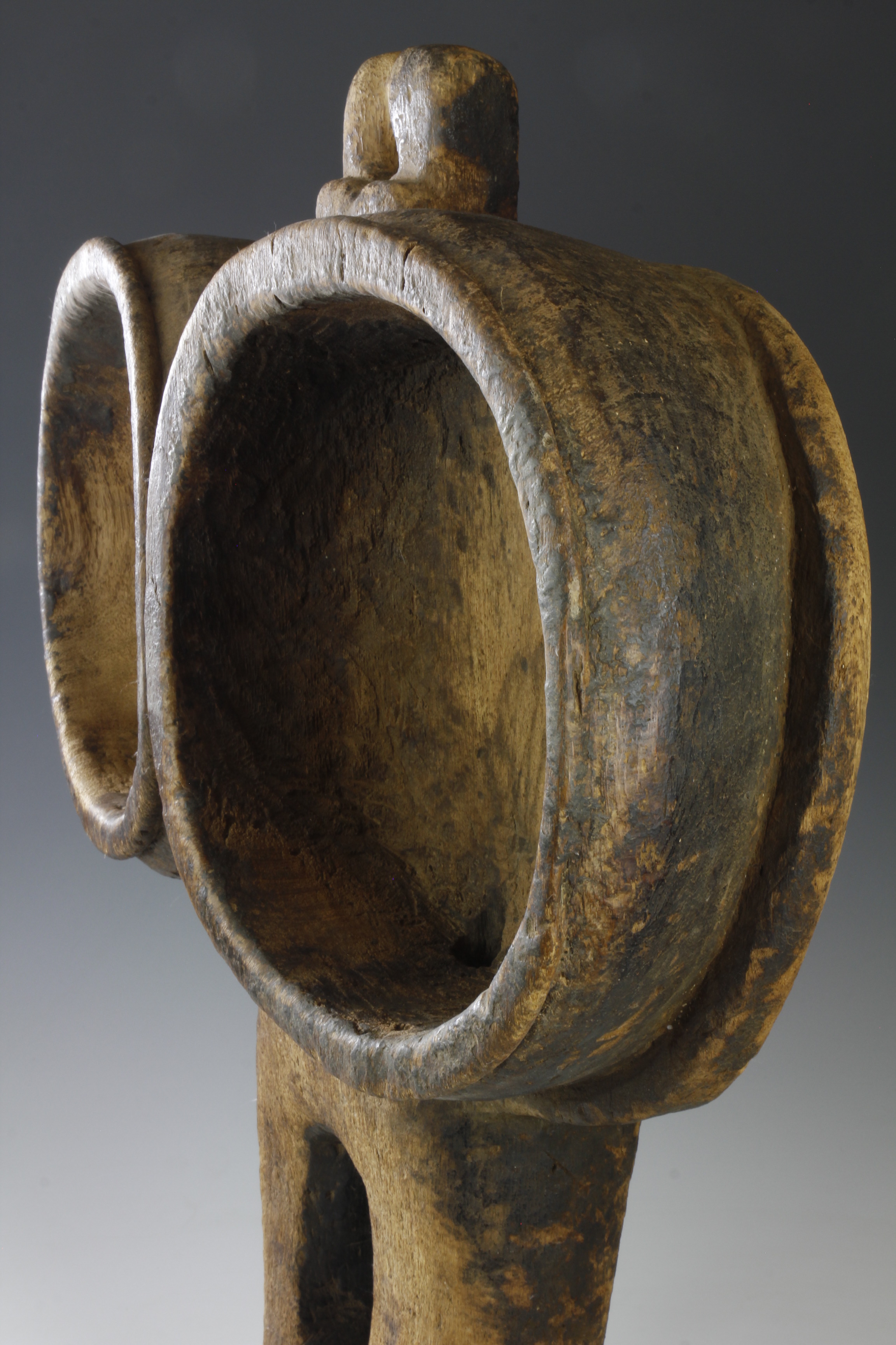 These old Songye or Luba bellows have a fantastic form and presence. Whether deliberate or otherwise, they exhibit a wonderful interplay between abstract shape and human form. The surface, weather and worn, is a testament to its long life of traditional use.