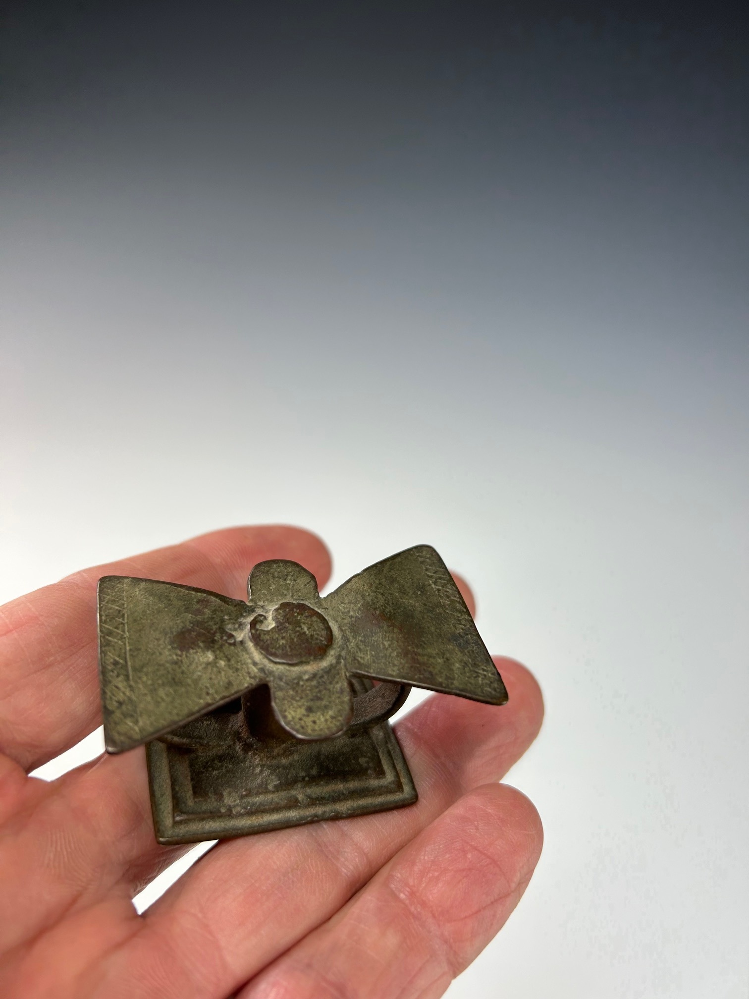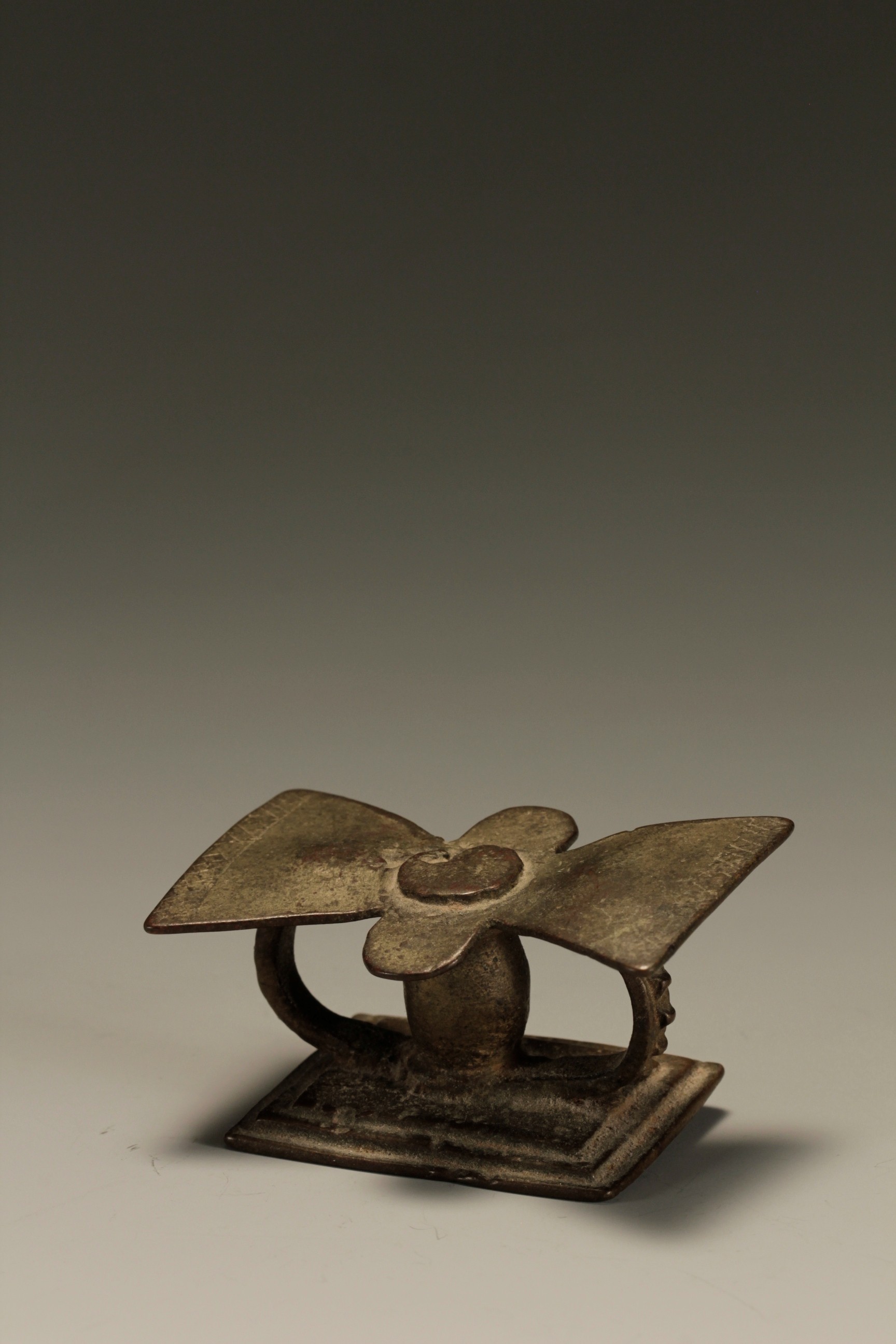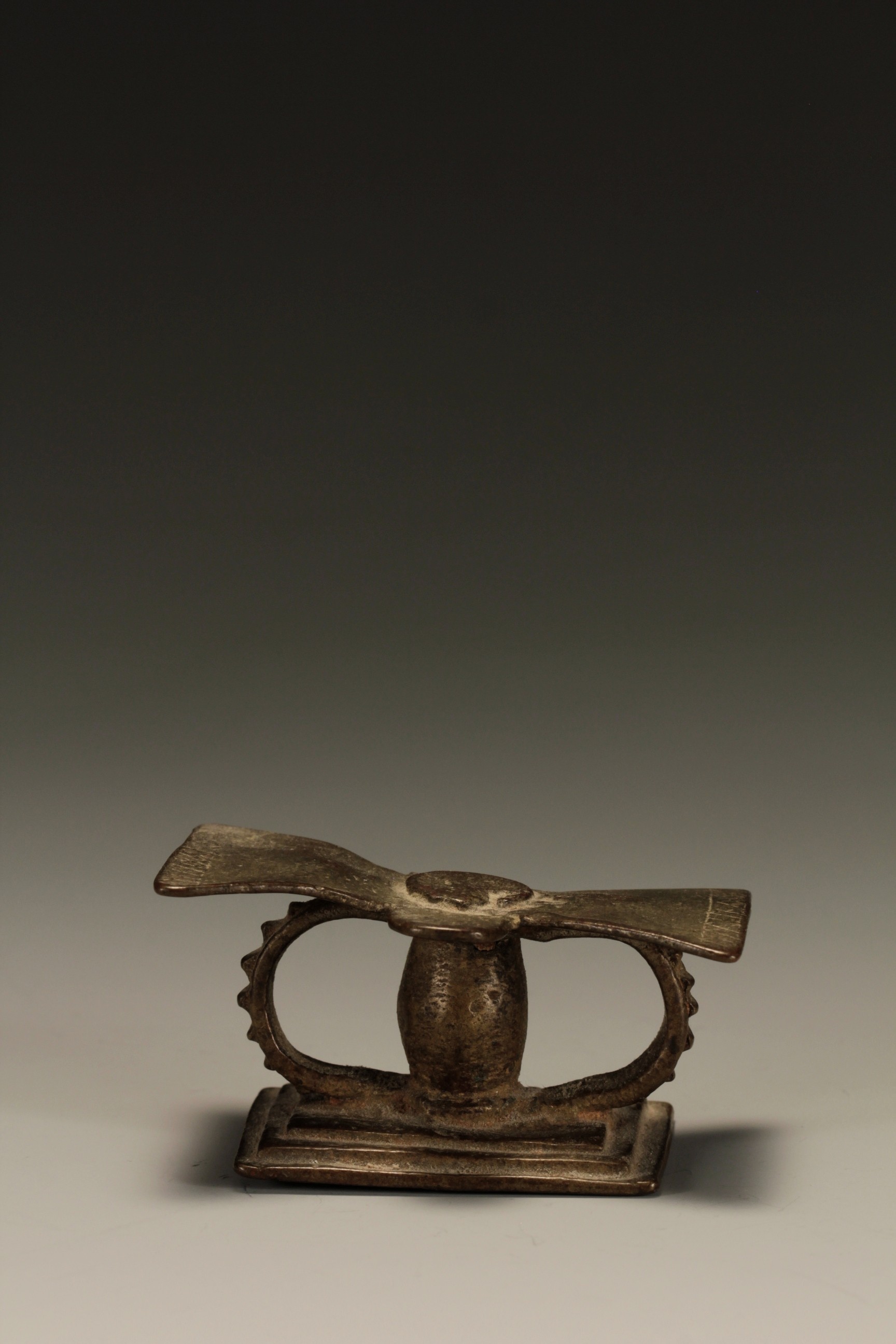 A fine early example,likely 18th Century, Akan bronze gold weight of a royal stool on a pyrmid styled base.