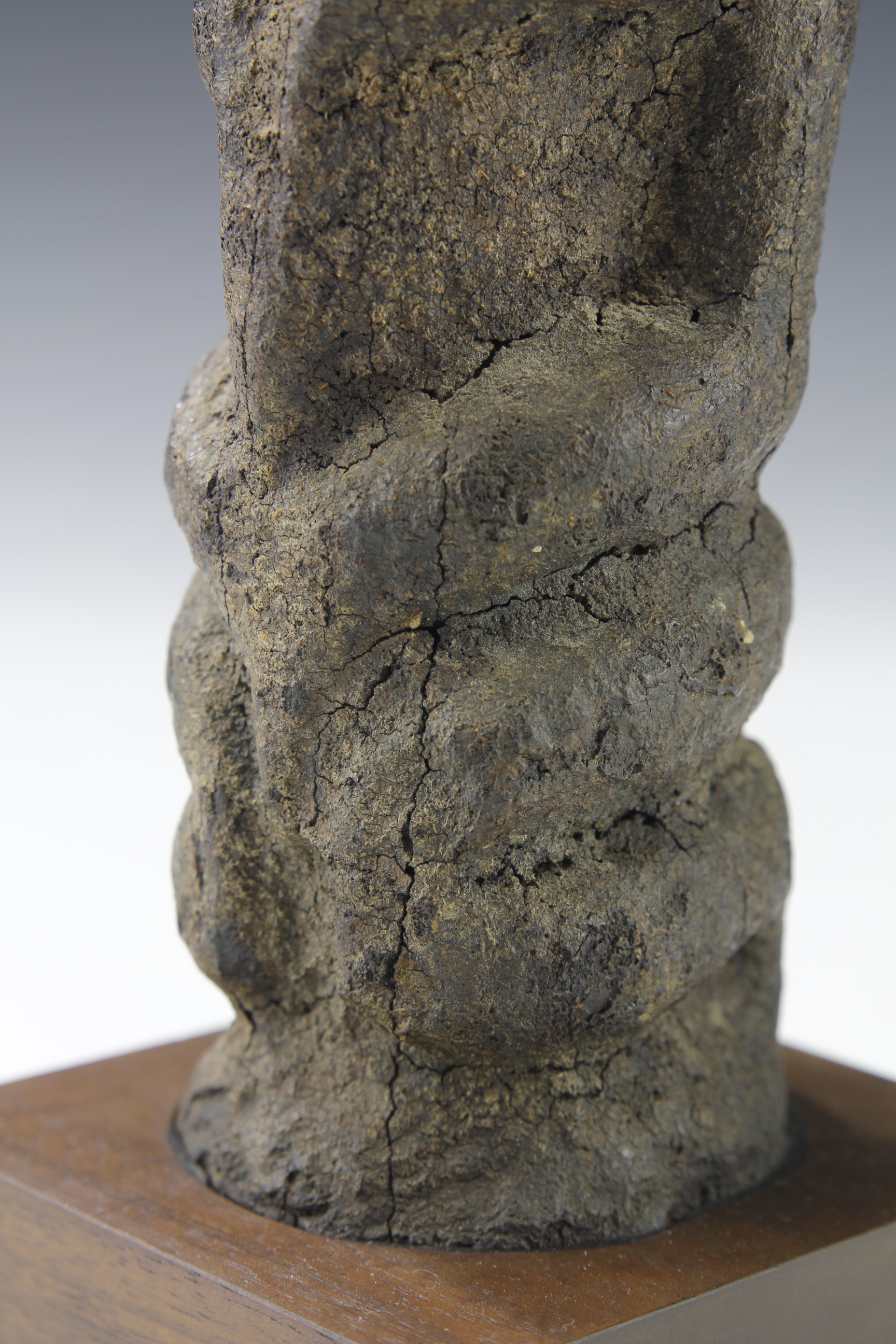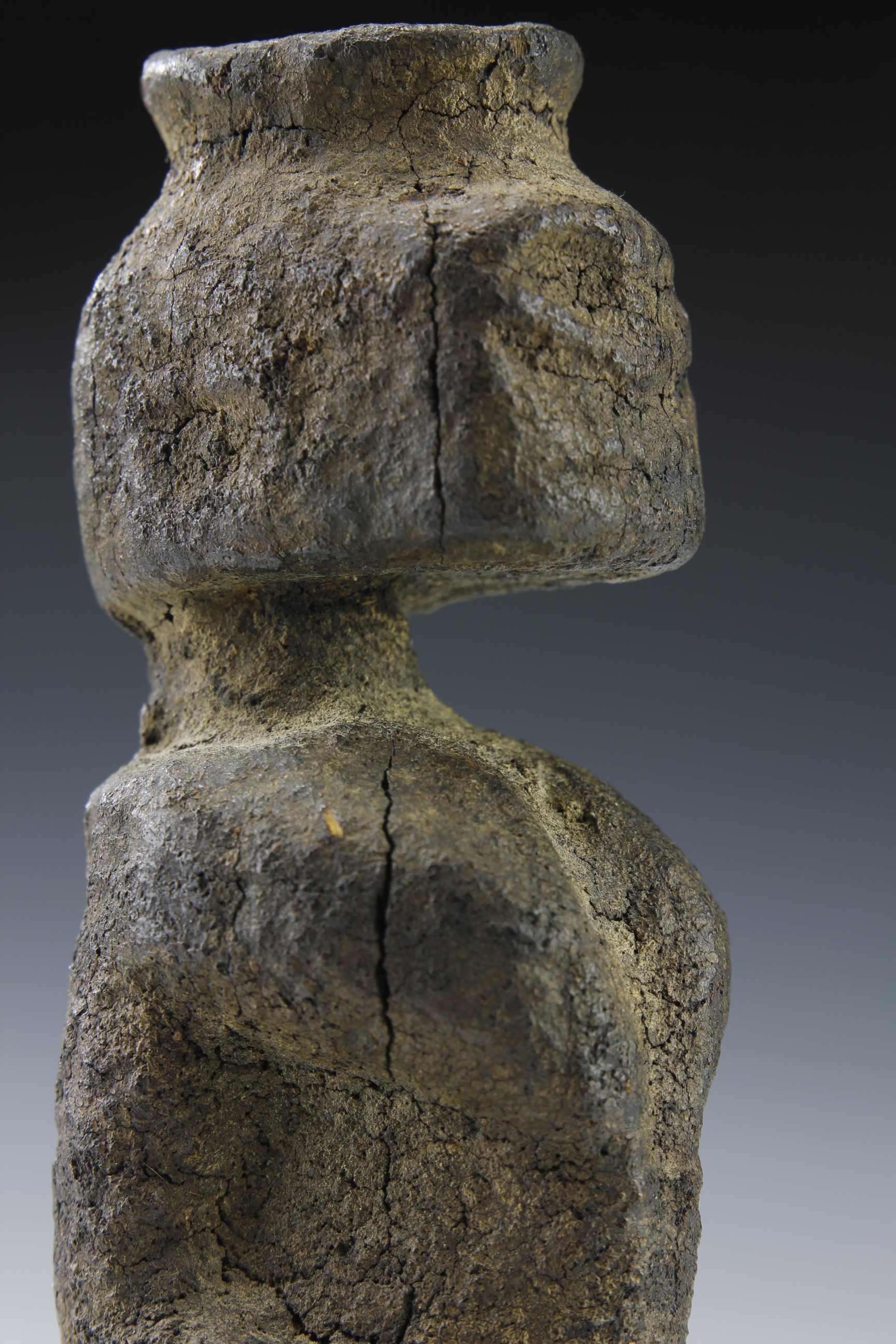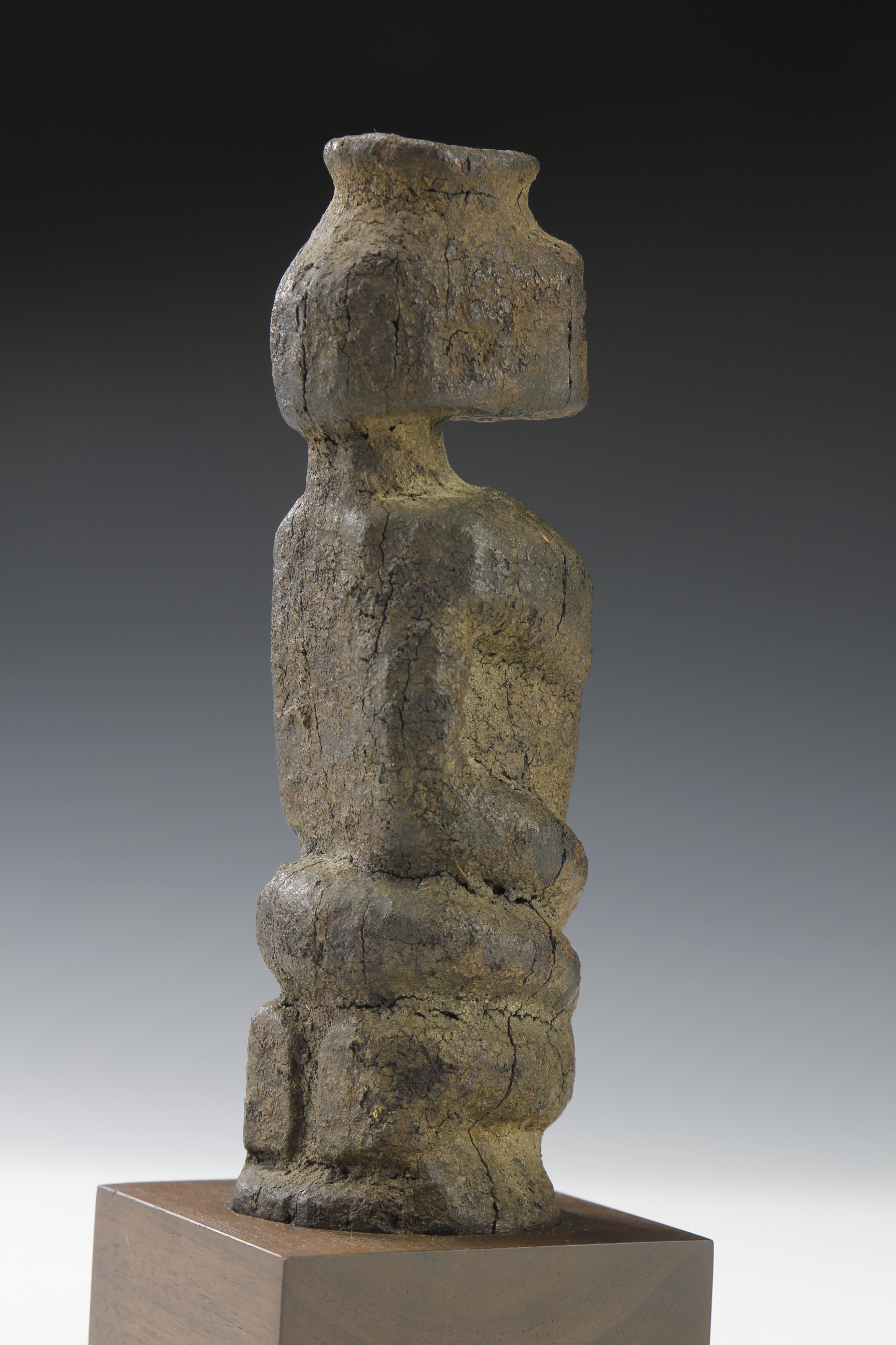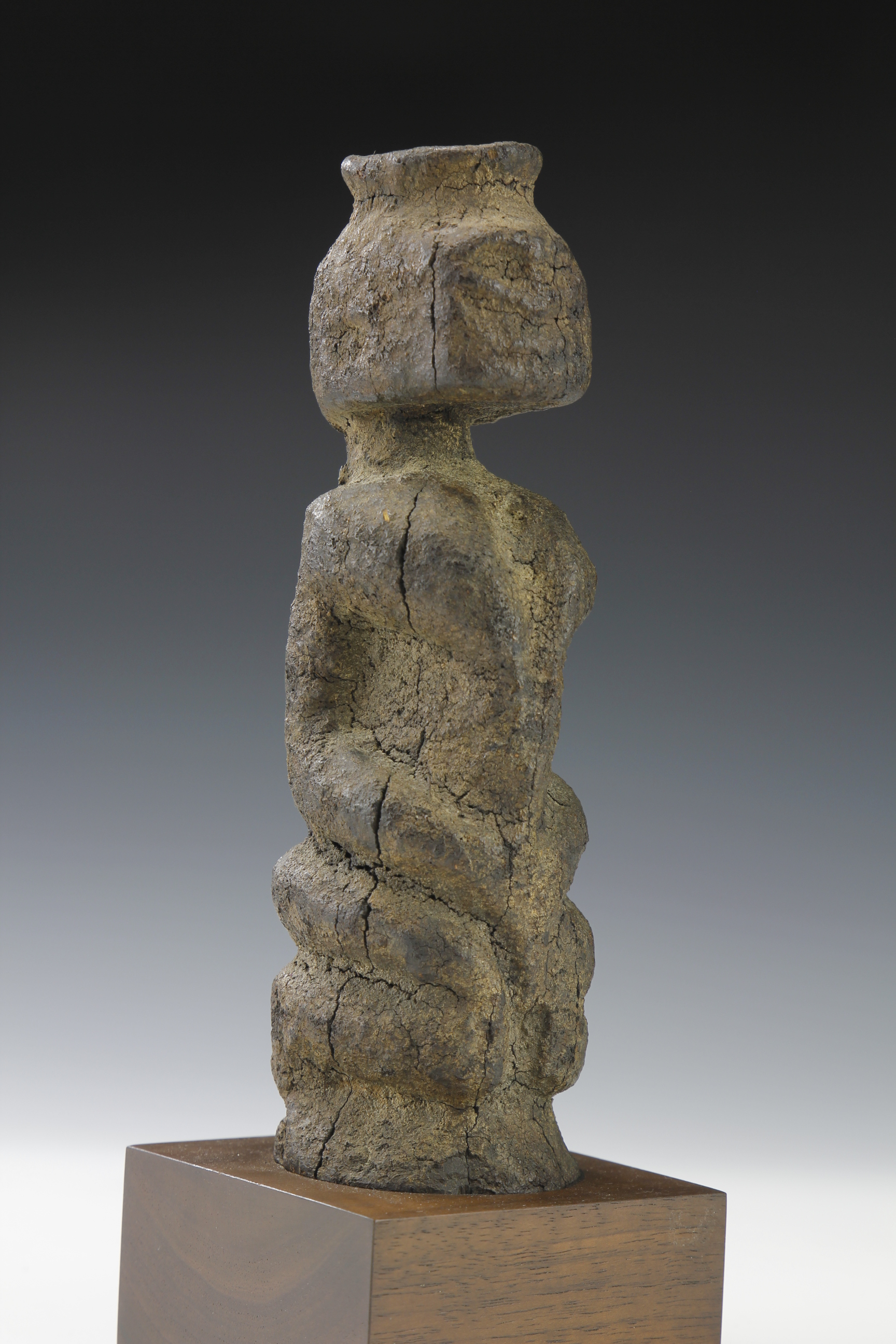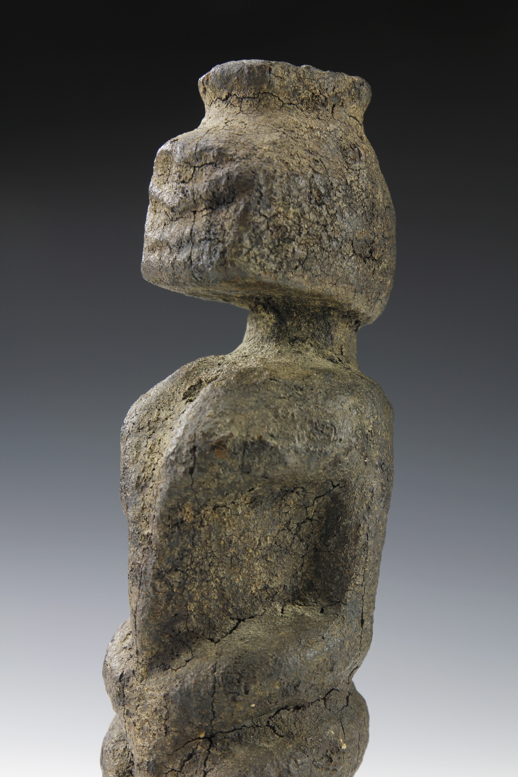 This early Dogon figure has a great sense of presence with a wonderful encrusted surface patina. It shows a female figure in a kneeling position, her back is upright, she rests her arms on her stomach, her head is slightly turned upwards. The surface patina is thick and encrusted.