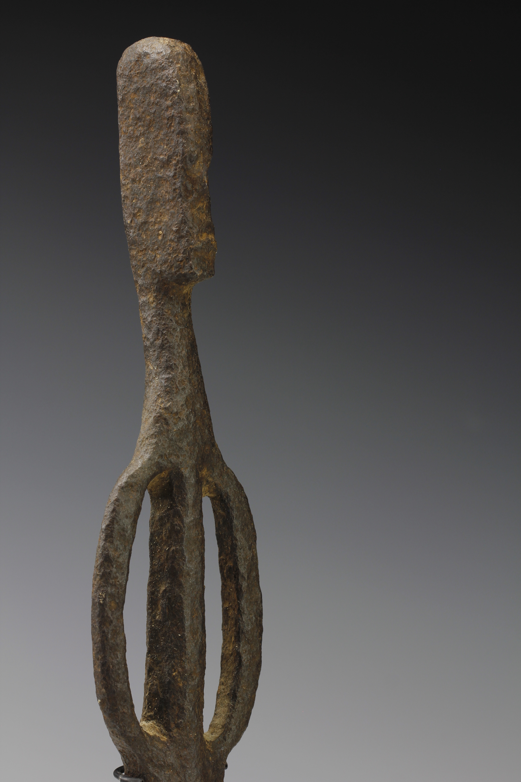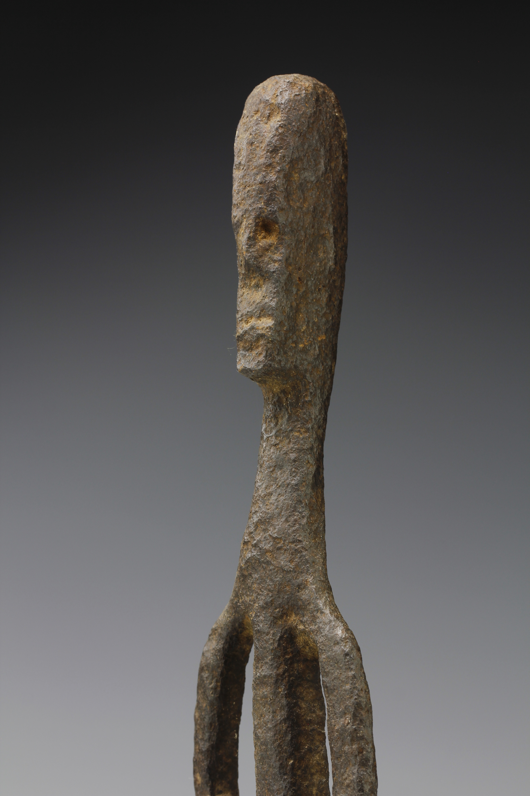 An early forged Dogon iron figure with a deep encrusted patina, likely used as a fetish figure.