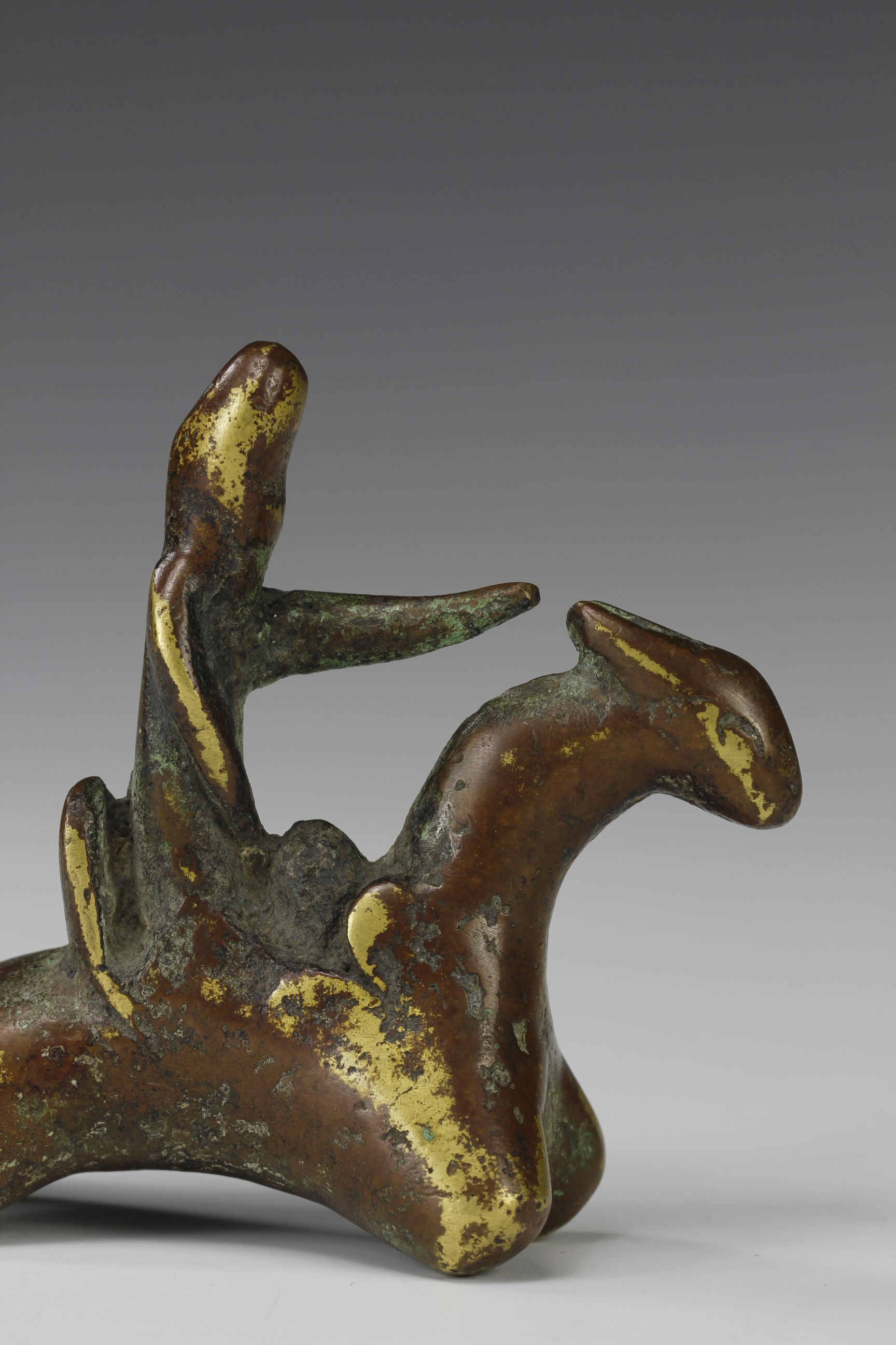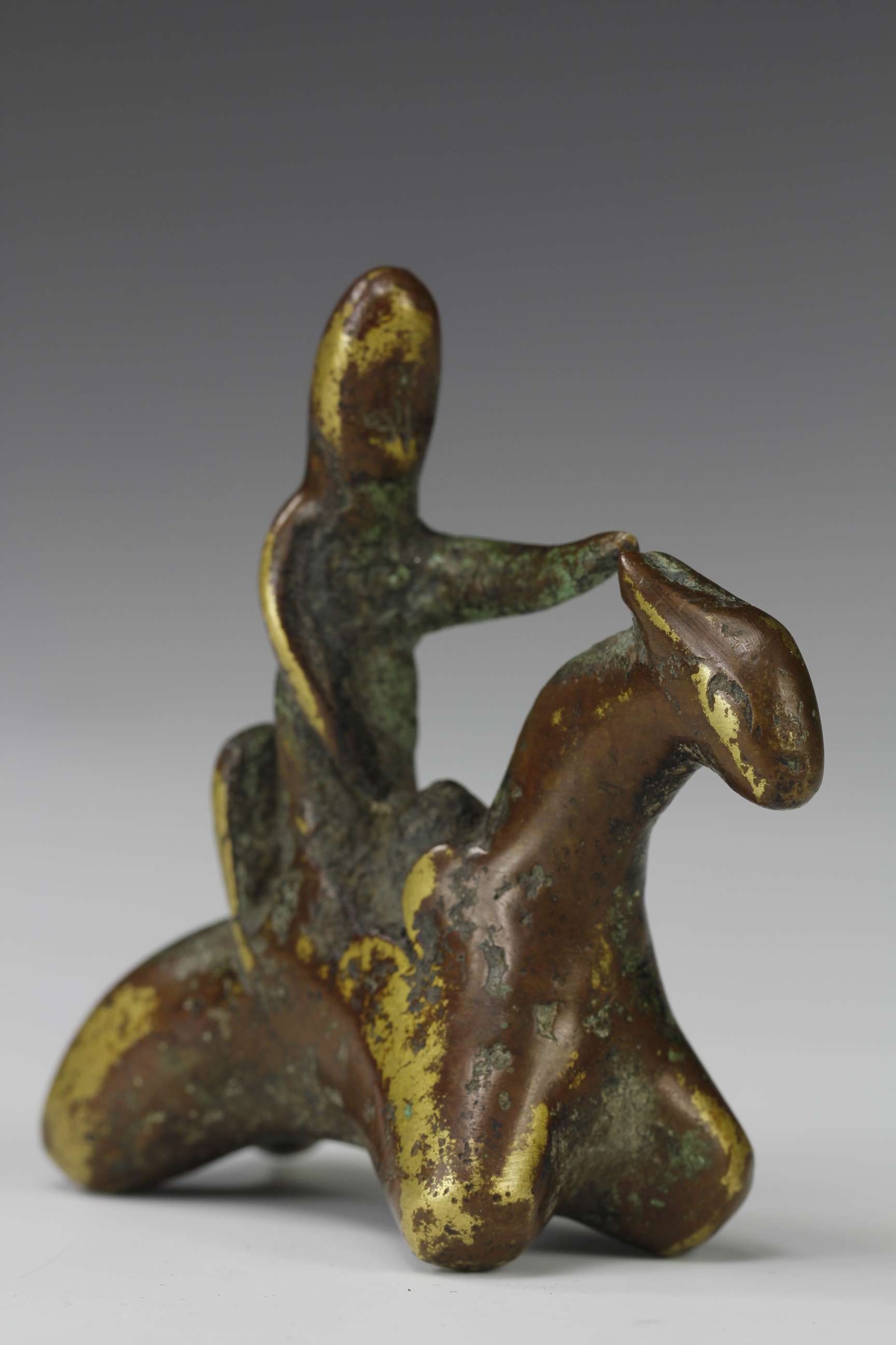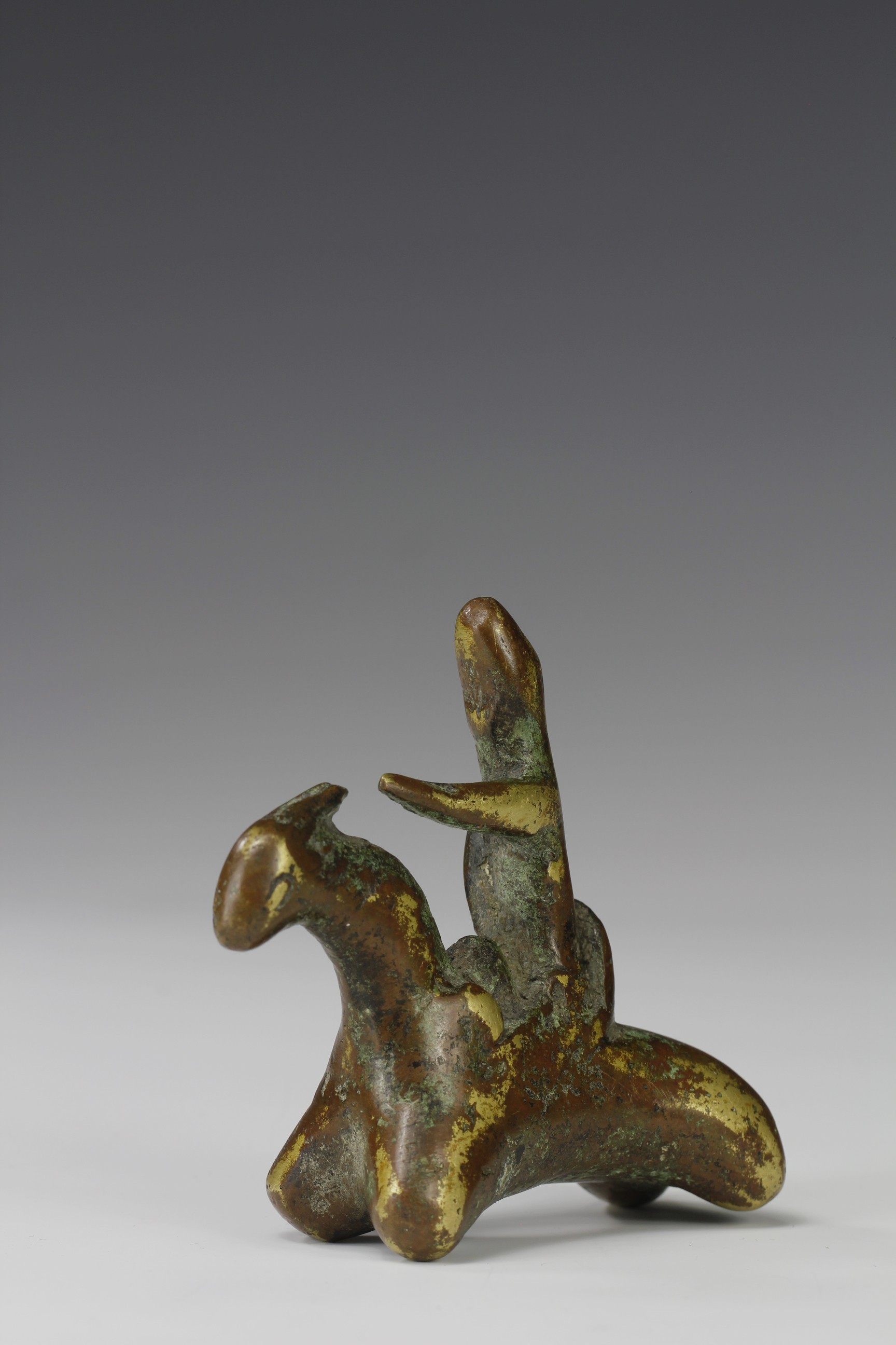 A comparatively large example of a 'Putchu Guinadji'. The varied surface patina indicates that this piece was likely once wrapped and bound in leather, hence the darker redish colouring in various parts. The lighter worn bronze surface was where the piece was not wrapped and exposed to handling and touching over time. Such pieces had a traditional function acting as a protective charm from harmful spirits. The casting represents a horse and rider, recalling over time a broad history of mounted warfare throughout the greater Sahel Region.