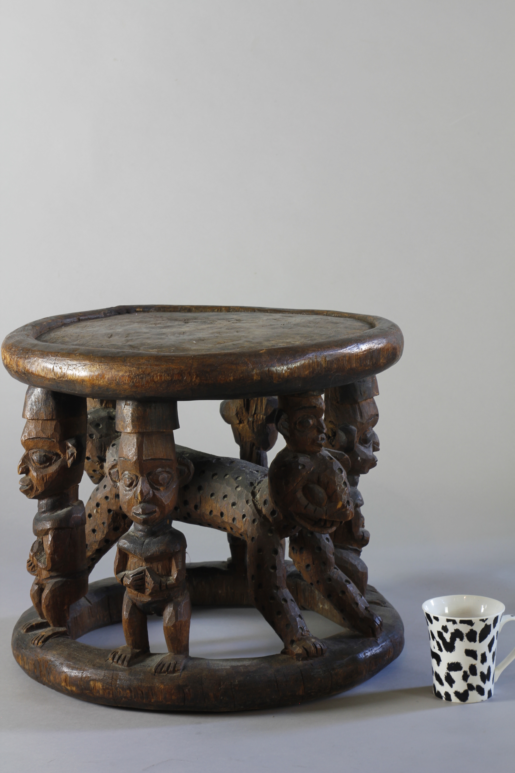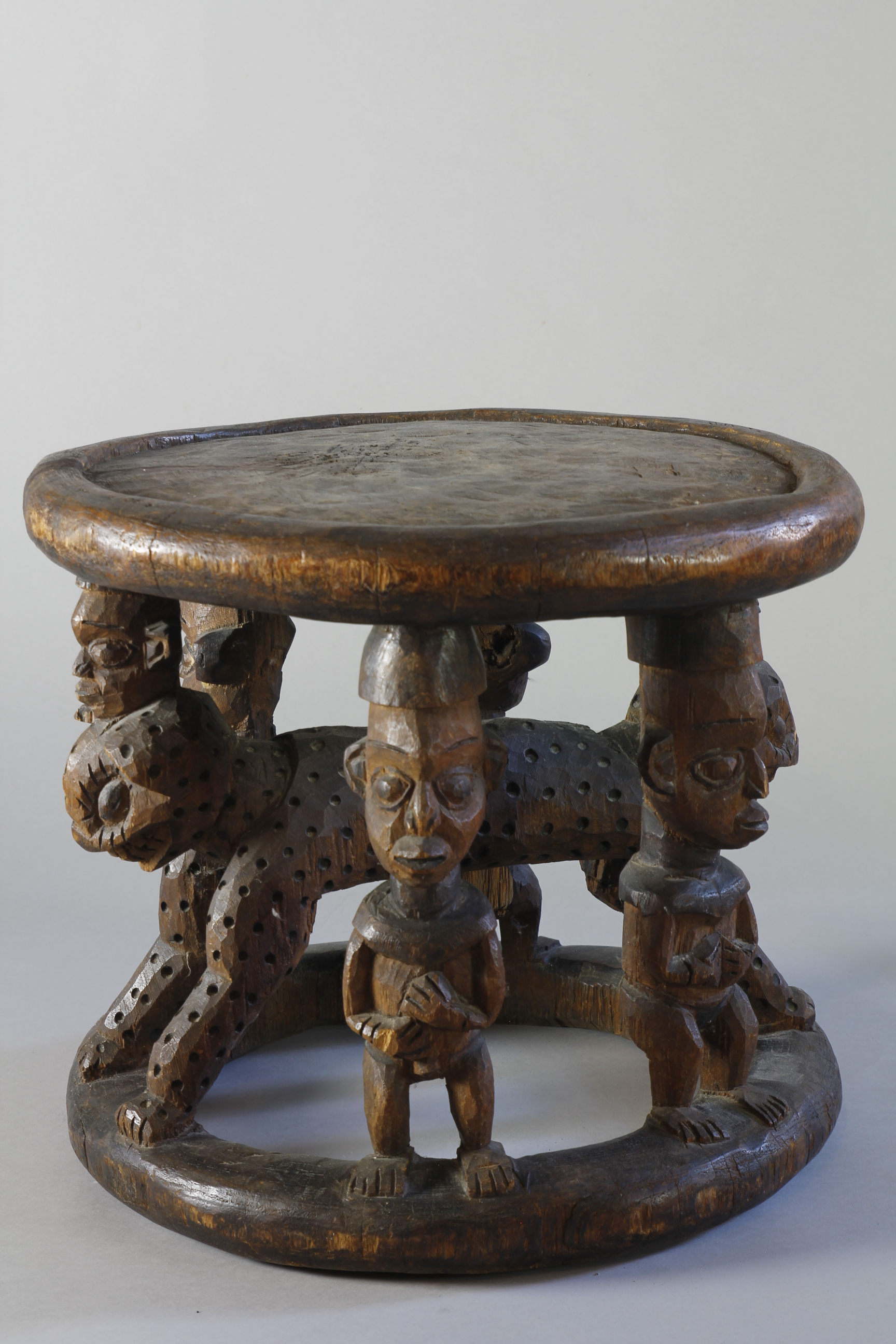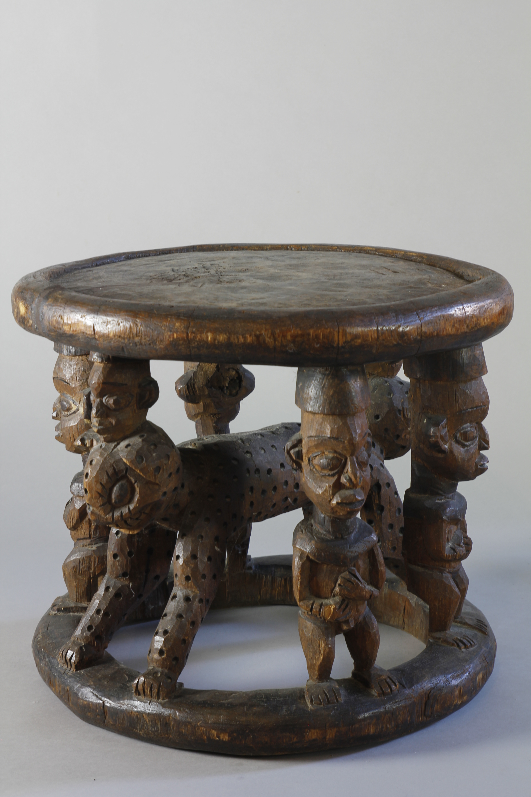 A large title stool depicting at its centre a two-headed leopard surrounded by four male figures.