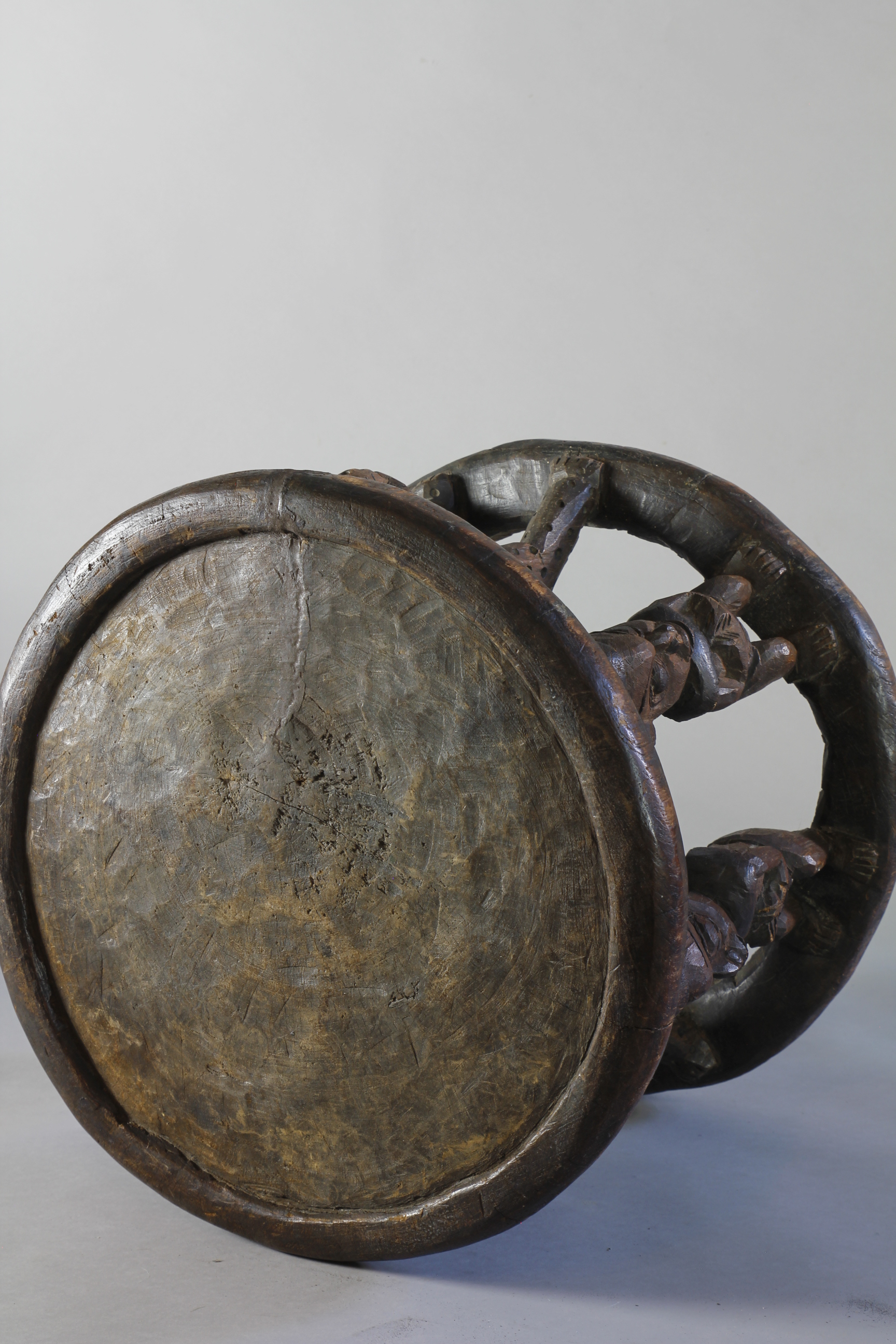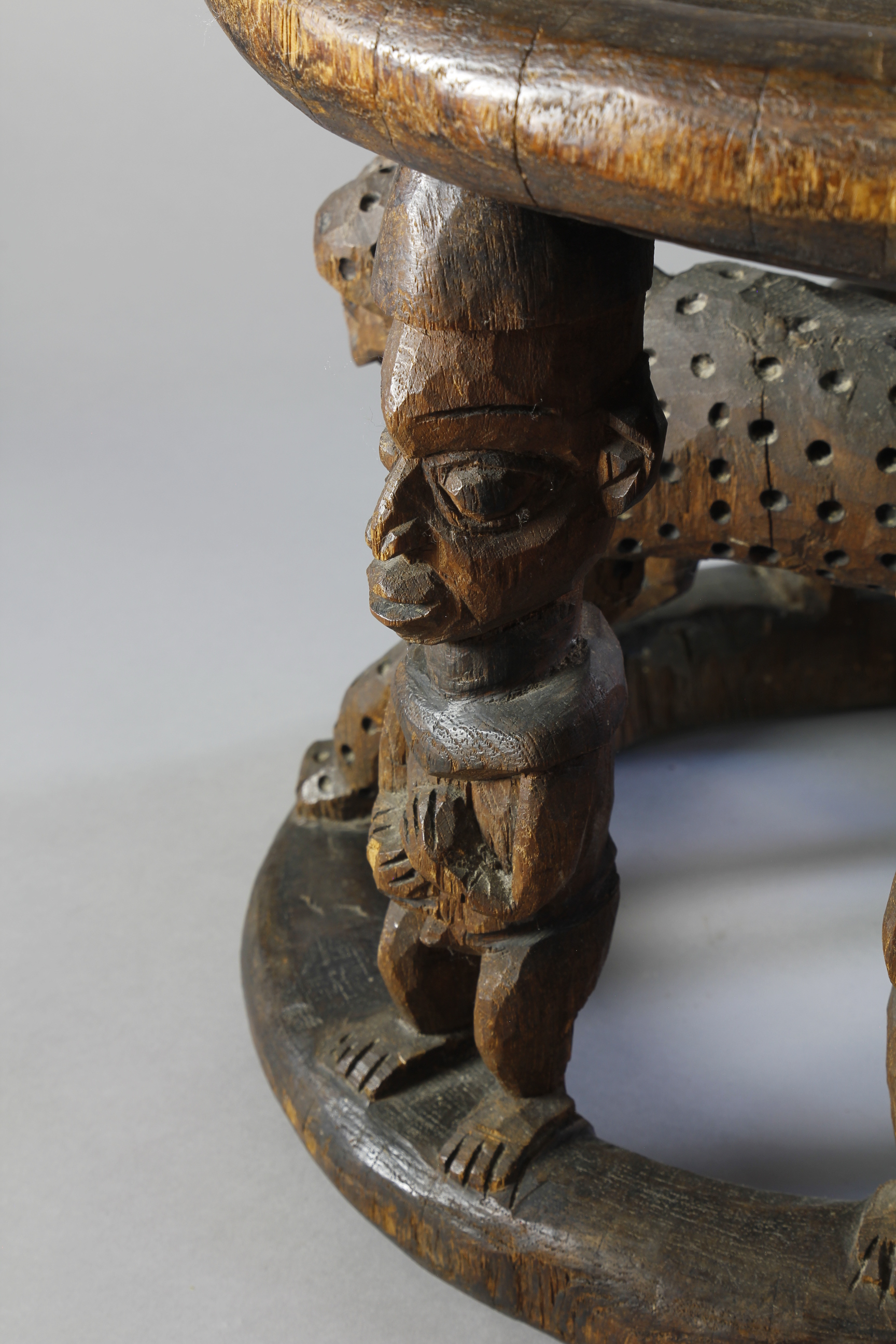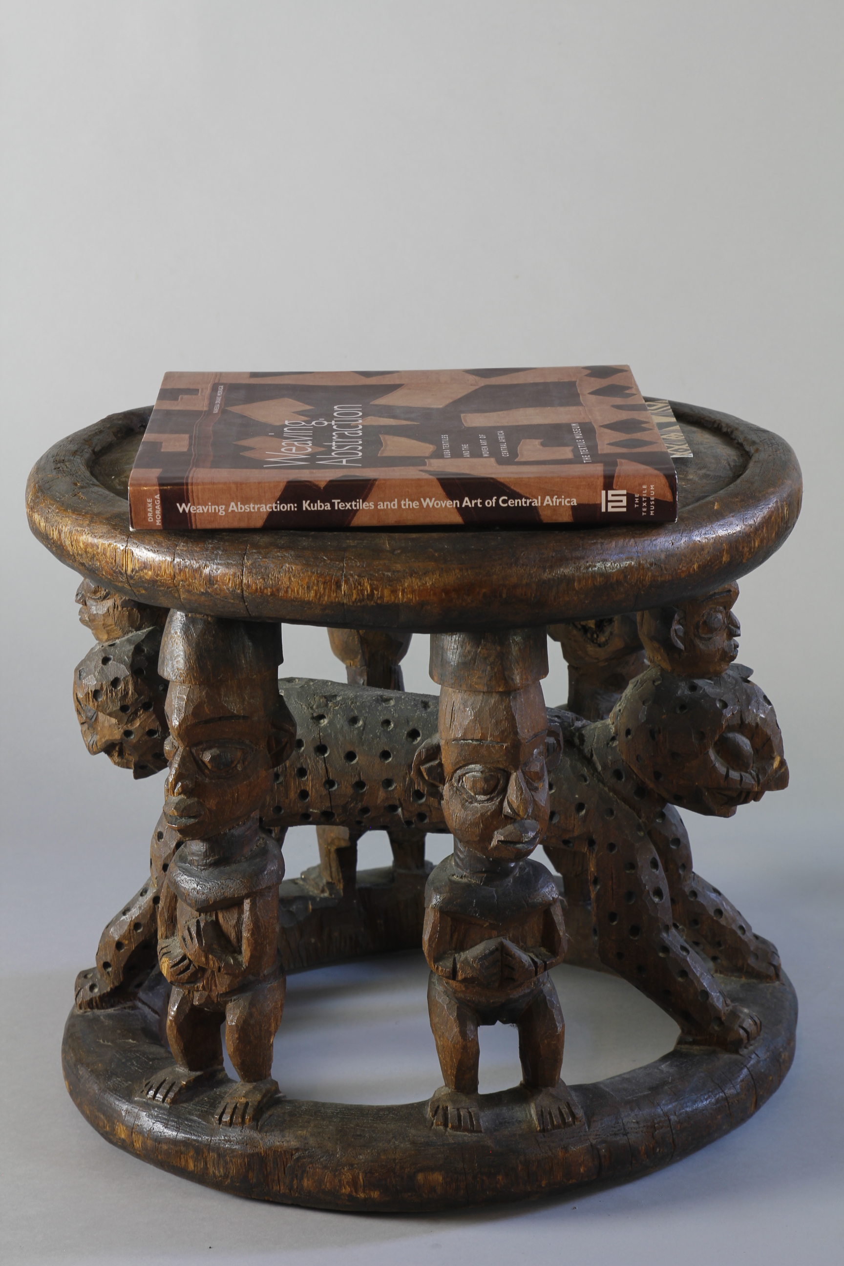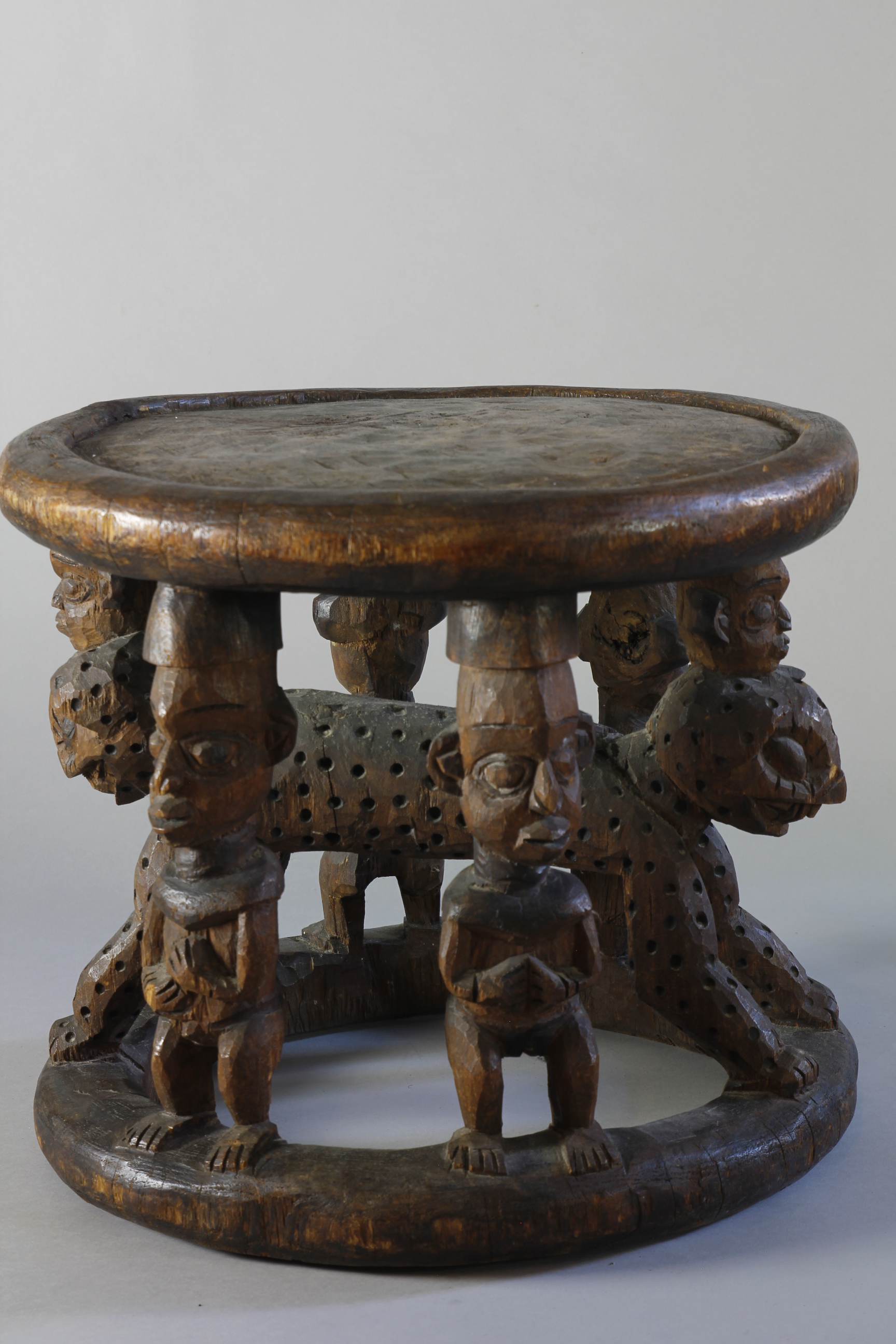 A large title stool depicting at its centre a two-headed leopard surrounded by four male figures.