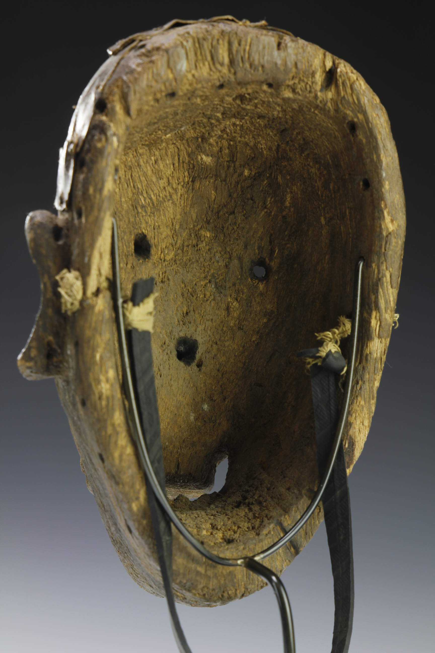 A well used Makonde mask with a deep, worn and weathered surface patina. Powerful expression, feathering a prominent lip adornment with original attachments to the back of the mask.