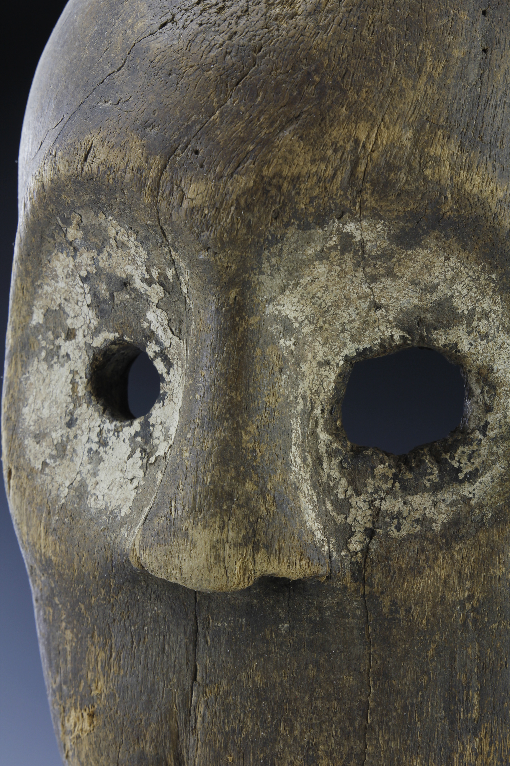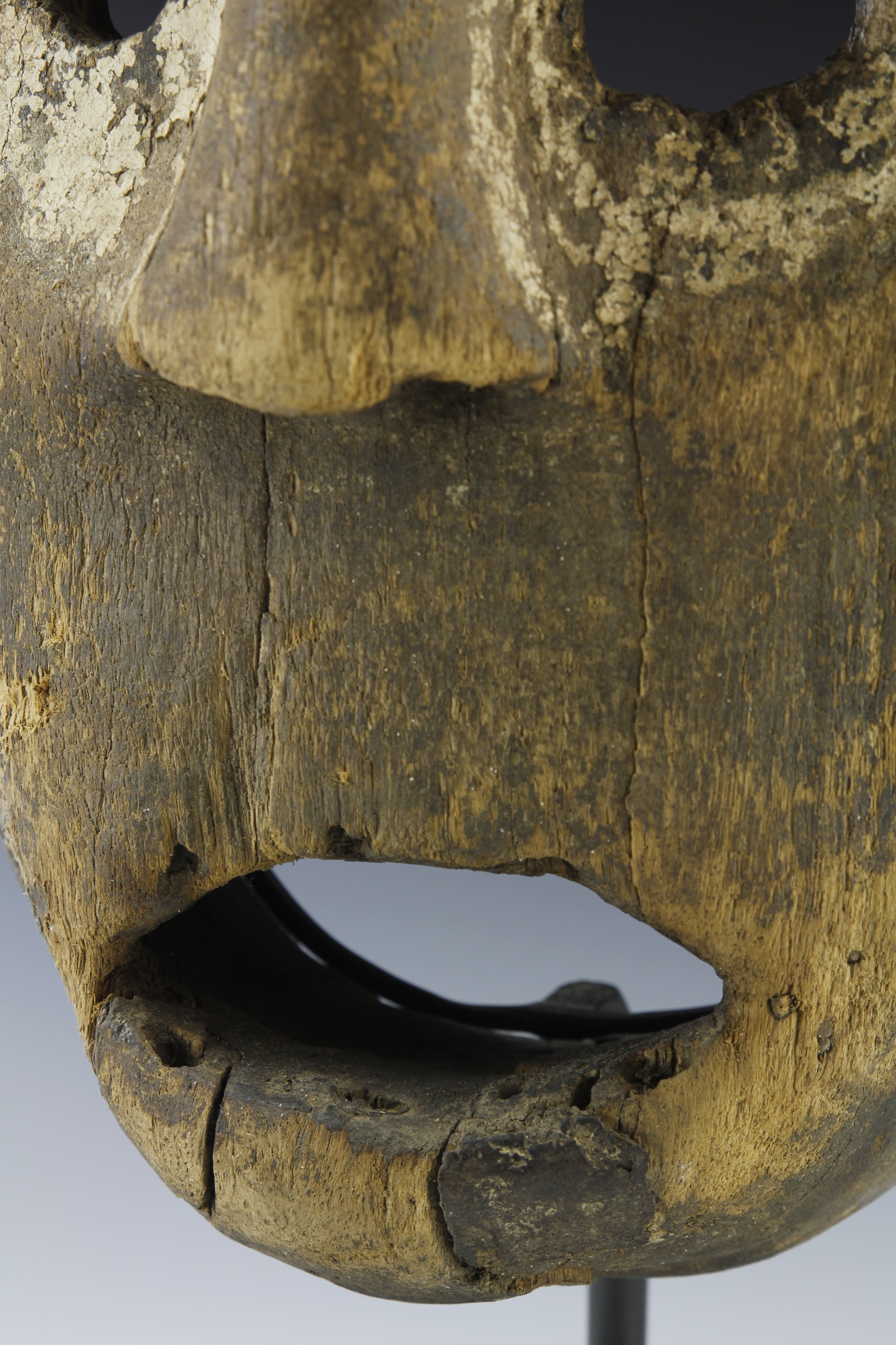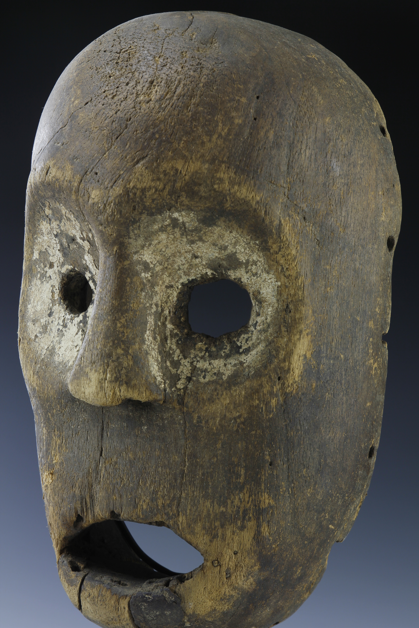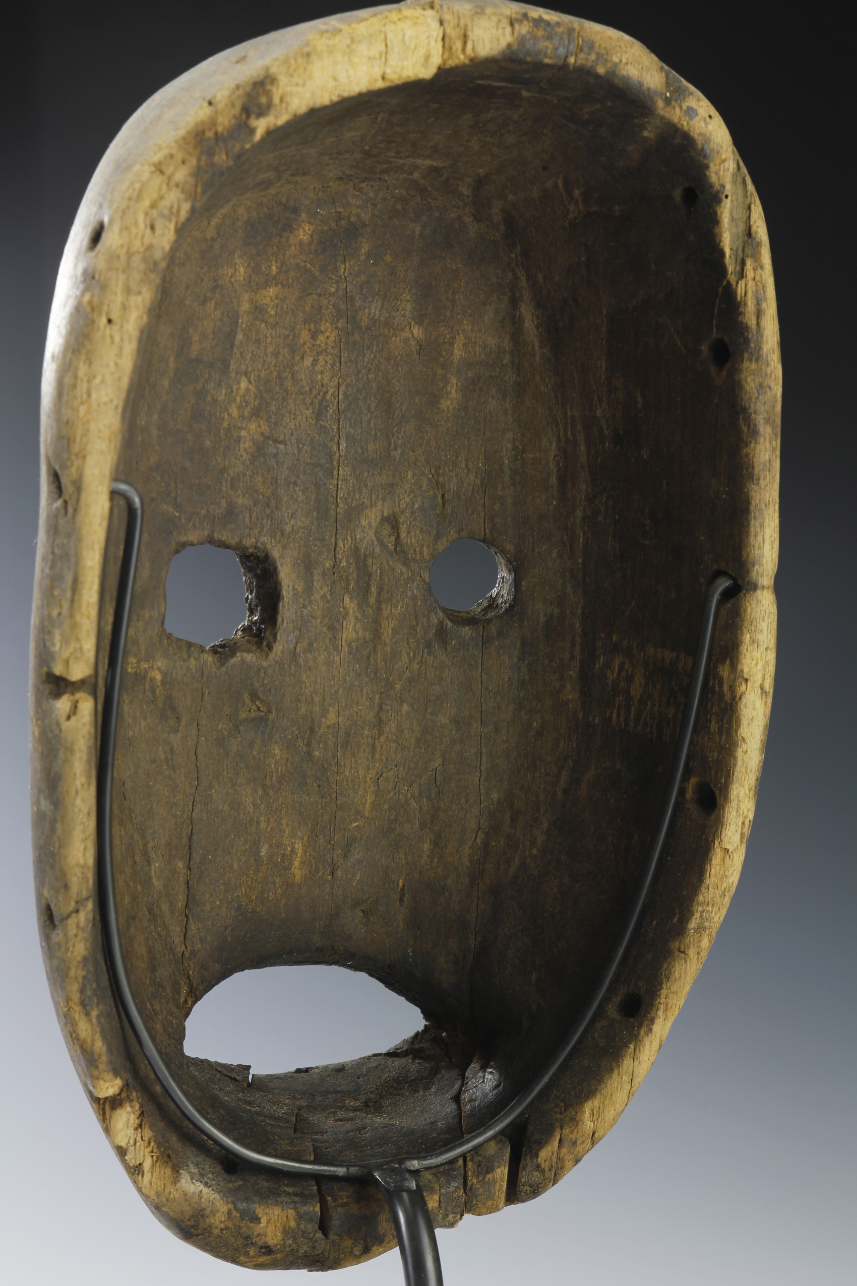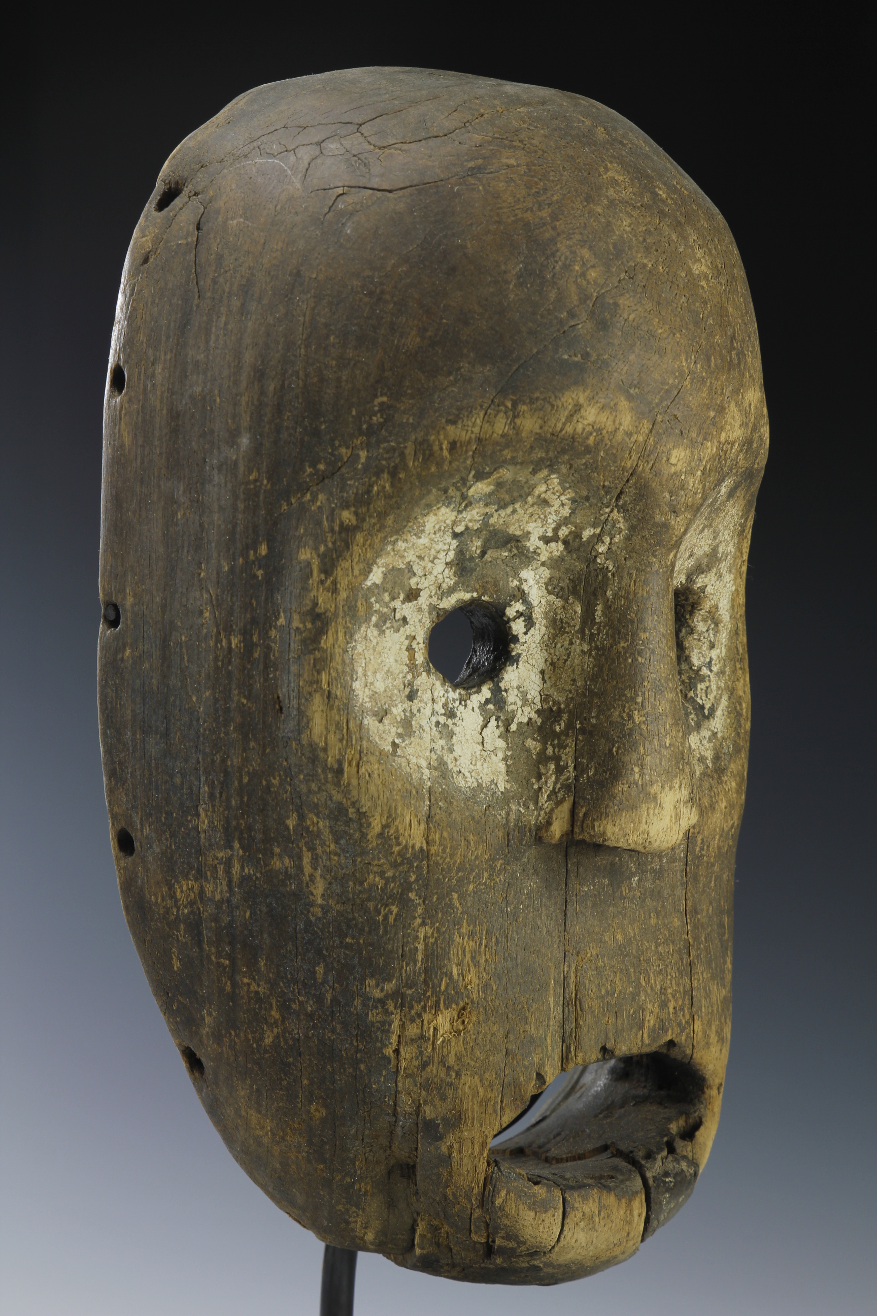 With its circular-shaped eyes, broad nose and wide gaping mouth, this mask,likely coming from the Nbaka or related culture of North-Eastern DRC, has a wonderful primal expression. The eye sorckets, with one larger than the other, are surrounded by traces of caline. There are holes to the upper and lower jaw and the surface is dry and worn specially around the browls and ridges of the nose, eyes and mouth. There has been a traditional restoration, using traces of dried wax, to the lower section of the jaw.