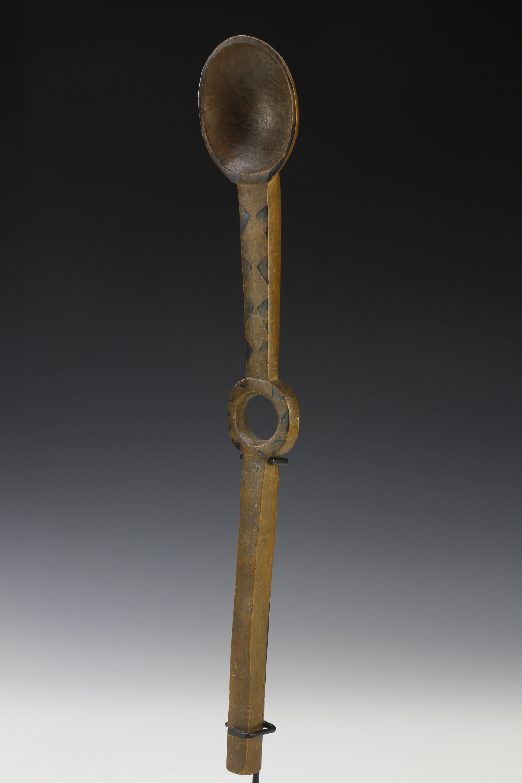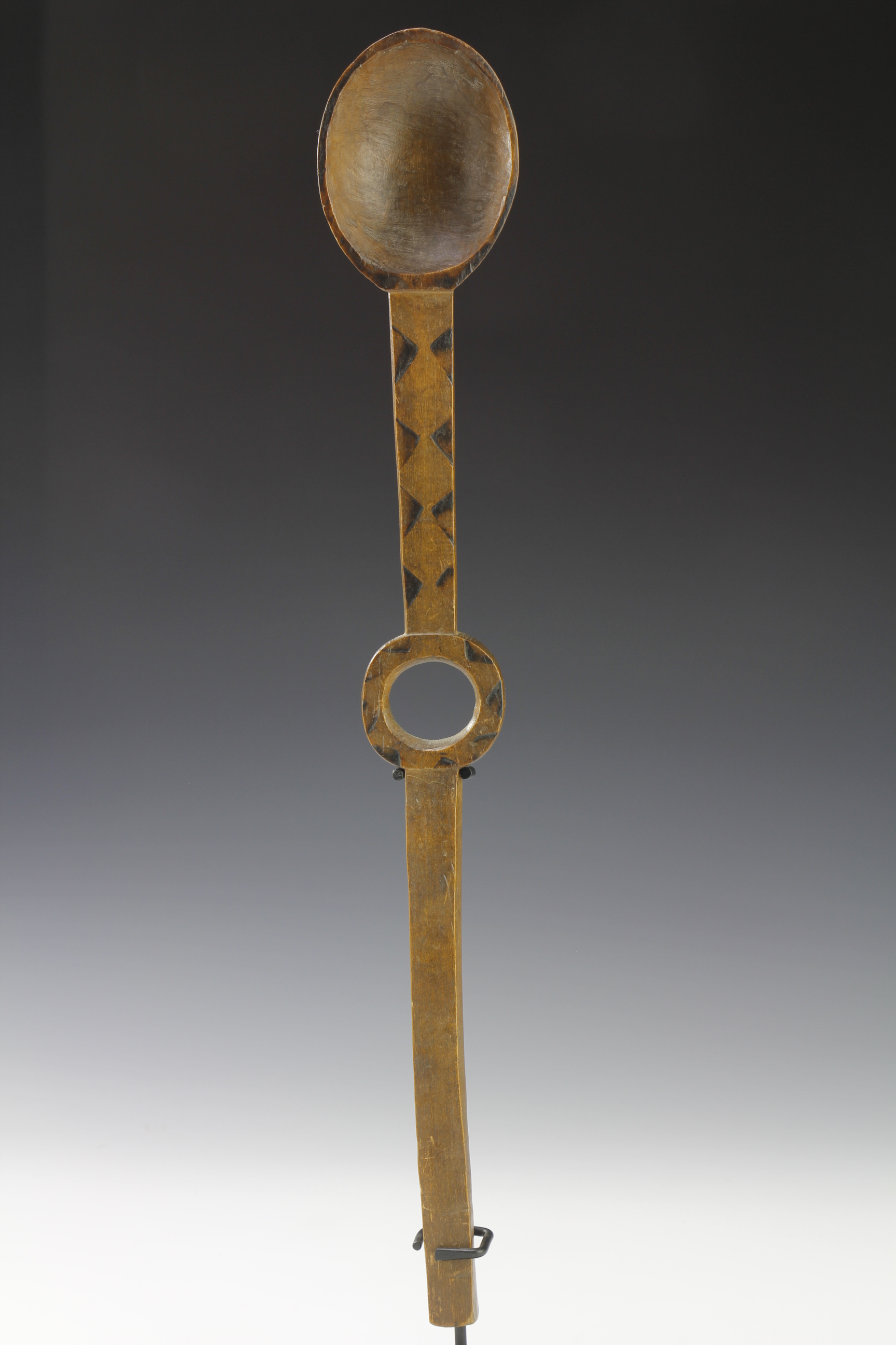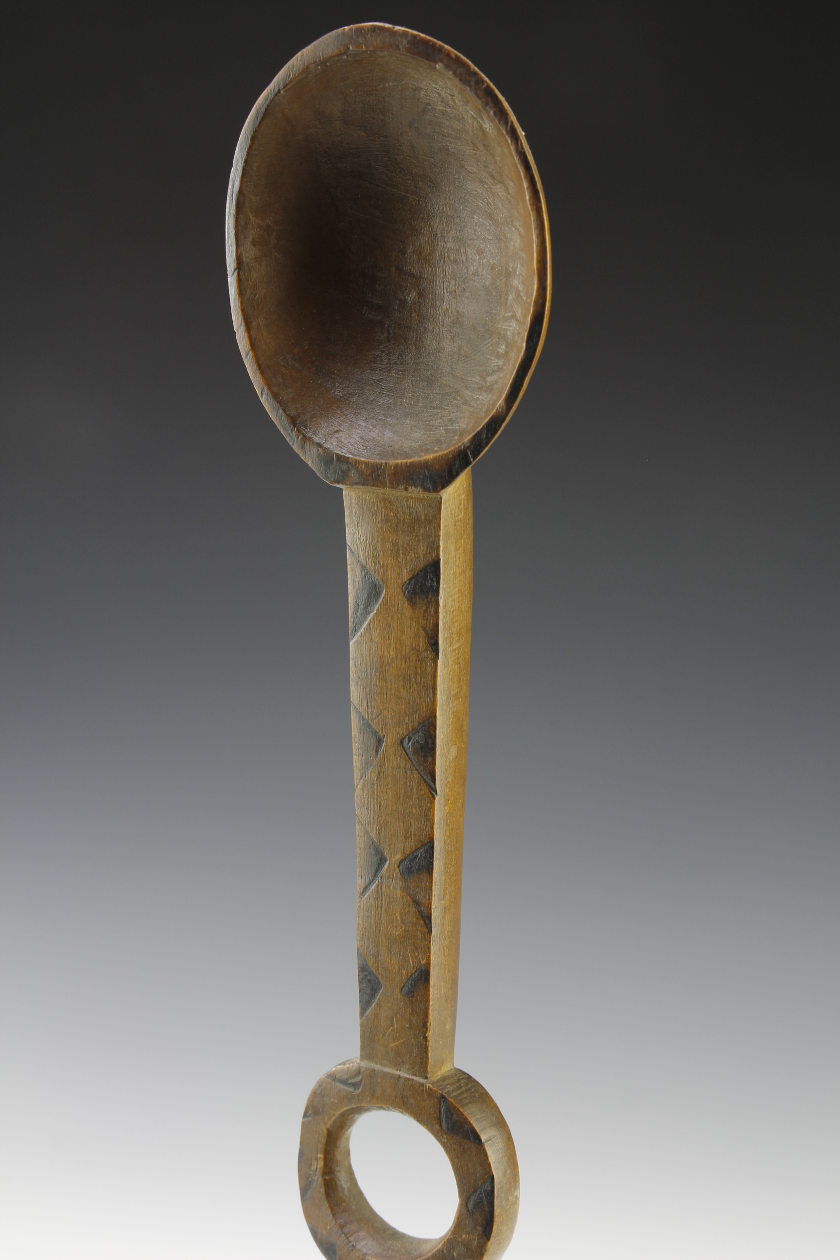 Attractive in form with a cut out circular feature half way up its handle which mirrors the form of the spoons oval shaped head. Slightly curved in form, the surface has been decorated with scorched geometric designs on both sides of its handle. The surface has a warm honey patina.