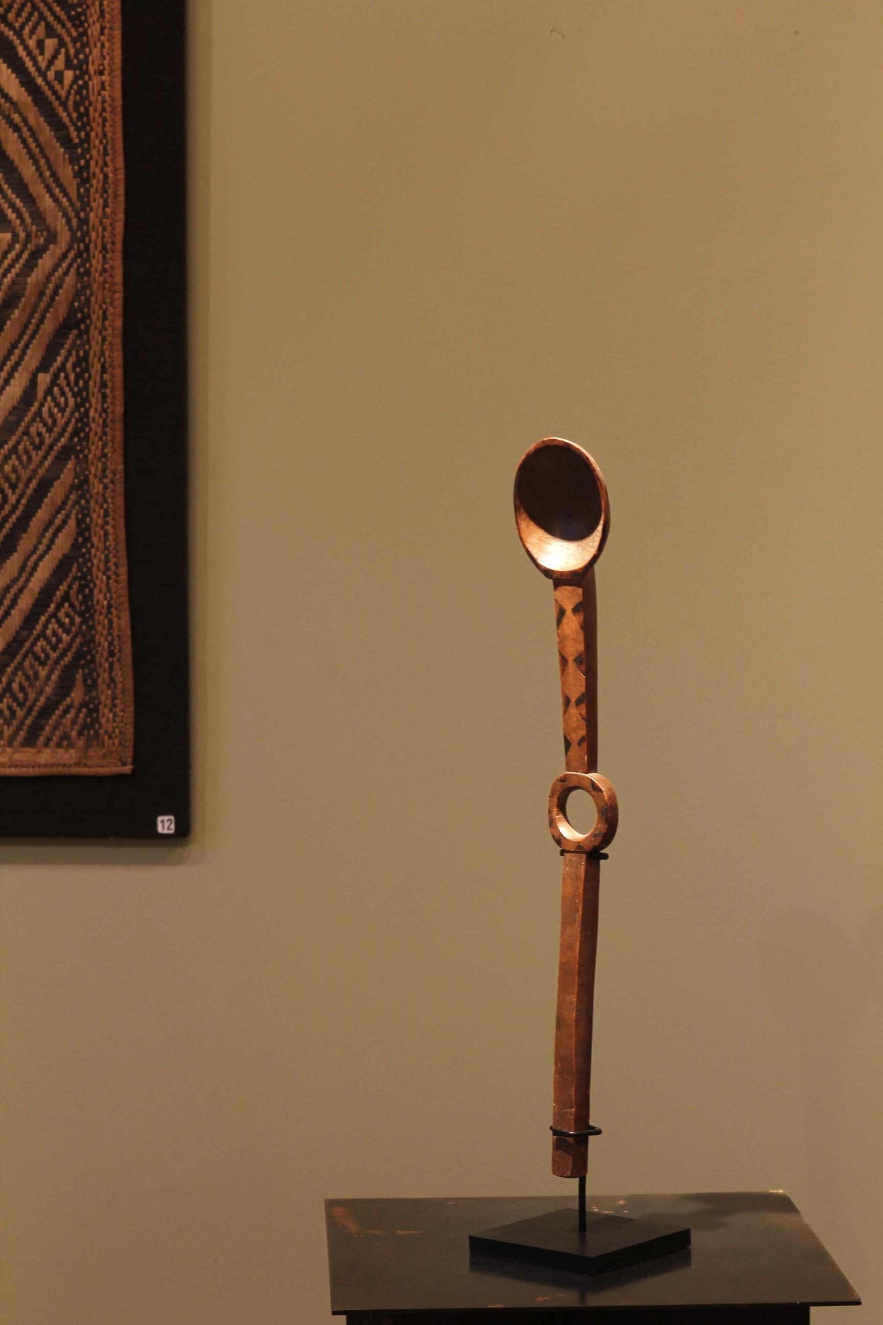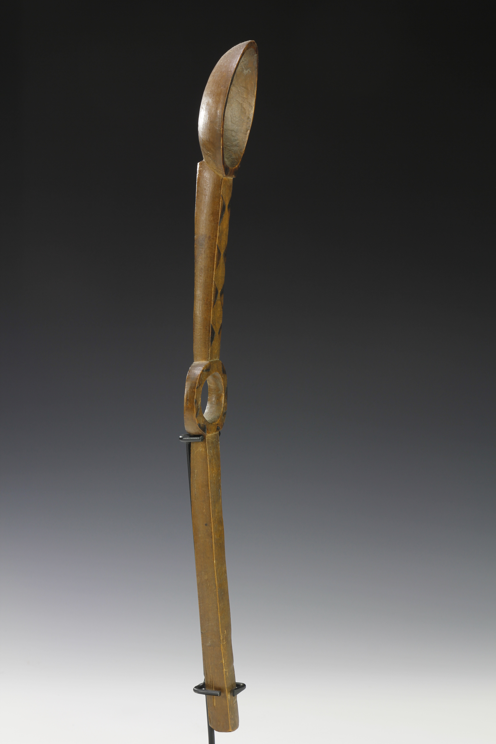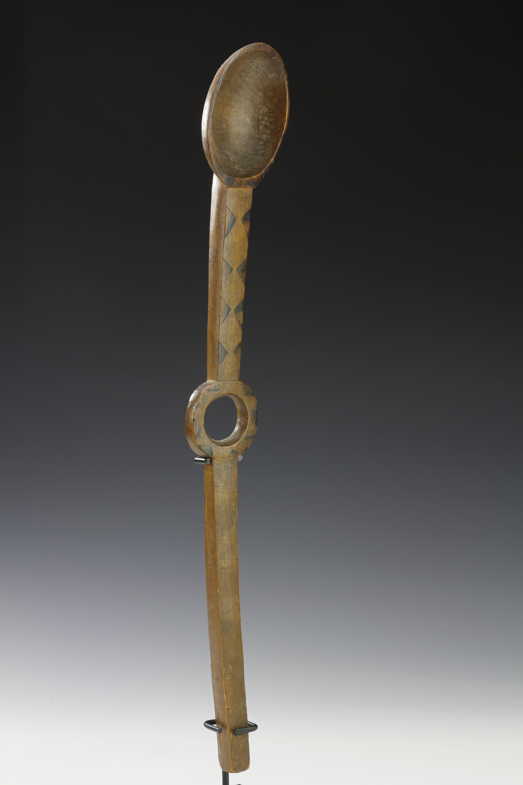 Attractive in form with a cut out circular feature half way up its handle which mirrors the form of the spoons oval shaped head. Slightly curved in form, the surface has been decorated with scorched geometric designs on both sides of its handle. The surface has a warm honey patina.